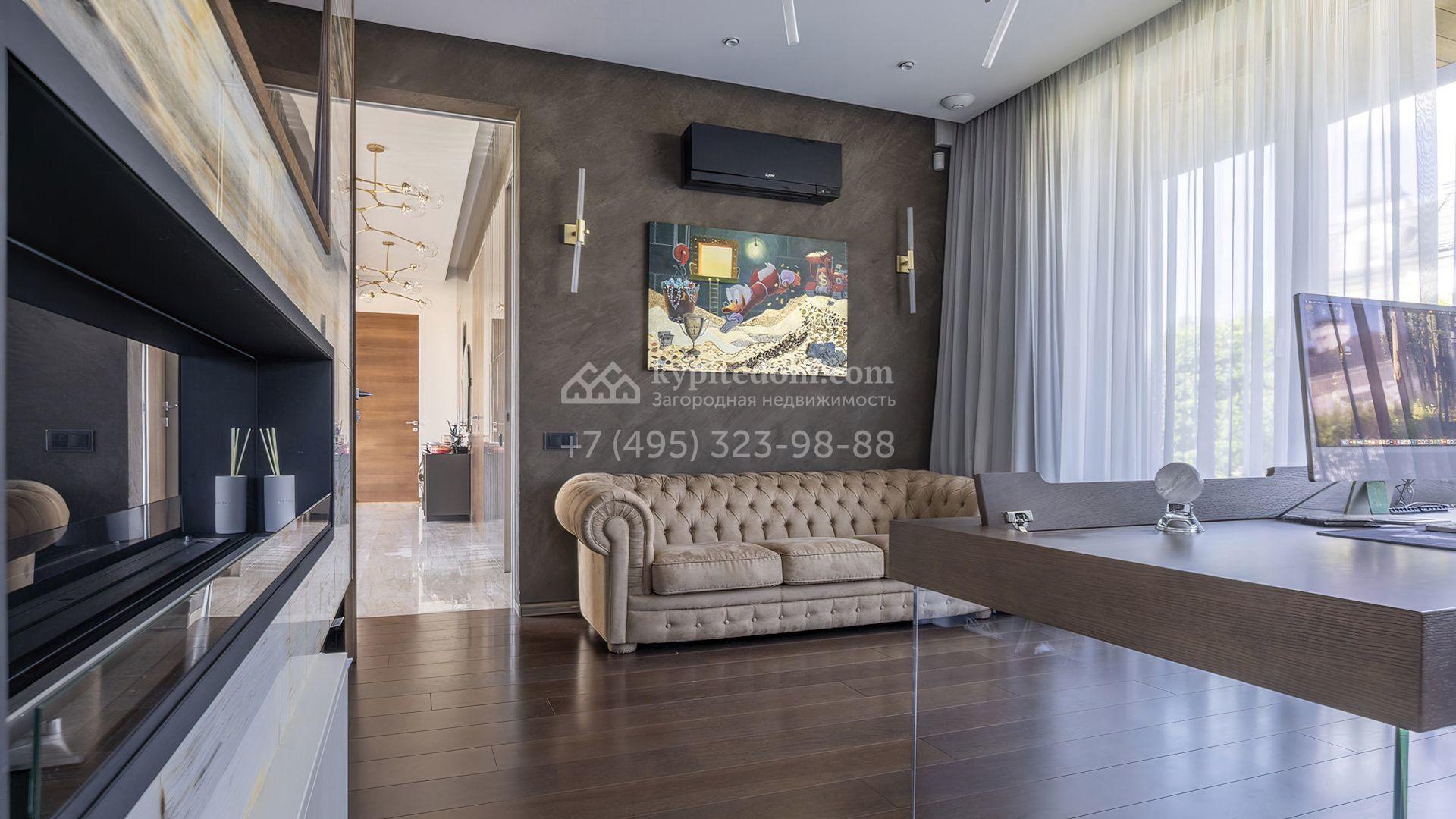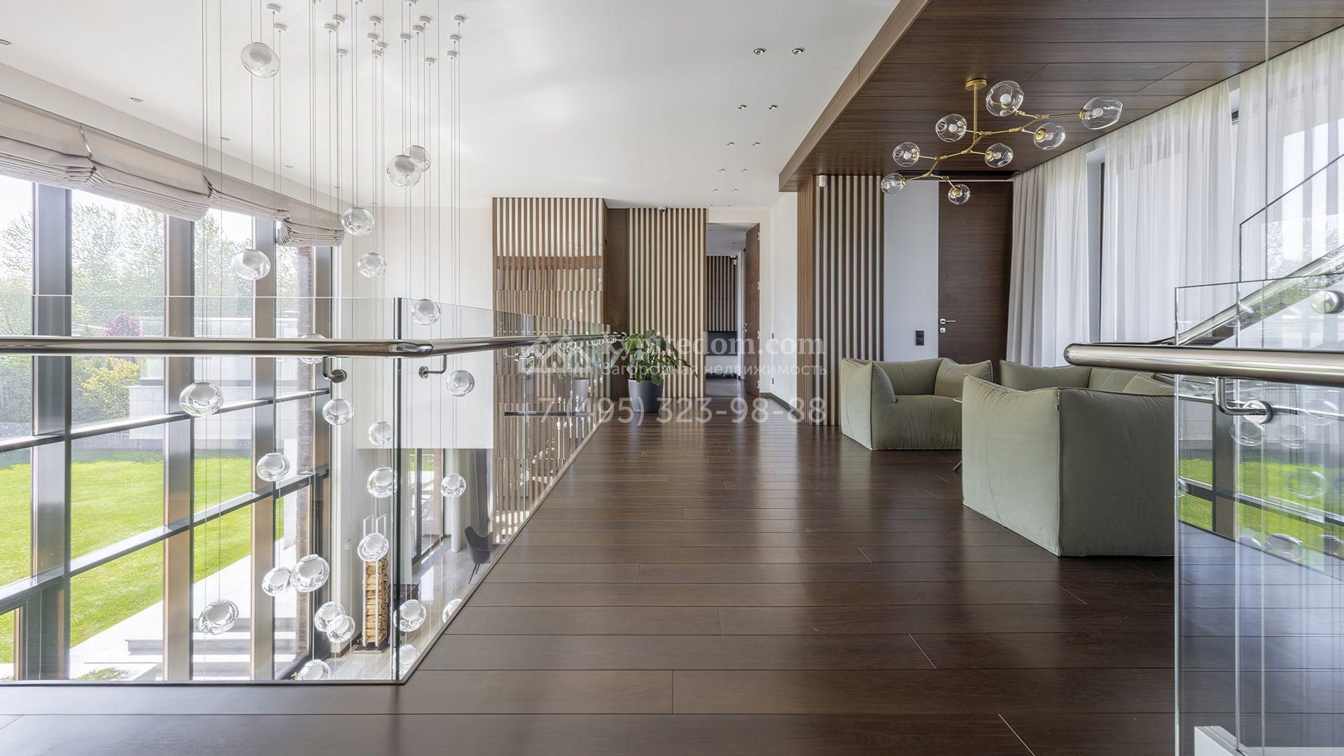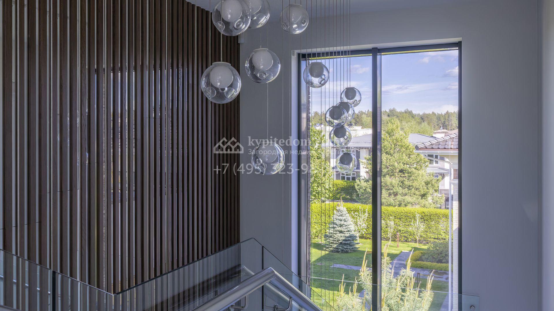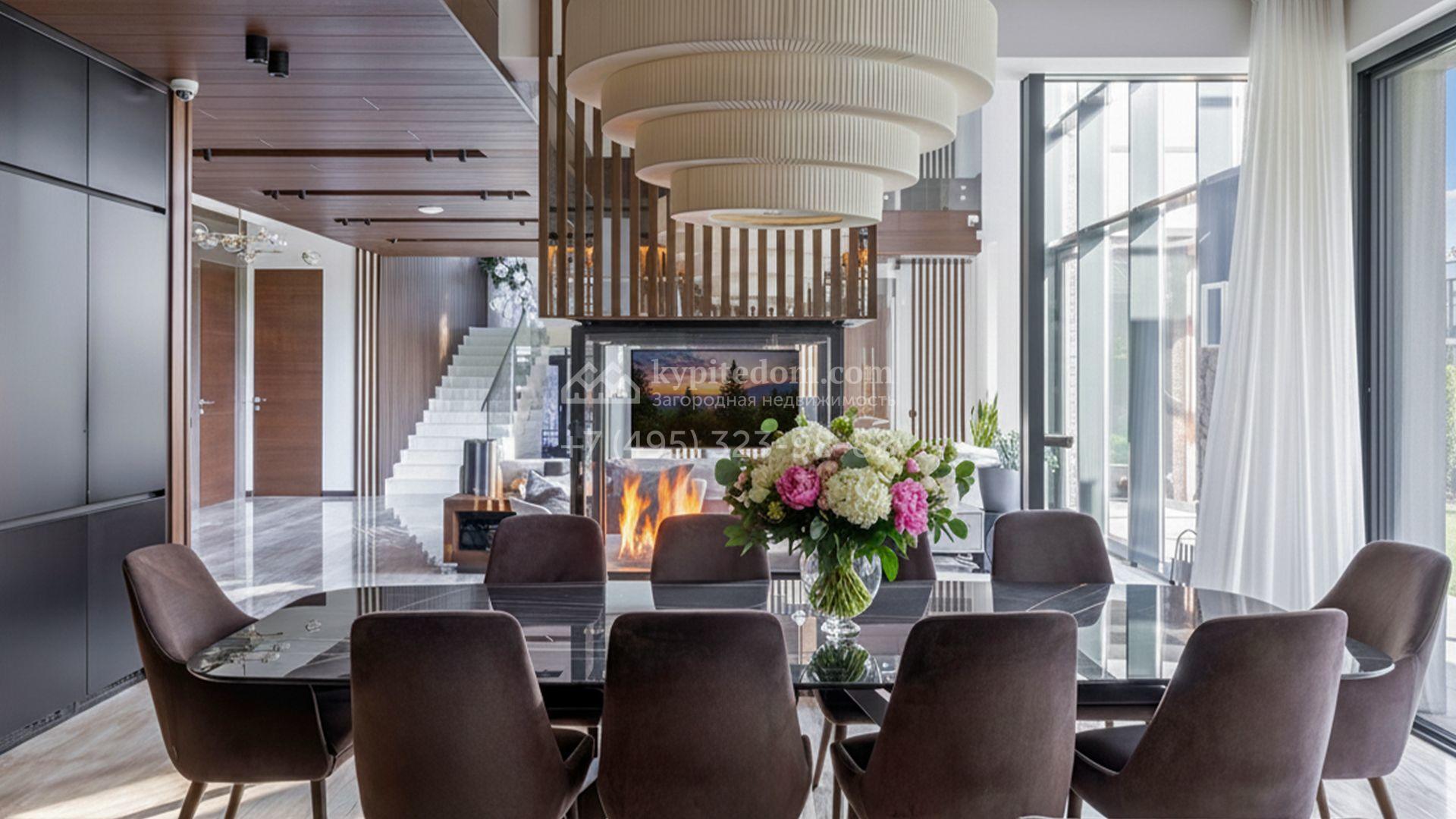 Функциональная планировка включает кухню-столовую, просторную гостиную с камином и вторым светом, кабинет, 5 спален, гардеробные, 4 балкона и эксплуатируемую кровлю с террасой и площадкой барбекю. На каждом уровне выделены удобные логистические зоны, продуманные до мелочей. Террасы и балконы в сумме составляют около 97 м², что позволяет органично объединить интерьер с окружающим пейзажем.