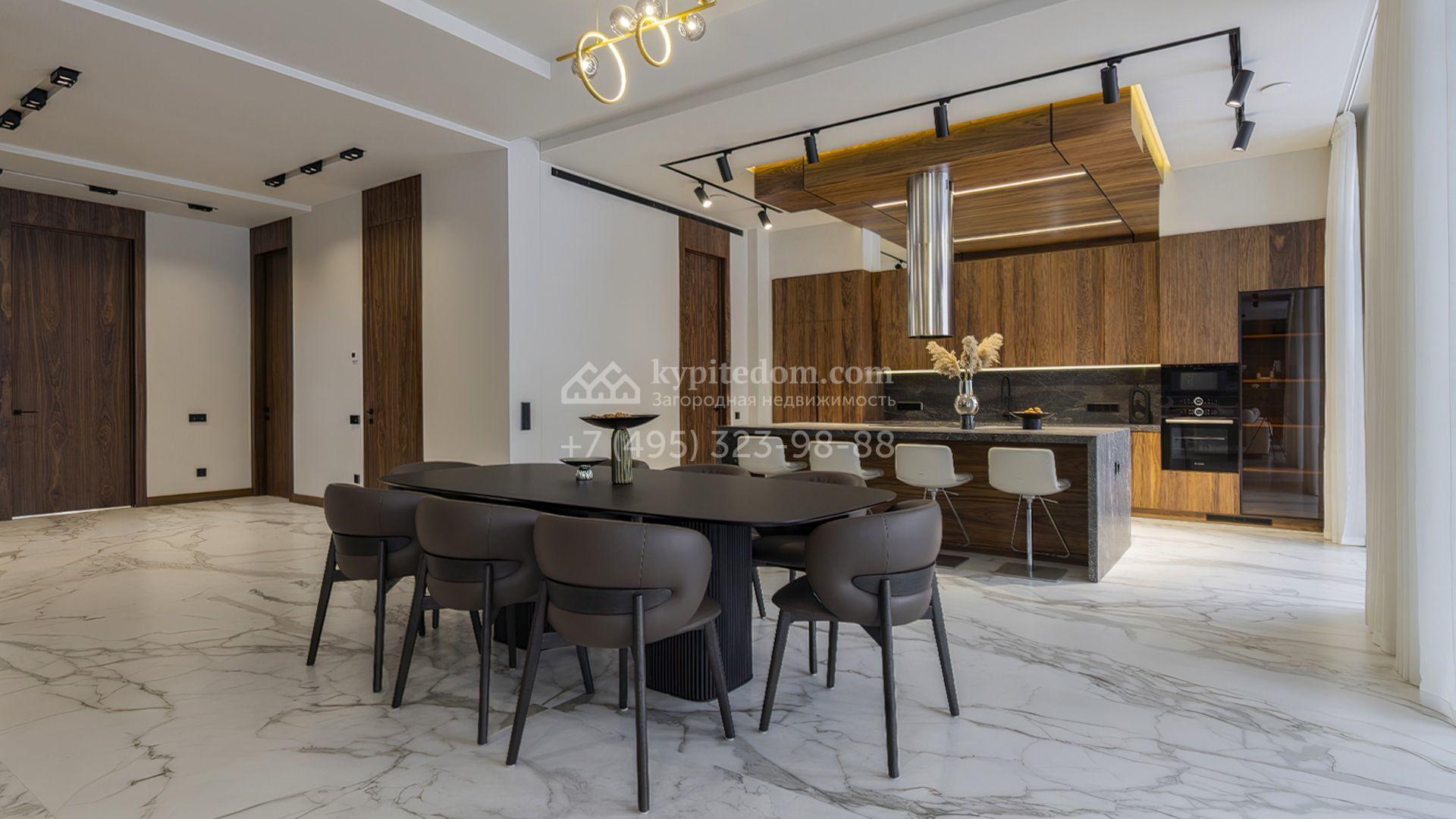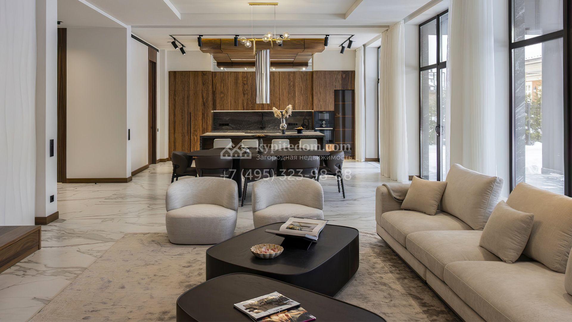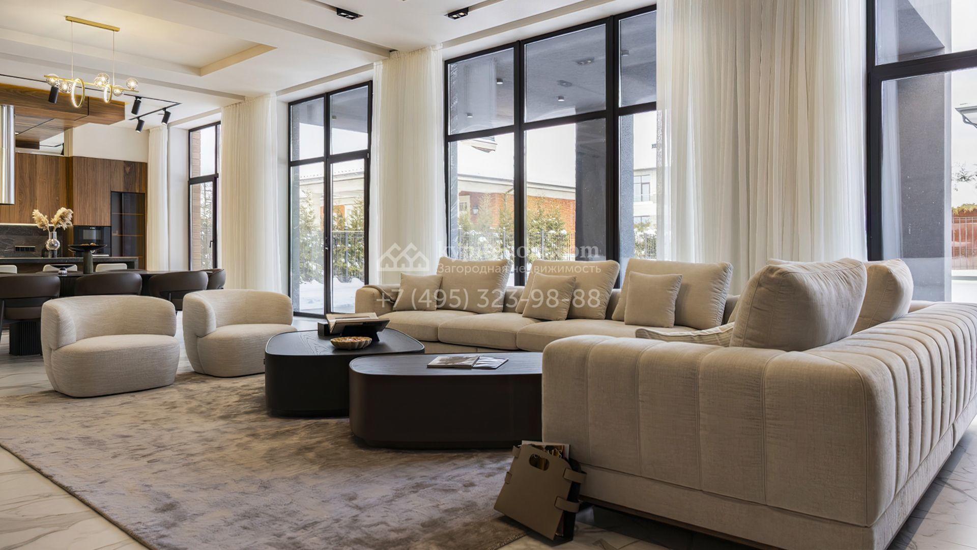 Интерьеры оформлены в современном стиле, где преобладают мягкие нейтральные оттенки. Натуральные древесные текстуры вносят акценты, добавляя пространству теплоту и сложность. Панорамные окна и многоуровневые потолки с тщательно продуманным освещением создают игру света и тени, создавая атмосферу уюта и гармонии. Дом полностью меблирован и укомплектован техникой от ведущих производителей.