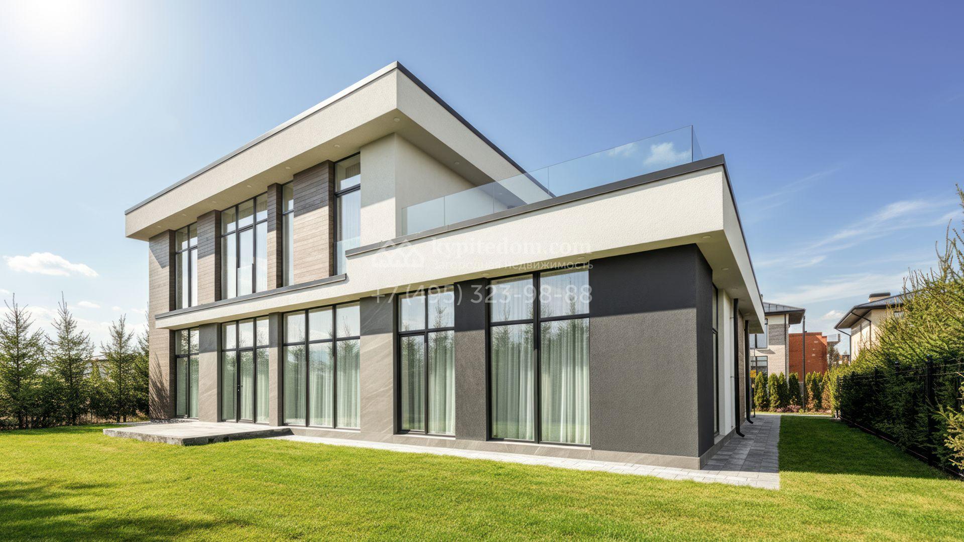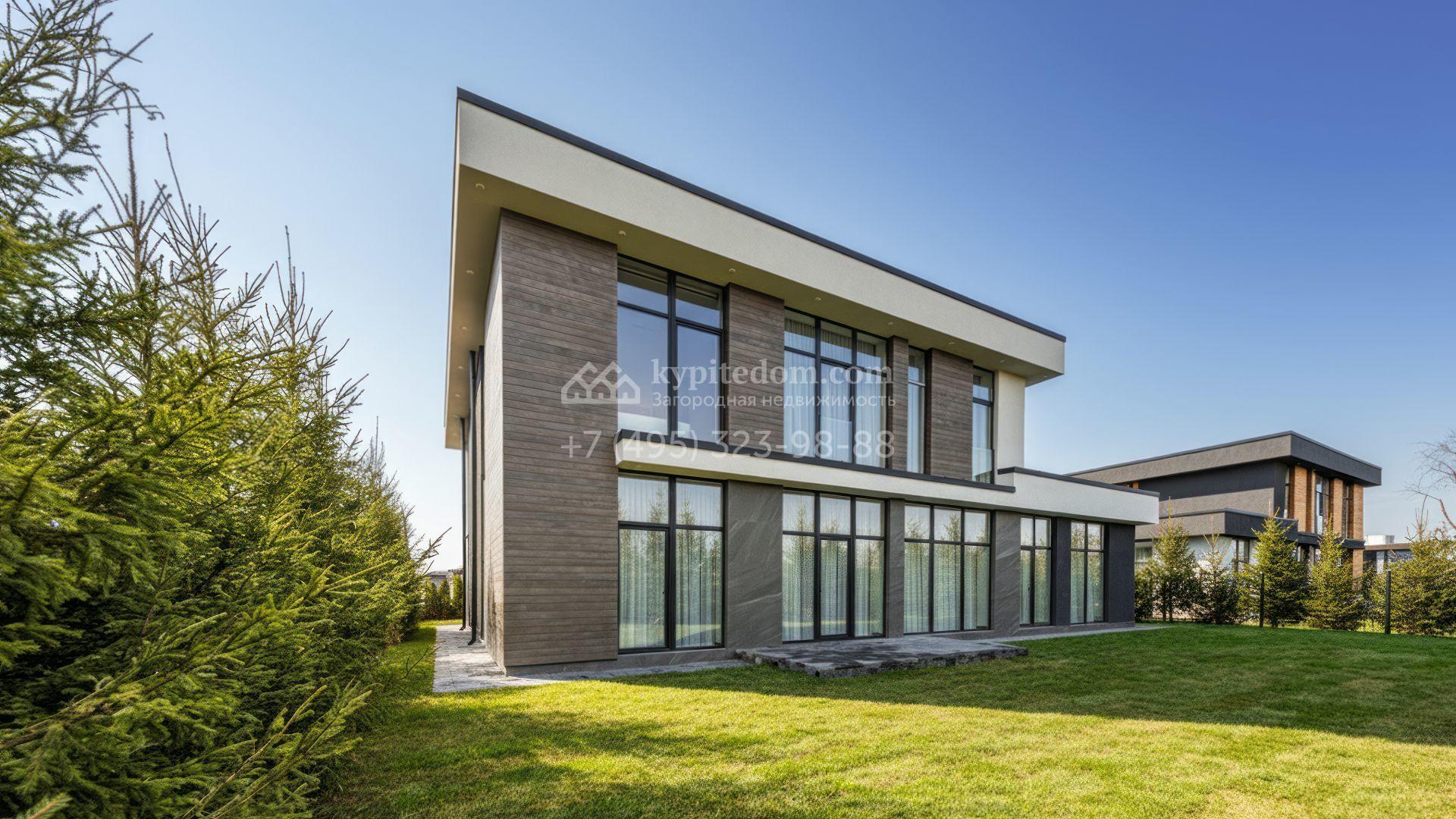 Новый загородный дом площадью 437 м² расположен на участке 8 соток. Чёткие прямые линии и минималистичный дизайн фасада формируют выразительный и утончённый облик. В облицовке использованы контрастные материалы в сдержанных белых и тёмно-серых тонах с фактурой камня и дерева. Экстерьер подчеркивается декоративной подсветкой. Коттедж оснащён приточно-вытяжной вентиляцией, кондиционированием, подогревом полов и системой «умный дом».