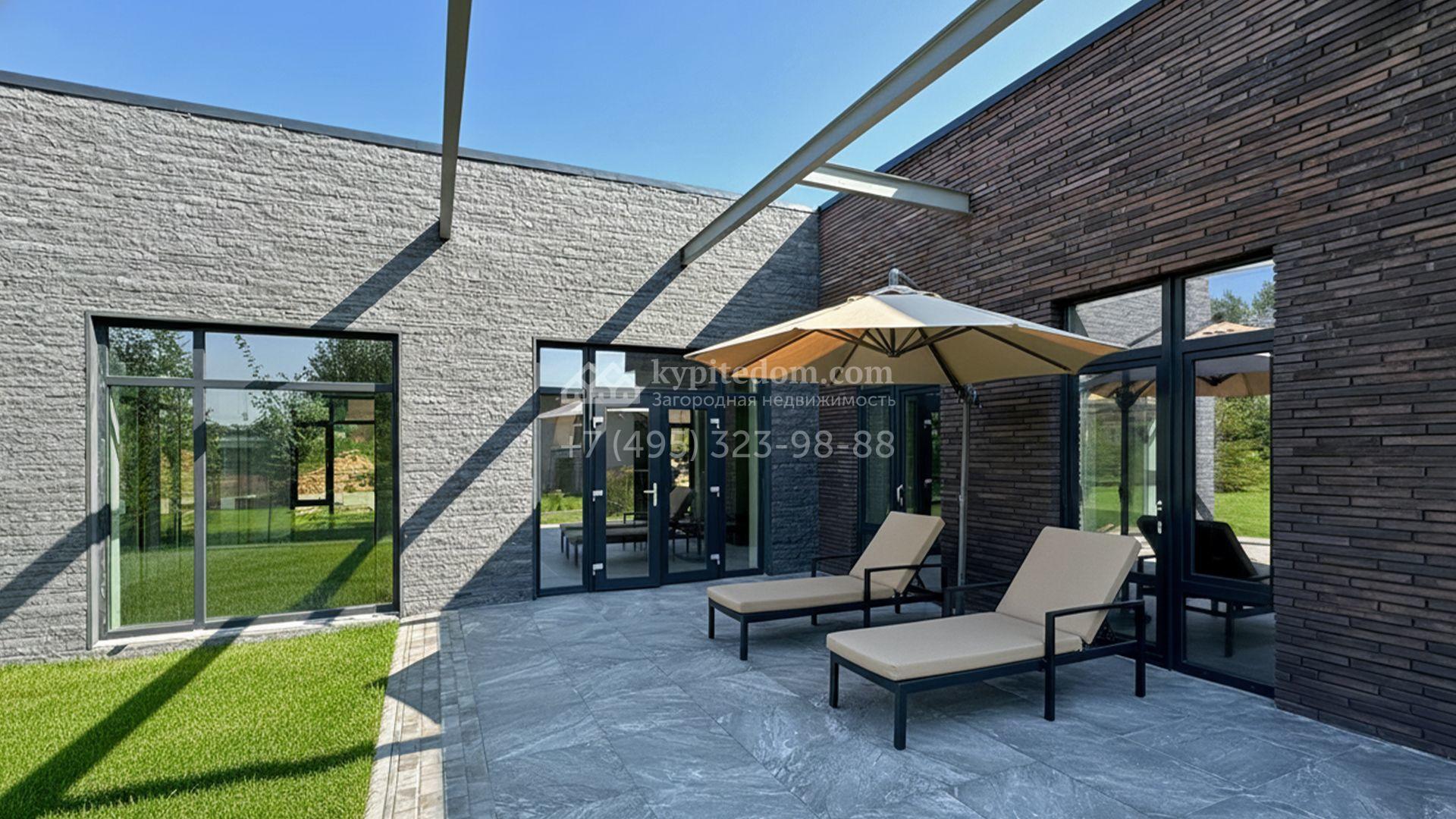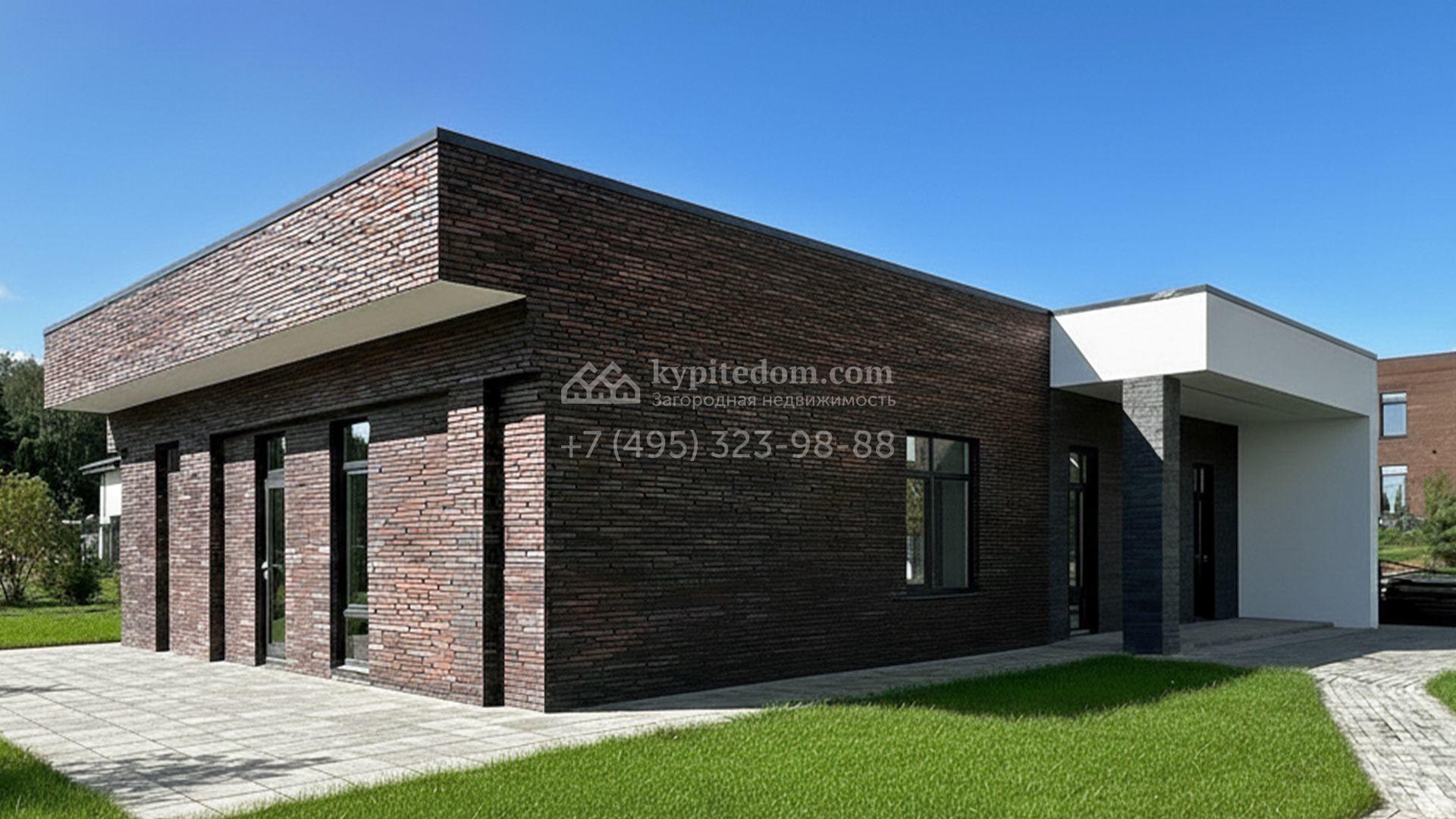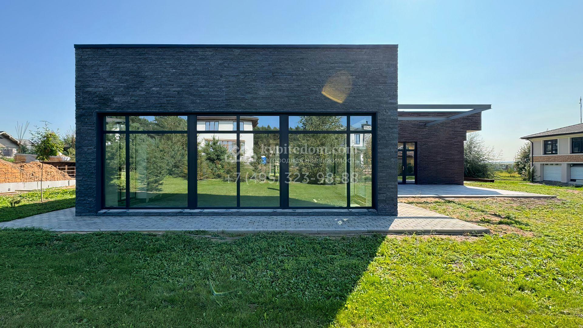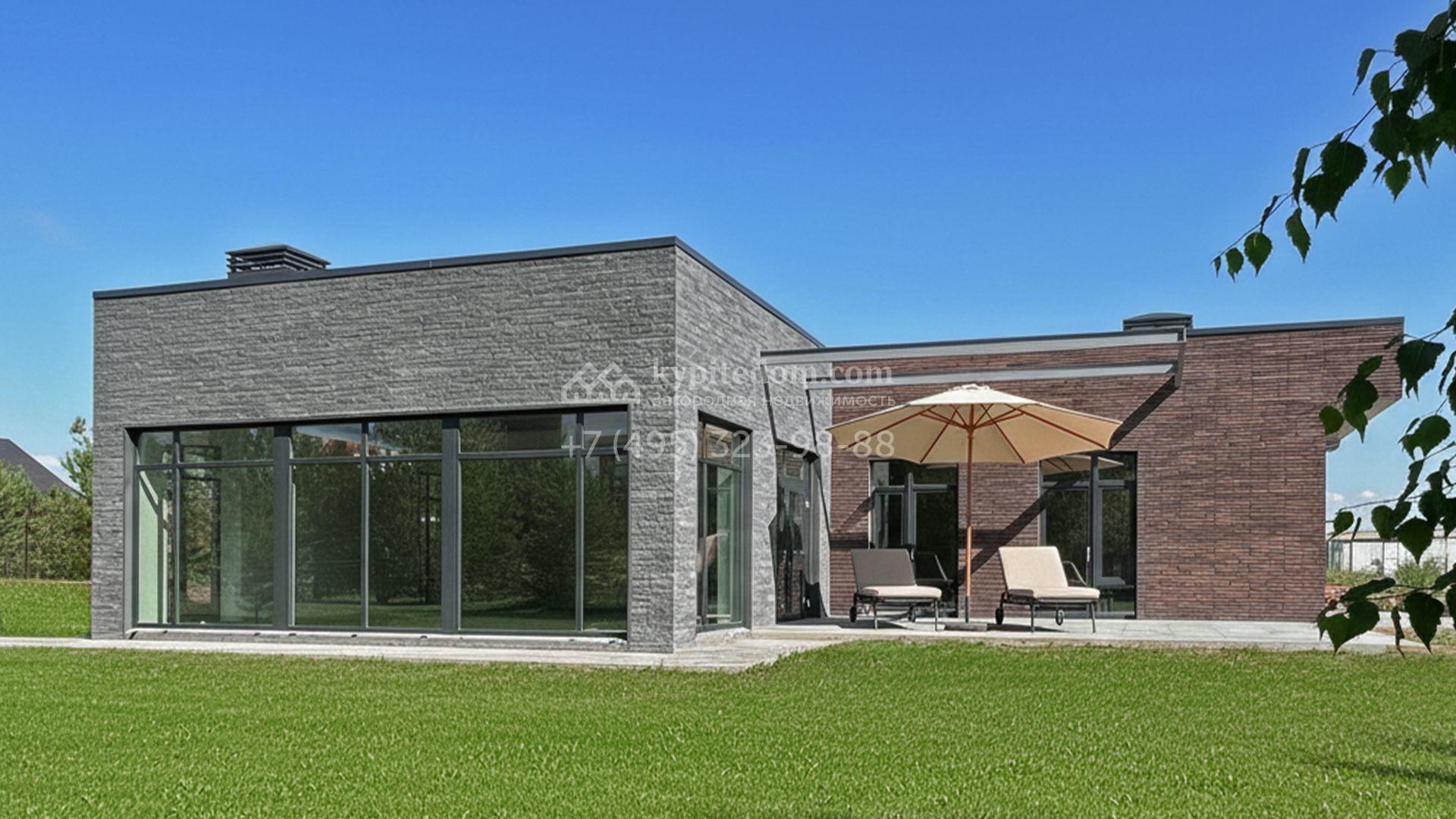Одноэтажный загородный дом площадью 250 м² построен на полевом участке 11 соток. Фасад здания в современном стиле облицован плиткой под ригельный кирпич и юрский мрамор, установлены двухкамерные стеклопакеты с профилем Melke. Благодаря потолкам высотой 3,6 метра и панорамному остеклению внутреннее пространство наполнено солнечным светом.