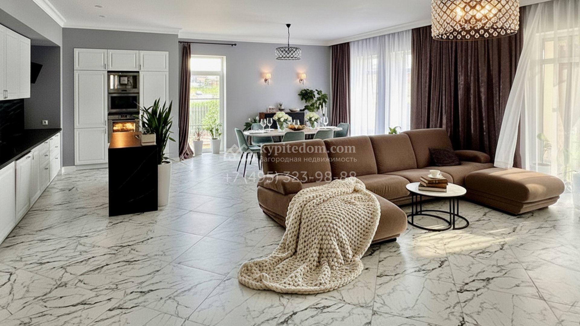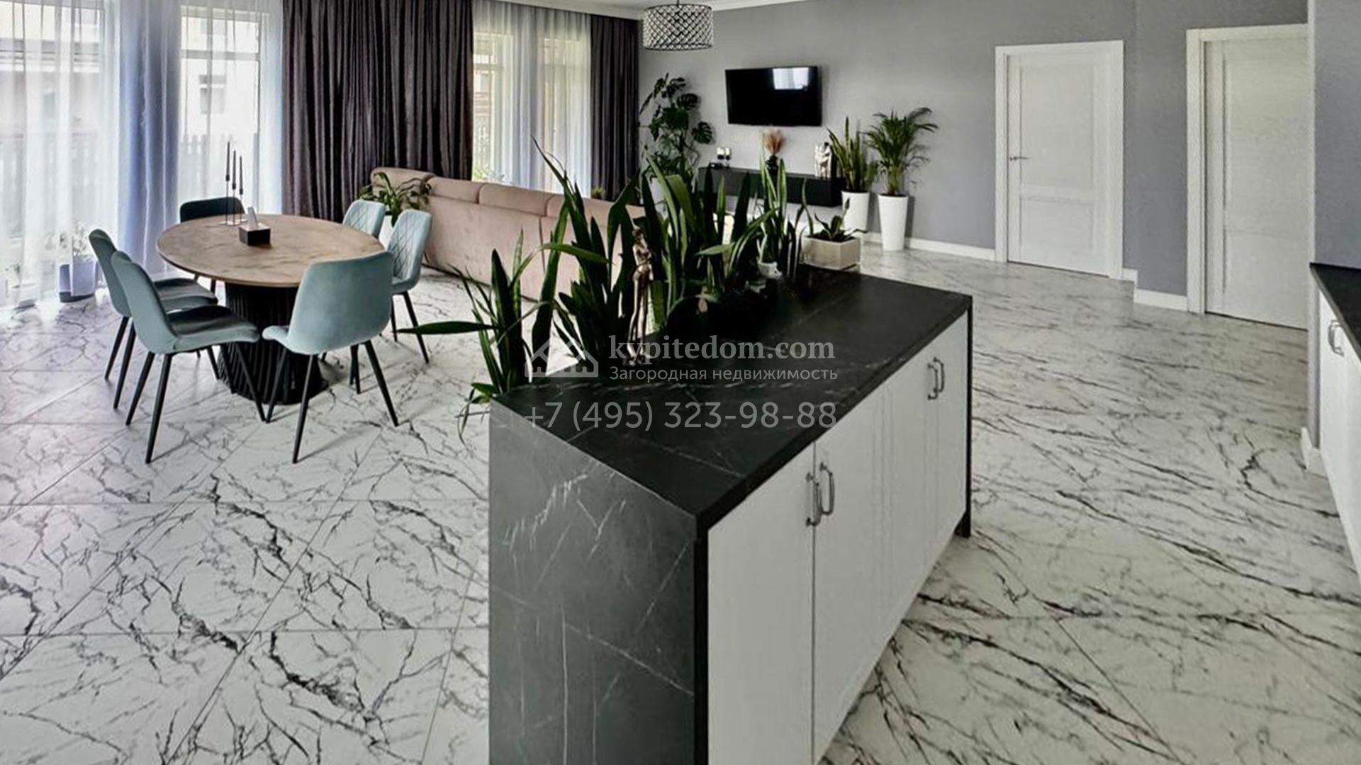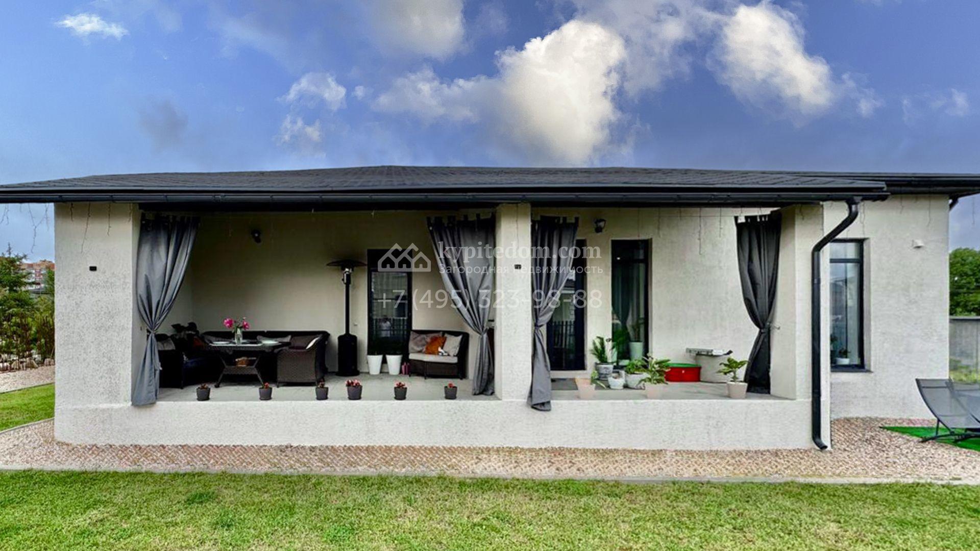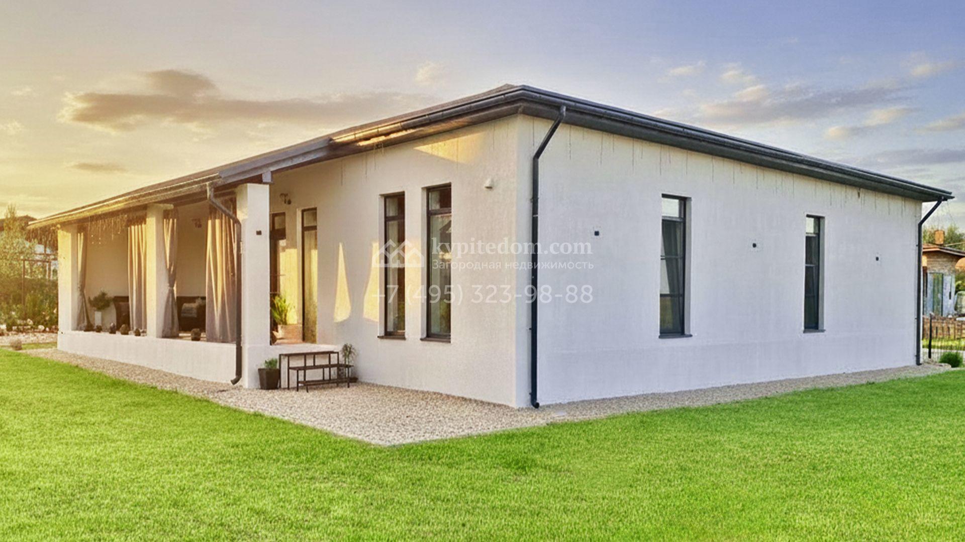 Загородный коттедж площадью 187 м² расположен на полевом участке 10 соток в тихой части посёлка. Современный одноэтажный фасад с окнами в пол облицован белоснежной штукатуркой. Интерьеры выдержаны в светлых, спокойных тонах, а также укомплектованы комфортной мебелью и встроенной бытовой техникой Siemens и Bosch. Тёплые водяные полы обеспечивают приятный микроклимат.