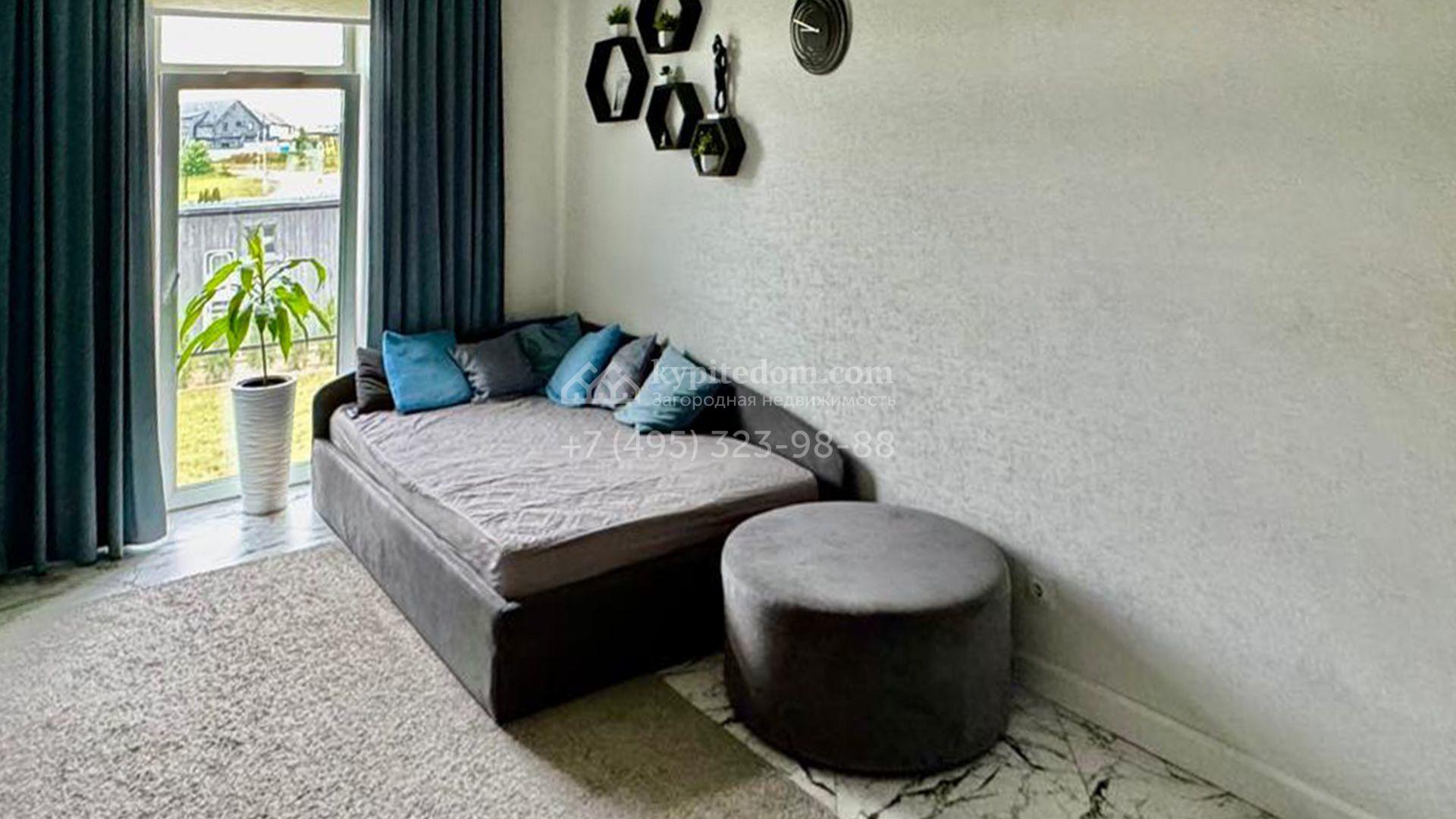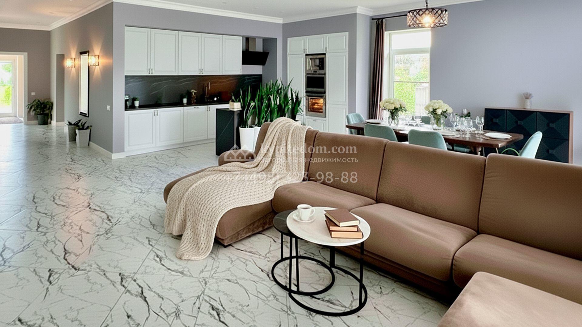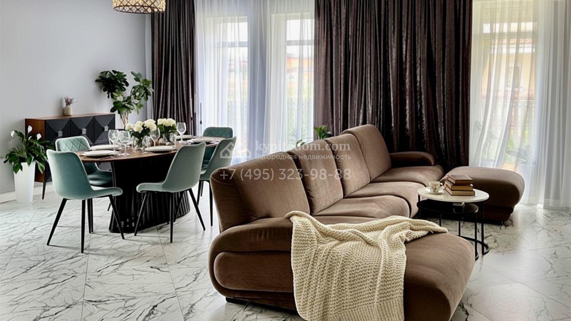 Загородный коттедж площадью 187 м² расположен на полевом участке 10 соток в тихой части посёлка. Современный одноэтажный фасад с окнами в пол облицован белоснежной штукатуркой. Интерьеры выдержаны в светлых, спокойных тонах, а также укомплектованы комфортной мебелью и встроенной бытовой техникой Siemens и Bosch. Тёплые водяные полы обеспечивают приятный микроклимат.