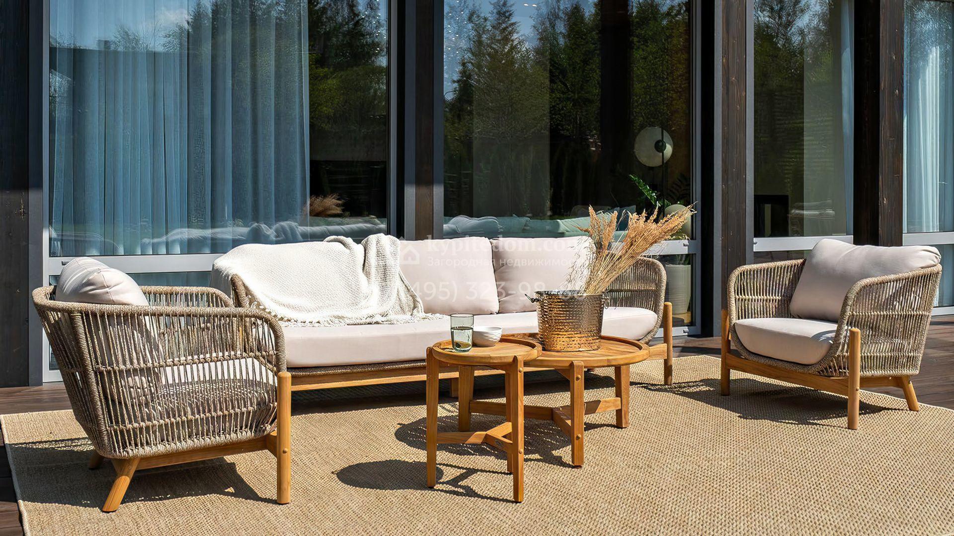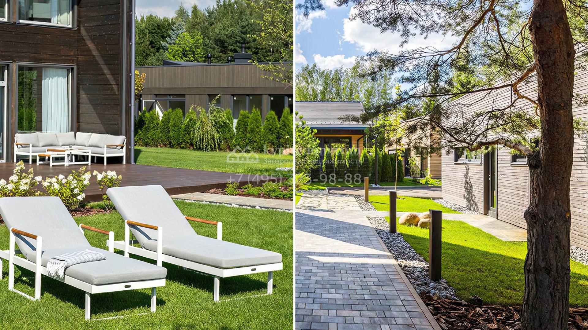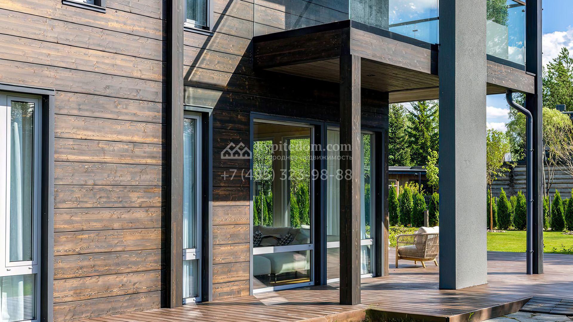 Двухэтажный финский дом из елового клееного бруса по проекту Caprise с отделкой «под ключ» и сауна из рубленого бревна расположены на участке 17 соток. Фасад главного дома впускает много света за счет большой площади остекления. Внутри спланированы 3 спальни и просторная кухня-гостиная с выходом в патио. Интерьер оформили по лаконичному дизайн-проекту в современном стиле, установили встроенную мебель и технику.