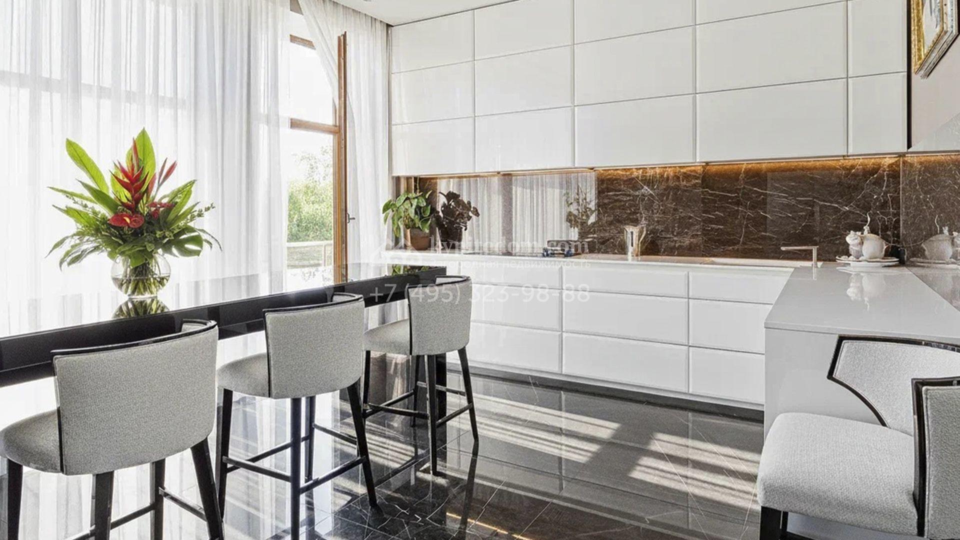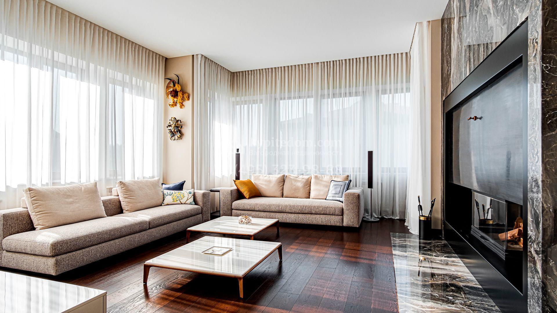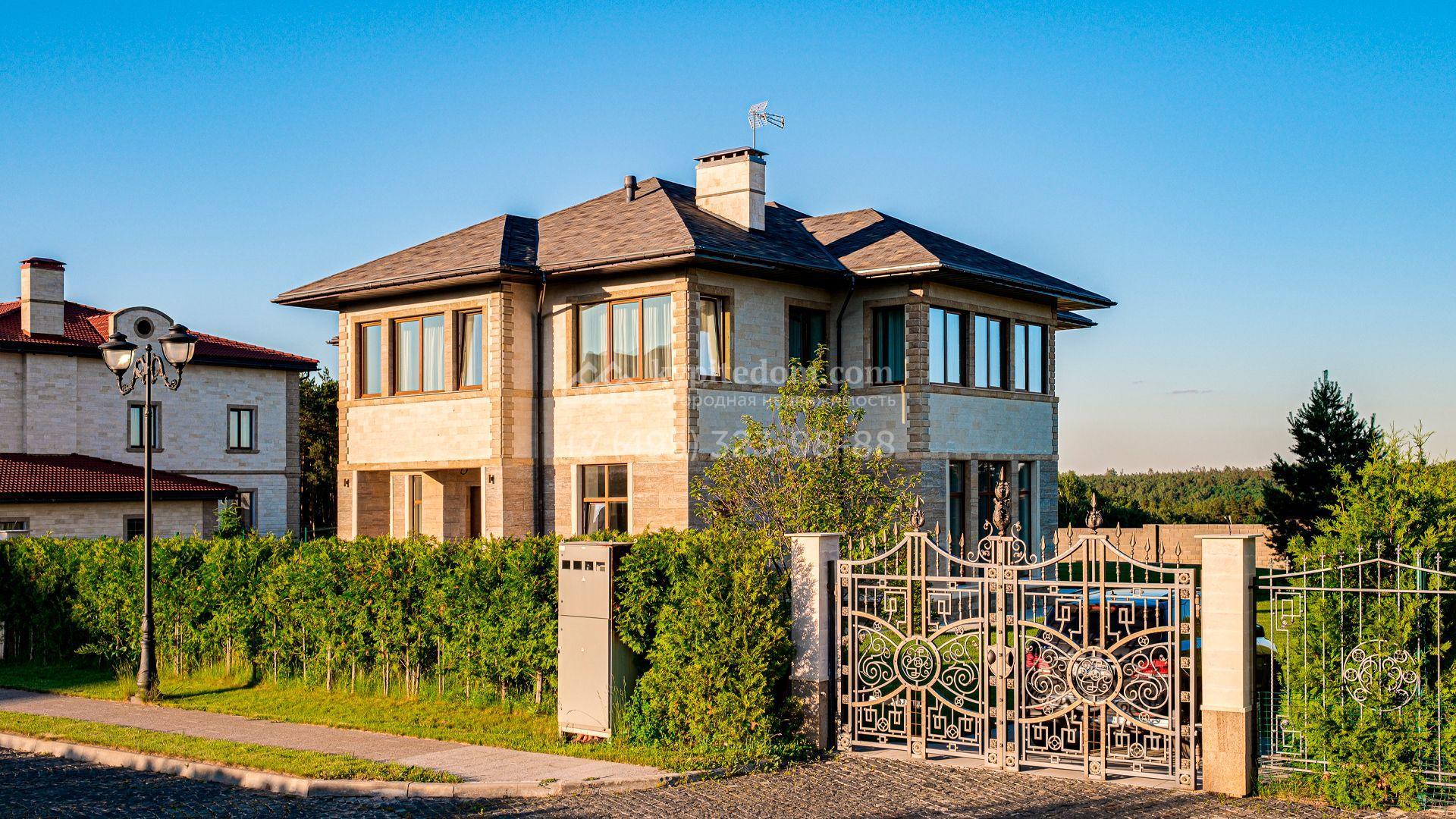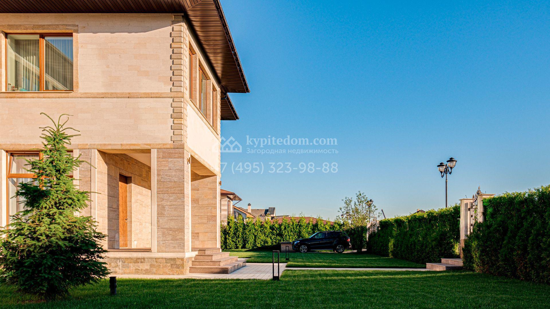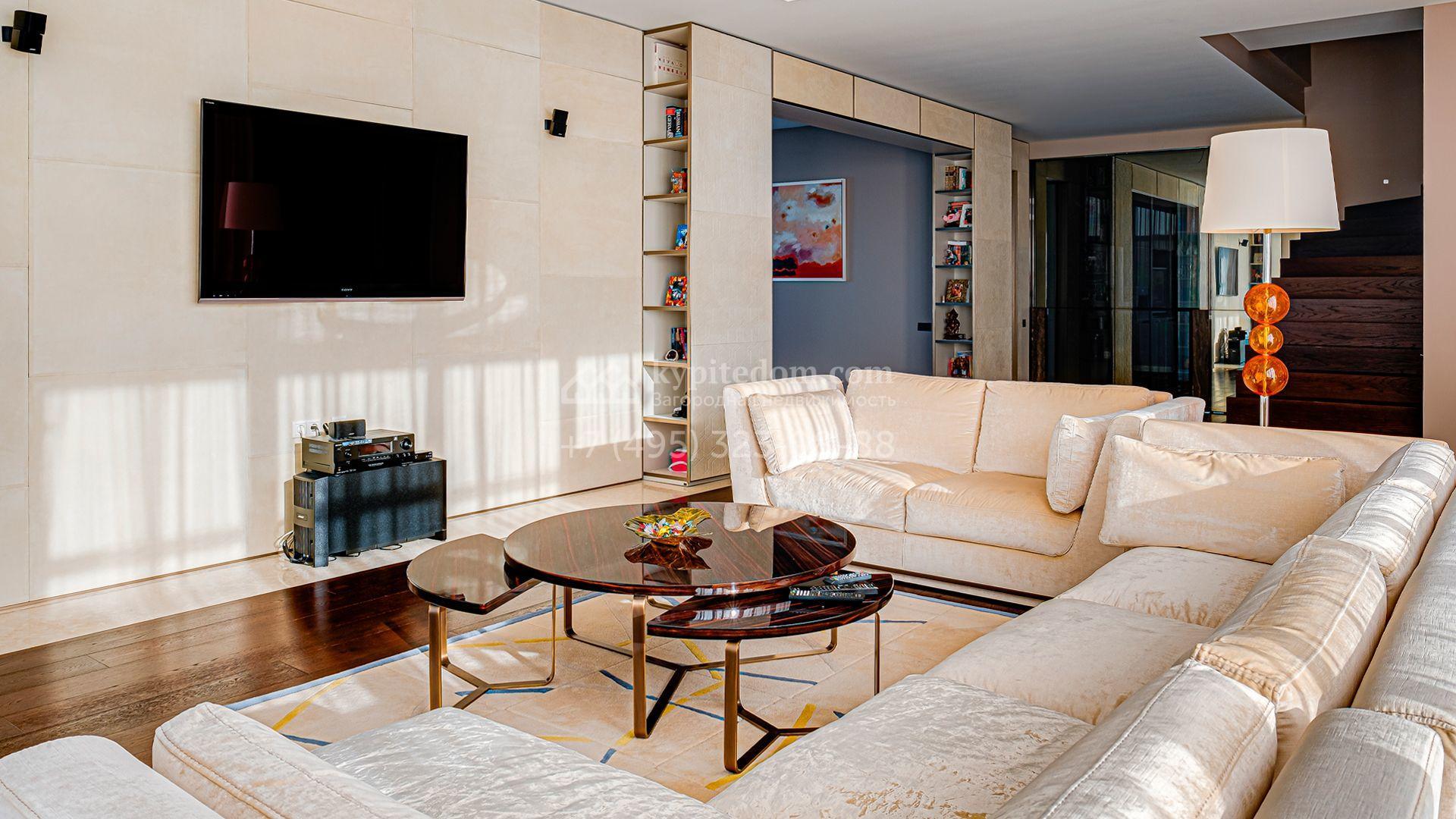 Загородный дом площадью 440 м² построен на полевом участке 23 сотки. Фасад в современном стиле отделан натуральным камнем бежевого цвета. Интерьер оформлен в светлых тёплых оттенках. Полы в резиденции выполнены мрамора, травертина и паркета из Италии. В оформлении использованы итальянские керамогранит Fiandre, раздвижные двери и стеновые панели LONGHI. Установлена сантехника HIPPE, Cielo, Gessi, Bisazza, Antonio Lupi, Duravit, Ideal Standard и кухня фабрики Mittel.