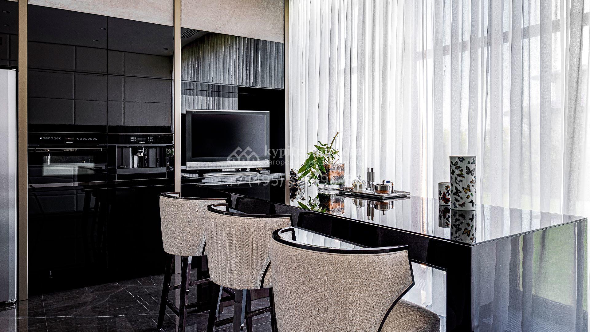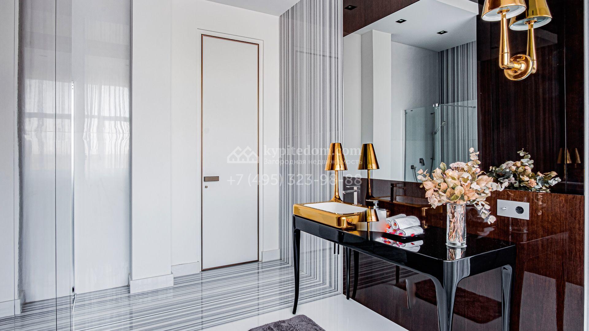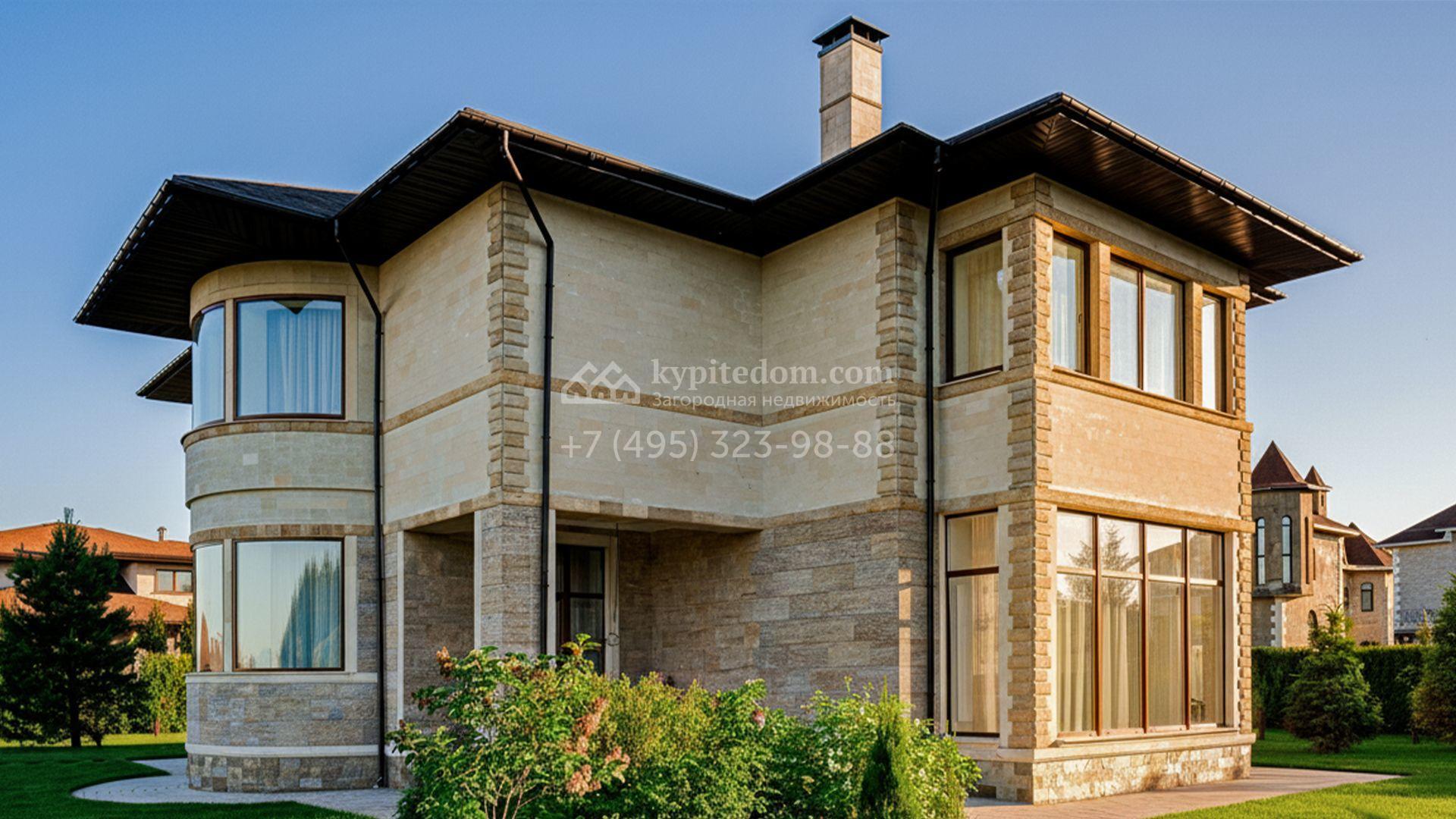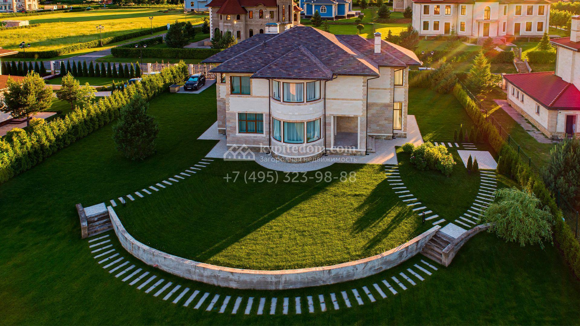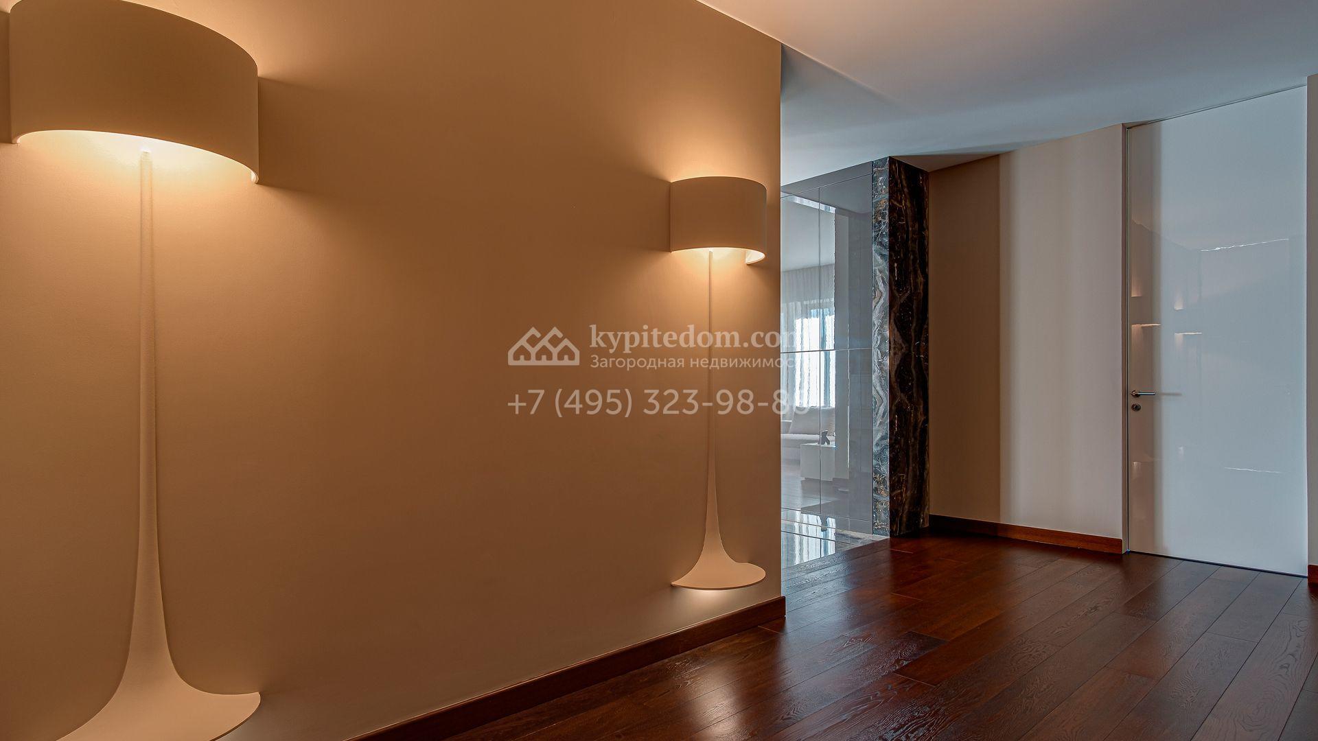 Загородный дом площадью 440 м² построен на полевом участке 23 сотки. Фасад в современном стиле отделан натуральным камнем бежевого цвета. Интерьер оформлен в светлых тёплых оттенках. Полы в резиденции выполнены мрамора, травертина и паркета из Италии. В оформлении использованы итальянские керамогранит Fiandre, раздвижные двери и стеновые панели LONGHI. Установлена сантехника HIPPE, Cielo, Gessi, Bisazza, Antonio Lupi, Duravit, Ideal Standard и кухня фабрики Mittel.