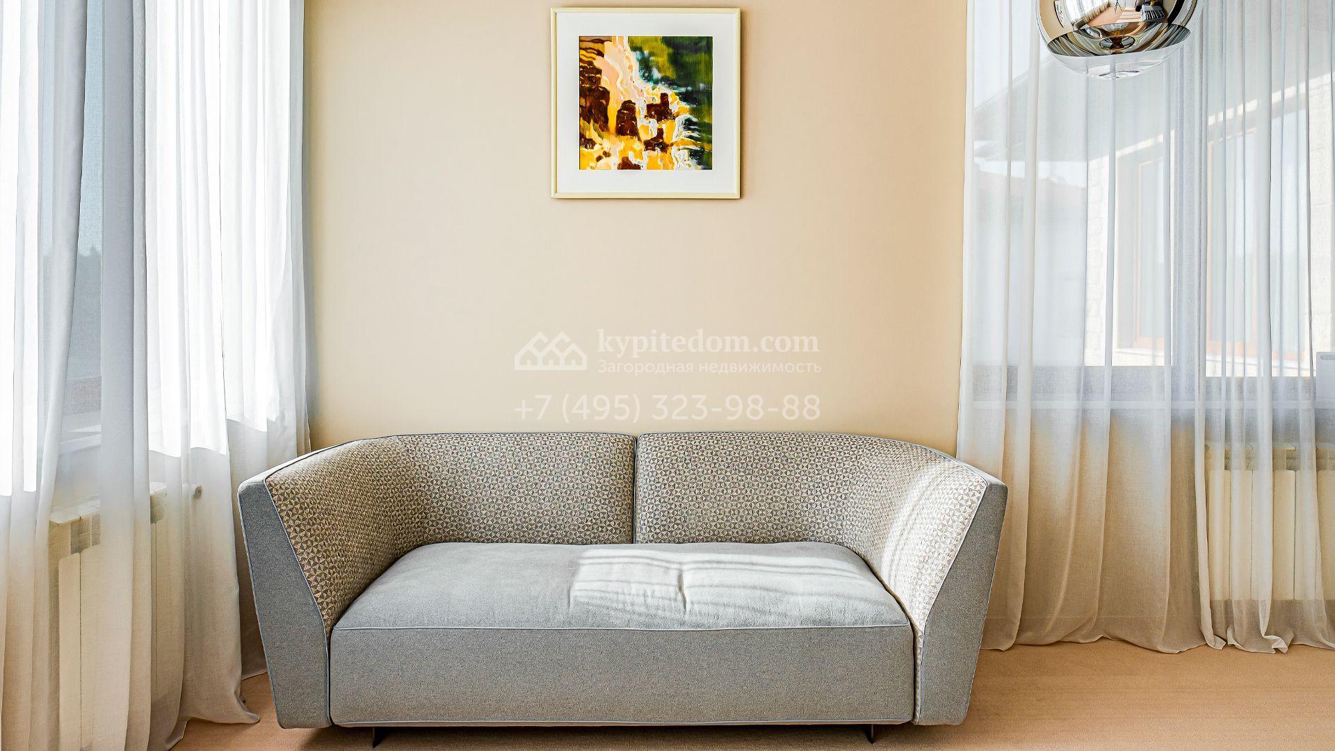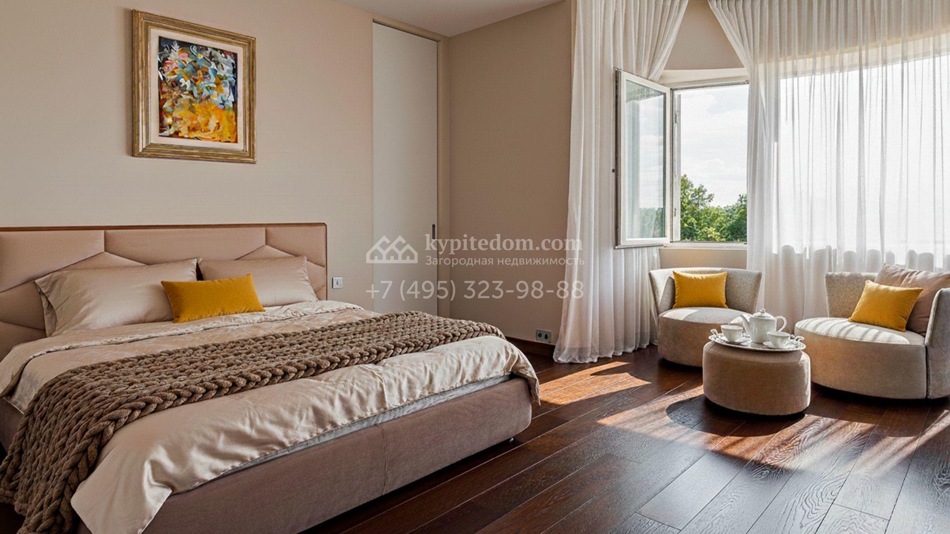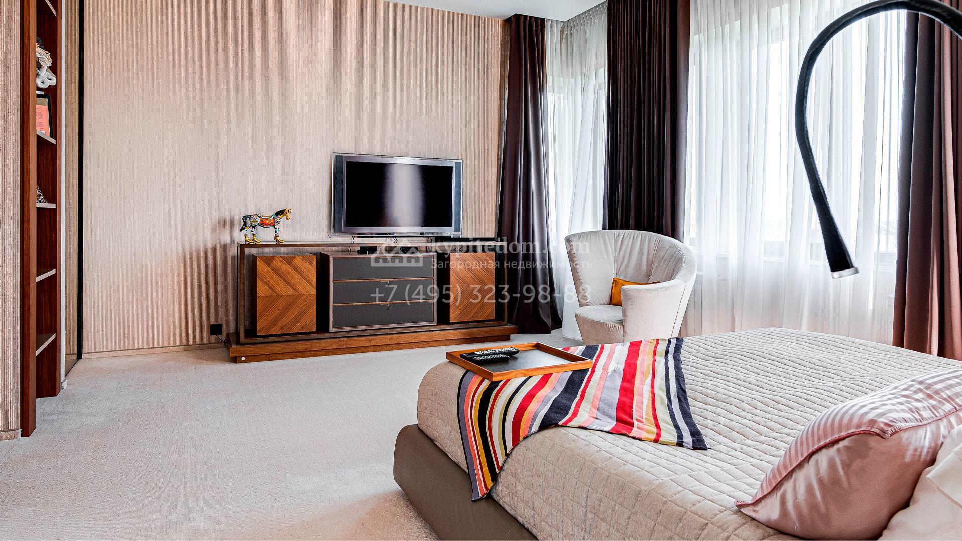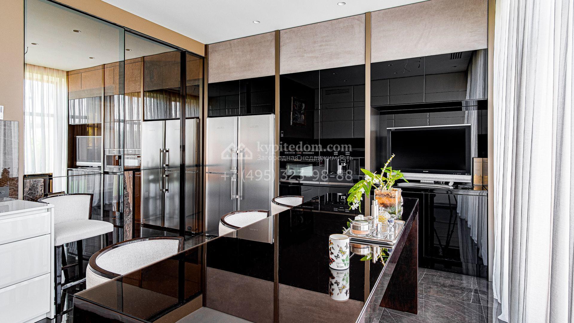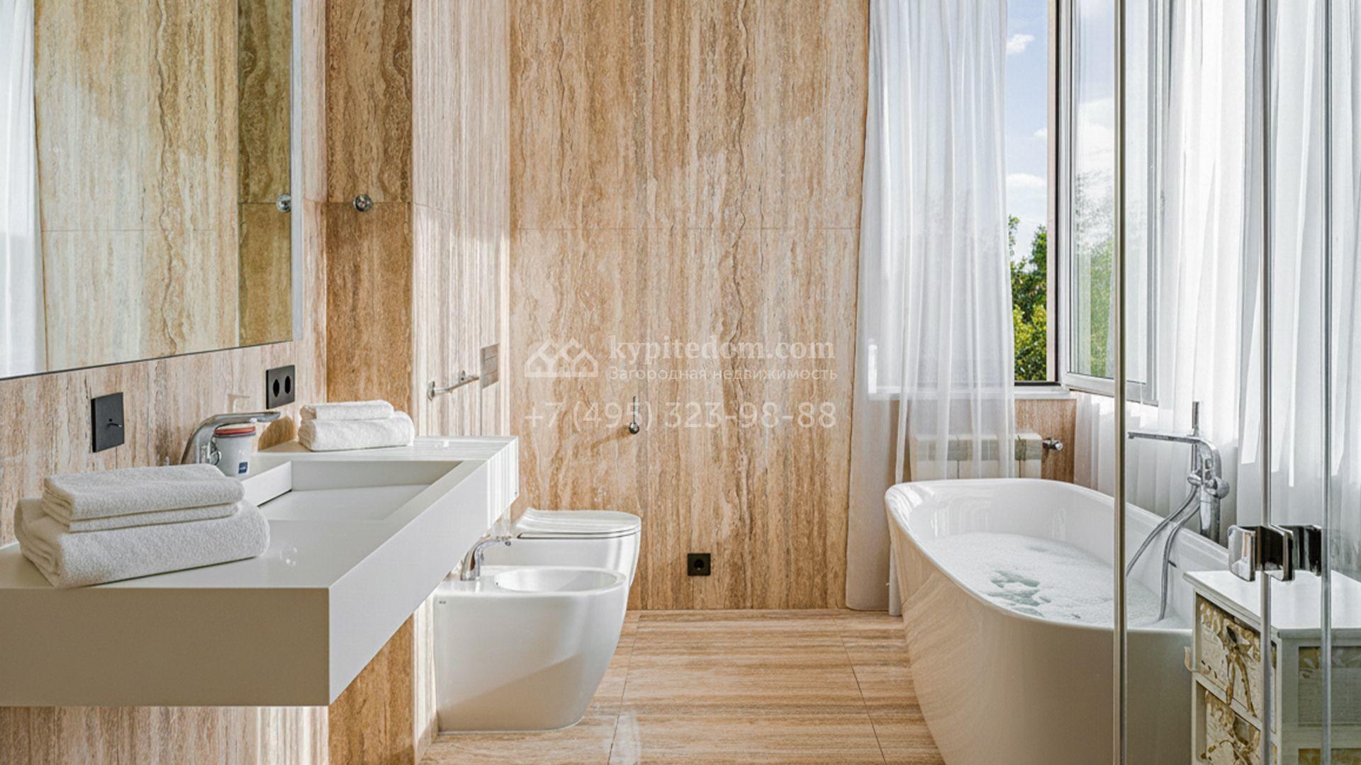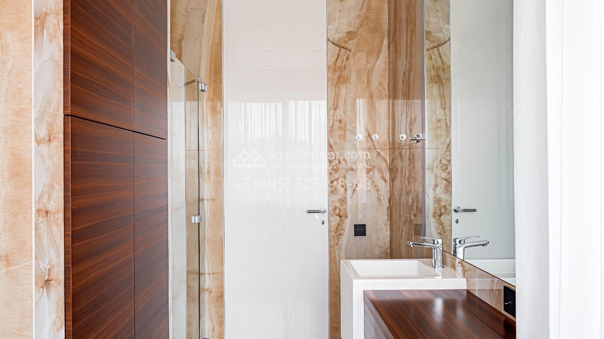 Загородный дом площадью 440 м² построен на полевом участке 23 сотки. Фасад в современном стиле отделан натуральным камнем бежевого цвета. Интерьер оформлен в светлых тёплых оттенках. Полы в резиденции выполнены мрамора, травертина и паркета из Италии. В оформлении использованы итальянские керамогранит Fiandre, раздвижные двери и стеновые панели LONGHI. Установлена сантехника HIPPE, Cielo, Gessi, Bisazza, Antonio Lupi, Duravit, Ideal Standard и кухня фабрики Mittel.