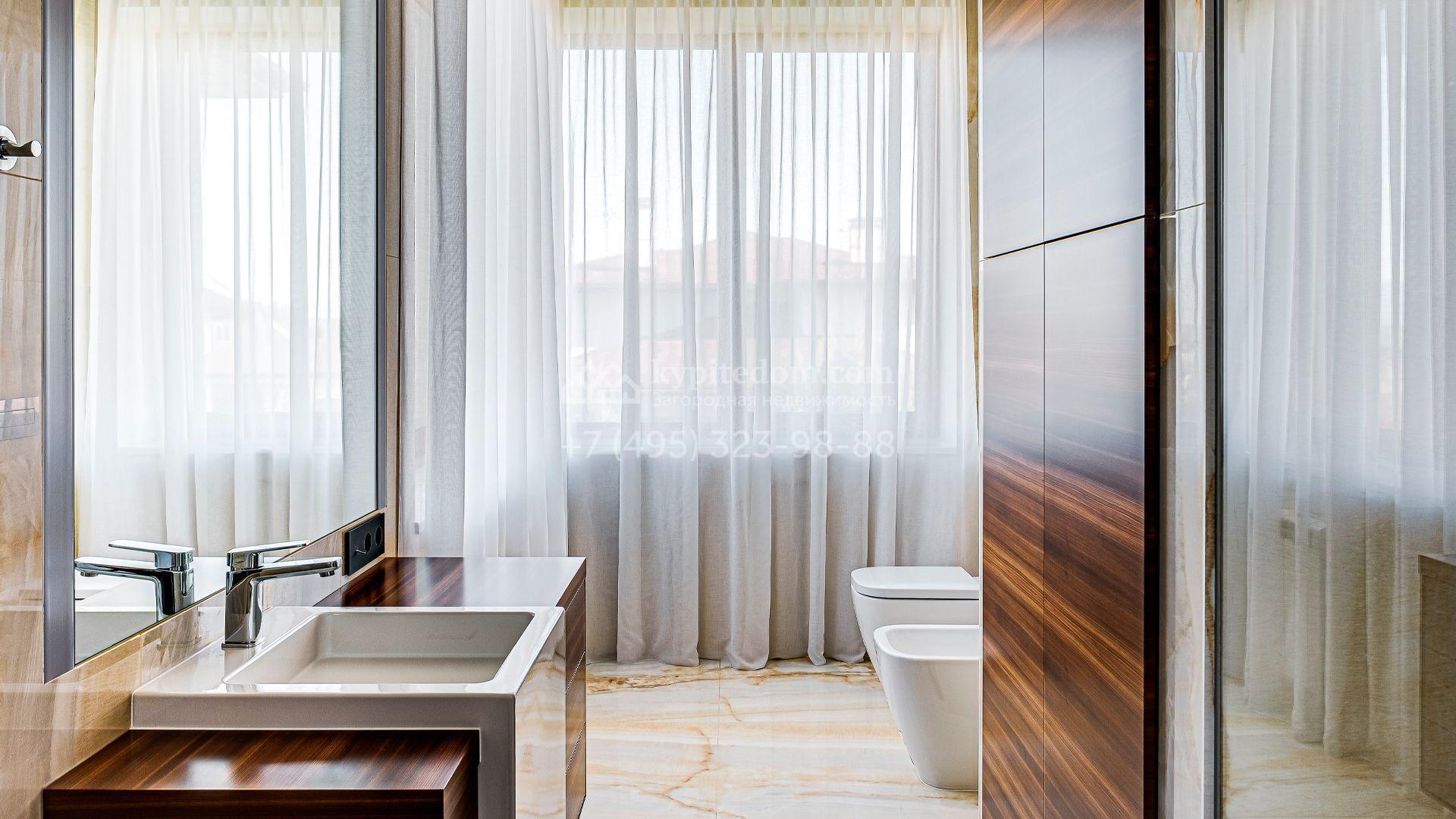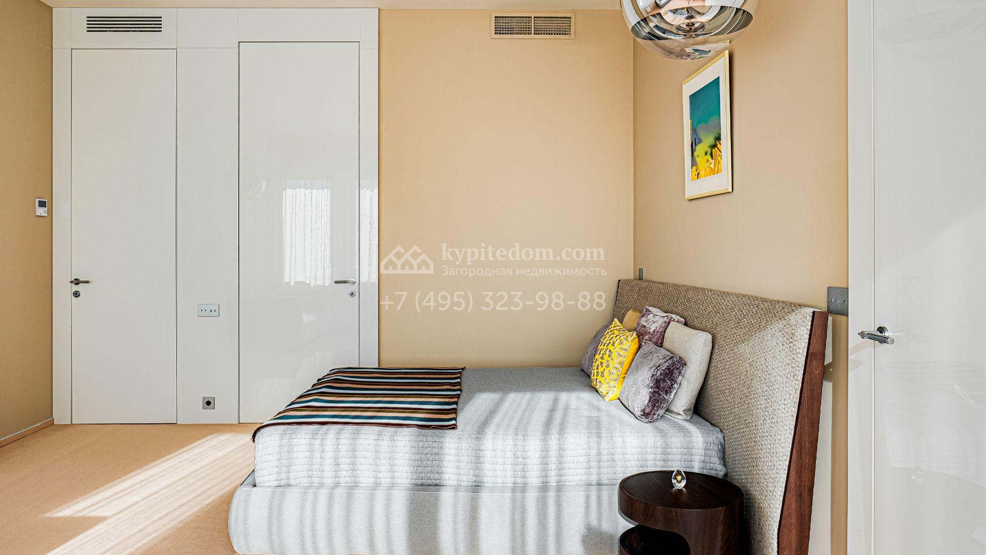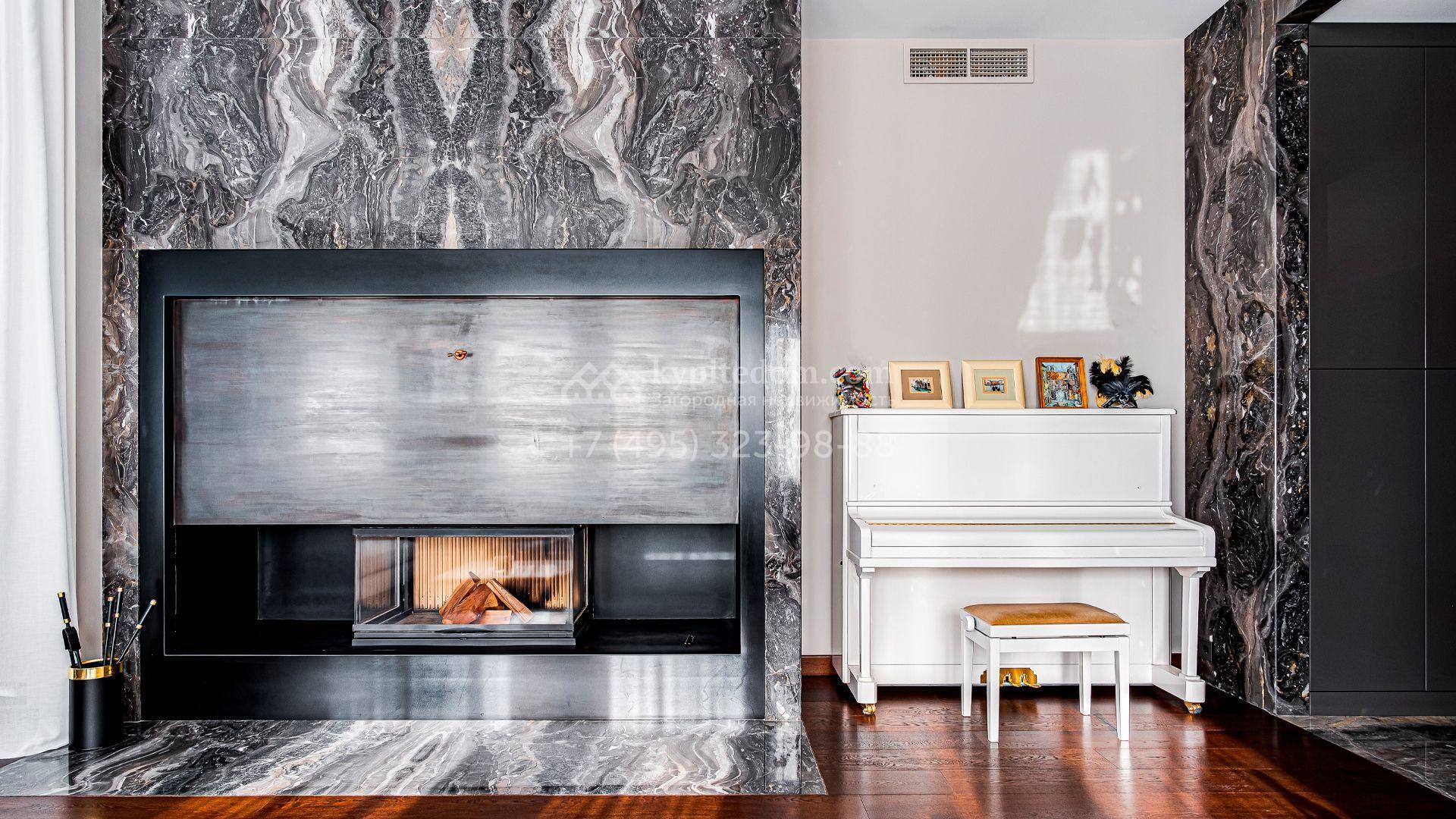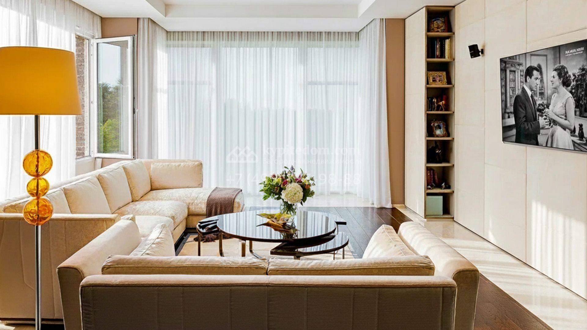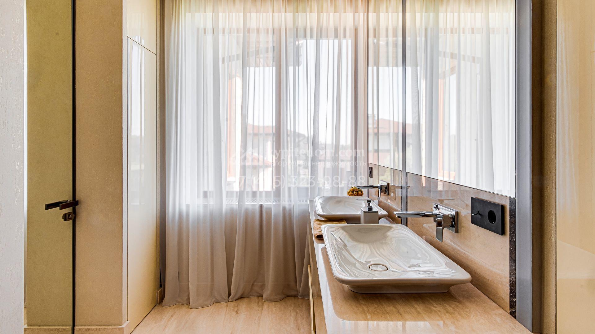 Загородный дом площадью 440 м² построен на полевом участке 23 сотки. Фасад в современном стиле отделан натуральным камнем бежевого цвета. Интерьер оформлен в светлых тёплых оттенках. Полы в резиденции выполнены мрамора, травертина и паркета из Италии. В оформлении использованы итальянские керамогранит Fiandre, раздвижные двери и стеновые панели LONGHI. Установлена сантехника HIPPE, Cielo, Gessi, Bisazza, Antonio Lupi, Duravit, Ideal Standard и кухня фабрики Mittel.