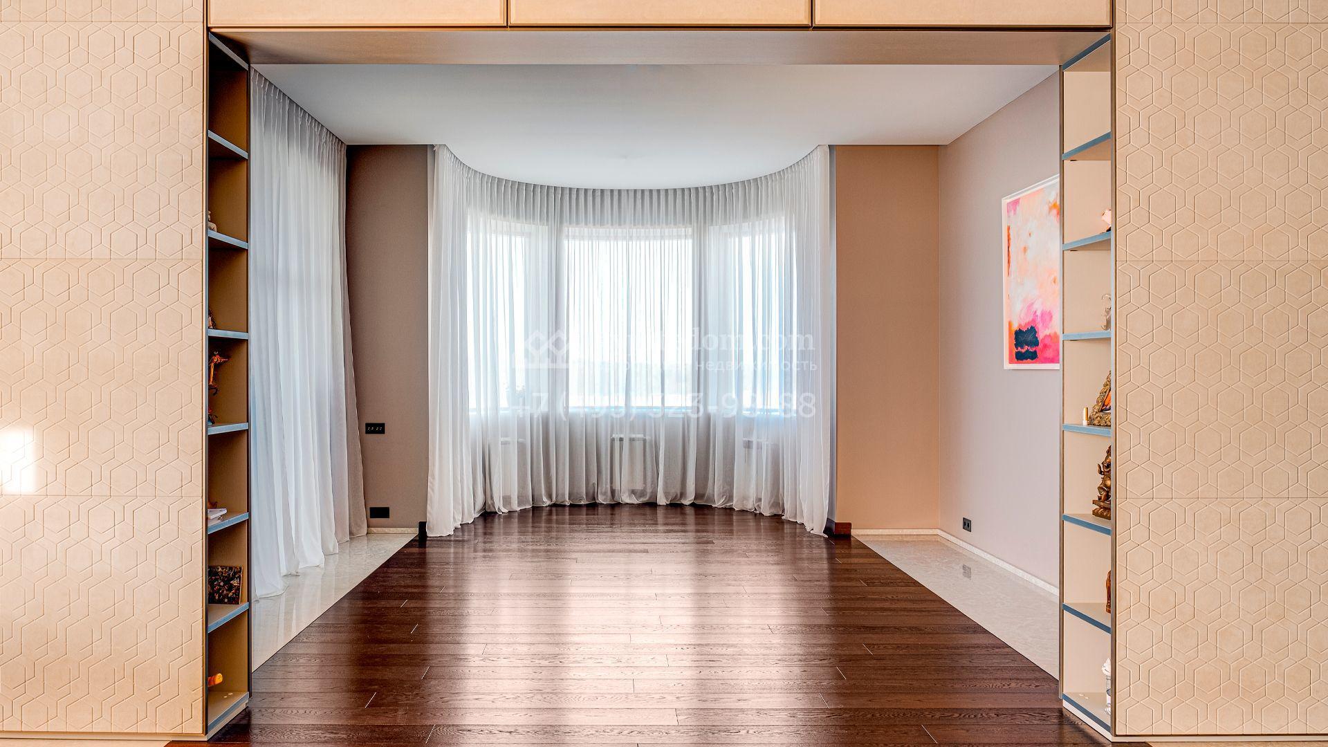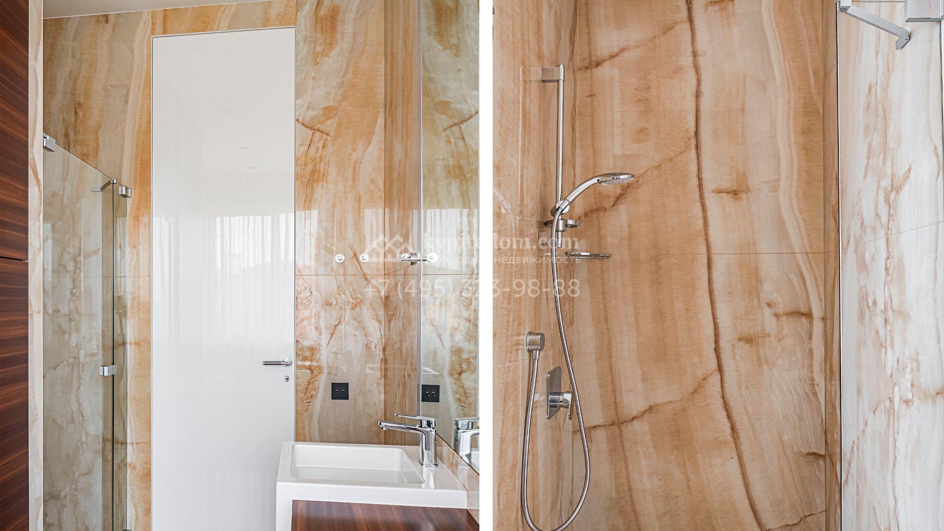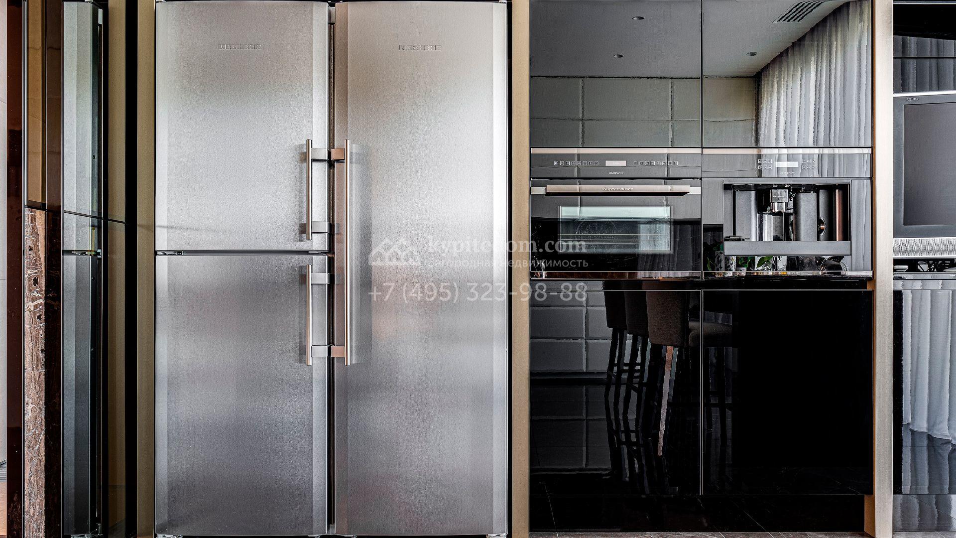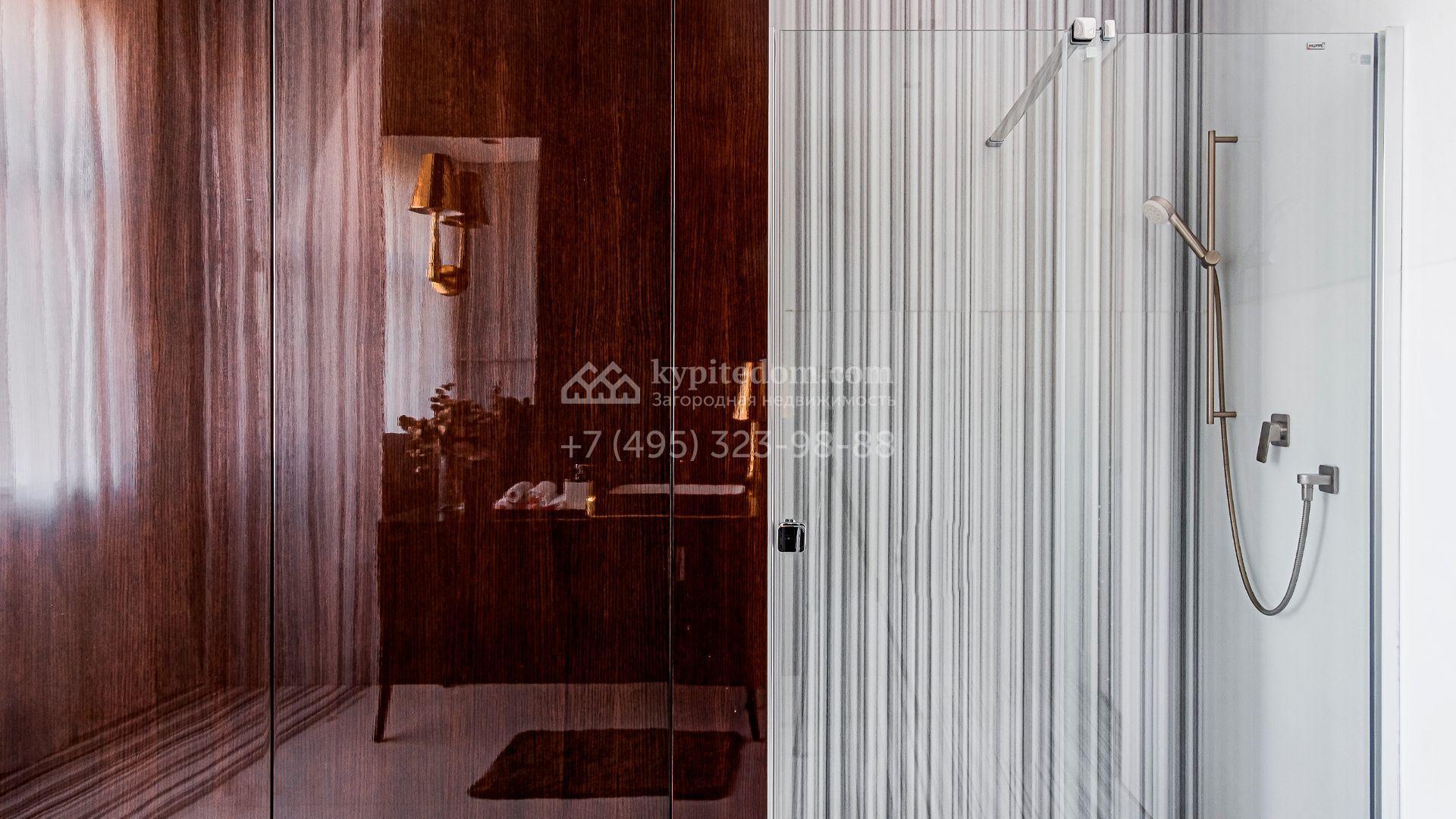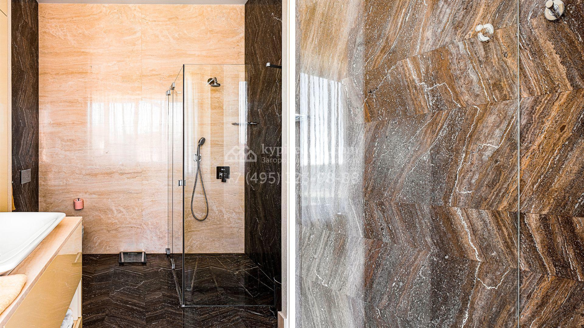Загородный дом площадью 440 м² построен на полевом участке 23 сотки. Фасад в современном стиле отделан натуральным камнем бежевого цвета. Интерьер оформлен в светлых тёплых оттенках. Полы в резиденции выполнены мрамора, травертина и паркета из Италии. В оформлении использованы итальянские керамогранит Fiandre, раздвижные двери и стеновые панели LONGHI. Установлена сантехника HIPPE, Cielo, Gessi, Bisazza, Antonio Lupi, Duravit, Ideal Standard и кухня фабрики Mittel.