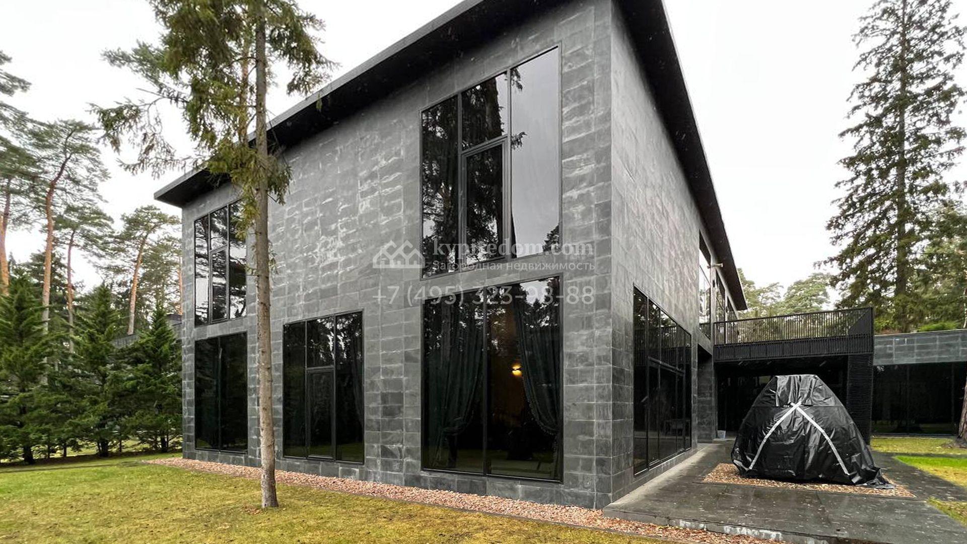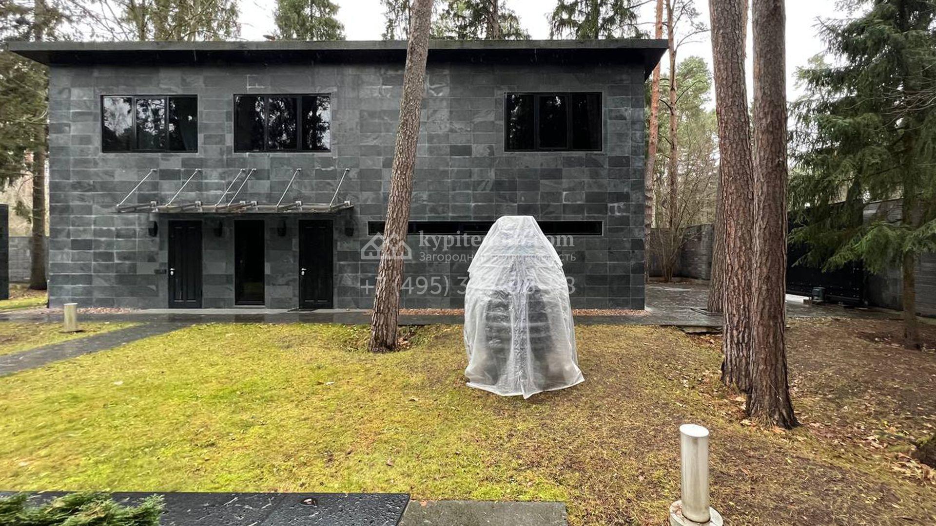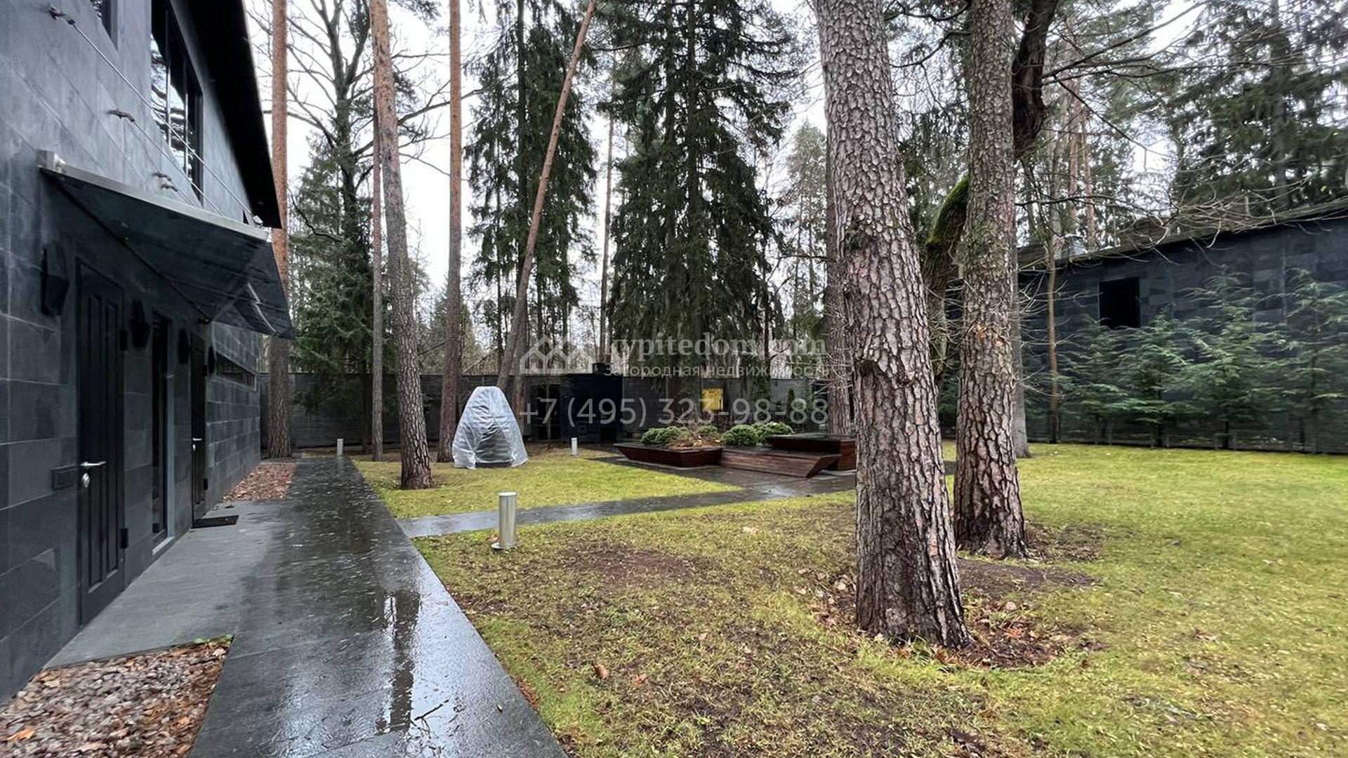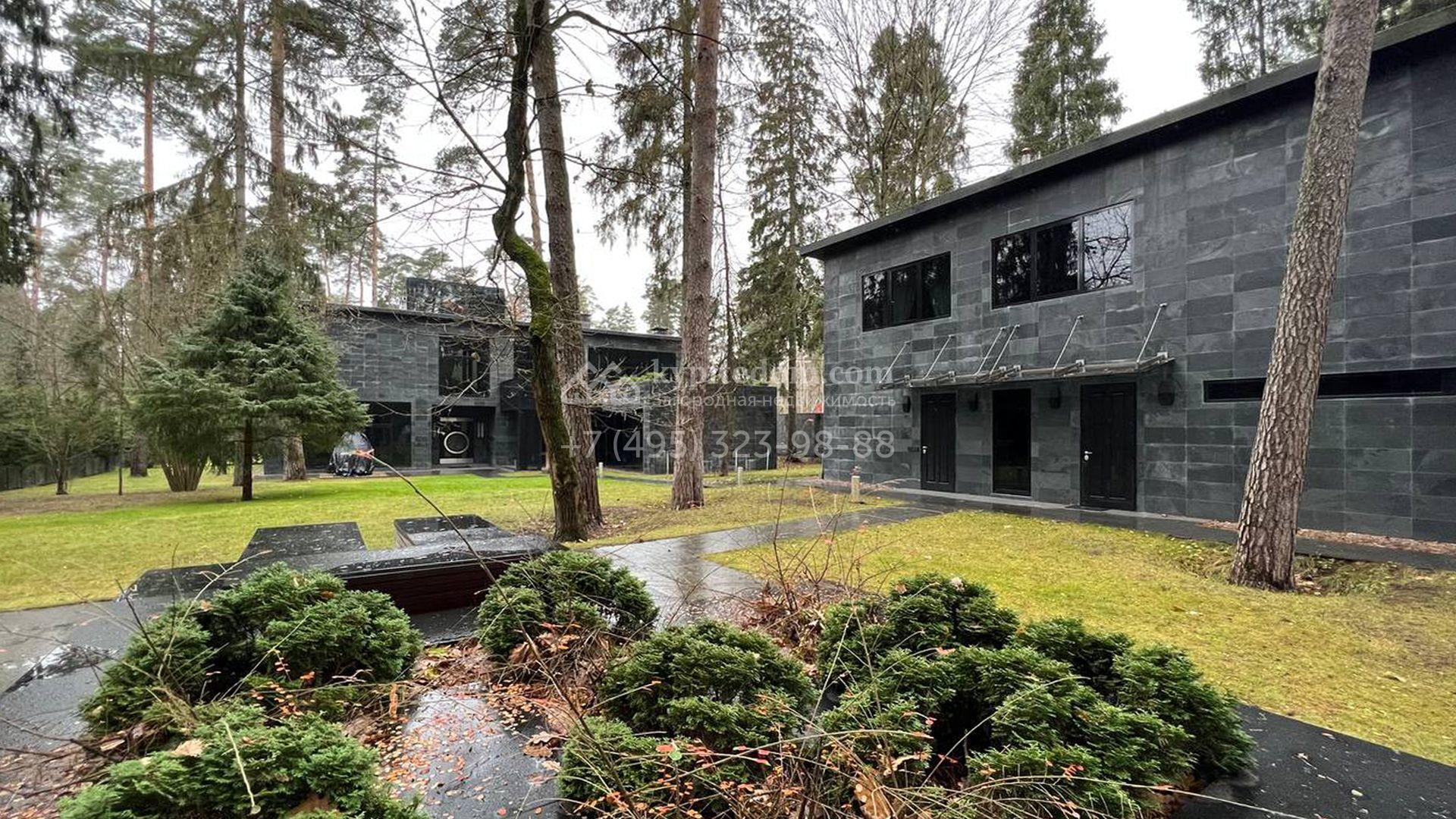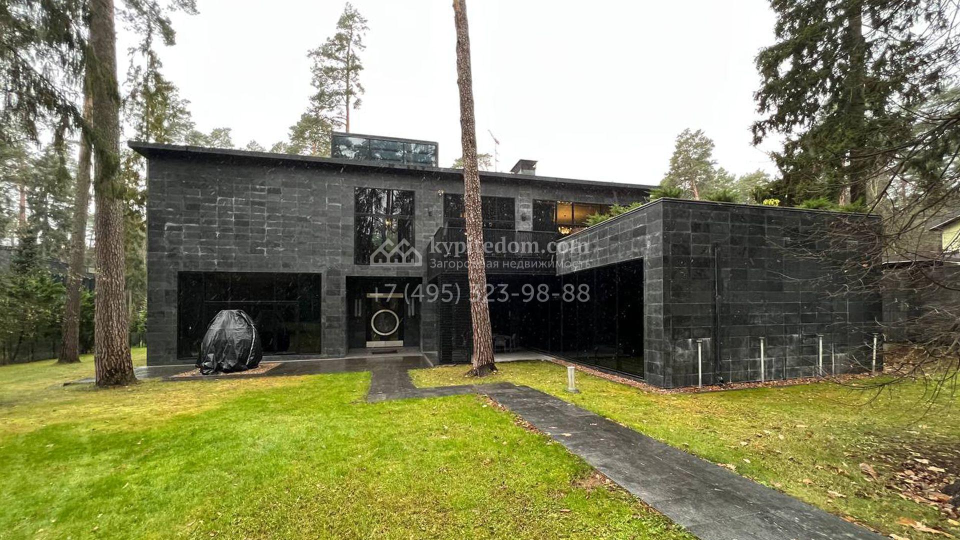 Загородный дом площадью 600 м² построен на просторном участке 25 соток с лесными деревьями. Фасад здания с большими окнами выполнен в современном стиле и облицован под темно-серый камень. В отделке лаконичного интерьера преобладают кремово-молочные оттенки в сочетании с темными контрастирующими элементами. Планировкой резиденции предусмотрены 4 спальни, гостиная с камином, кухня-столовая с выходом на террасу и SPA-зона с бассейном и сауной. На третьем уровне разместили лаунж-зону, из которой можно попасть на эксплуатируемую кровлю. Рядом расположены дом для персонала с гаражом на 2 машины и зона барбекю. На участке засеян газон, вымощены дорожки и установлено уличное освещение.