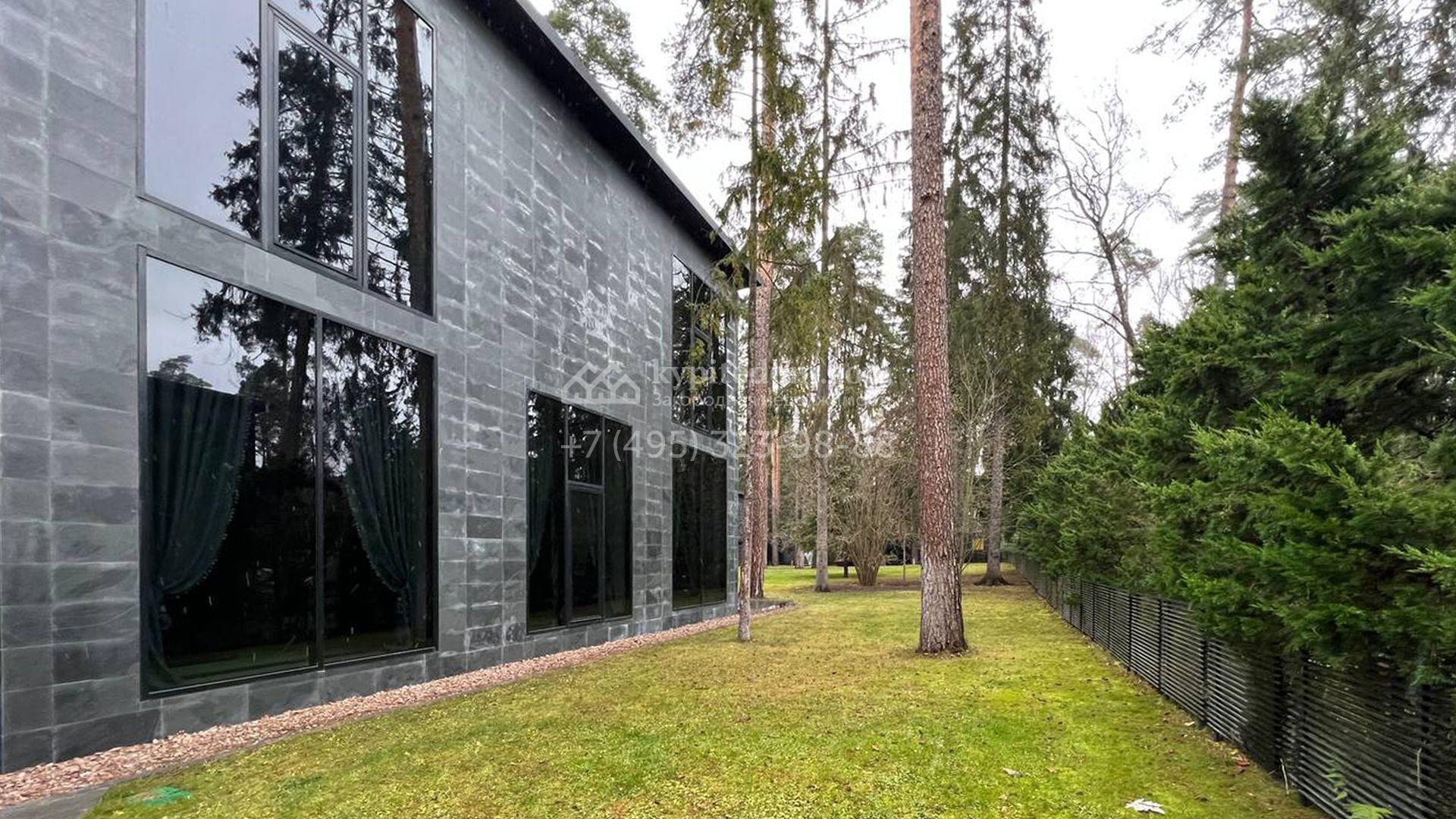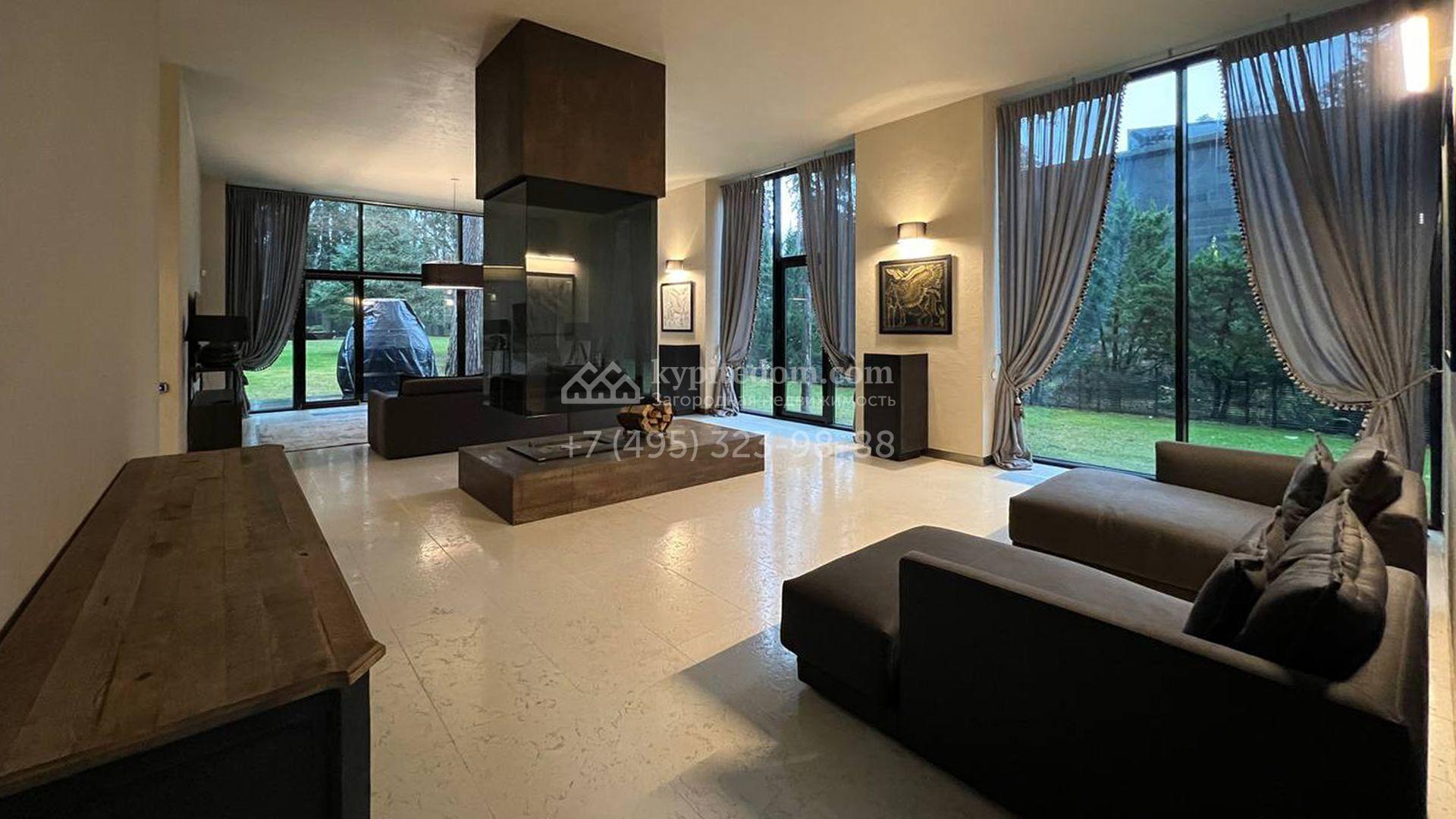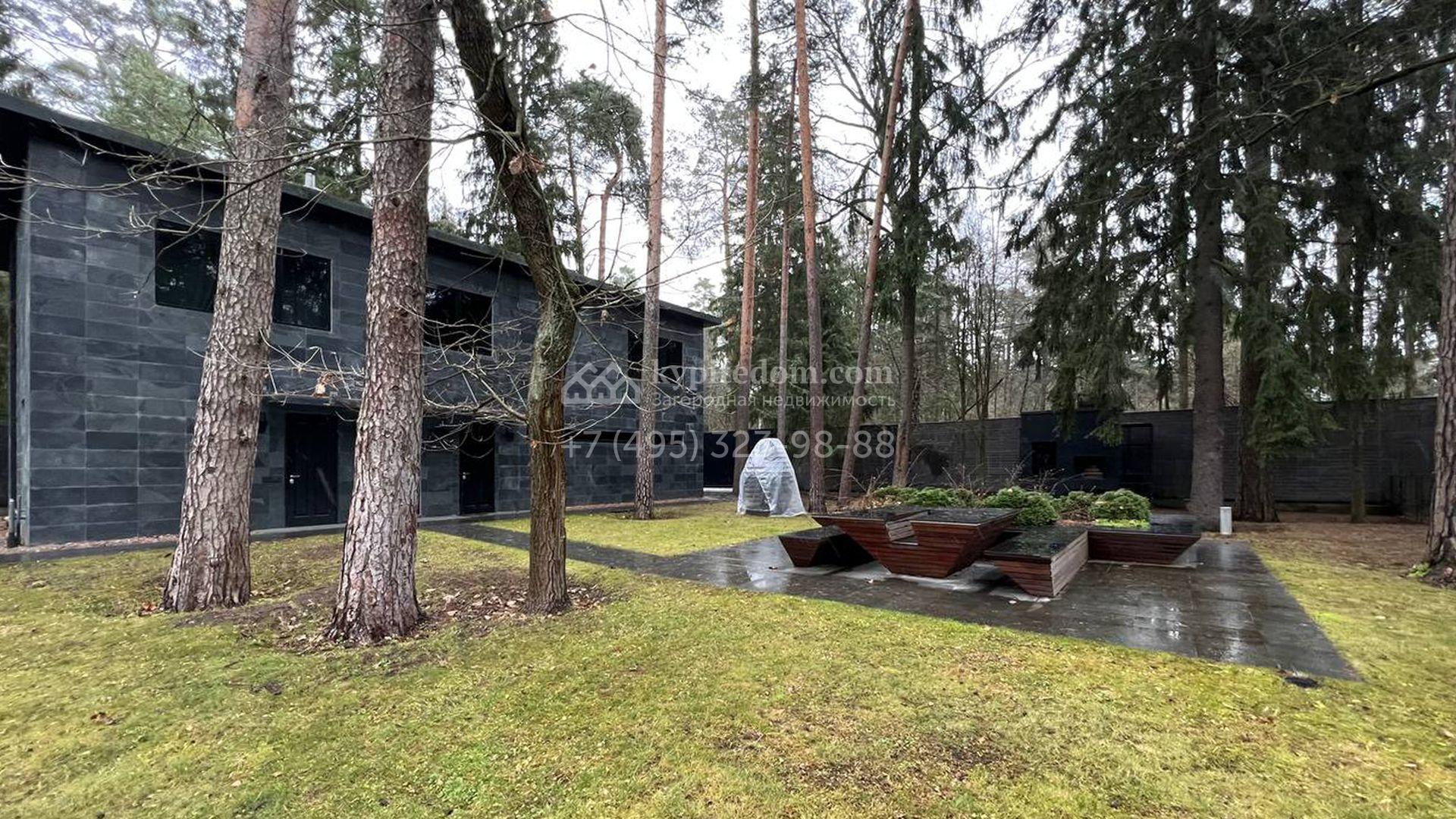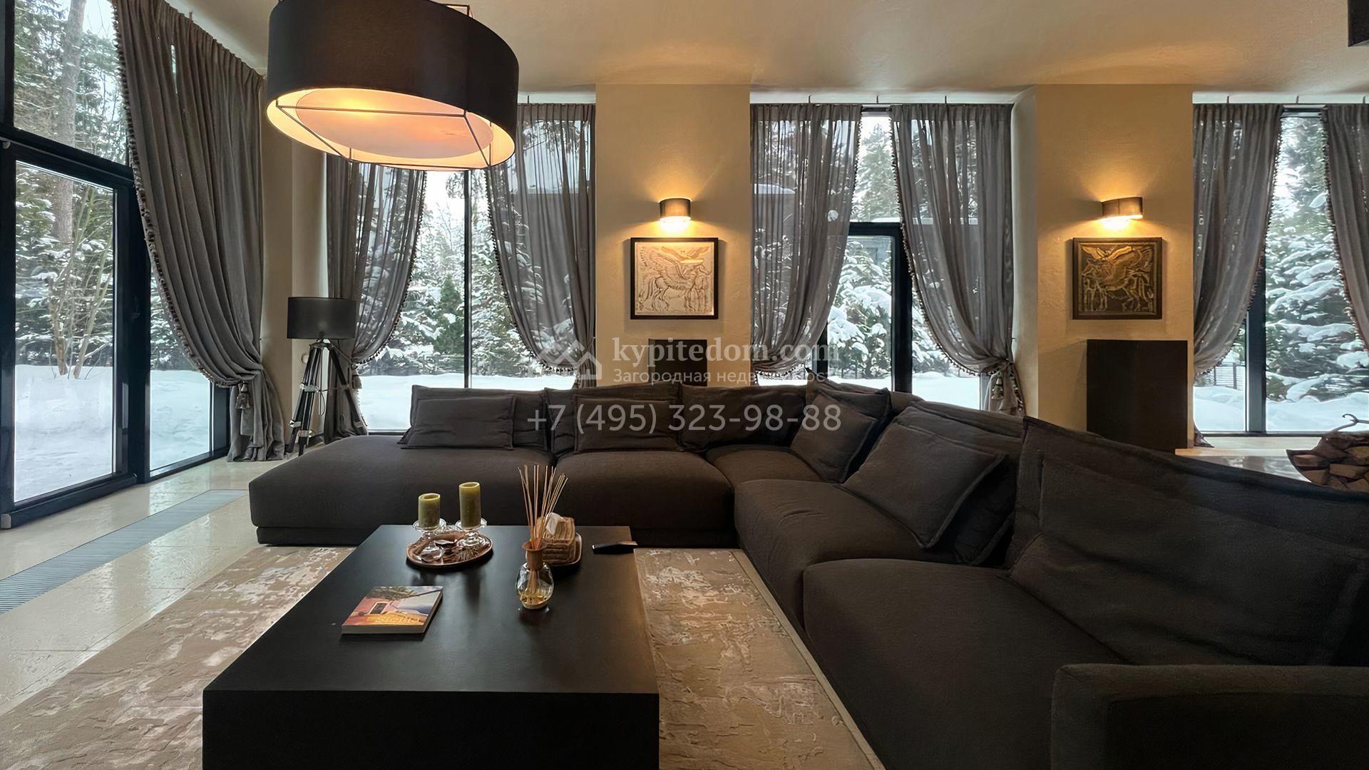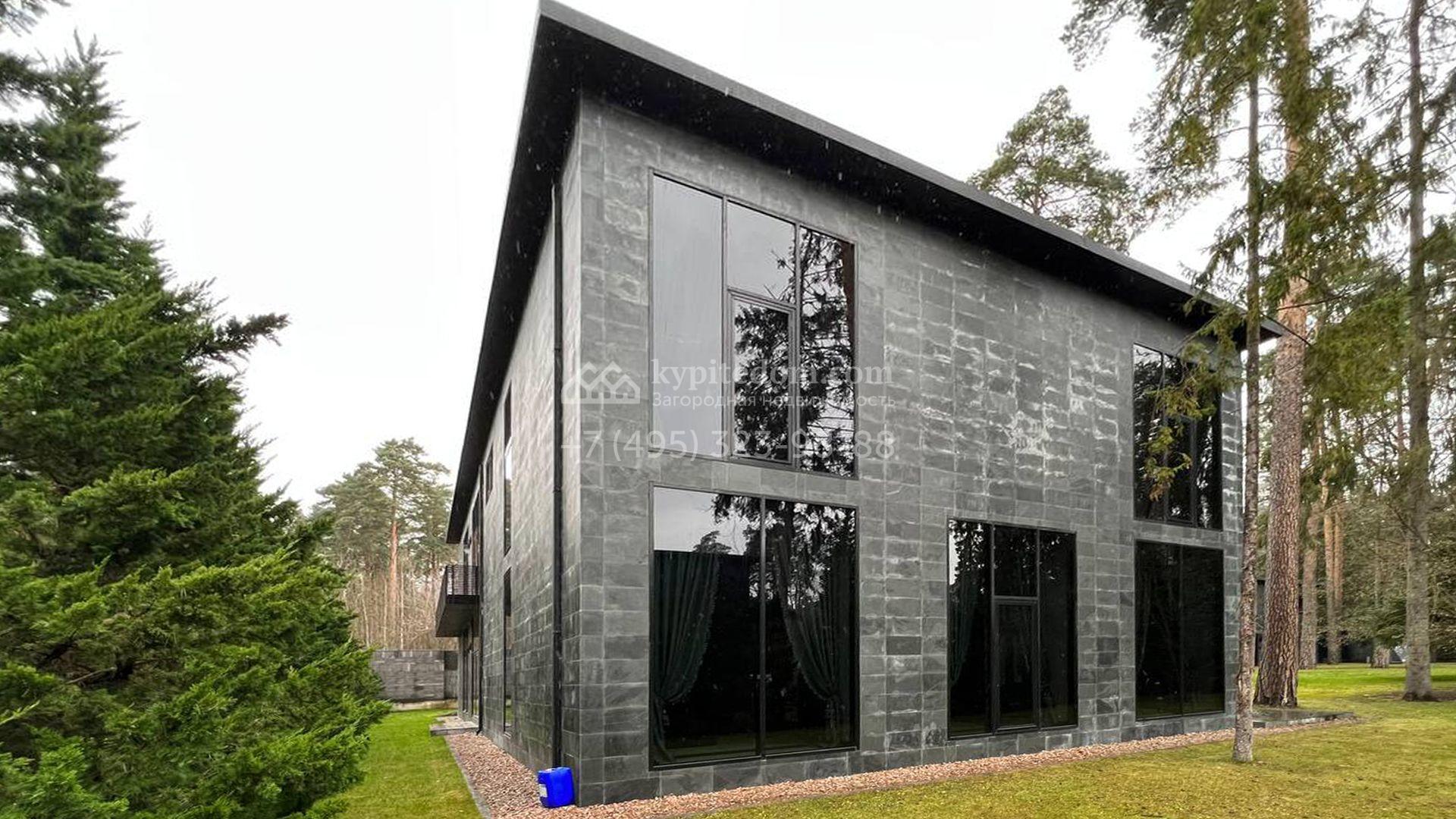 Загородный дом площадью 600 м² построен на просторном участке 25 соток с лесными деревьями. Фасад здания с большими окнами выполнен в современном стиле и облицован под темно-серый камень. В отделке лаконичного интерьера преобладают кремово-молочные оттенки в сочетании с темными контрастирующими элементами. Планировкой резиденции предусмотрены 4 спальни, гостиная с камином, кухня-столовая с выходом на террасу и SPA-зона с бассейном и сауной. На третьем уровне разместили лаунж-зону, из которой можно попасть на эксплуатируемую кровлю. Рядом расположены дом для персонала с гаражом на 2 машины и зона барбекю. На участке засеян газон, вымощены дорожки и установлено уличное освещение.
