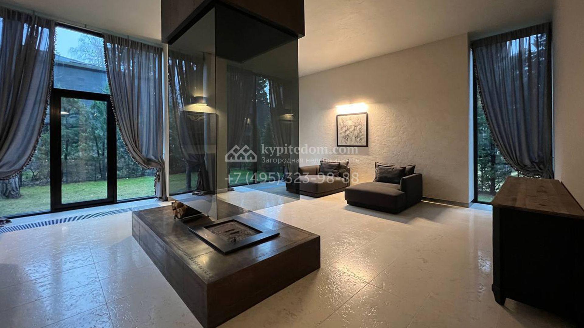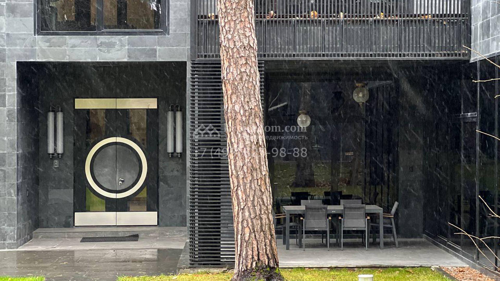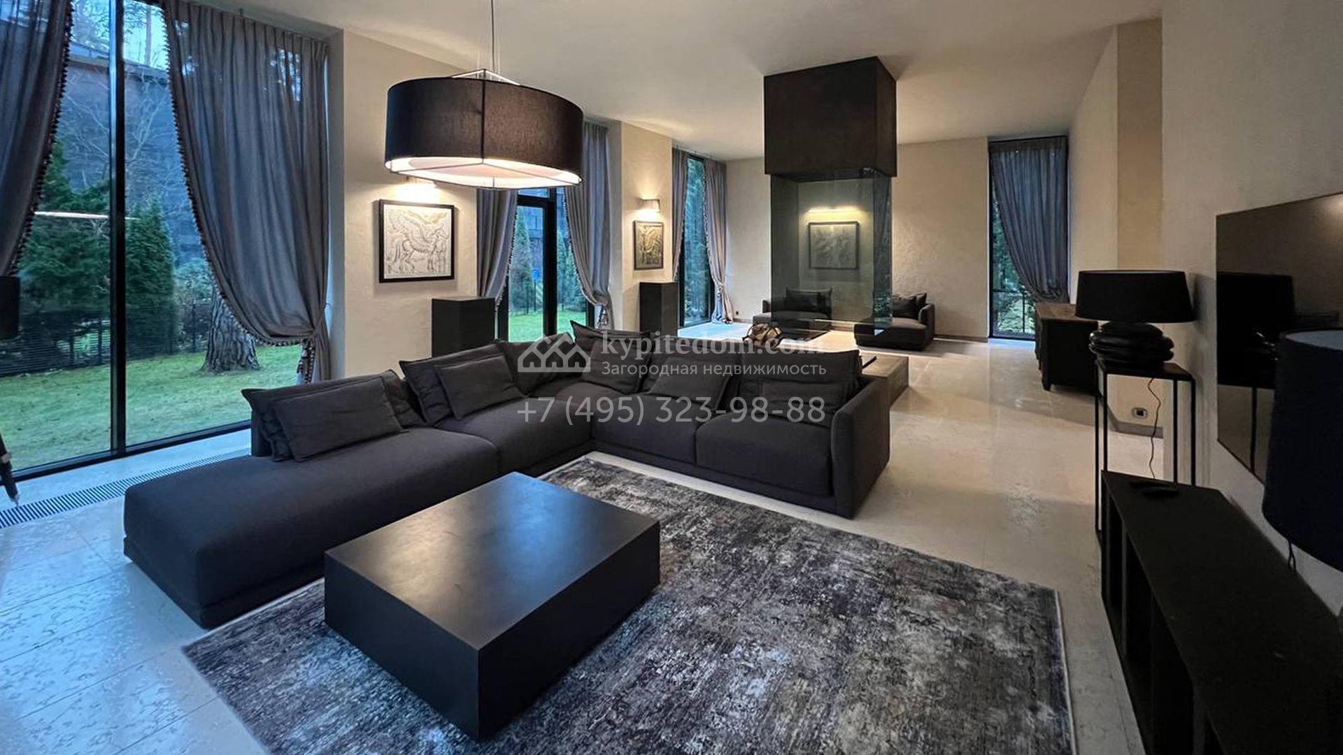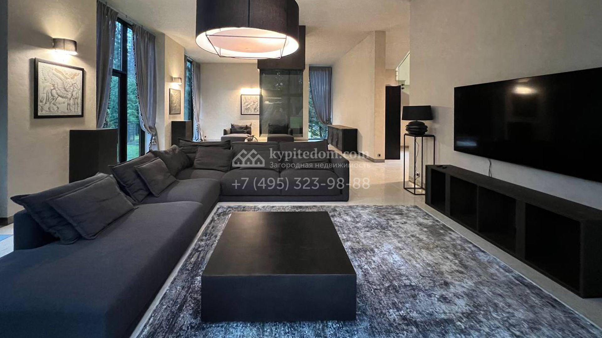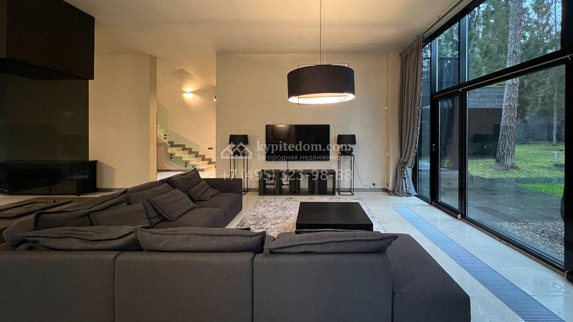 Загородный дом площадью 600 м² построен на просторном участке 25 соток с лесными деревьями. Фасад здания с большими окнами выполнен в современном стиле и облицован под темно-серый камень. В отделке лаконичного интерьера преобладают кремово-молочные оттенки в сочетании с темными контрастирующими элементами. Планировкой резиденции предусмотрены 4 спальни, гостиная с камином, кухня-столовая с выходом на террасу и SPA-зона с бассейном и сауной. На третьем уровне разместили лаунж-зону, из которой можно попасть на эксплуатируемую кровлю. Рядом расположены дом для персонала с гаражом на 2 машины и зона барбекю. На участке засеян газон, вымощены дорожки и установлено уличное освещение.