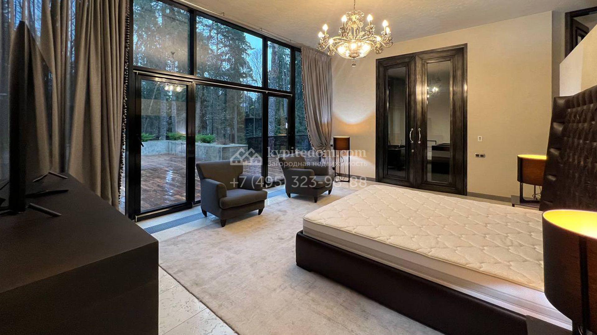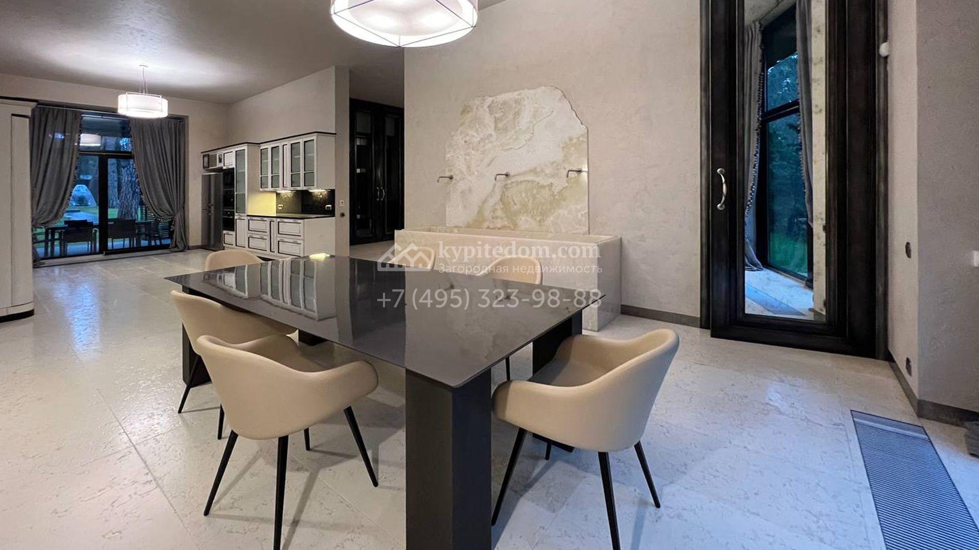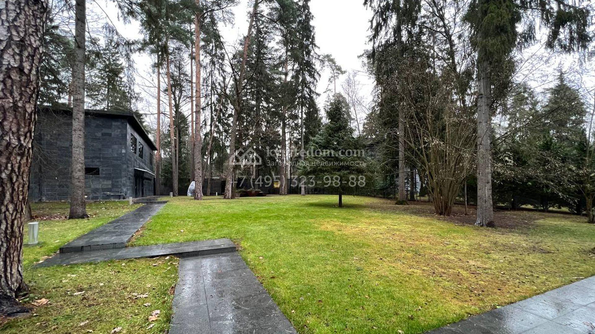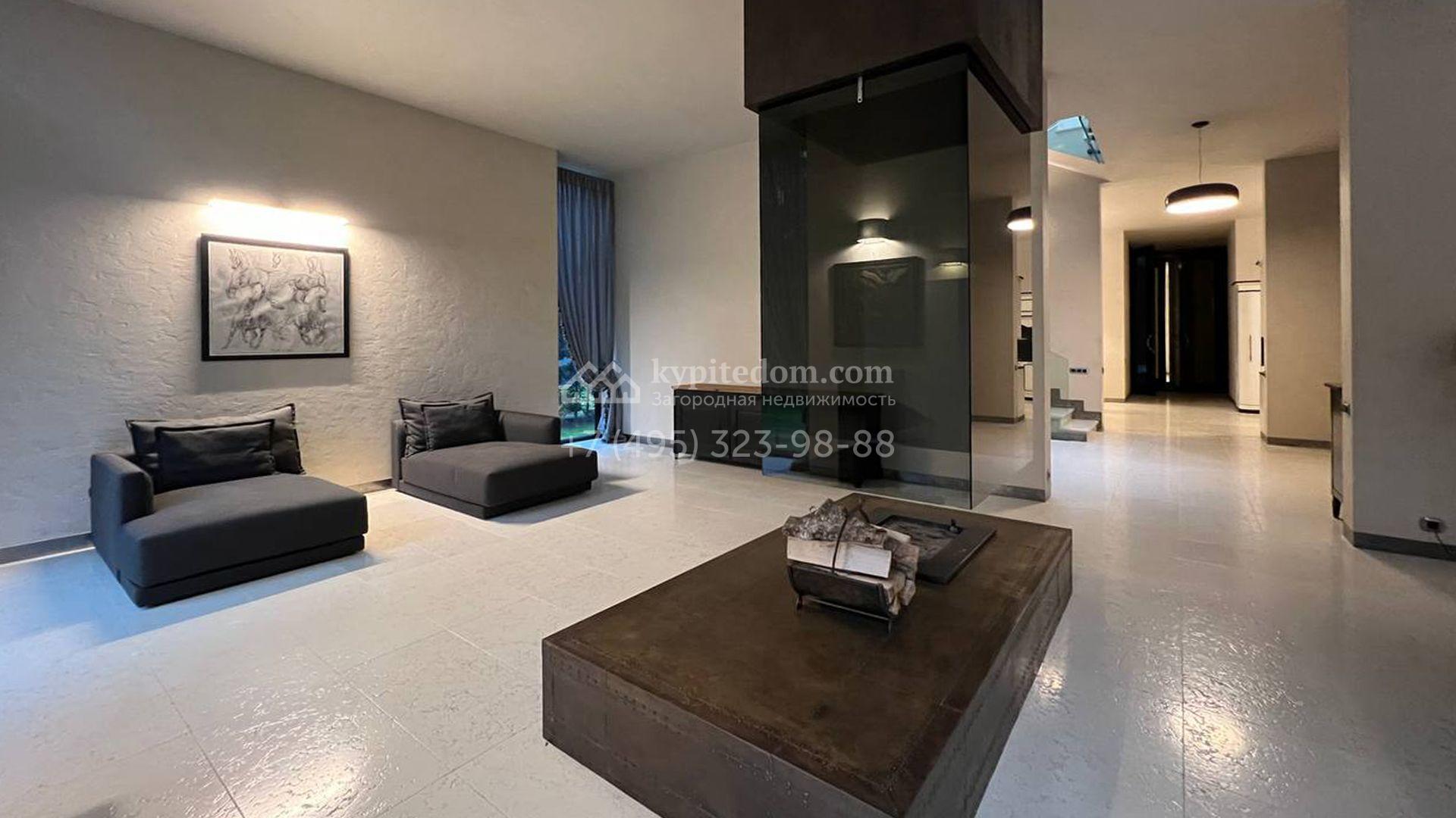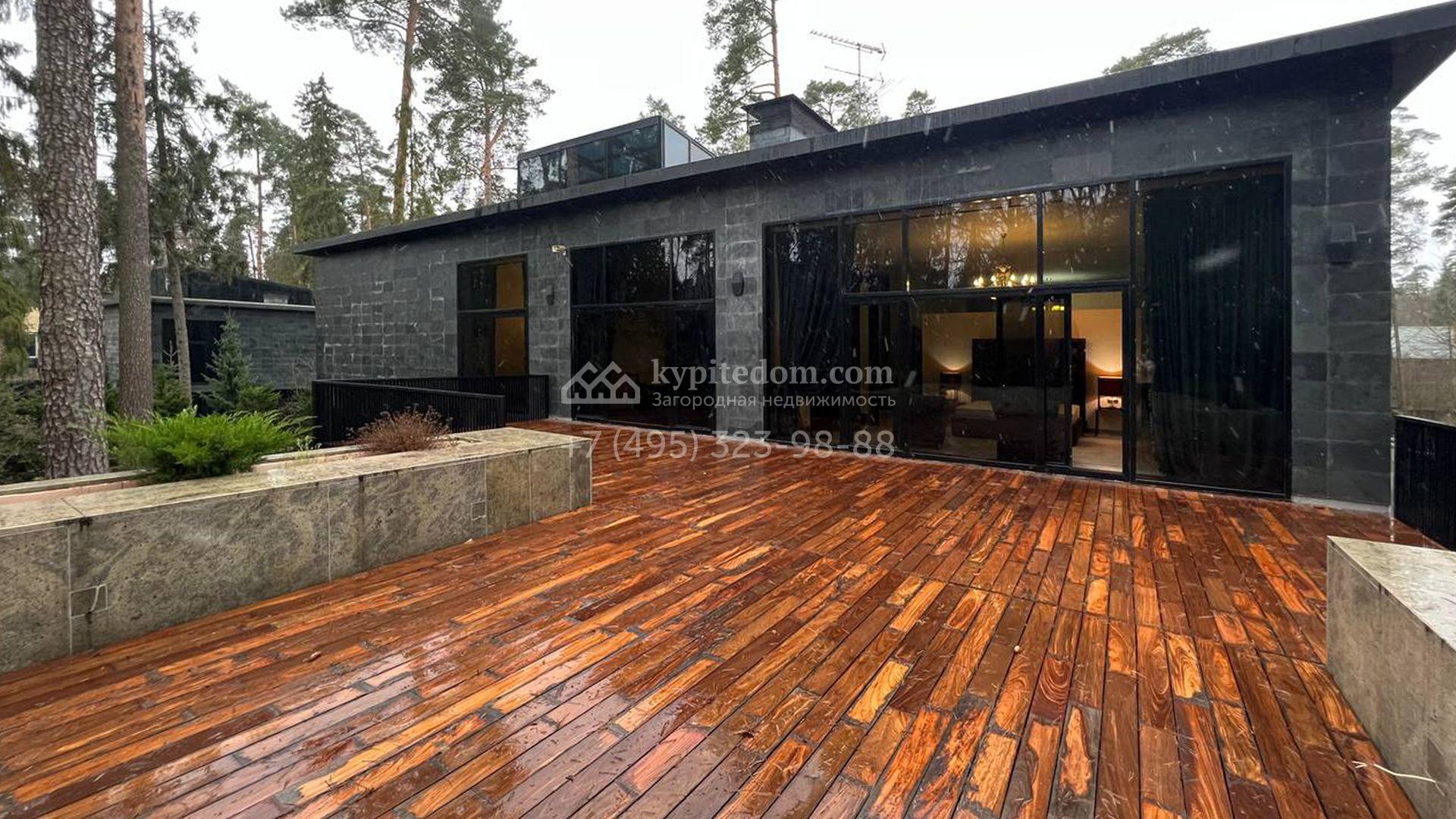 Загородный дом площадью 600 м² построен на просторном участке 25 соток с лесными деревьями. Фасад здания с большими окнами выполнен в современном стиле и облицован под темно-серый камень. В отделке лаконичного интерьера преобладают кремово-молочные оттенки в сочетании с темными контрастирующими элементами. Планировкой резиденции предусмотрены 4 спальни, гостиная с камином, кухня-столовая с выходом на террасу и SPA-зона с бассейном и сауной. На третьем уровне разместили лаунж-зону, из которой можно попасть на эксплуатируемую кровлю. Рядом расположены дом для персонала с гаражом на 2 машины и зона барбекю. На участке засеян газон, вымощены дорожки и установлено уличное освещение.