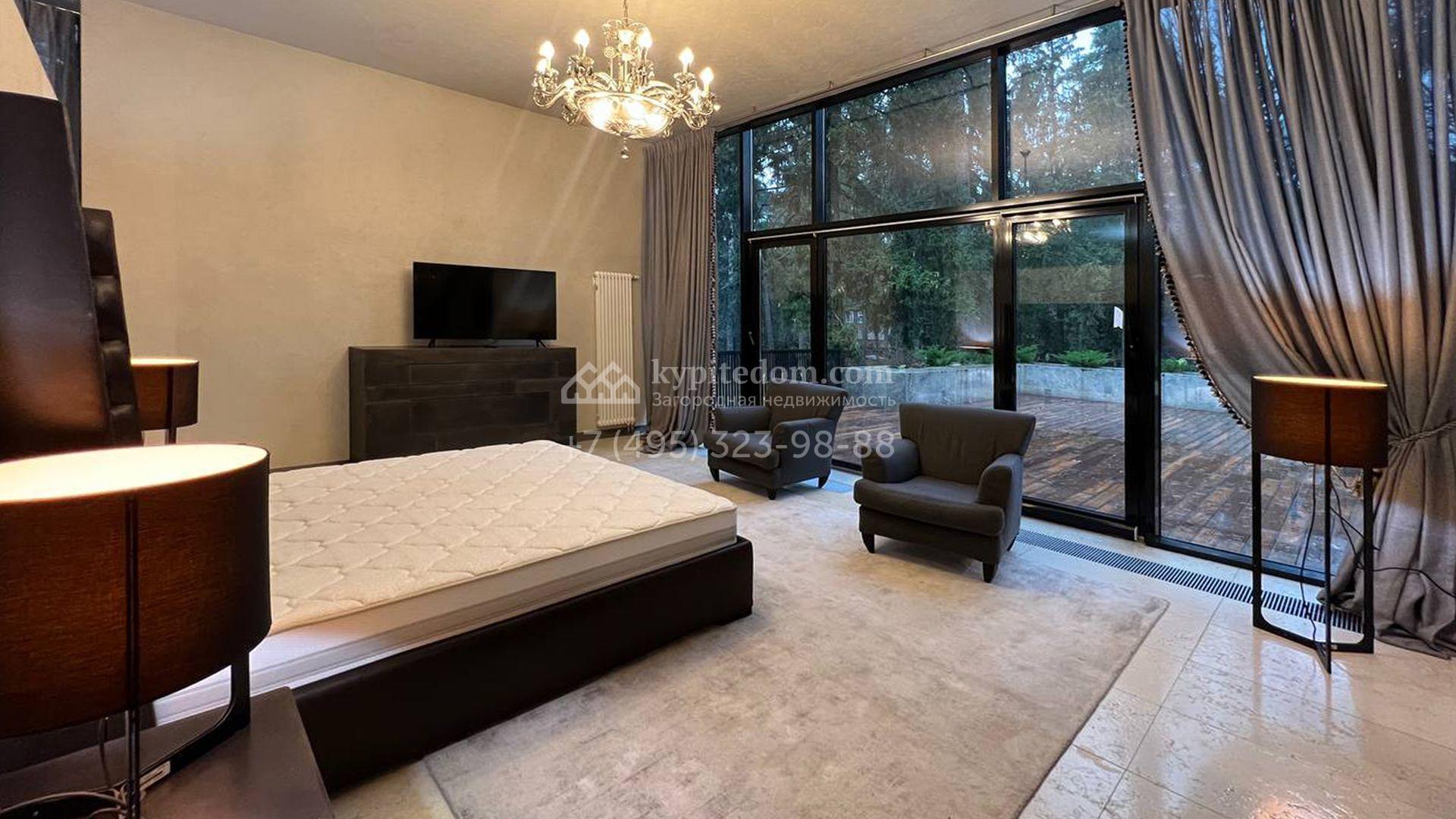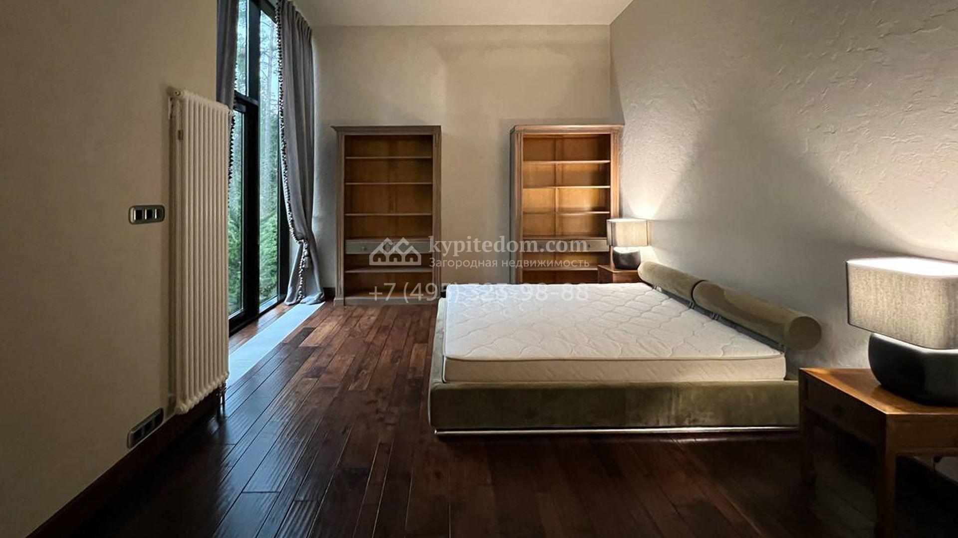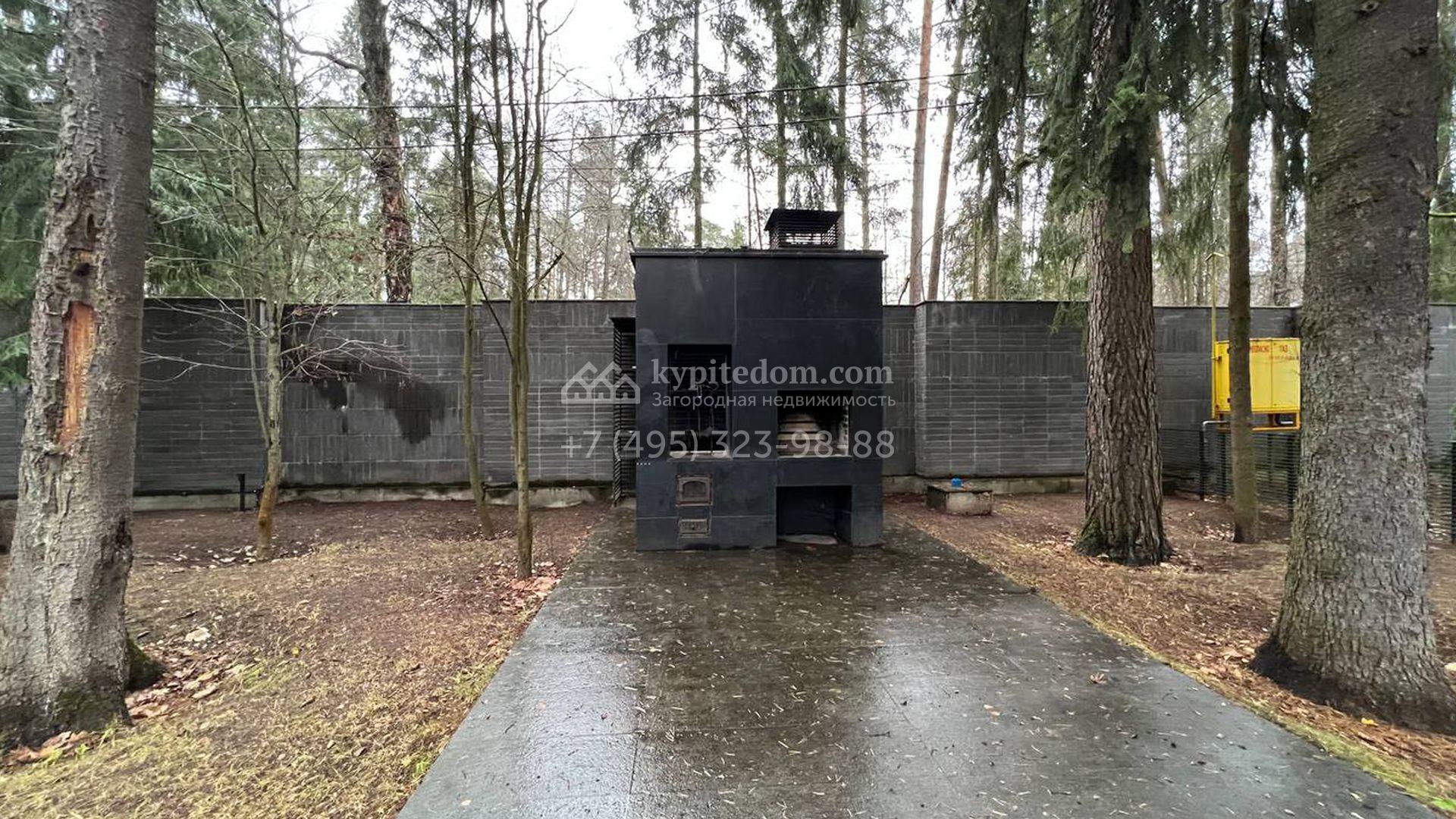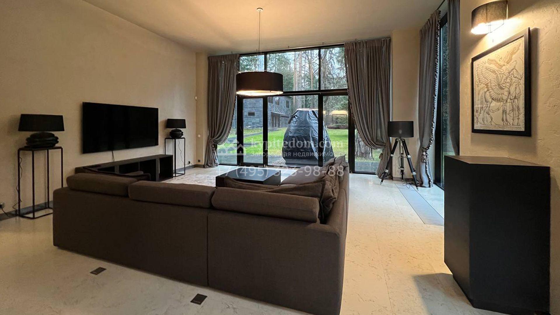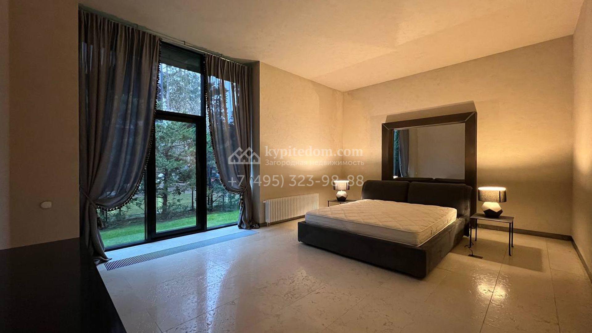 Загородный дом площадью 600 м² построен на просторном участке 25 соток с лесными деревьями. Фасад здания с большими окнами выполнен в современном стиле и облицован под темно-серый камень. В отделке лаконичного интерьера преобладают кремово-молочные оттенки в сочетании с темными контрастирующими элементами. Планировкой резиденции предусмотрены 4 спальни, гостиная с камином, кухня-столовая с выходом на террасу и SPA-зона с бассейном и сауной. На третьем уровне разместили лаунж-зону, из которой можно попасть на эксплуатируемую кровлю. Рядом расположены дом для персонала с гаражом на 2 машины и зона барбекю. На участке засеян газон, вымощены дорожки и установлено уличное освещение.