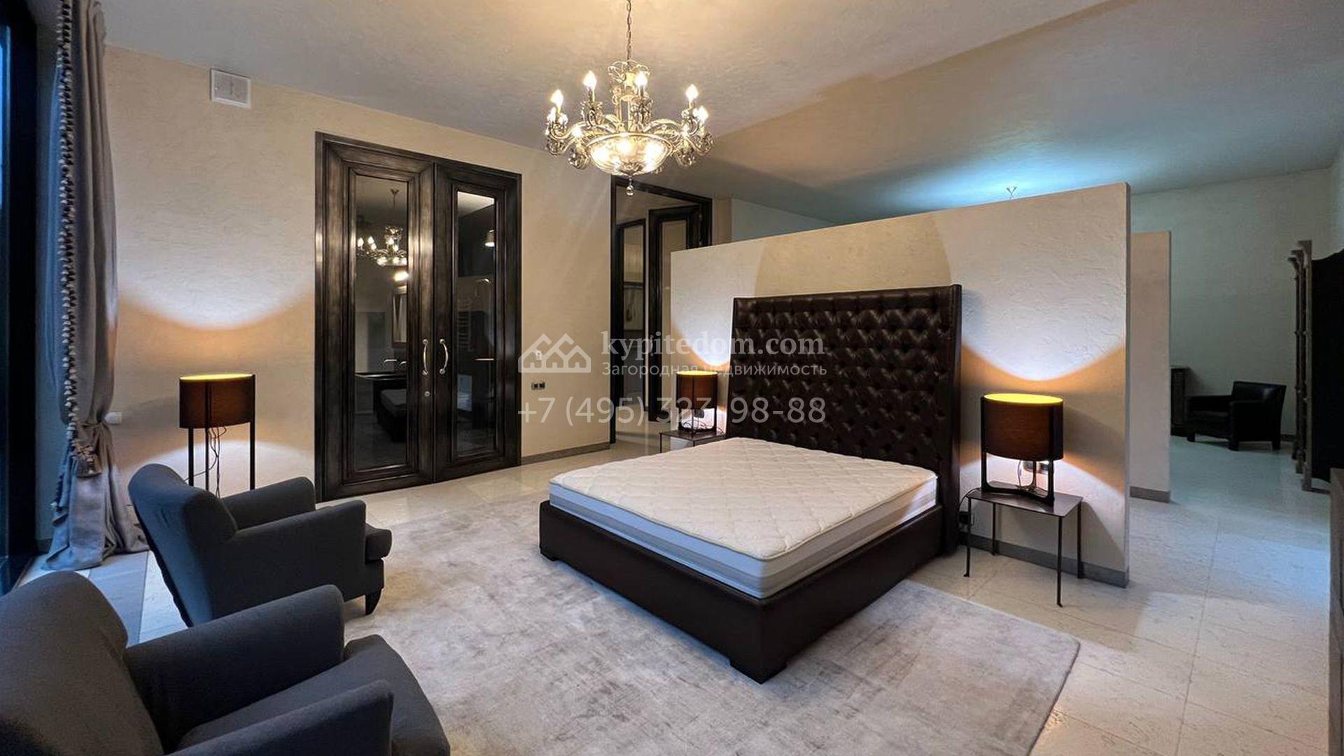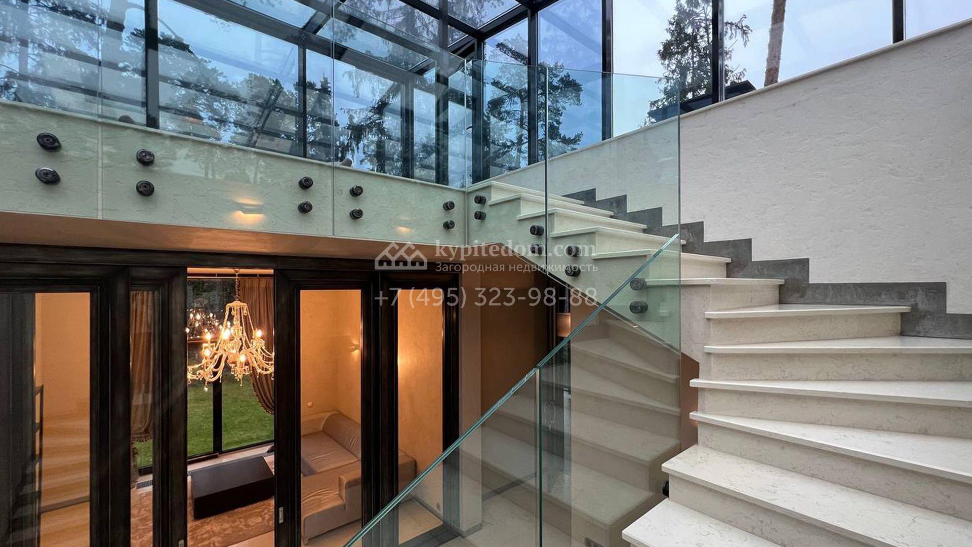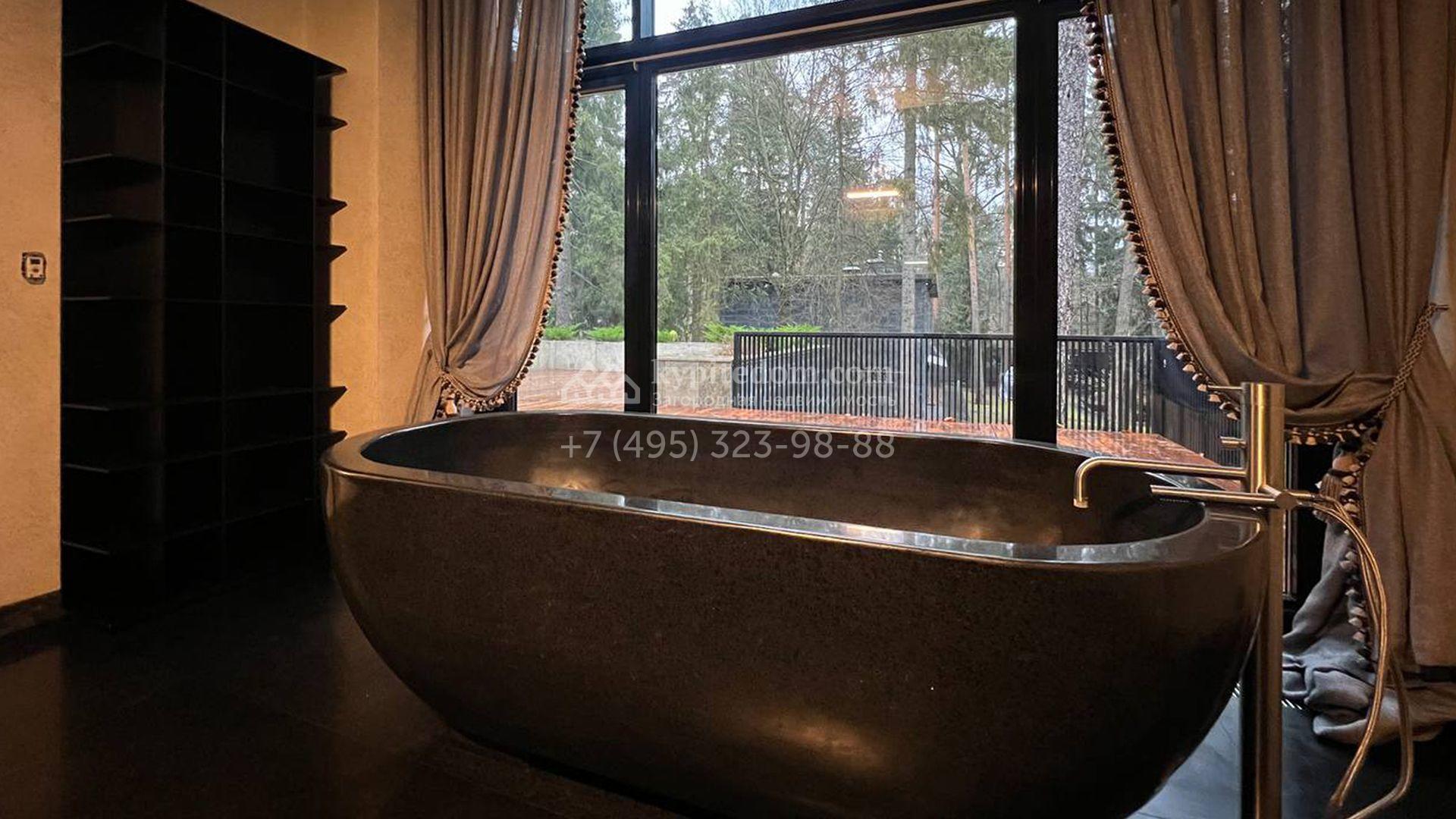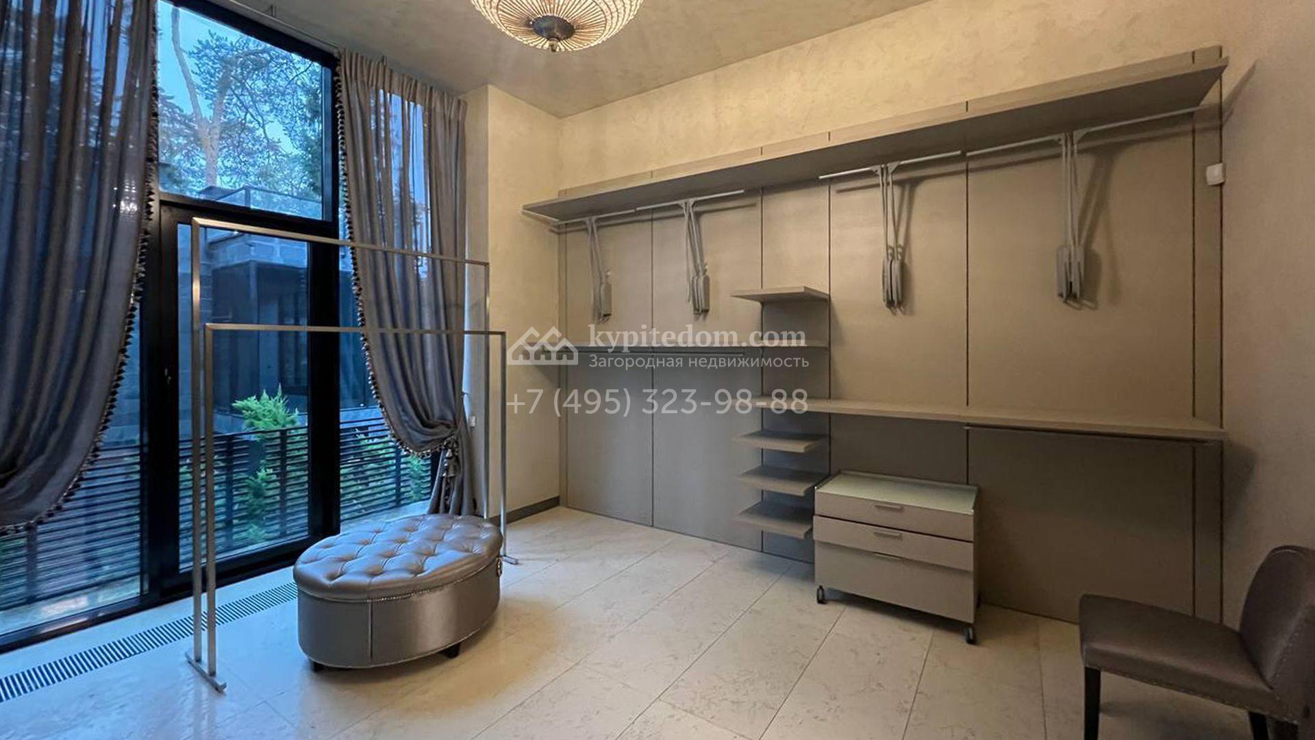 Загородный дом площадью 600 м² построен на просторном участке 25 соток с лесными деревьями. Фасад здания с большими окнами выполнен в современном стиле и облицован под темно-серый камень. В отделке лаконичного интерьера преобладают кремово-молочные оттенки в сочетании с темными контрастирующими элементами. Планировкой резиденции предусмотрены 4 спальни, гостиная с камином, кухня-столовая с выходом на террасу и SPA-зона с бассейном и сауной. На третьем уровне разместили лаунж-зону, из которой можно попасть на эксплуатируемую кровлю. Рядом расположены дом для персонала с гаражом на 2 машины и зона барбекю. На участке засеян газон, вымощены дорожки и установлено уличное освещение.