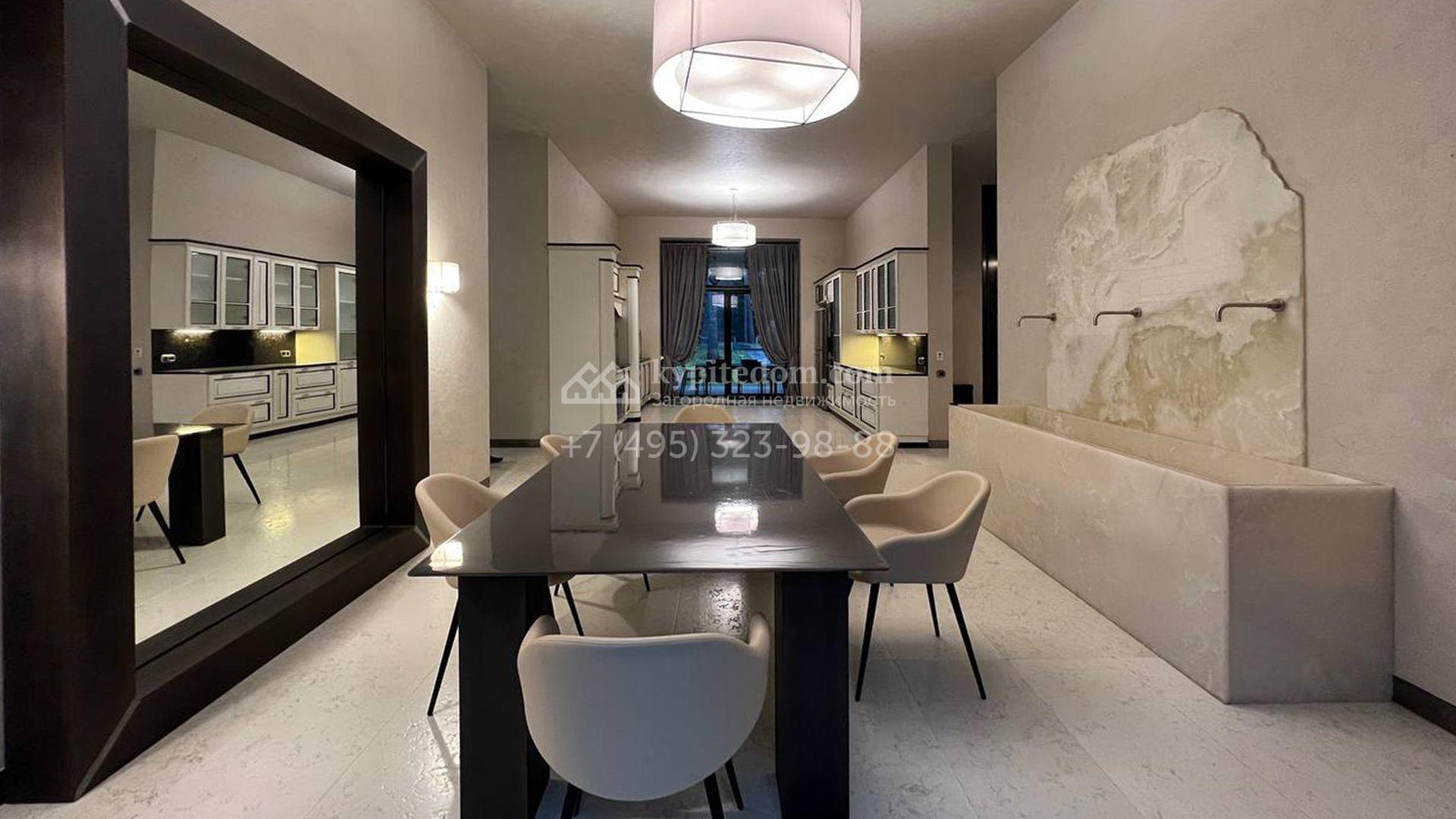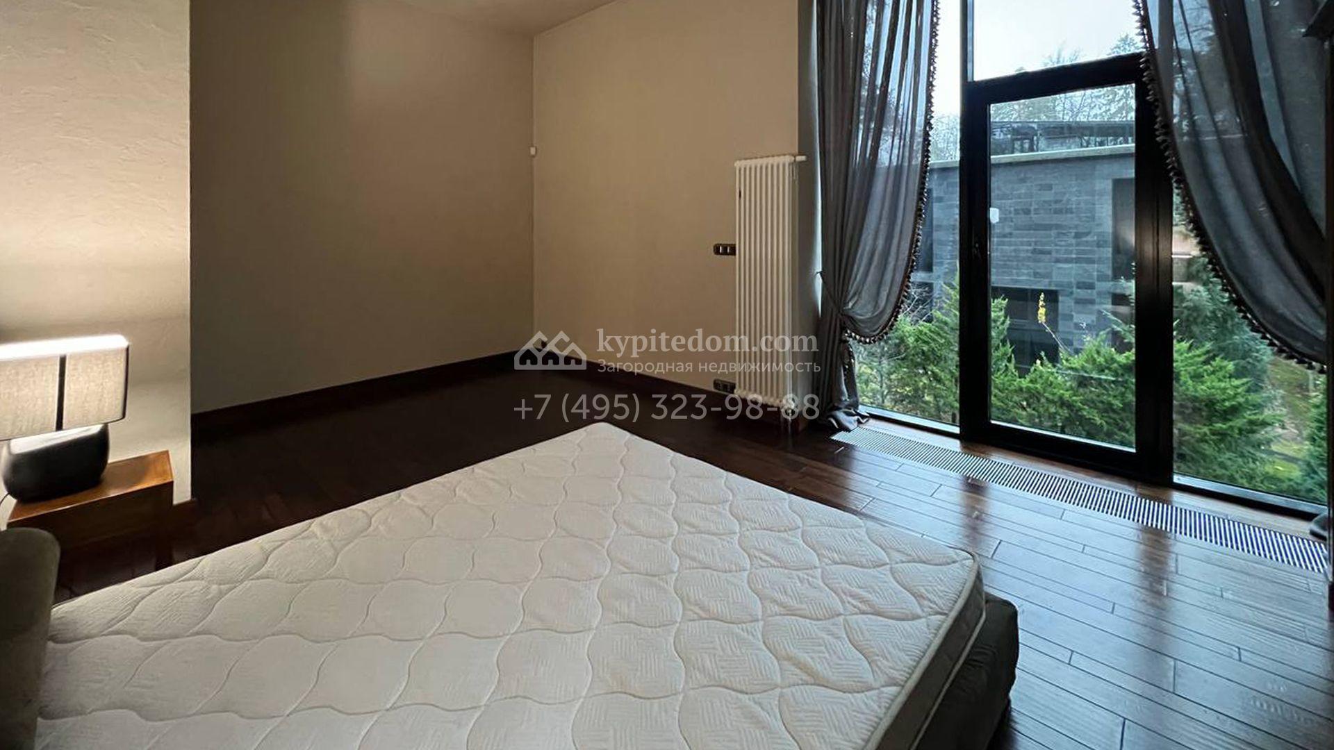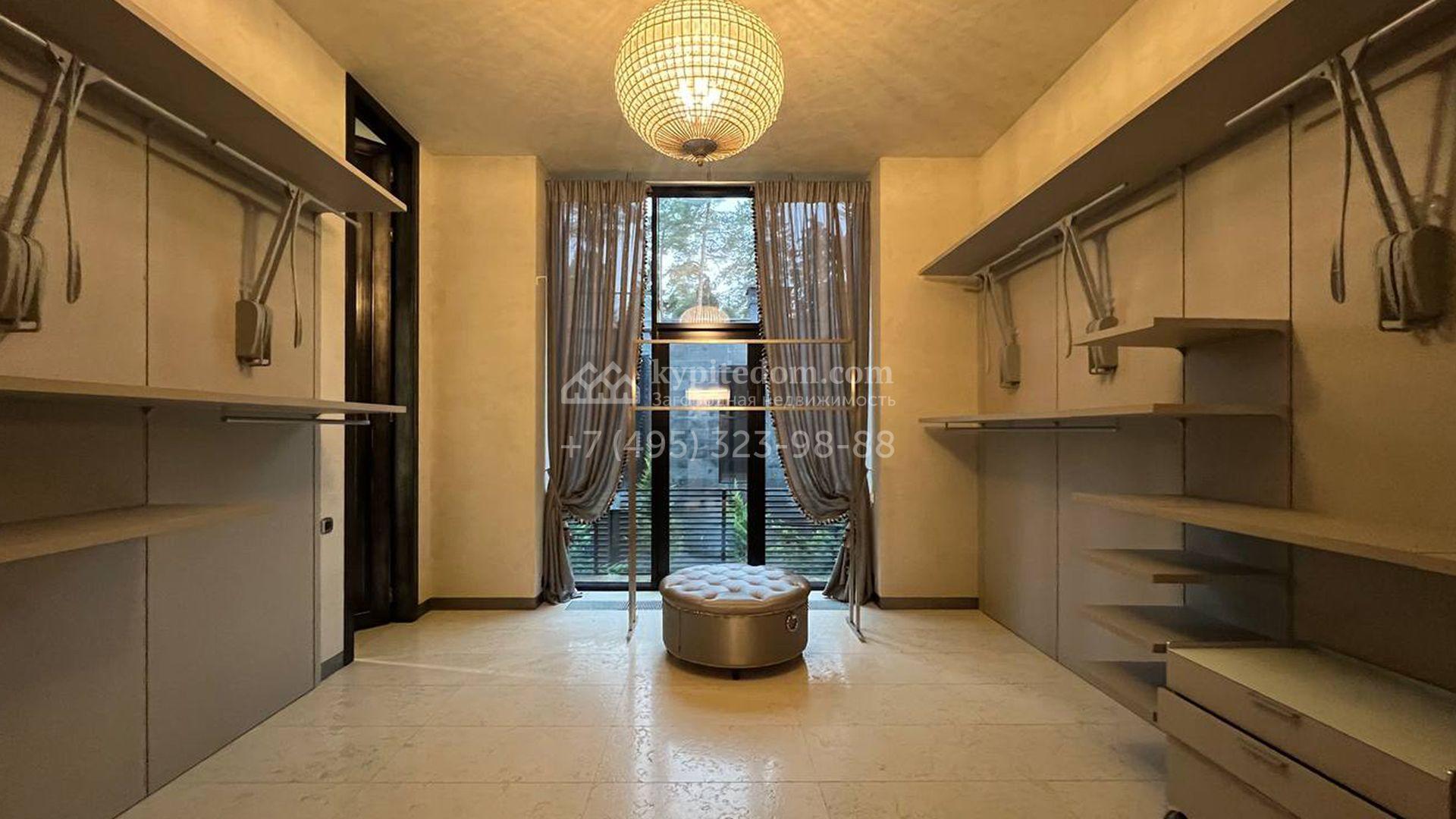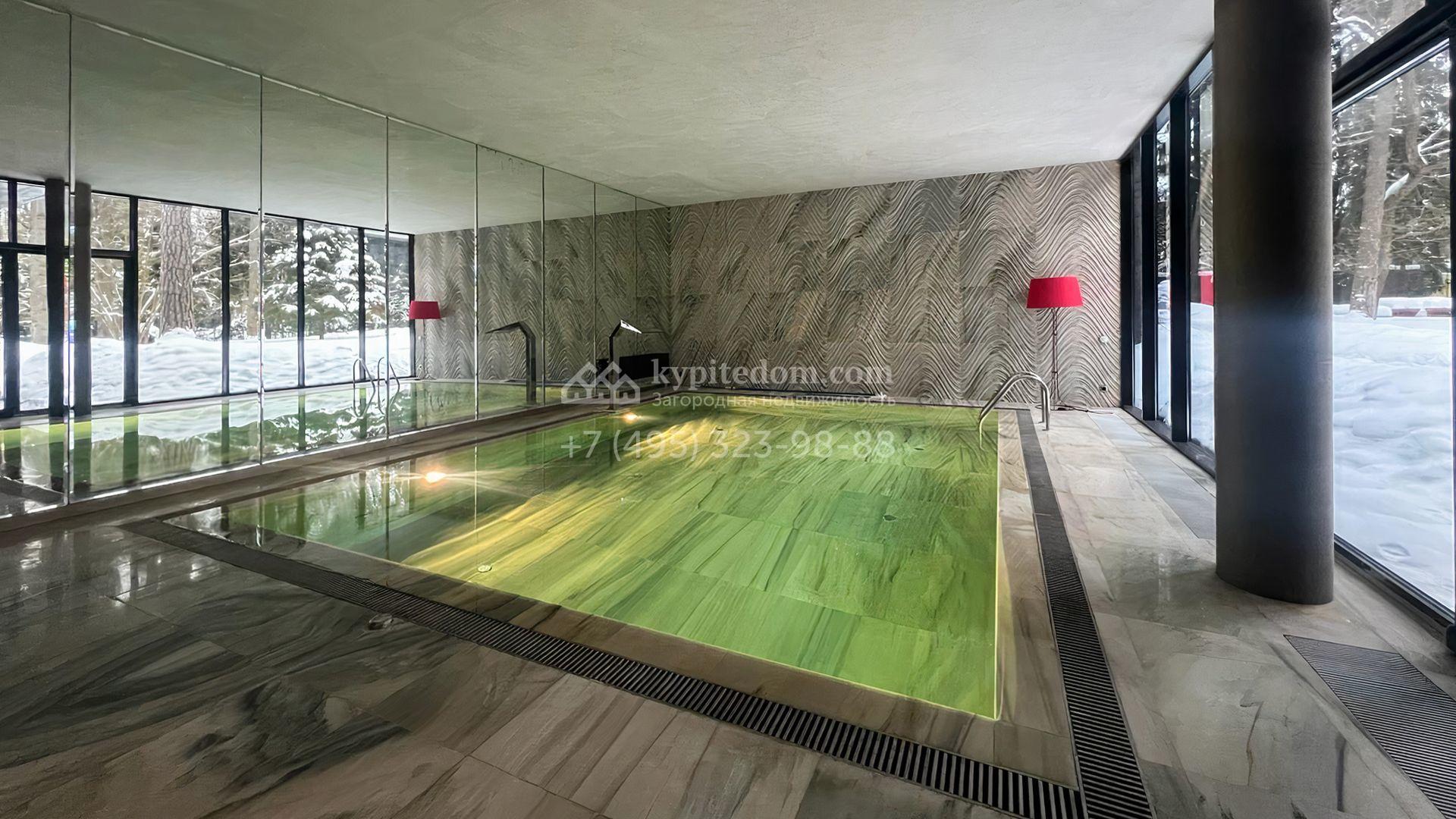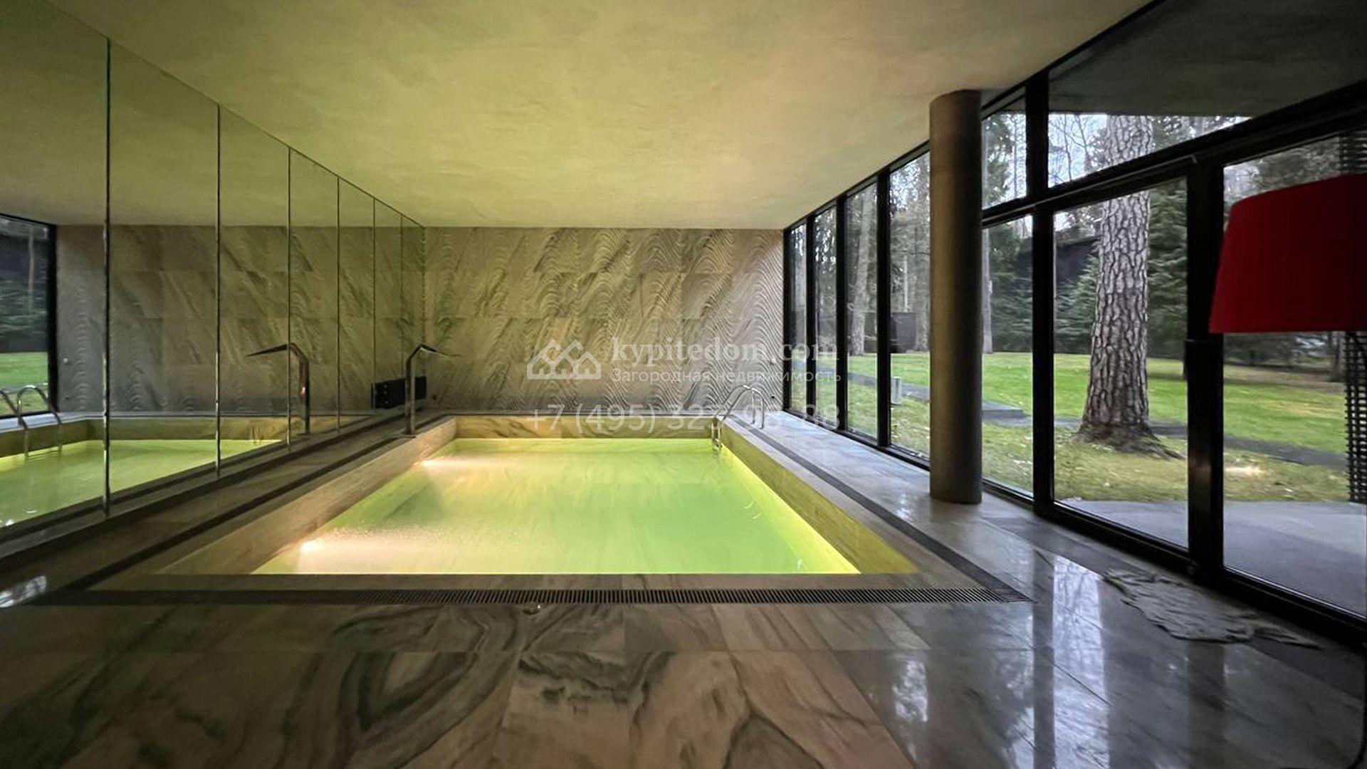 Загородный дом площадью 600 м² построен на просторном участке 25 соток с лесными деревьями. Фасад здания с большими окнами выполнен в современном стиле и облицован под темно-серый камень. В отделке лаконичного интерьера преобладают кремово-молочные оттенки в сочетании с темными контрастирующими элементами. Планировкой резиденции предусмотрены 4 спальни, гостиная с камином, кухня-столовая с выходом на террасу и SPA-зона с бассейном и сауной. На третьем уровне разместили лаунж-зону, из которой можно попасть на эксплуатируемую кровлю. Рядом расположены дом для персонала с гаражом на 2 машины и зона барбекю. На участке засеян газон, вымощены дорожки и установлено уличное освещение.