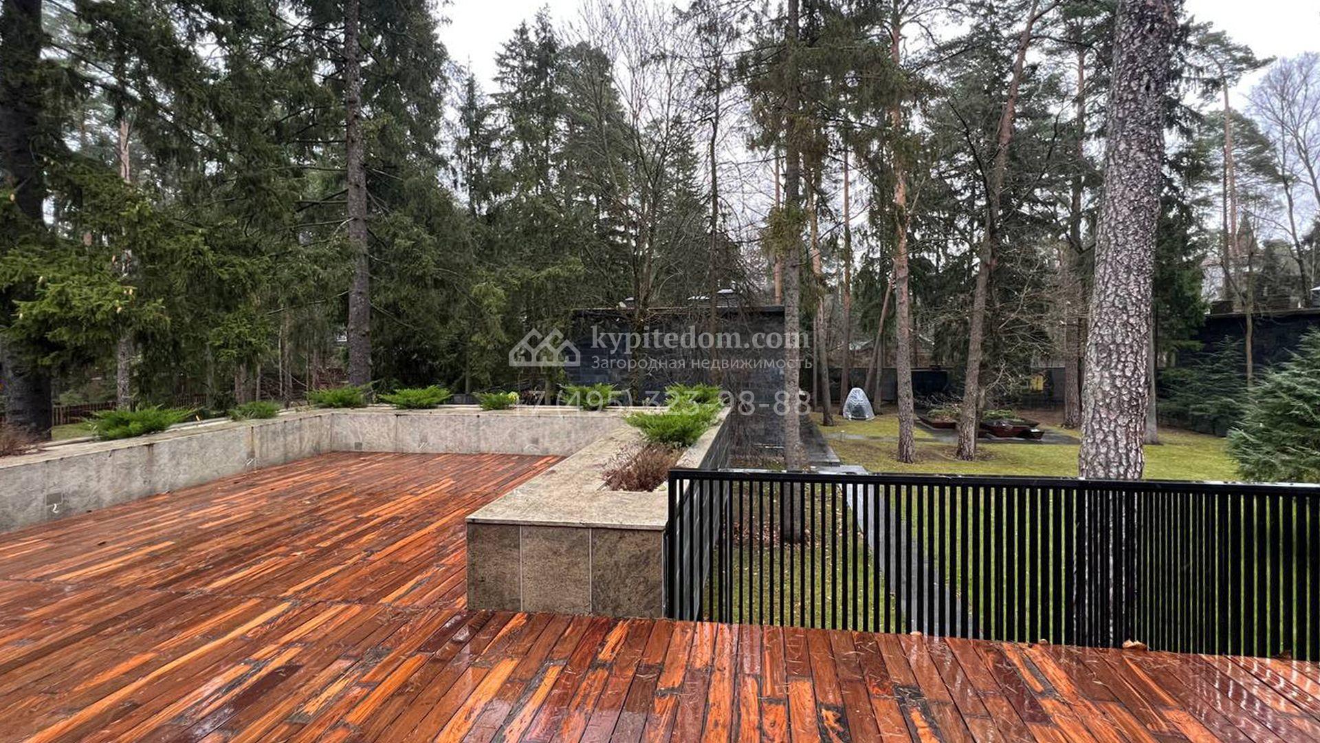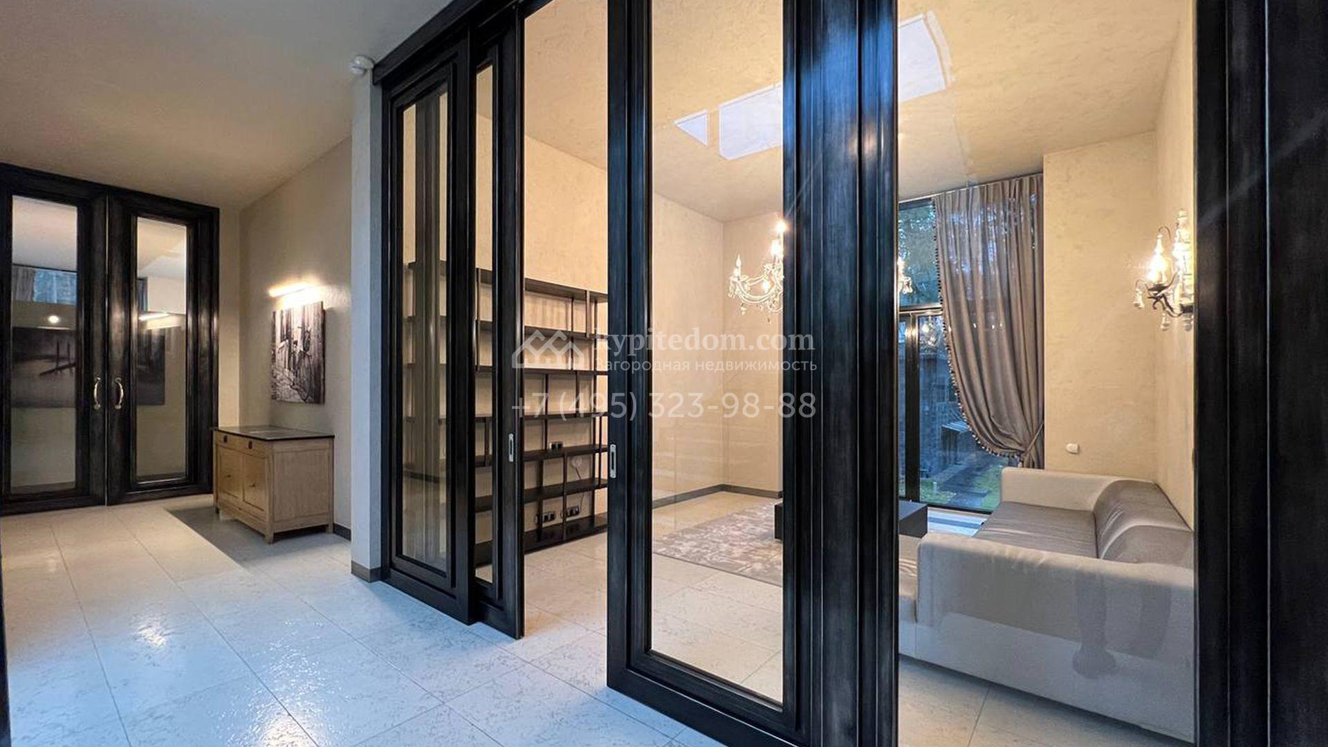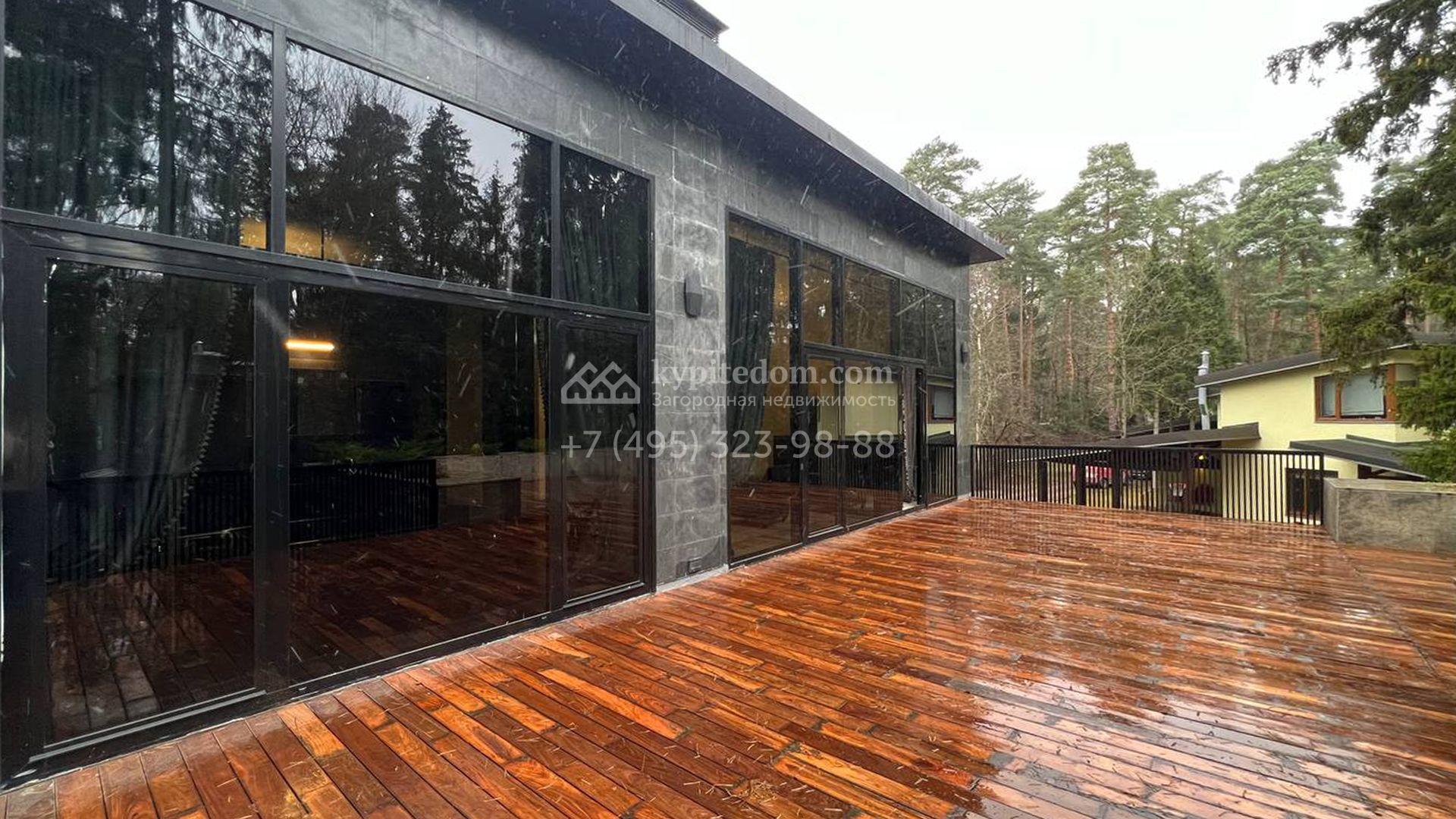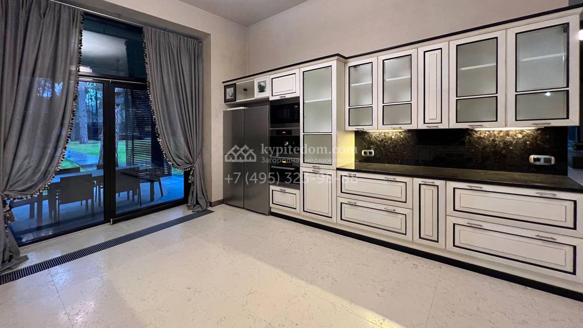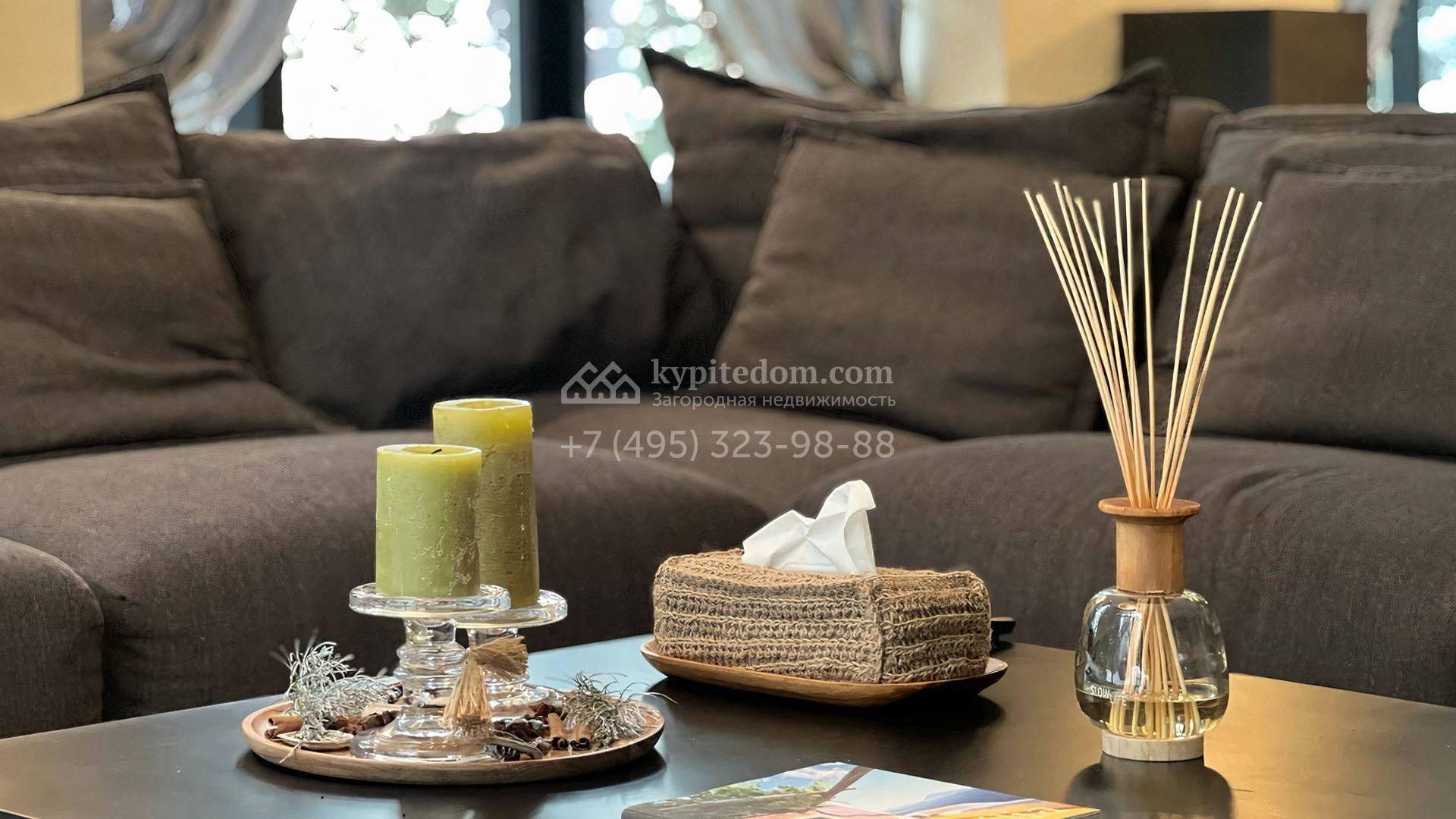 Загородный дом площадью 600 м² построен на просторном участке 25 соток с лесными деревьями. Фасад здания с большими окнами выполнен в современном стиле и облицован под темно-серый камень. В отделке лаконичного интерьера преобладают кремово-молочные оттенки в сочетании с темными контрастирующими элементами. Планировкой резиденции предусмотрены 4 спальни, гостиная с камином, кухня-столовая с выходом на террасу и SPA-зона с бассейном и сауной. На третьем уровне разместили лаунж-зону, из которой можно попасть на эксплуатируемую кровлю. Рядом расположены дом для персонала с гаражом на 2 машины и зона барбекю. На участке засеян газон, вымощены дорожки и установлено уличное освещение.