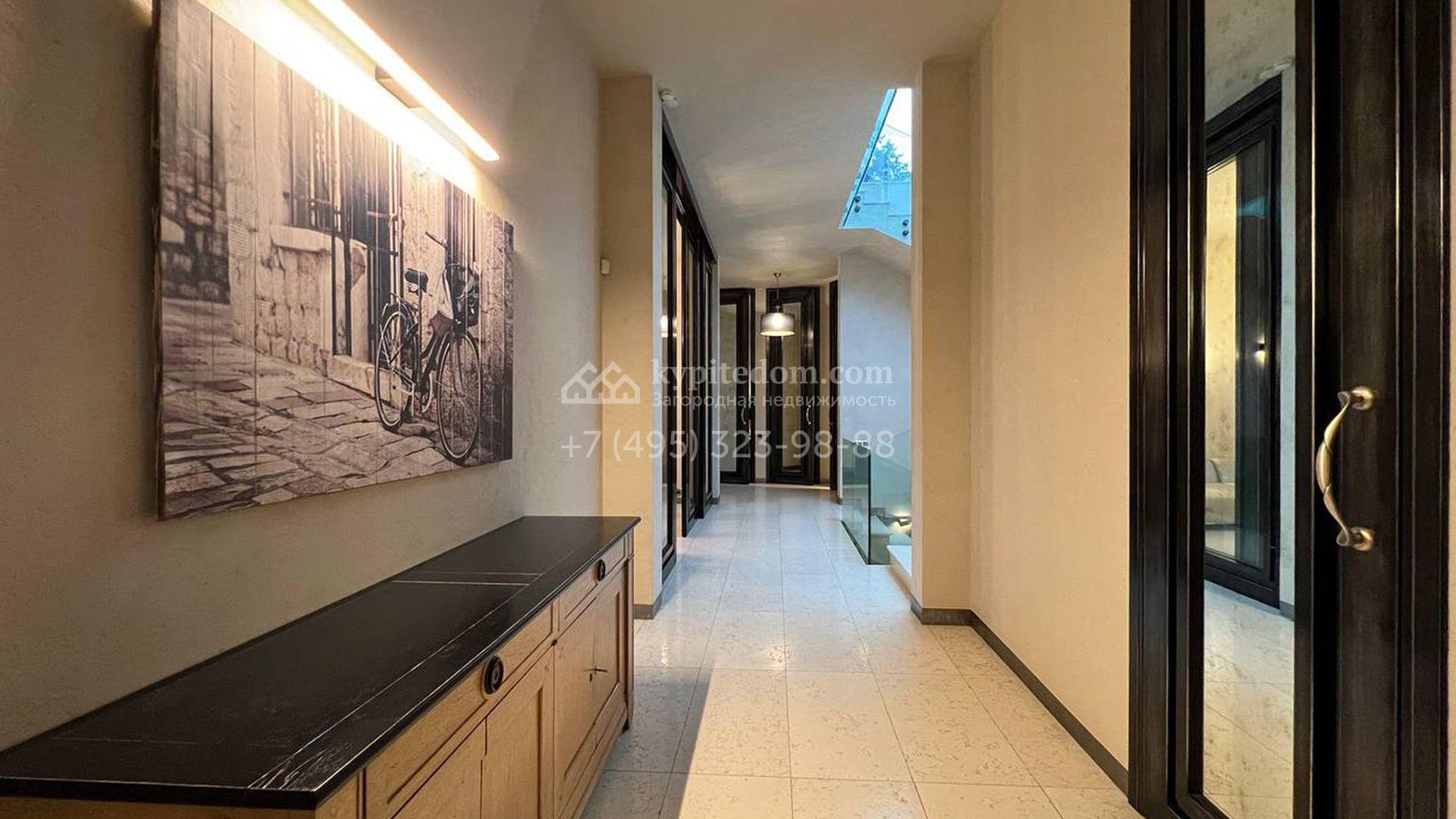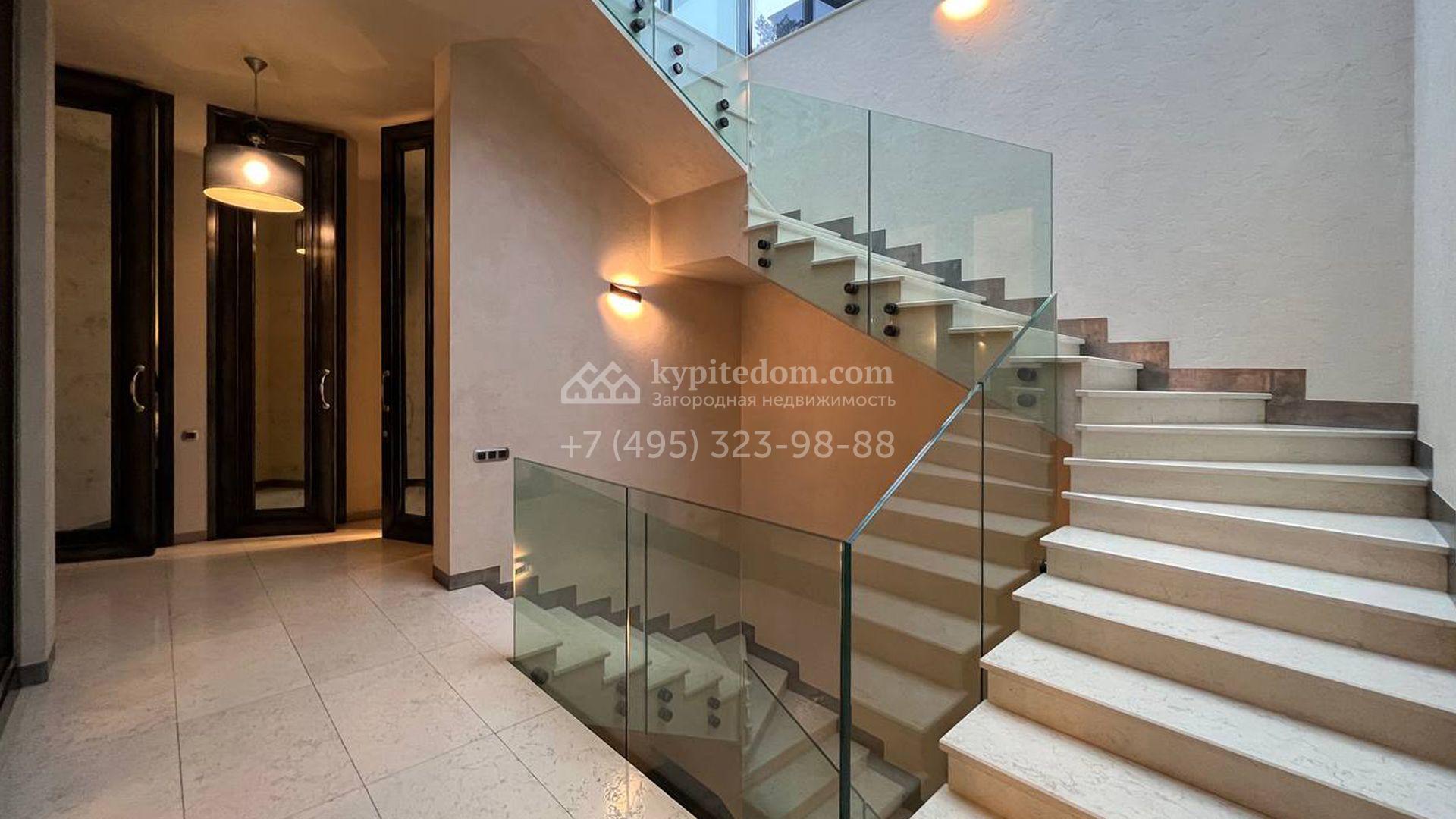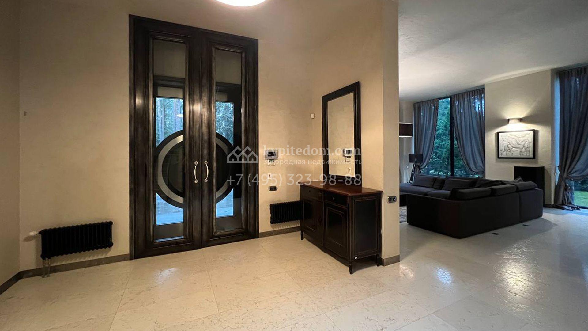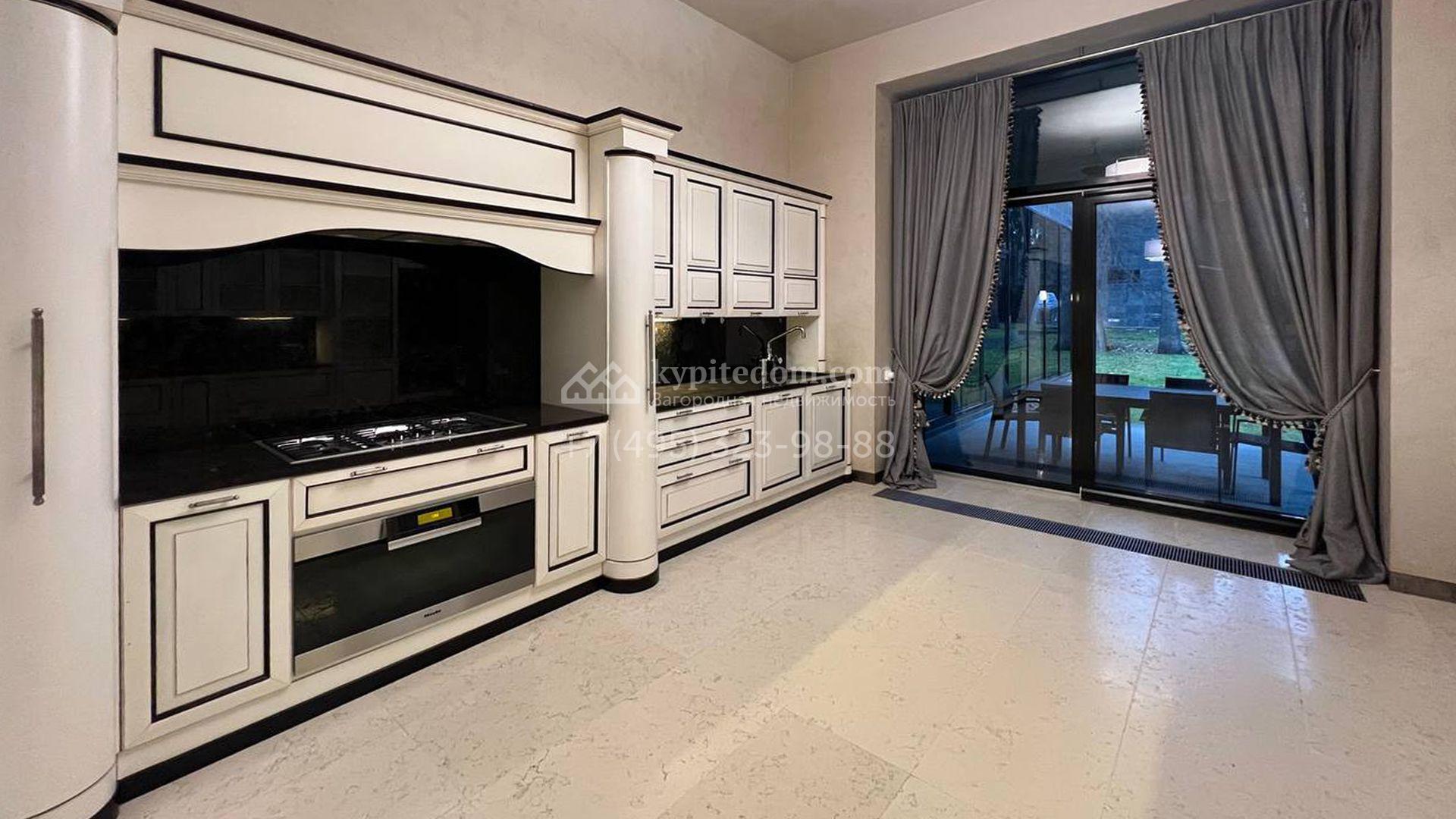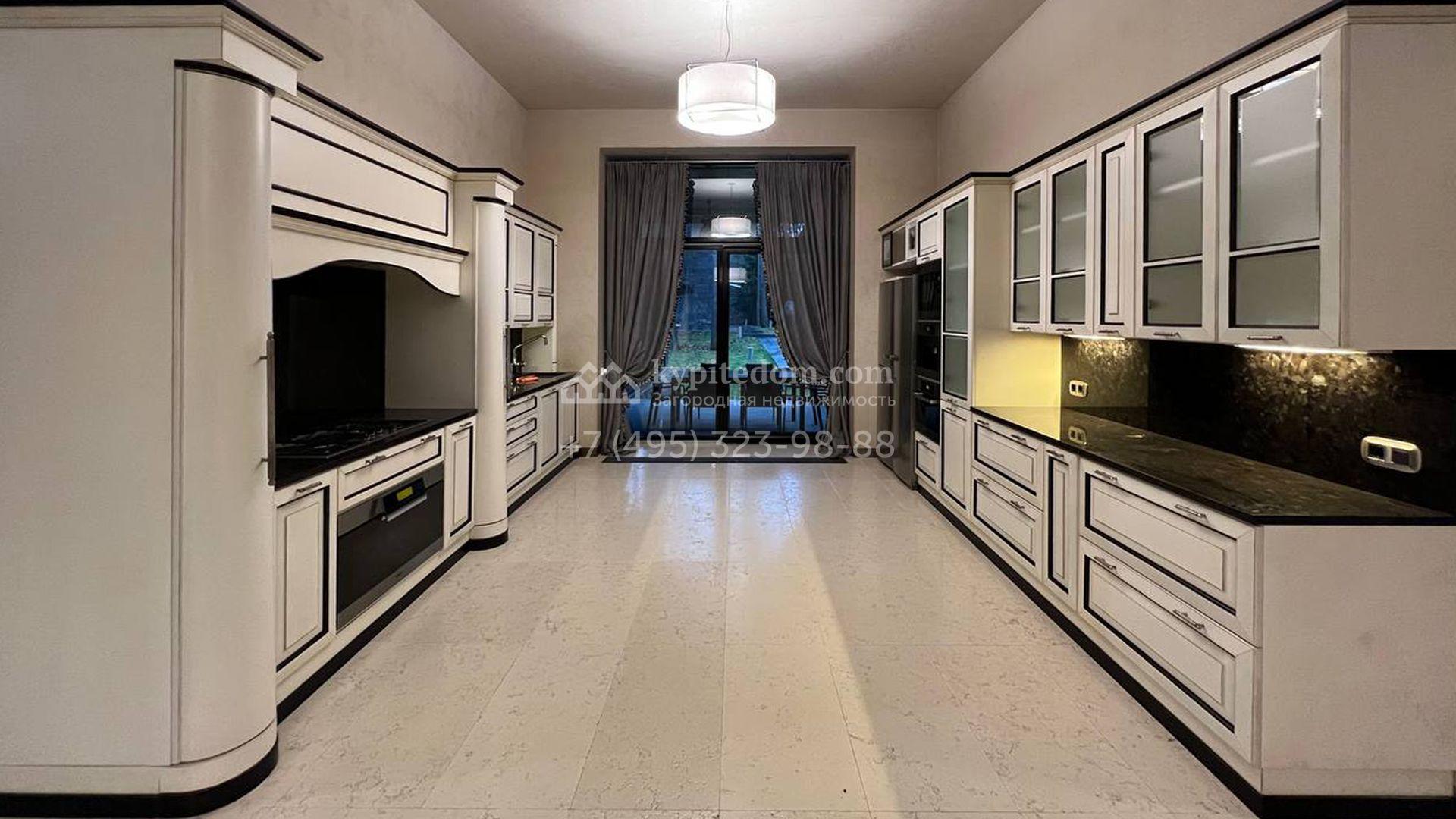 Загородный дом площадью 600 м² построен на просторном участке 25 соток с лесными деревьями. Фасад здания с большими окнами выполнен в современном стиле и облицован под темно-серый камень. В отделке лаконичного интерьера преобладают кремово-молочные оттенки в сочетании с темными контрастирующими элементами. Планировкой резиденции предусмотрены 4 спальни, гостиная с камином, кухня-столовая с выходом на террасу и SPA-зона с бассейном и сауной. На третьем уровне разместили лаунж-зону, из которой можно попасть на эксплуатируемую кровлю. Рядом расположены дом для персонала с гаражом на 2 машины и зона барбекю. На участке засеян газон, вымощены дорожки и установлено уличное освещение.