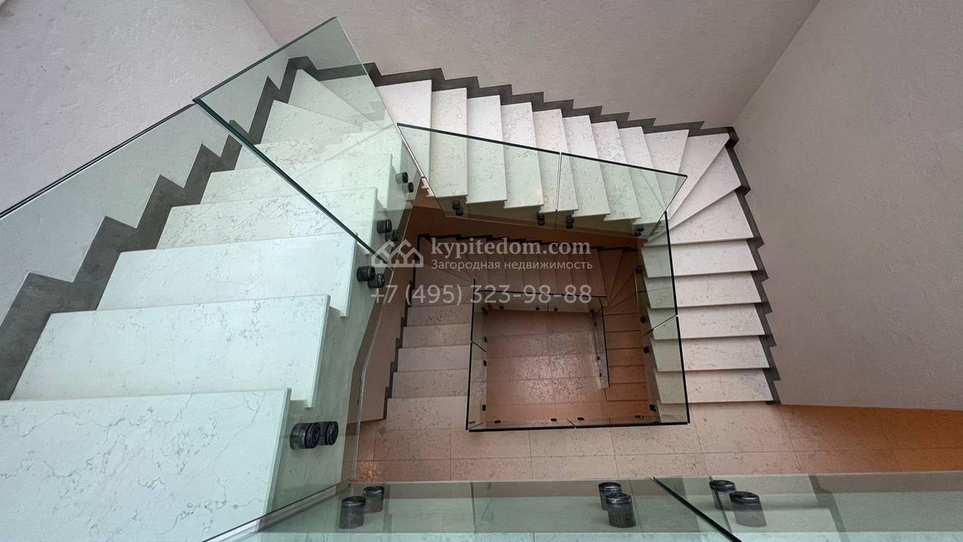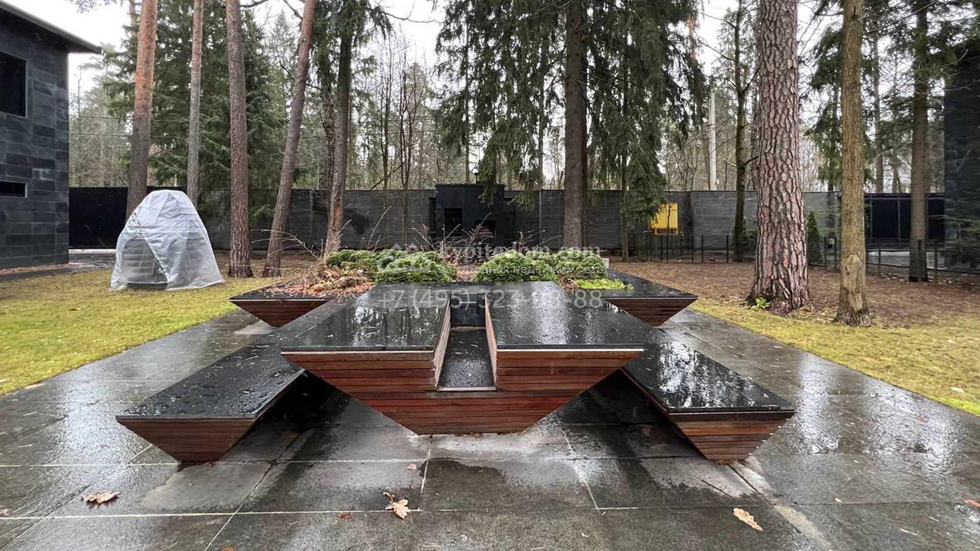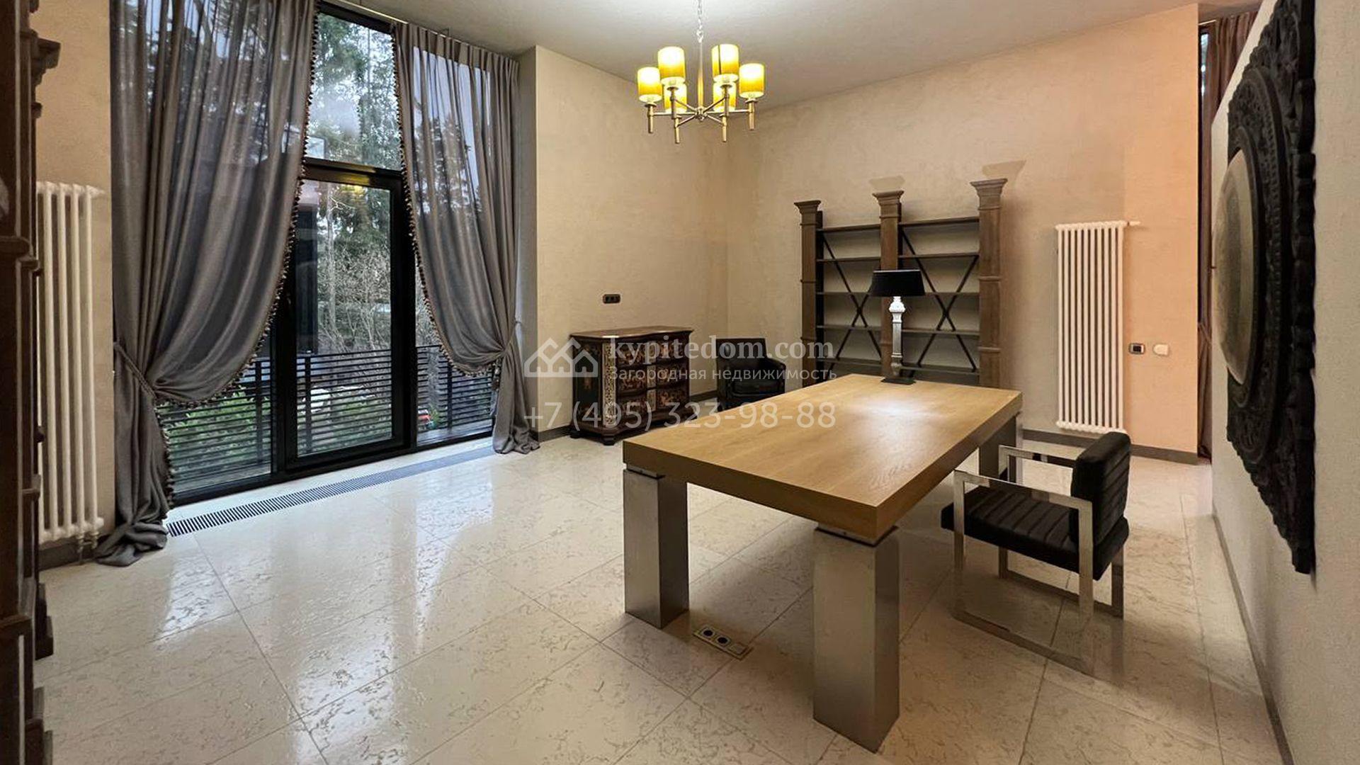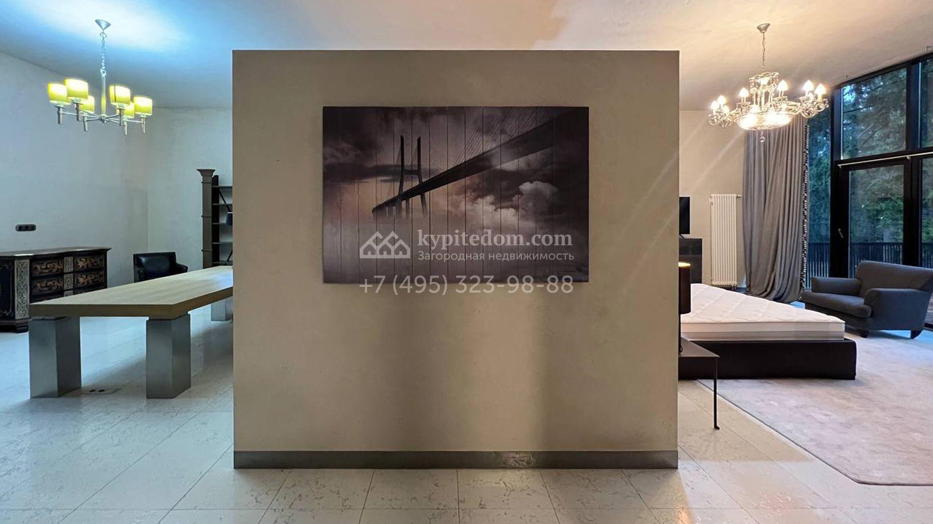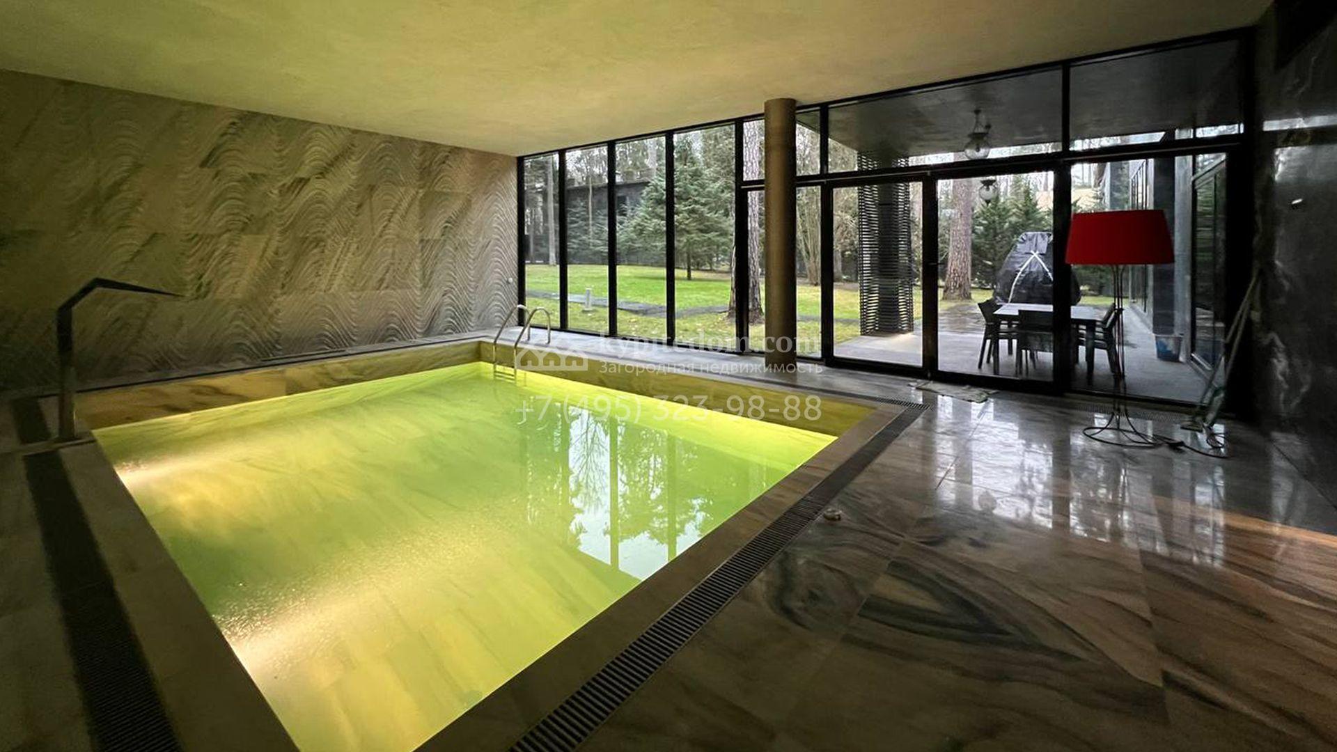 Загородный дом площадью 600 м² построен на просторном участке 25 соток с лесными деревьями. Фасад здания с большими окнами выполнен в современном стиле и облицован под темно-серый камень. В отделке лаконичного интерьера преобладают кремово-молочные оттенки в сочетании с темными контрастирующими элементами. Планировкой резиденции предусмотрены 4 спальни, гостиная с камином, кухня-столовая с выходом на террасу и SPA-зона с бассейном и сауной. На третьем уровне разместили лаунж-зону, из которой можно попасть на эксплуатируемую кровлю. Рядом расположены дом для персонала с гаражом на 2 машины и зона барбекю. На участке засеян газон, вымощены дорожки и установлено уличное освещение.
