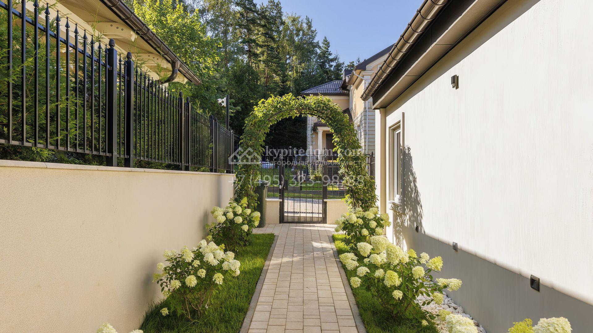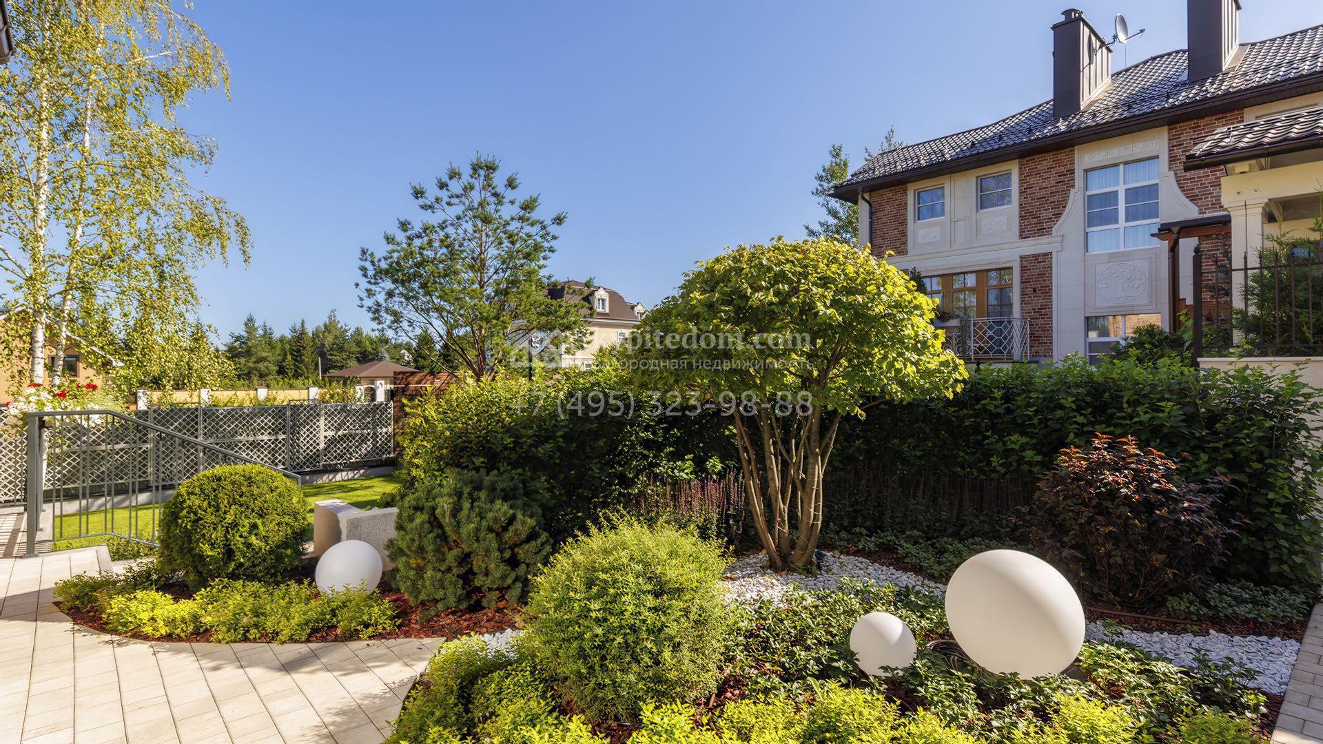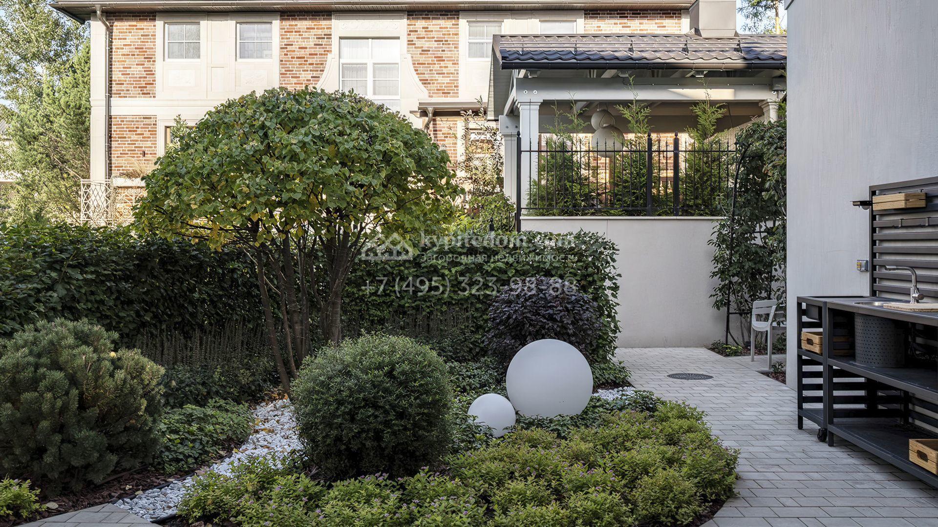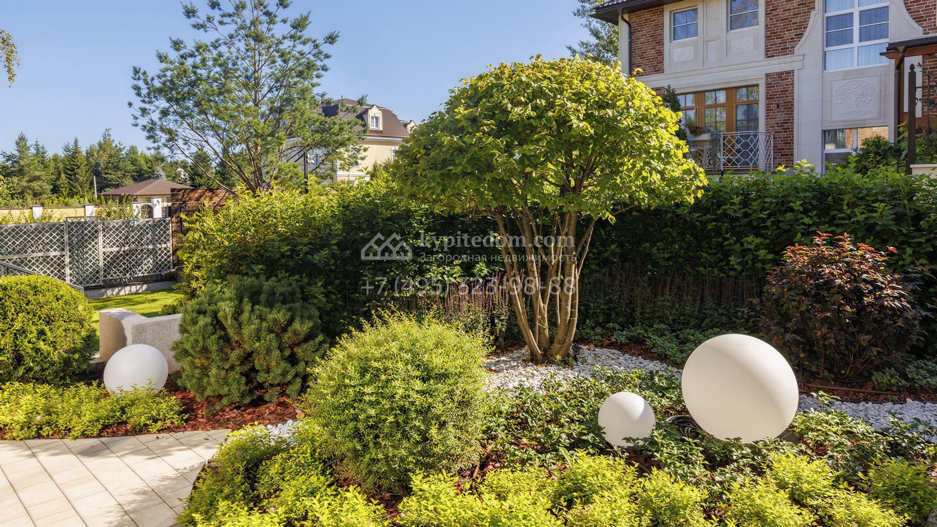 Планировка первого уровня включает просторную гостиную-столовую, кухню с функциональным островом, зимний сад с камином и кабинет. На втором этаже расположены три комфортабельные спальни. На цокольном уровне разместили спа-зону с сауной, массажным кабинетом, душевой и гардеробной, а также блок для персонала с кухней и спальней. Дополнительное преимущество — встроенный гараж на две машины. Участок благоустроен — аккуратный газон и ландшафтный дизайн создают гармоничное пространство для отдыха.