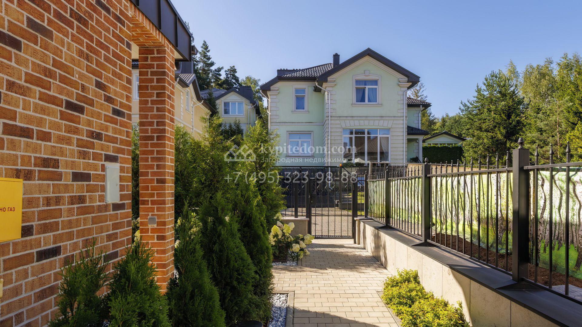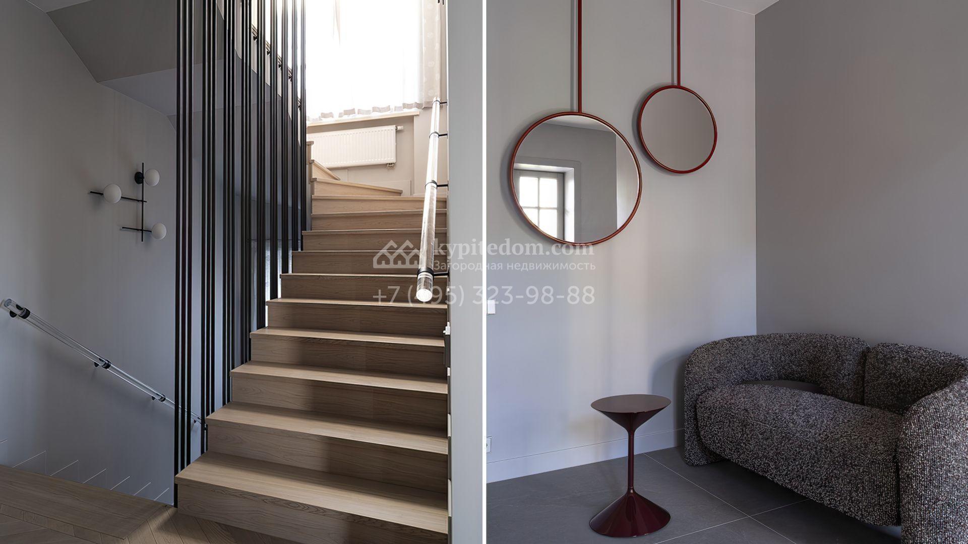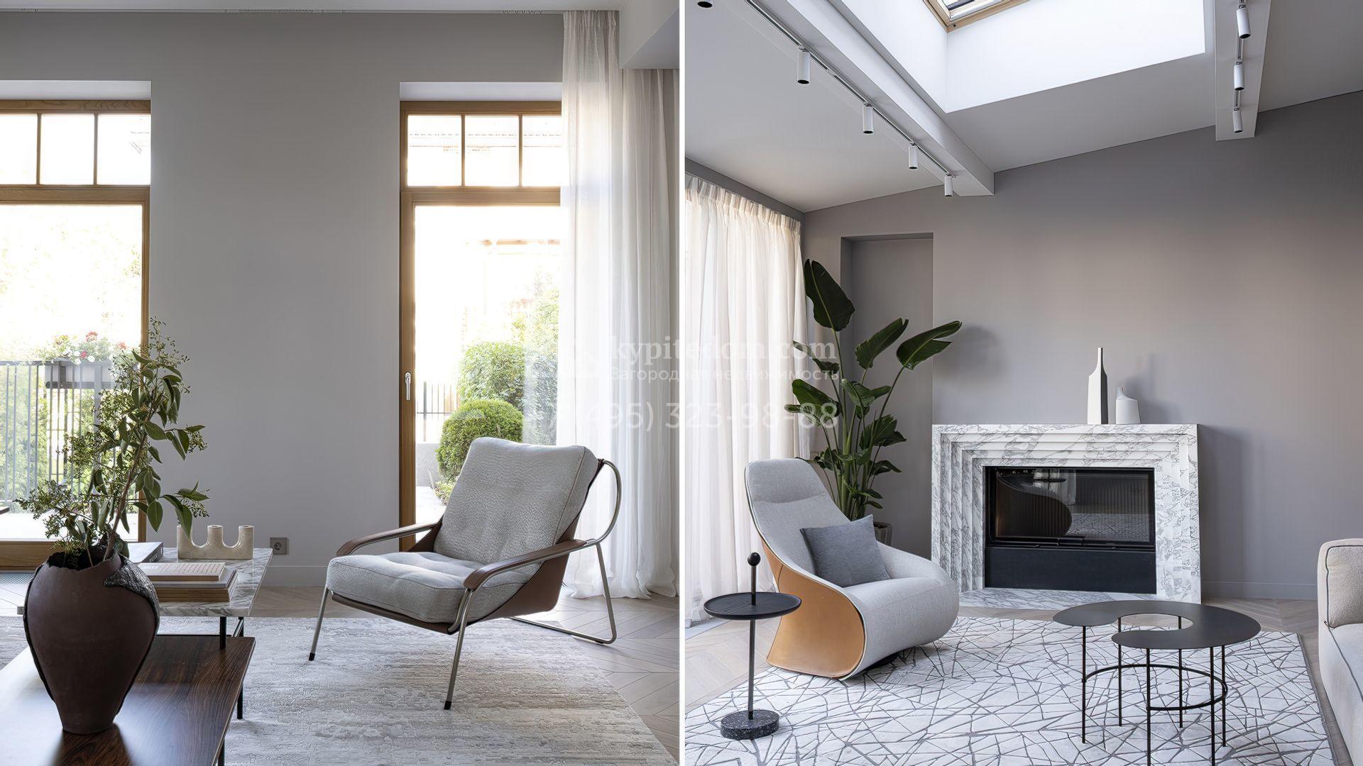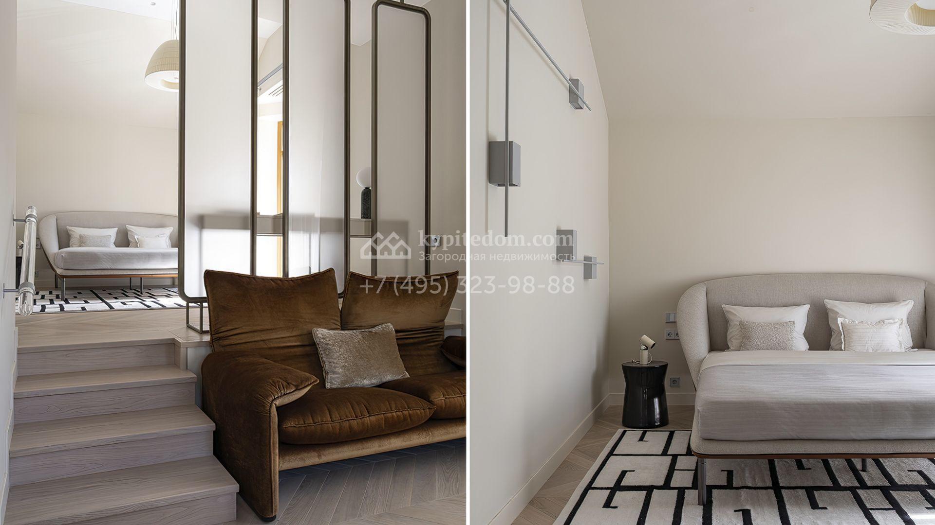 Планировка первого уровня включает просторную гостиную-столовую, кухню с функциональным островом, зимний сад с камином и кабинет. На втором этаже расположены три комфортабельные спальни. На цокольном уровне разместили спа-зону с сауной, массажным кабинетом, душевой и гардеробной, а также блок для персонала с кухней и спальней. Дополнительное преимущество — встроенный гараж на две машины. Участок благоустроен — аккуратный газон и ландшафтный дизайн создают гармоничное пространство для отдыха.