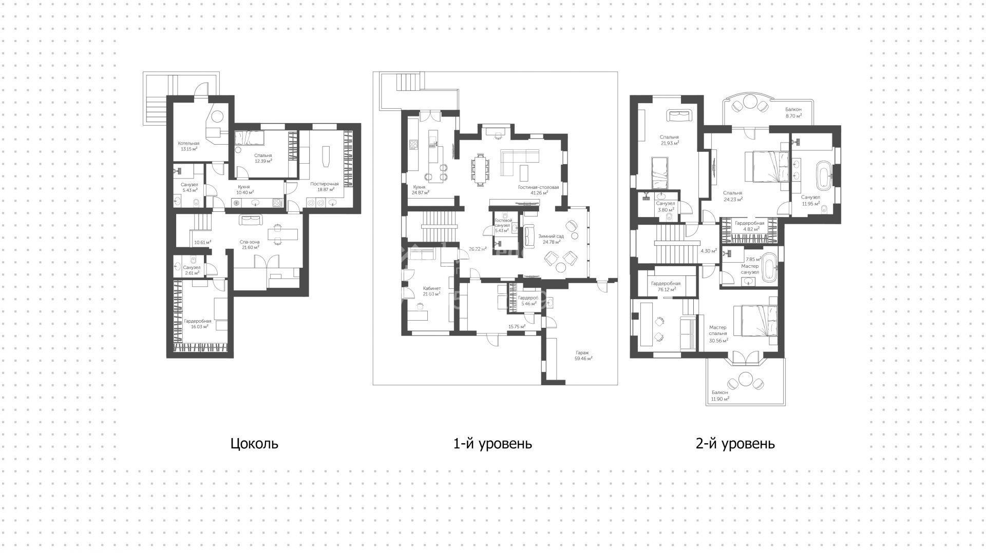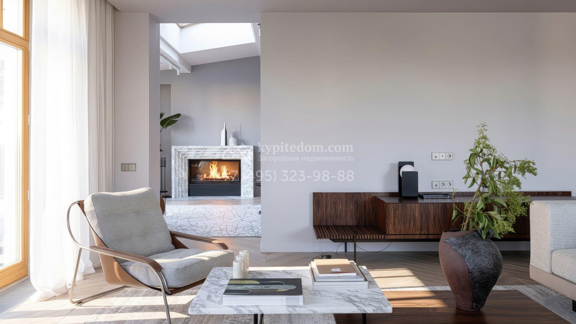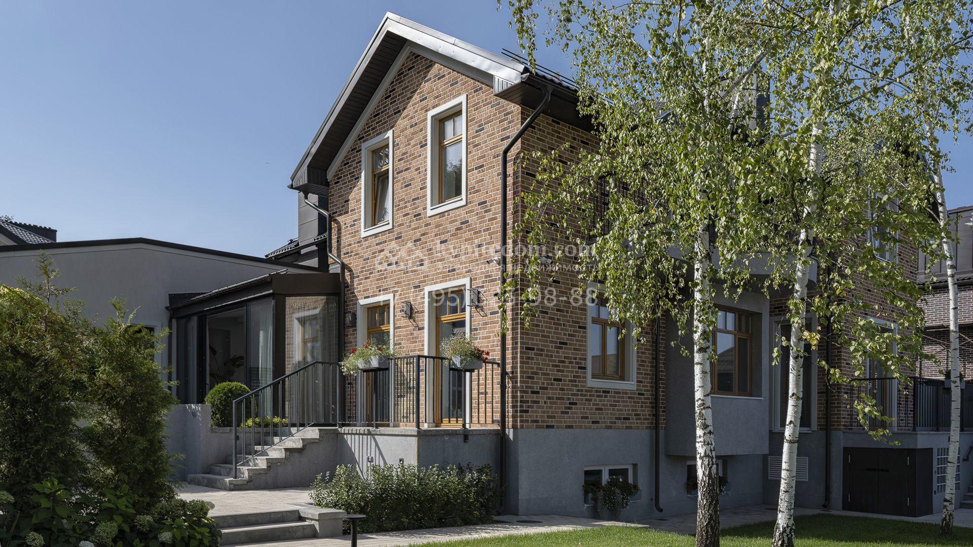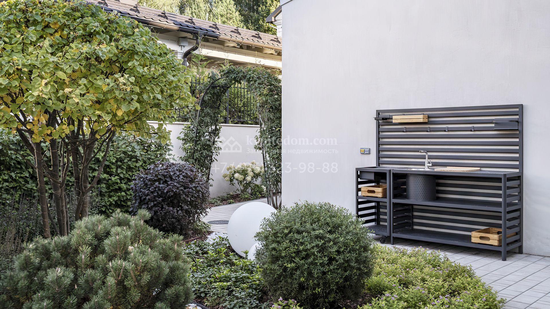 Планировка первого уровня включает просторную гостиную-столовую, кухню с функциональным островом, зимний сад с камином и кабинет. На втором этаже расположены три комфортабельные спальни. На цокольном уровне разместили спа-зону с сауной, массажным кабинетом, душевой и гардеробной, а также блок для персонала с кухней и спальней. Дополнительное преимущество — встроенный гараж на две машины. Участок благоустроен — аккуратный газон и ландшафтный дизайн создают гармоничное пространство для отдыха.