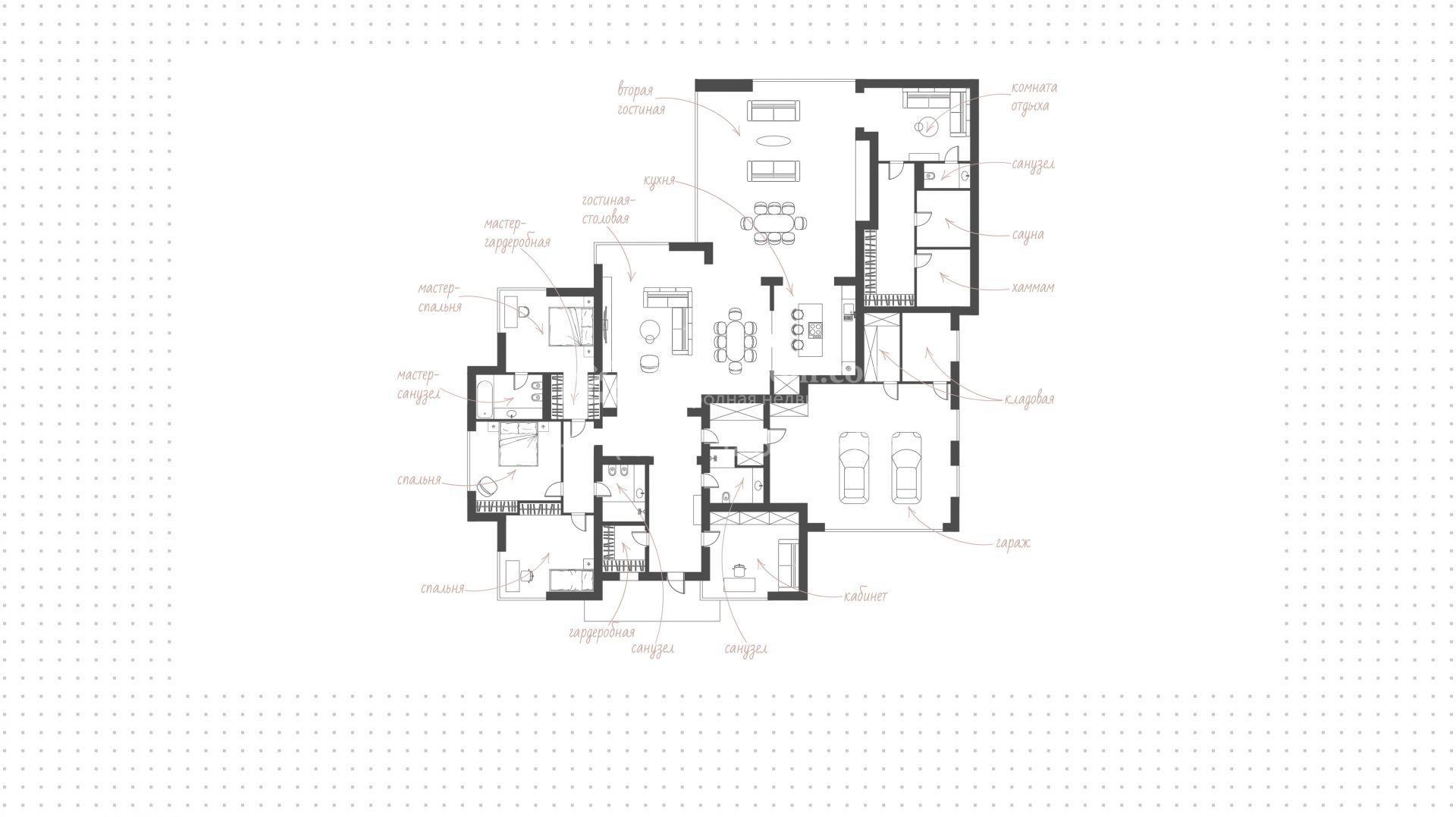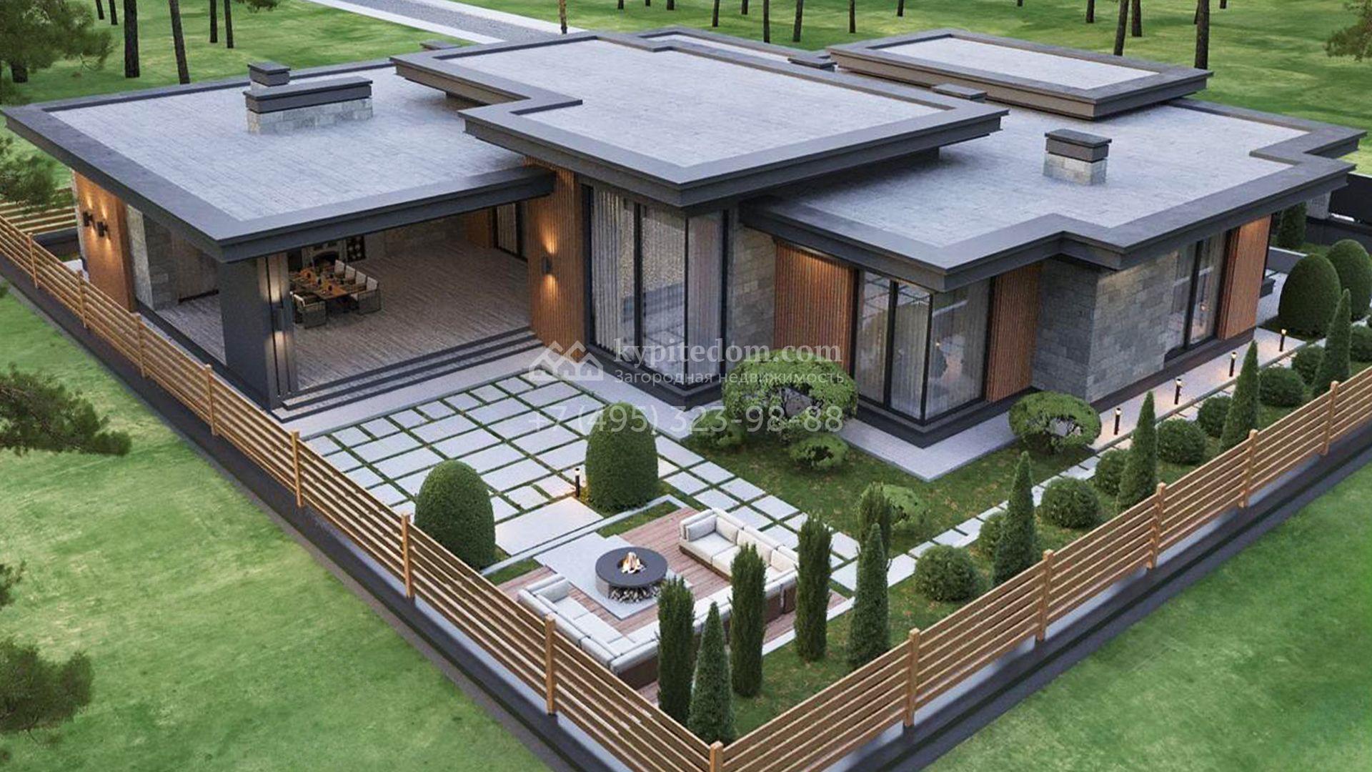 Планировка одноэтажного дома включает гостиную-столовую с высокими потолками, кухню, четыре спальни, две гардеробные, а также спа-зону с сауной и хаммамом. Практичным дополнением стал встроенный двухместный гараж. На открытой террасе площадью 80 м² можно организовать уютное пространство для барбекю на свежем воздухе.