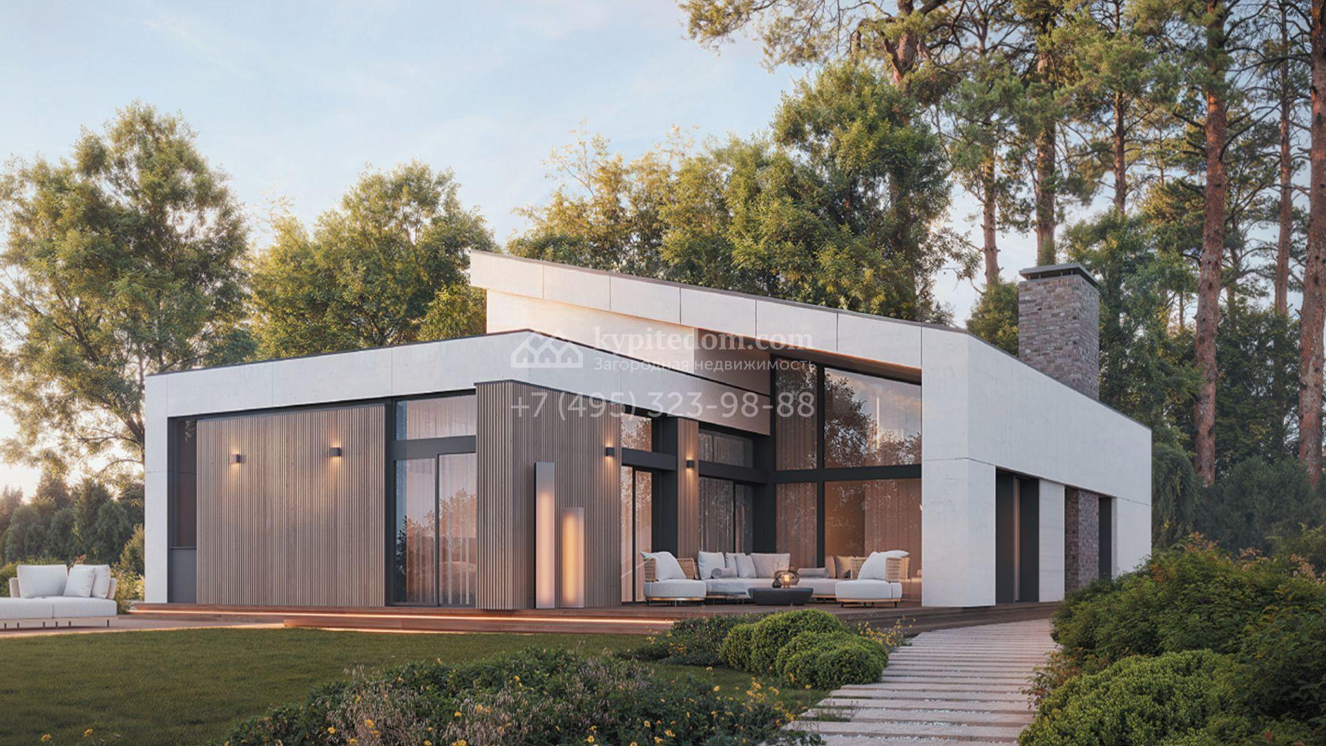 Загородный дом по проекту «Стевин» площадью 205 м² построен на участке 9,6 соток. Одноэтажный фасад с асимметричной архитектурой и панорамным остеклением облицован белоснежным камнем и планками с фактурой дерева. Планировка коттеджа включает 3 спальни, гостиную-кухню-столовую, сауну с комнатой отдыха и просторную террасу. На участке выполнен ландшафтный дизайн, вымощены дорожки и засеян газон.