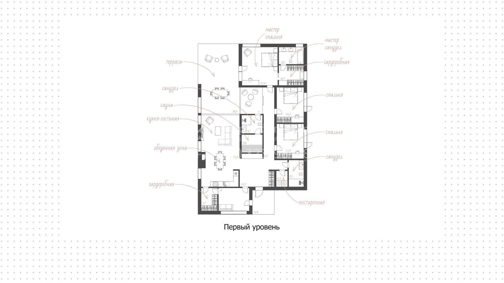 Загородный дом по проекту «Стевин» площадью 205 м² построен на участке 13,1 сотка. Одноэтажный фасад с асимметричной архитектурой и панорамным остеклением облицован белоснежным камнем и планками с фактурой дерева. Планировка коттеджа включает 3 спальни, гостиную-кухню-столовую, сауну с комнатой отдыха и просторную террасу. На участке выполнен ландшафтный дизайн, вымощены дорожки и засеян газон.