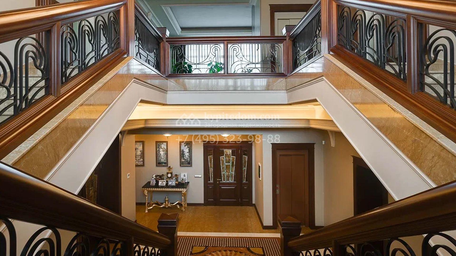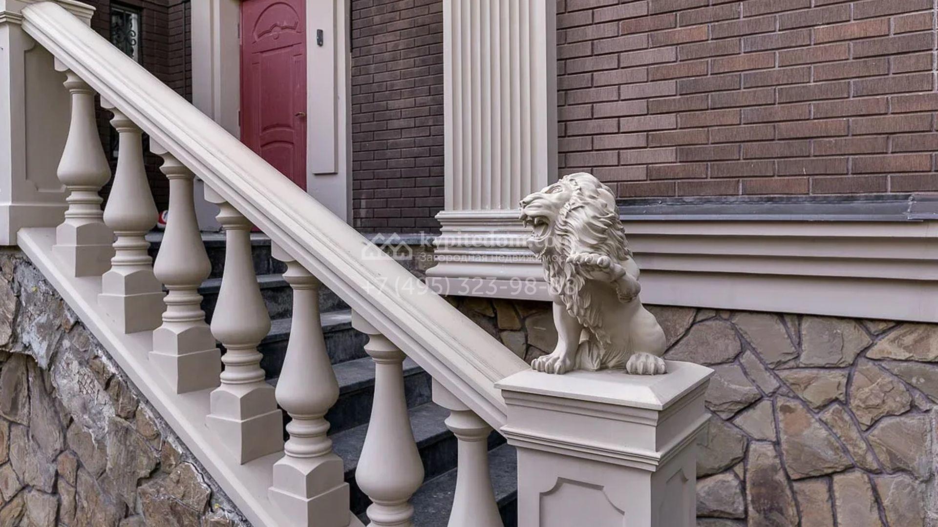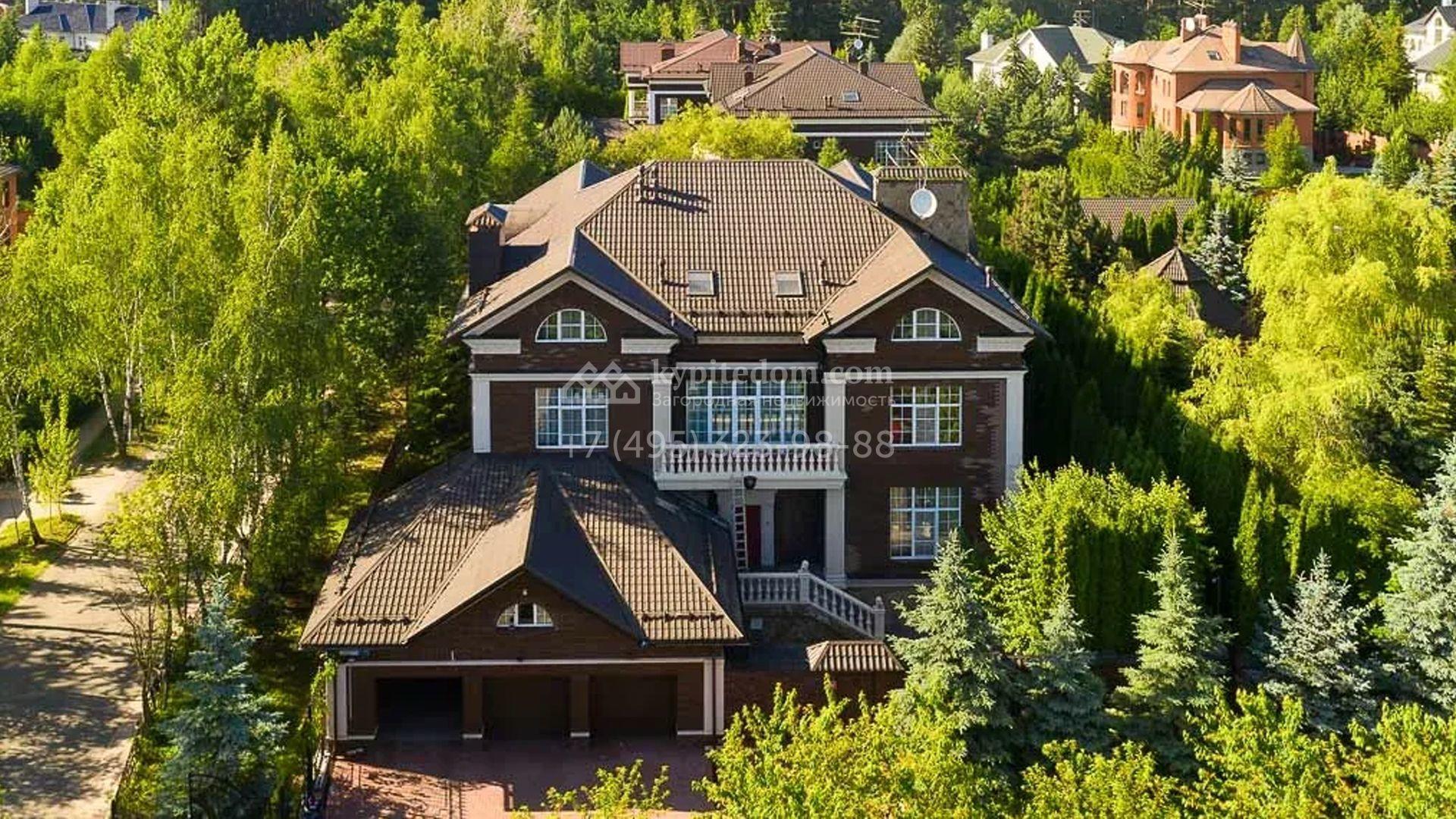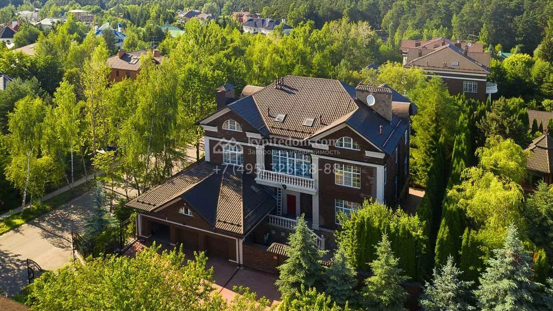 Загородная резиденция площадью 1 200 м² расположена на участке 23 сотки в центральной части посёлка. Фасад, облицованный тёмным клинкером, подчеркнут белыми карнизами и элегантной балюстрадой. Окна с тонкой расстекловкой и светлыми рамами придают дому характер классического английского поместья.