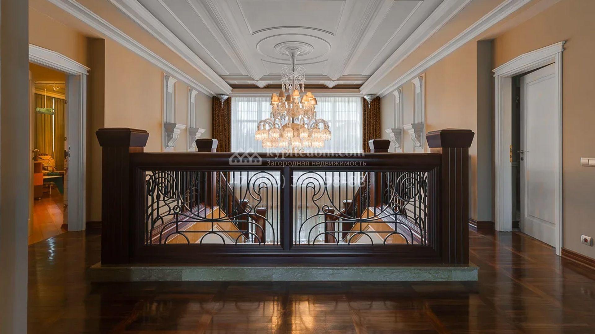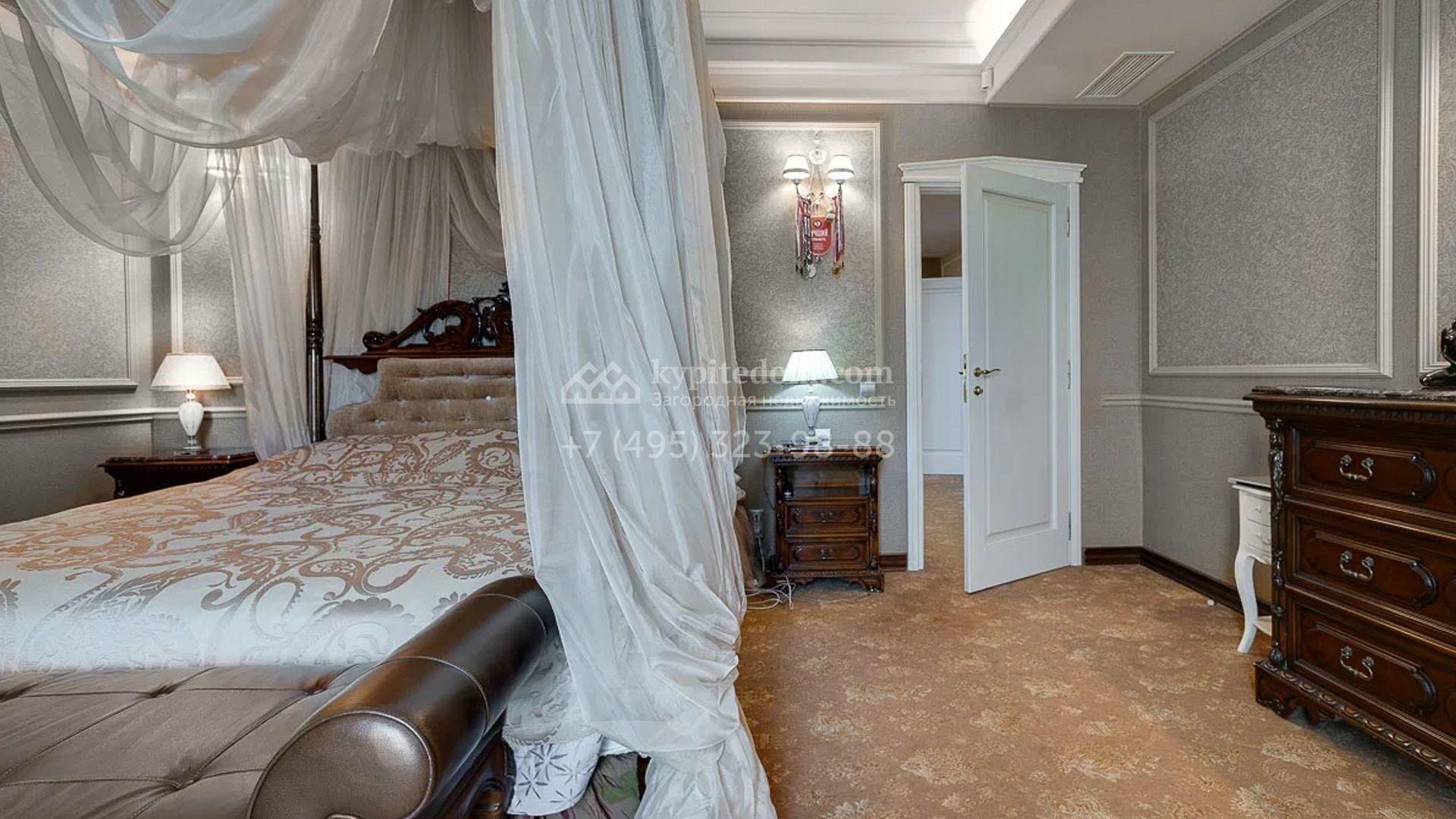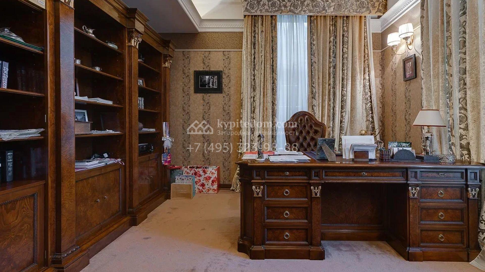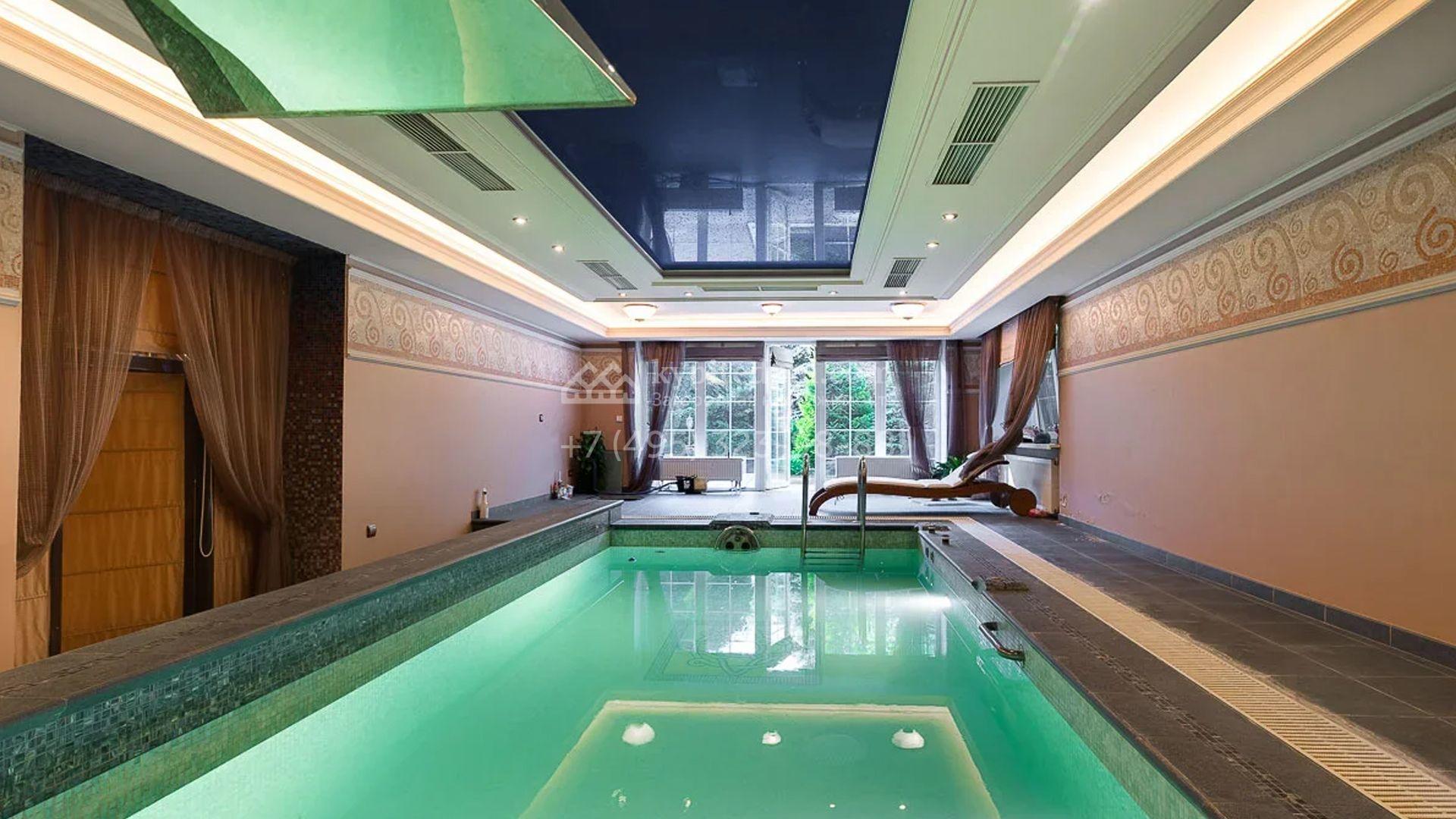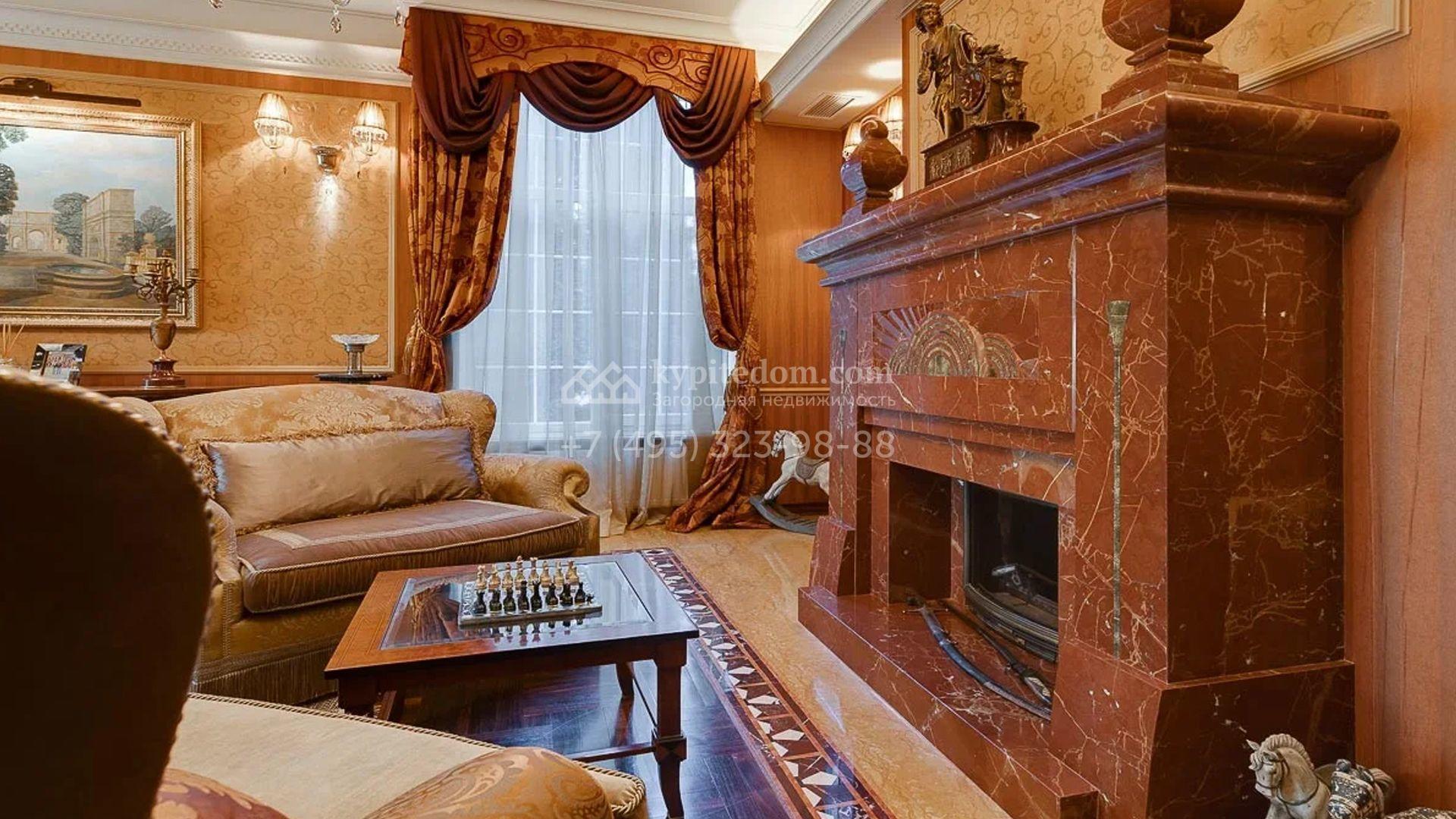Внутренние пространства оформлены в спокойной палитре: в отделке использованы натуральный камень, ценные породы дерева, фактурные ткани и коллекционная мебель. В гостиной установлен камин из природного камня, создающий выразительный акцент в общем ансамбле. Планировка включает четыре спальни с собственными санузлами и гардеробными, кинозал и бассейн.