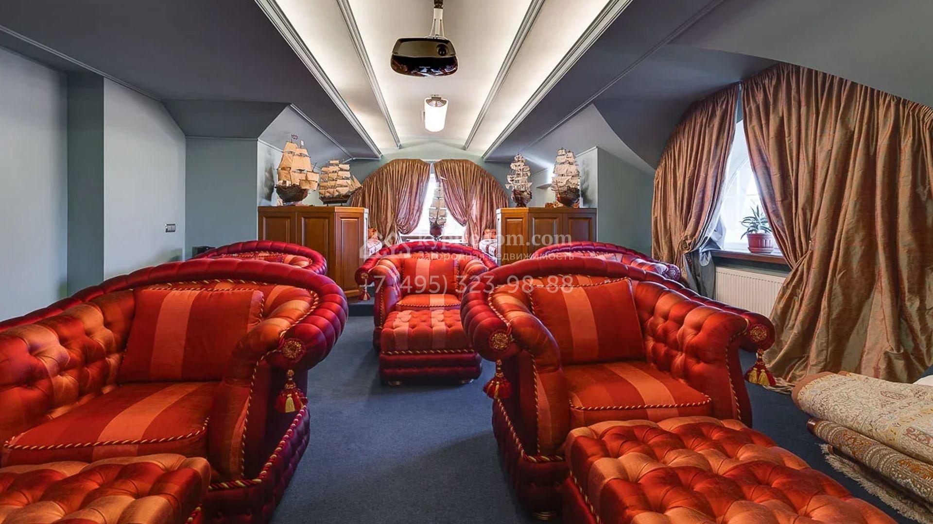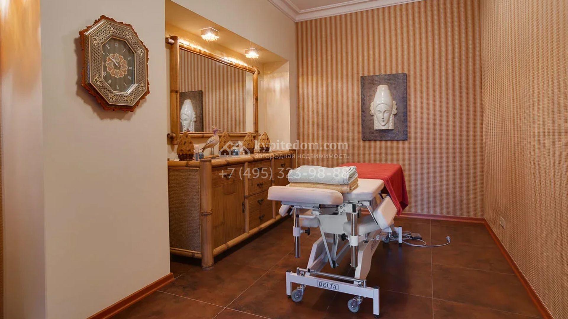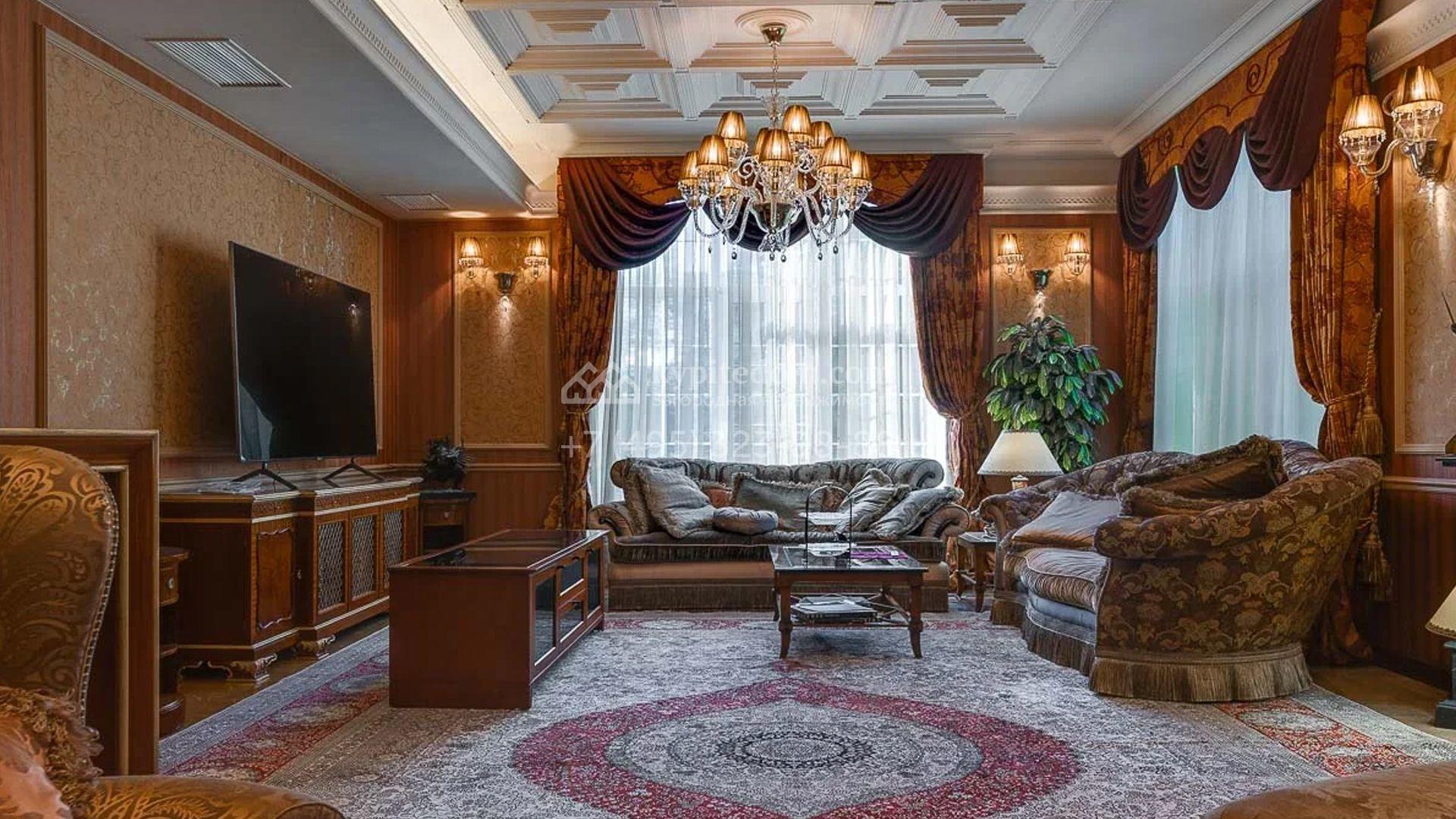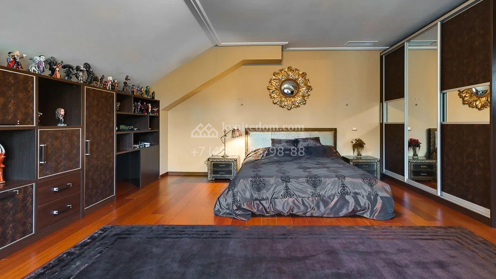 Внутренние пространства оформлены в спокойной палитре: в отделке использованы натуральный камень, ценные породы дерева, фактурные ткани и коллекционная мебель. В гостиной установлен камин из природного камня, создающий выразительный акцент в общем ансамбле. Планировка включает четыре спальни с собственными санузлами и гардеробными, кинозал и бассейн.