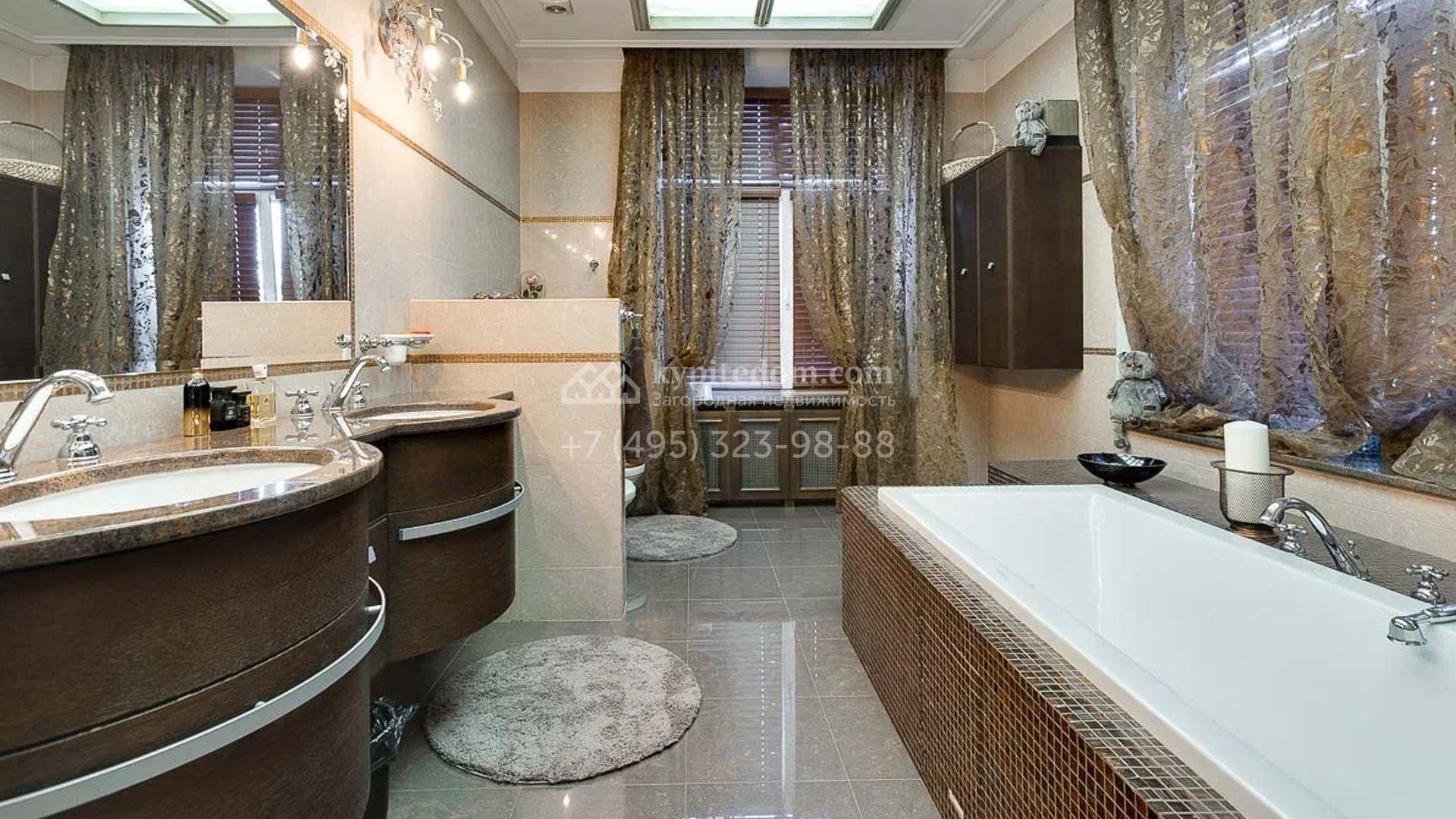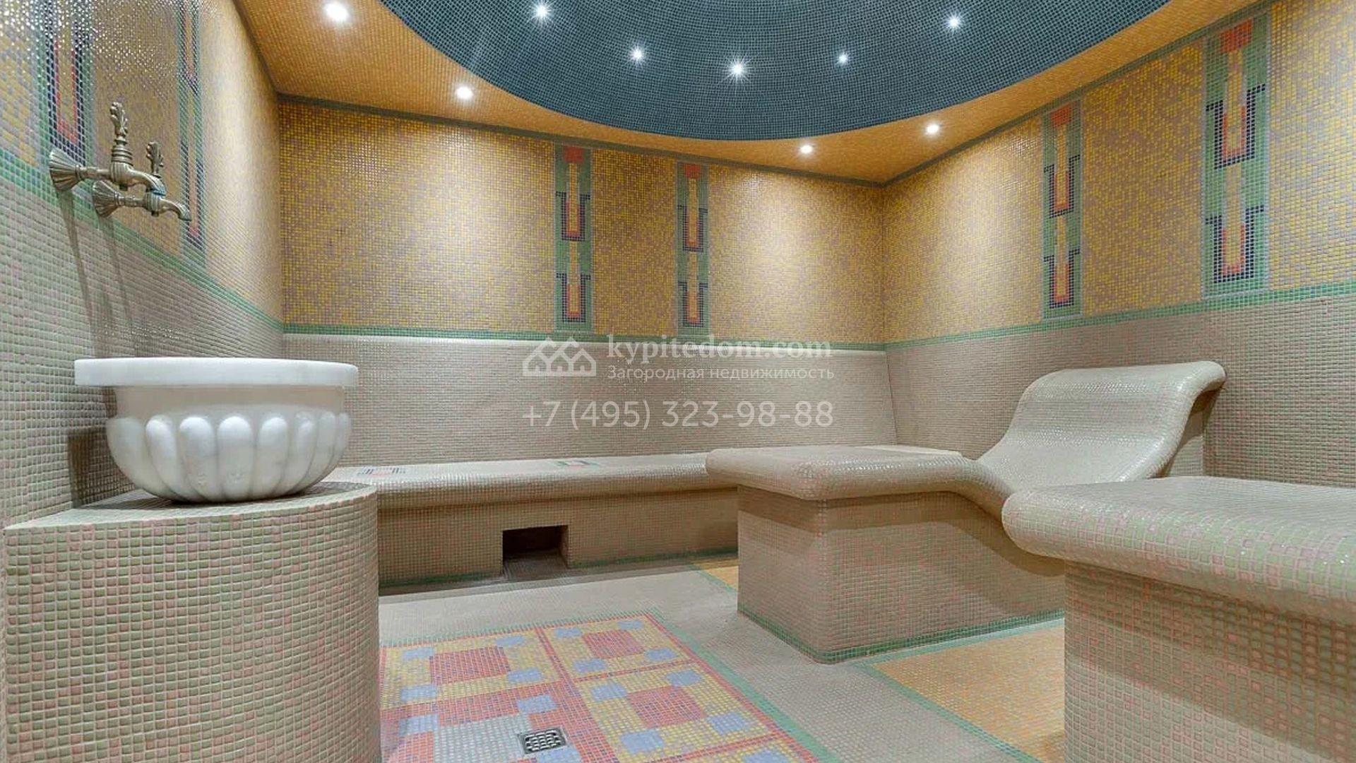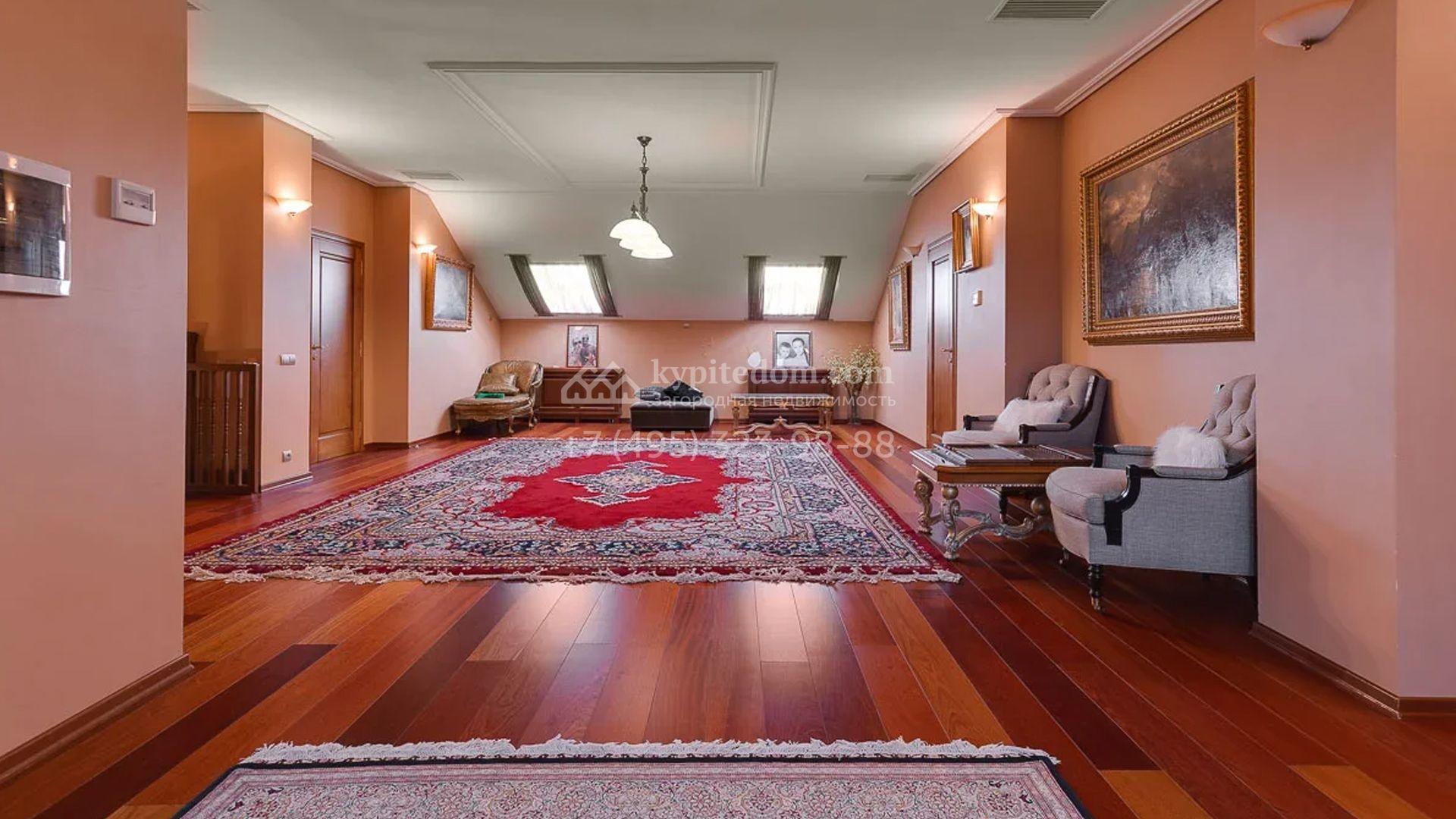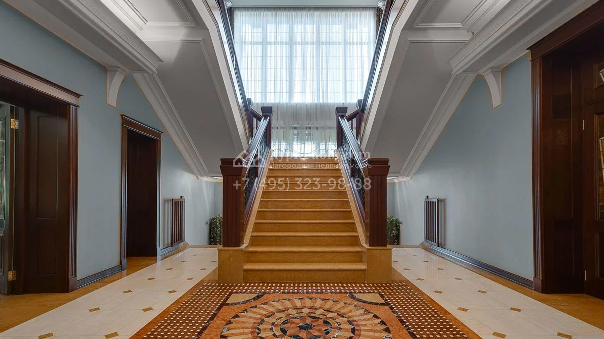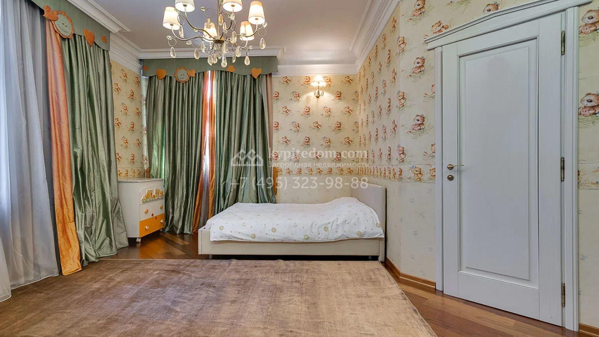 Внутренние пространства оформлены в спокойной палитре: в отделке использованы натуральный камень, ценные породы дерева, фактурные ткани и коллекционная мебель. В гостиной установлен камин из природного камня, создающий выразительный акцент в общем ансамбле. Планировка включает четыре спальни с собственными санузлами и гардеробными, кинозал и бассейн.