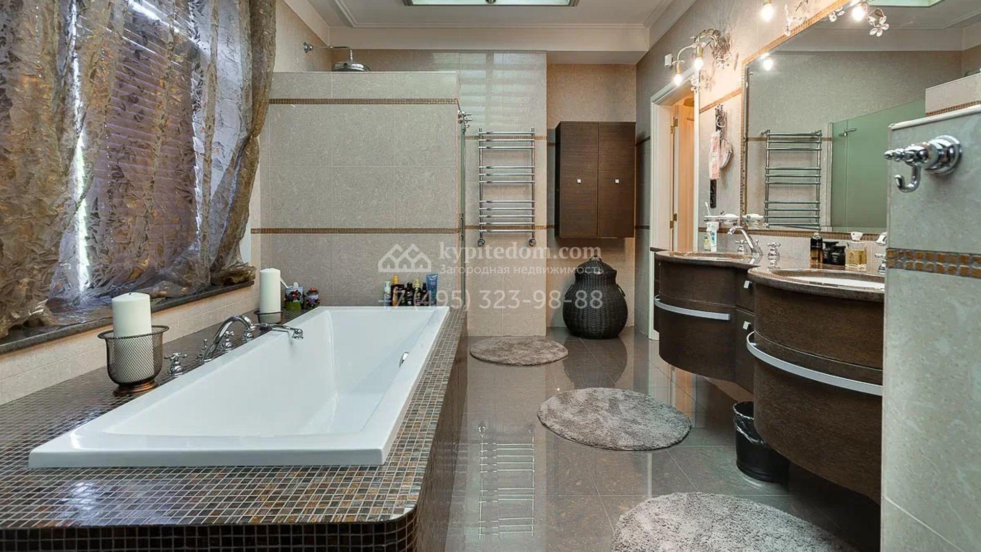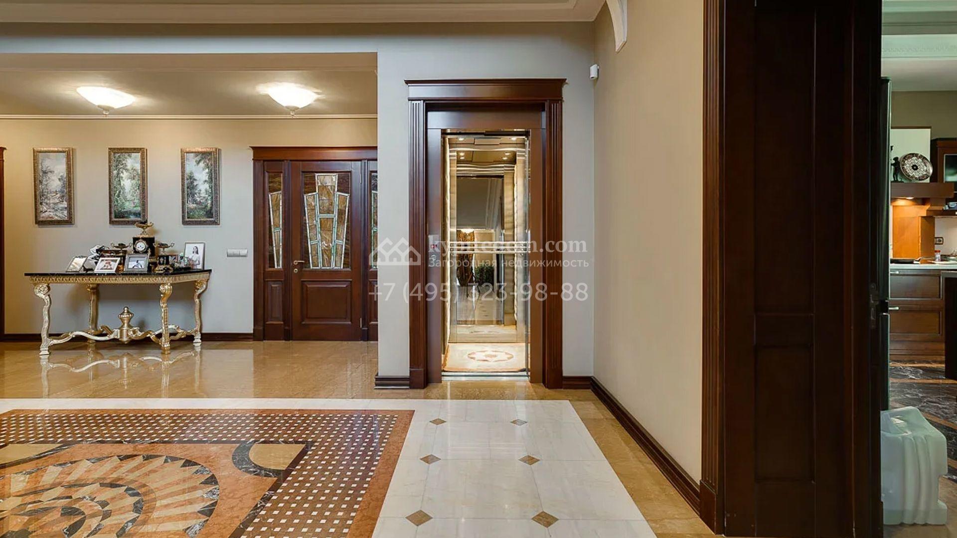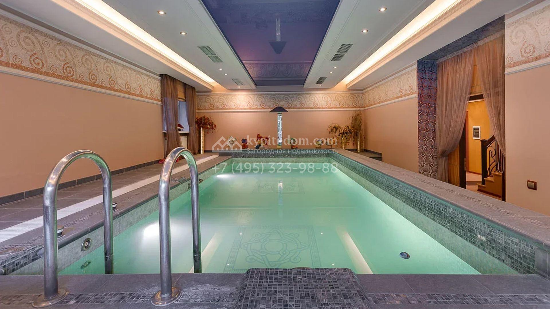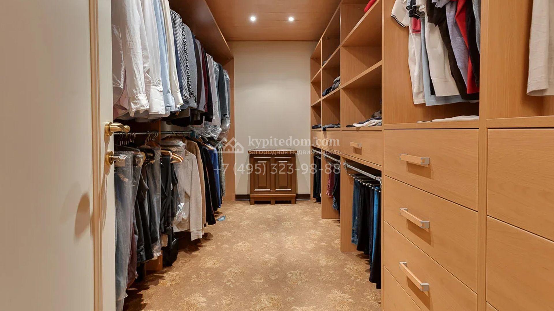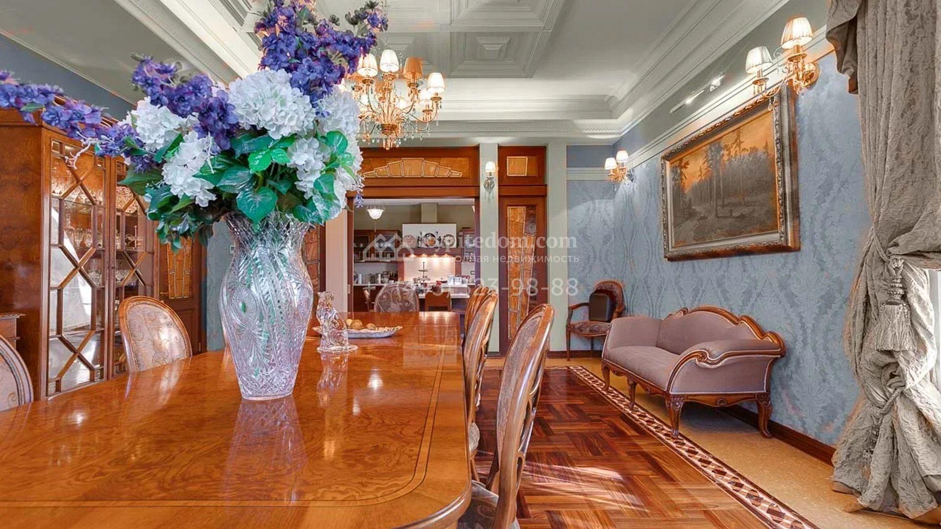 Внутренние пространства оформлены в спокойной палитре: в отделке использованы натуральный камень, ценные породы дерева, фактурные ткани и коллекционная мебель. В гостиной установлен камин из природного камня, создающий выразительный акцент в общем ансамбле. Планировка включает четыре спальни с собственными санузлами и гардеробными, кинозал и бассейн.