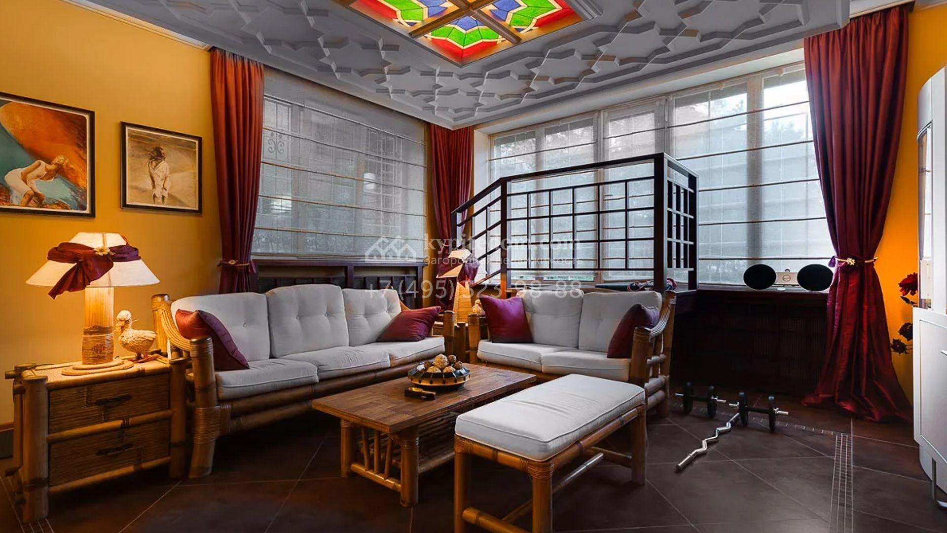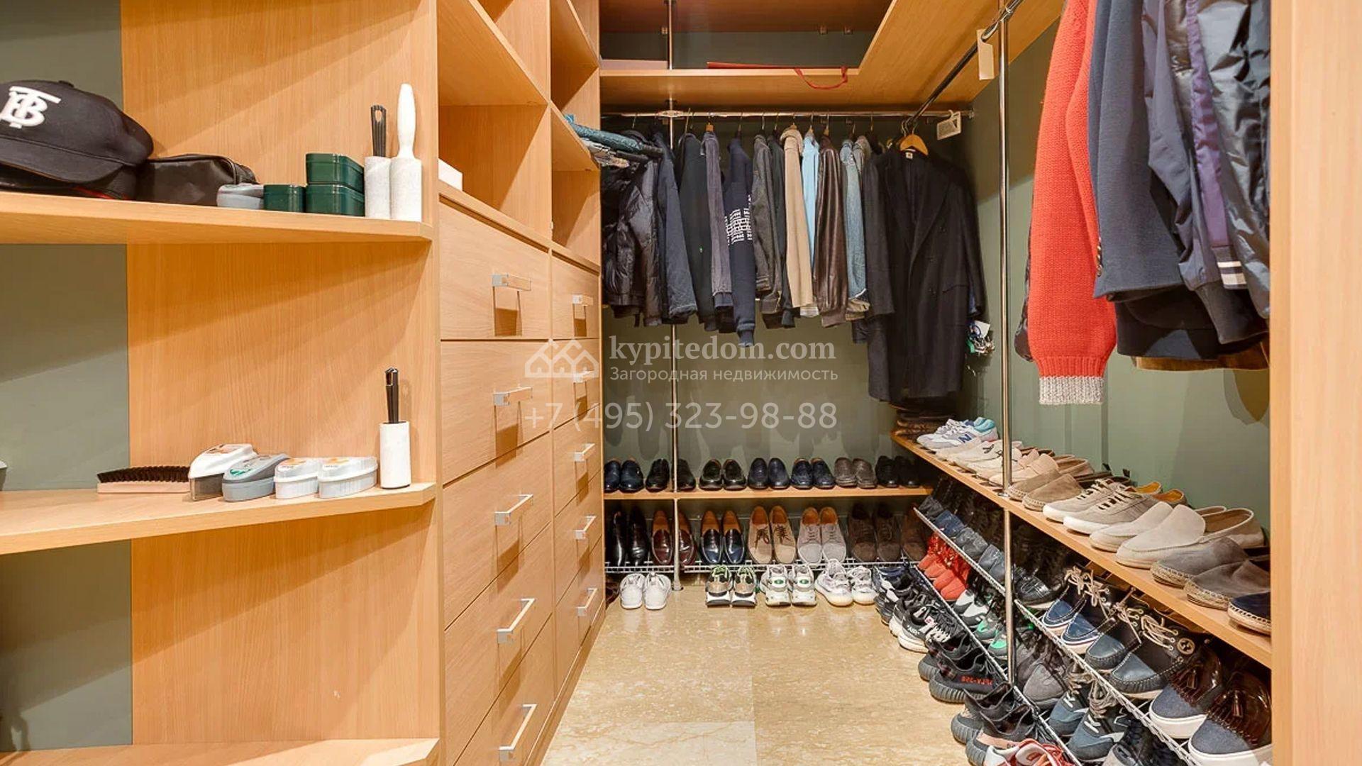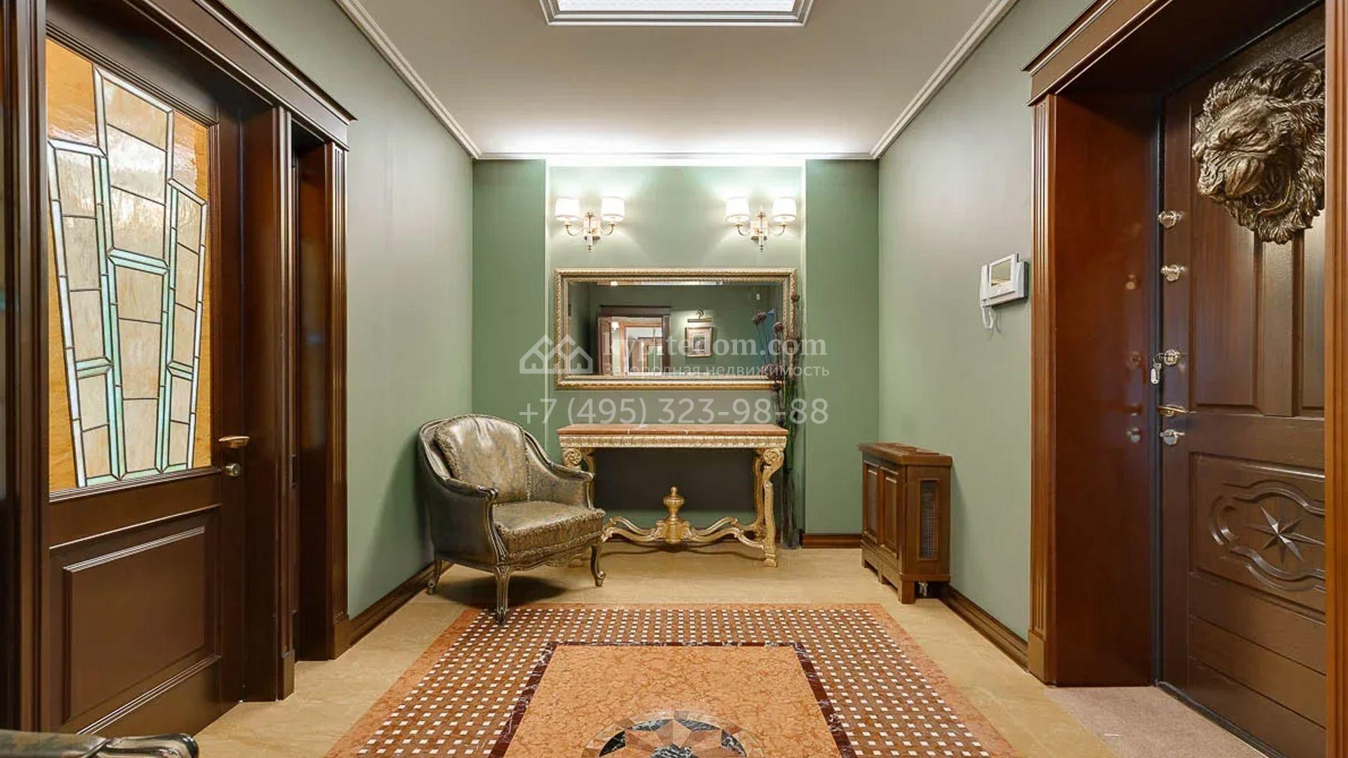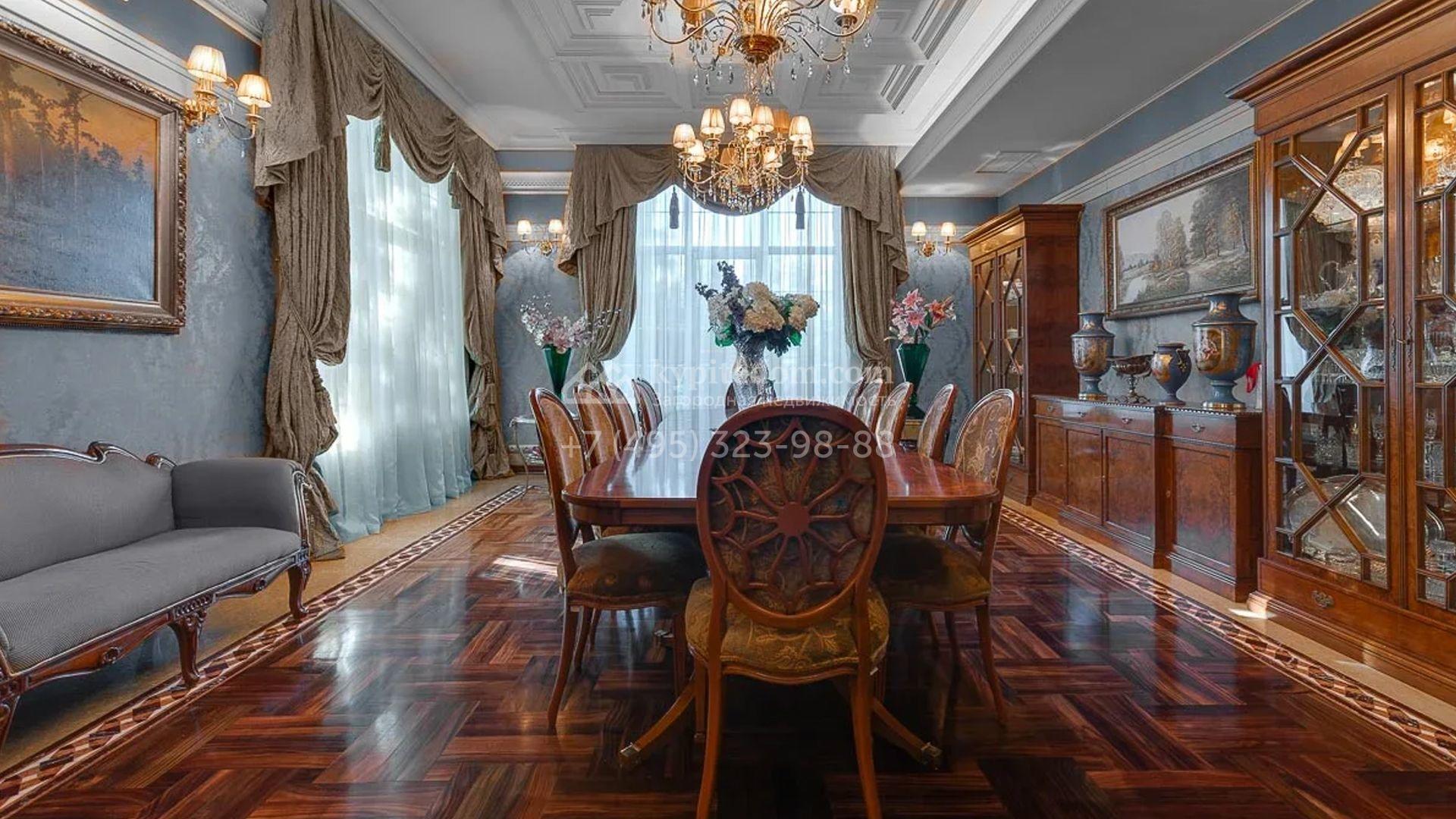 Внутренние пространства оформлены в спокойной палитре: в отделке использованы натуральный камень, ценные породы дерева, фактурные ткани и коллекционная мебель. В гостиной установлен камин из природного камня, создающий выразительный акцент в общем ансамбле. Планировка включает четыре спальни с собственными санузлами и гардеробными, кинозал и бассейн.