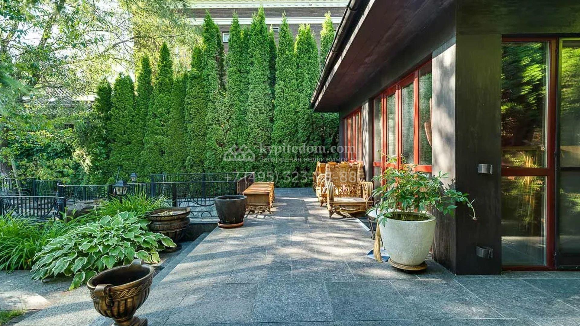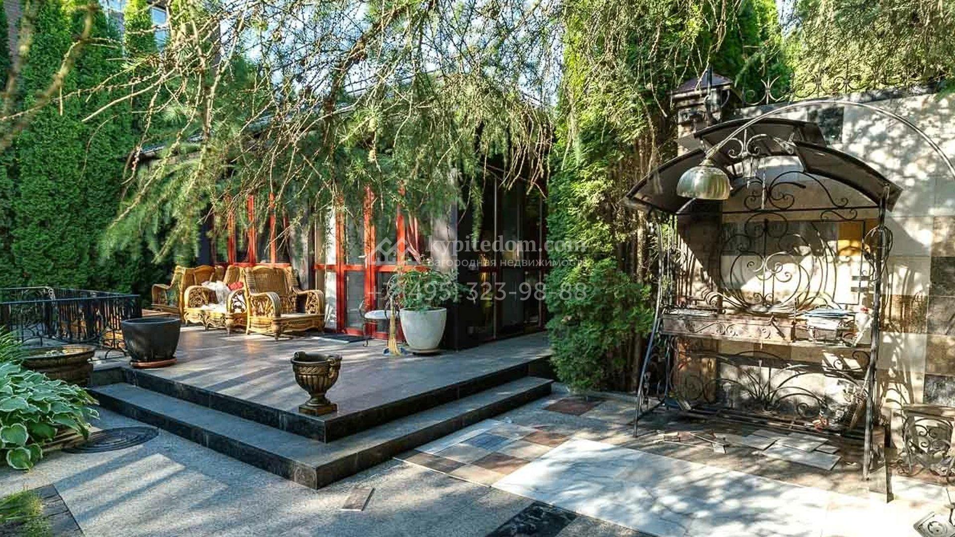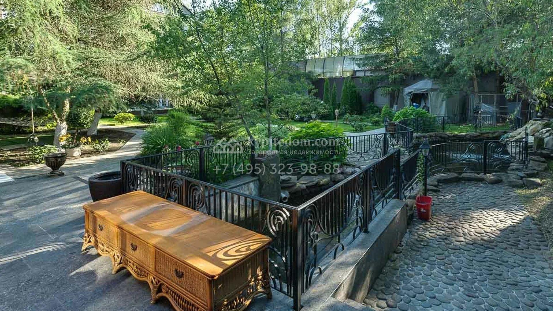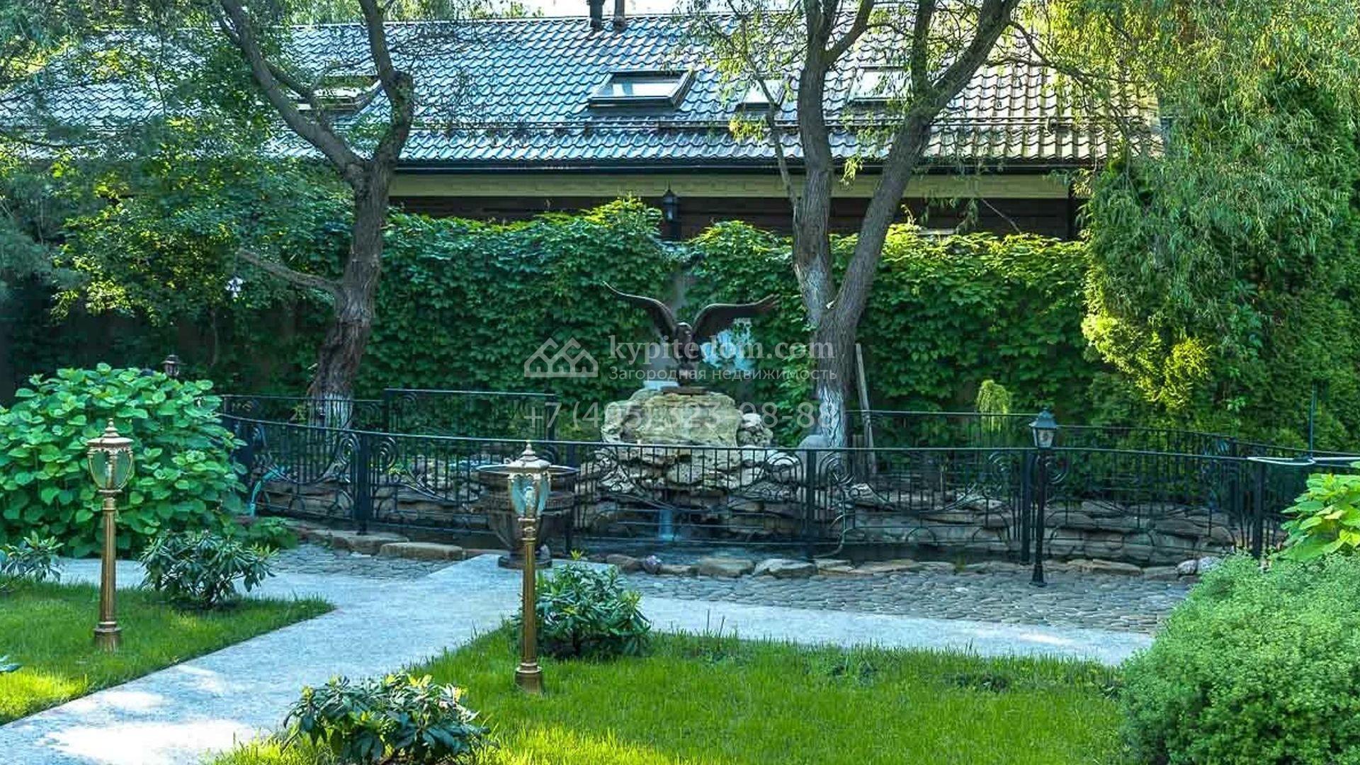На территории выполнен аккуратный ландшафтный проект: ухоженный газон, декоративные деревья, фонтан и несколько скульптурных композиций формируют спокойный вид из окон. В глубине сада расположен застеклённый чайный павильон с видом на пруд — место для утреннего чая или тихого отдыха днём. Перед домом находится гараж на три автомобиля, дополненный двумя комнатами для персонала и удобным выездом на улицу.