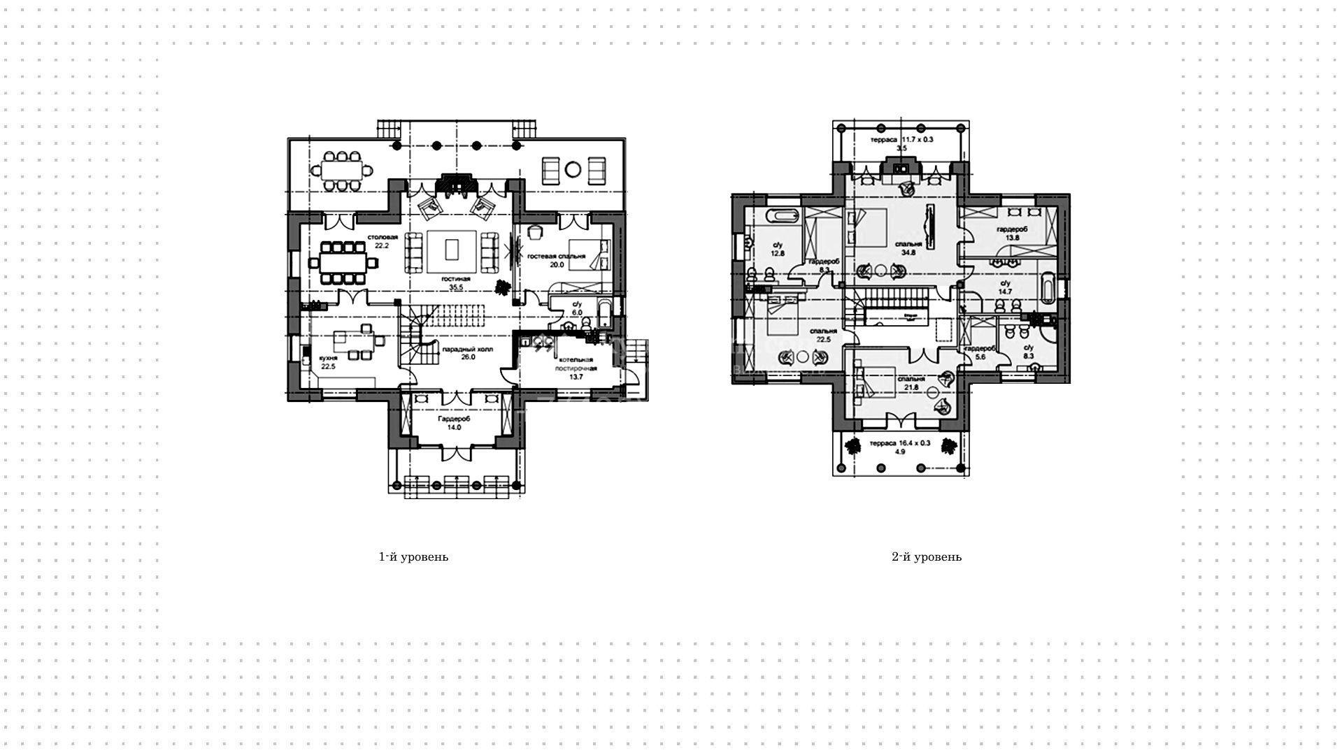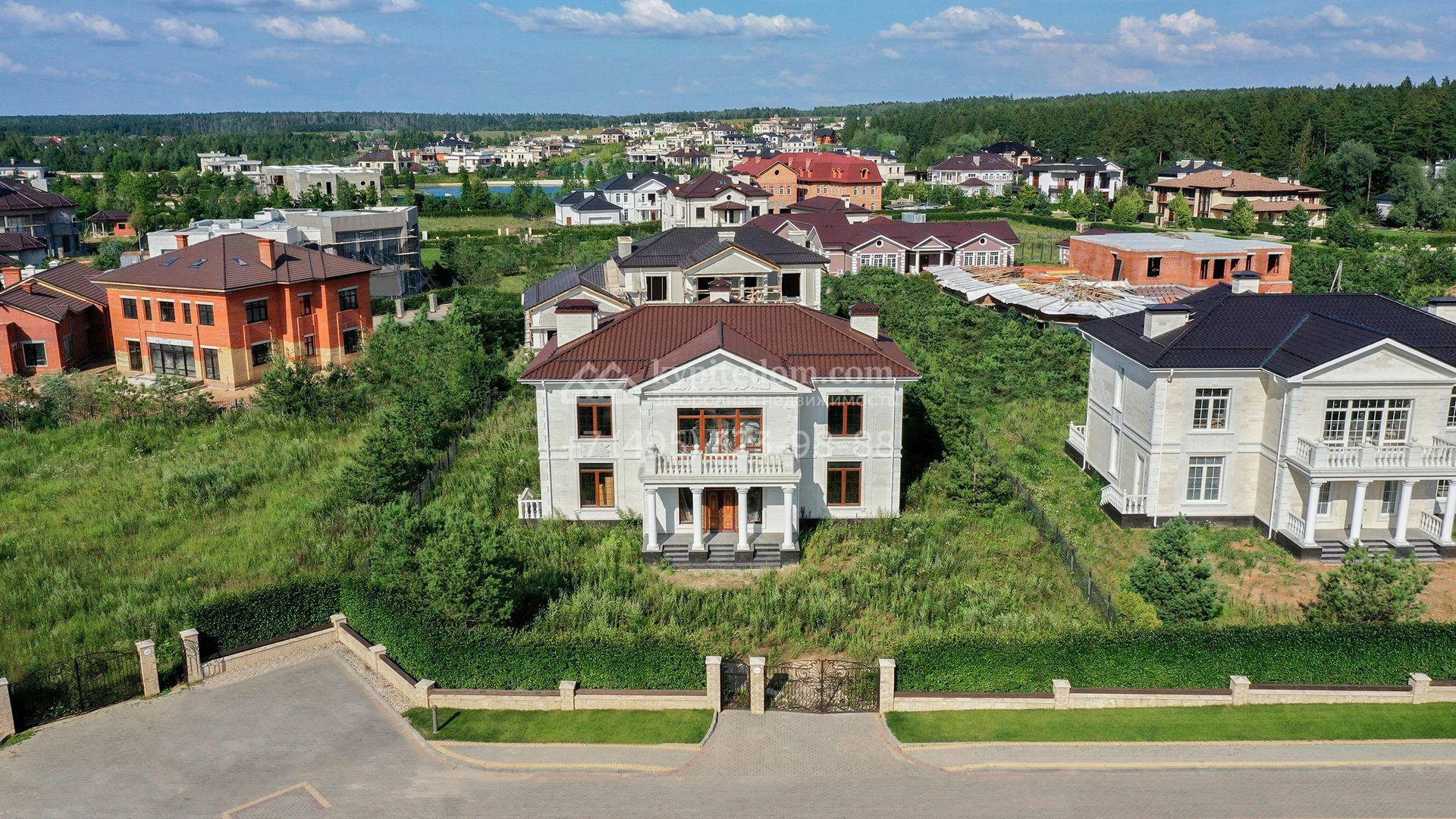 Планировка включает просторную гостиную-столовую с камином, кухню, четыре спальни, гардеробные и террасы, на которых будет приятно начинать день с чашечкой кофе. Участок представляет собой чистый холст для создания ландшафтного дизайна — здесь можно засеять газон, высадить пушистые ели и декоративные кустарники, а также проложить аккуратные дорожки.