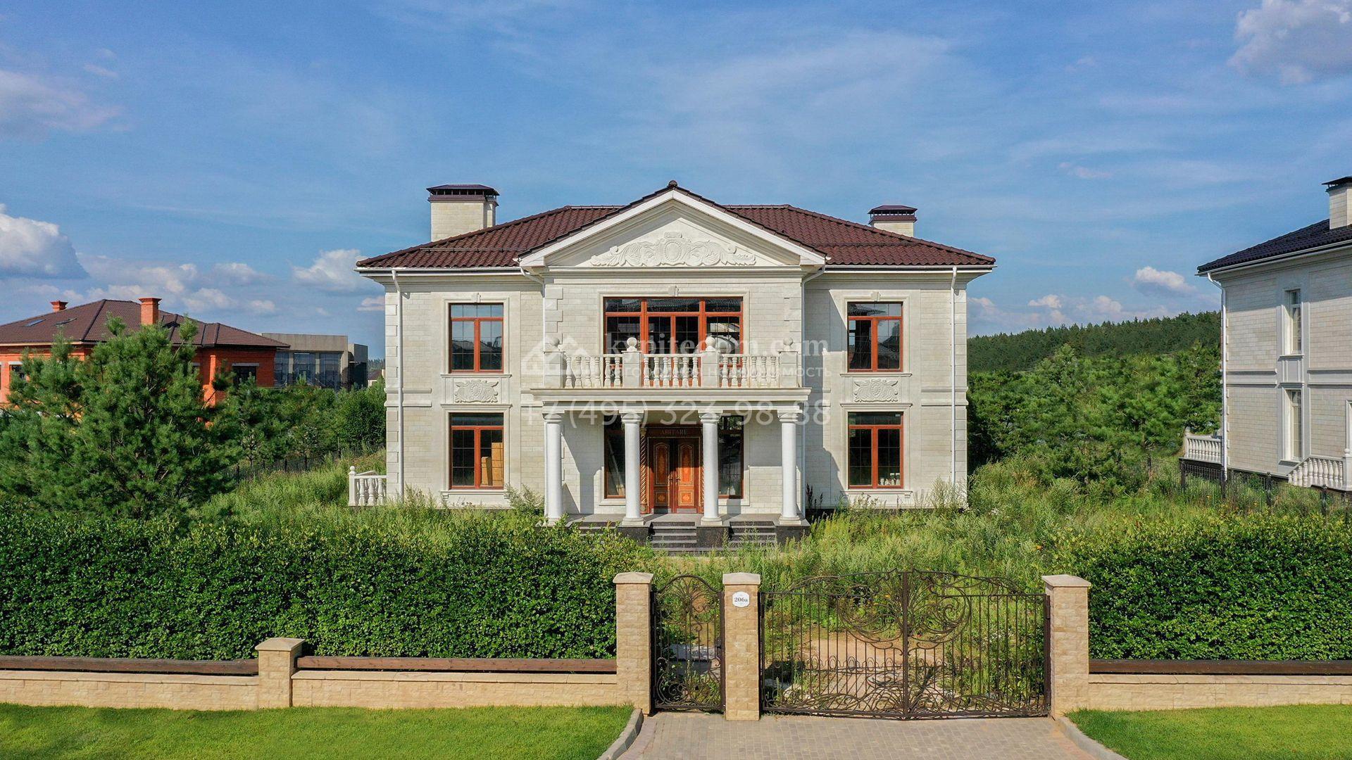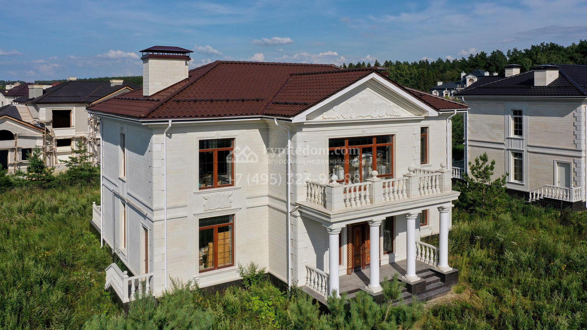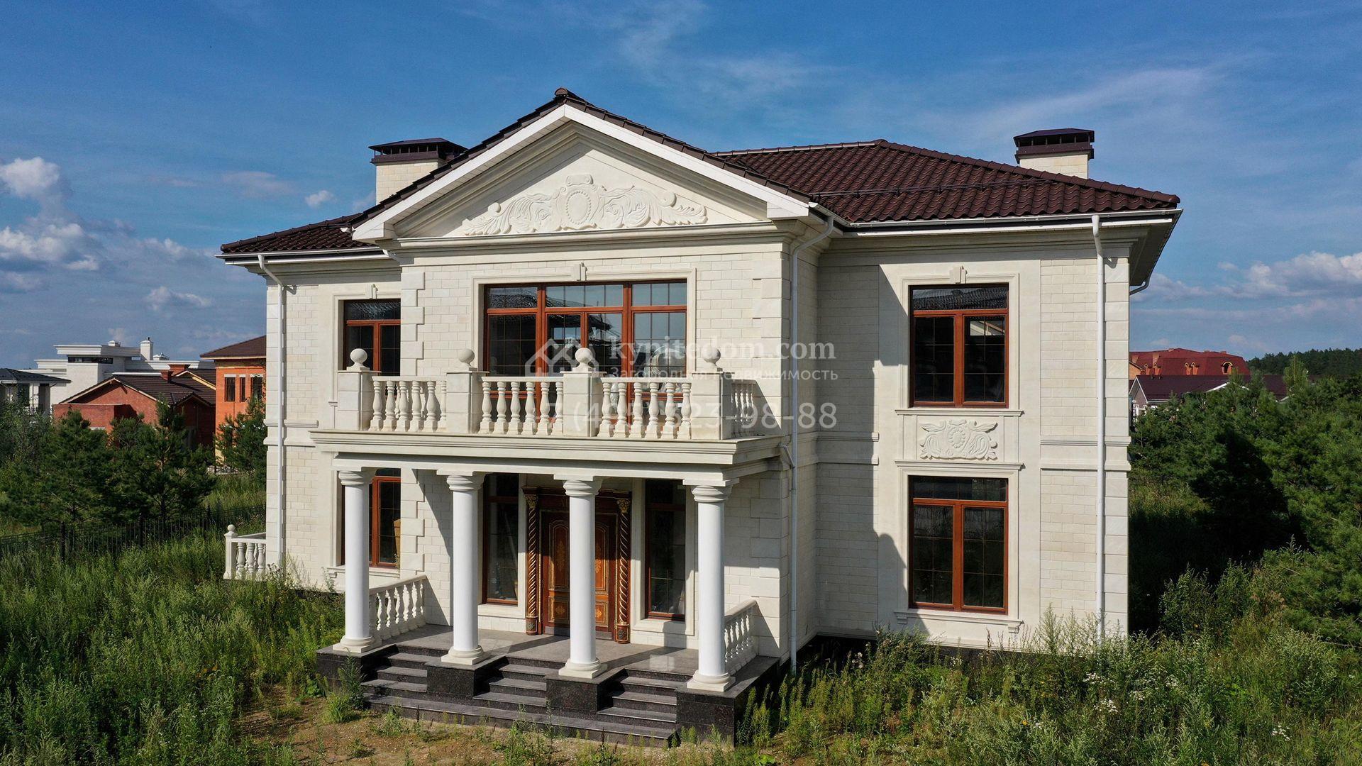 Загородный коттедж площадью 360 м² расположен на полевом участке 14 соток. Изящный кирпичный фасад, выполненный в классическом стиле, украшен белоснежными колоннами, замковым камнем и элегантной лепниной. Отсутствие отделки позволяет будущим владельцам реализовать любой дизайн-проект, который будет отражать их вкус и стиль жизни.