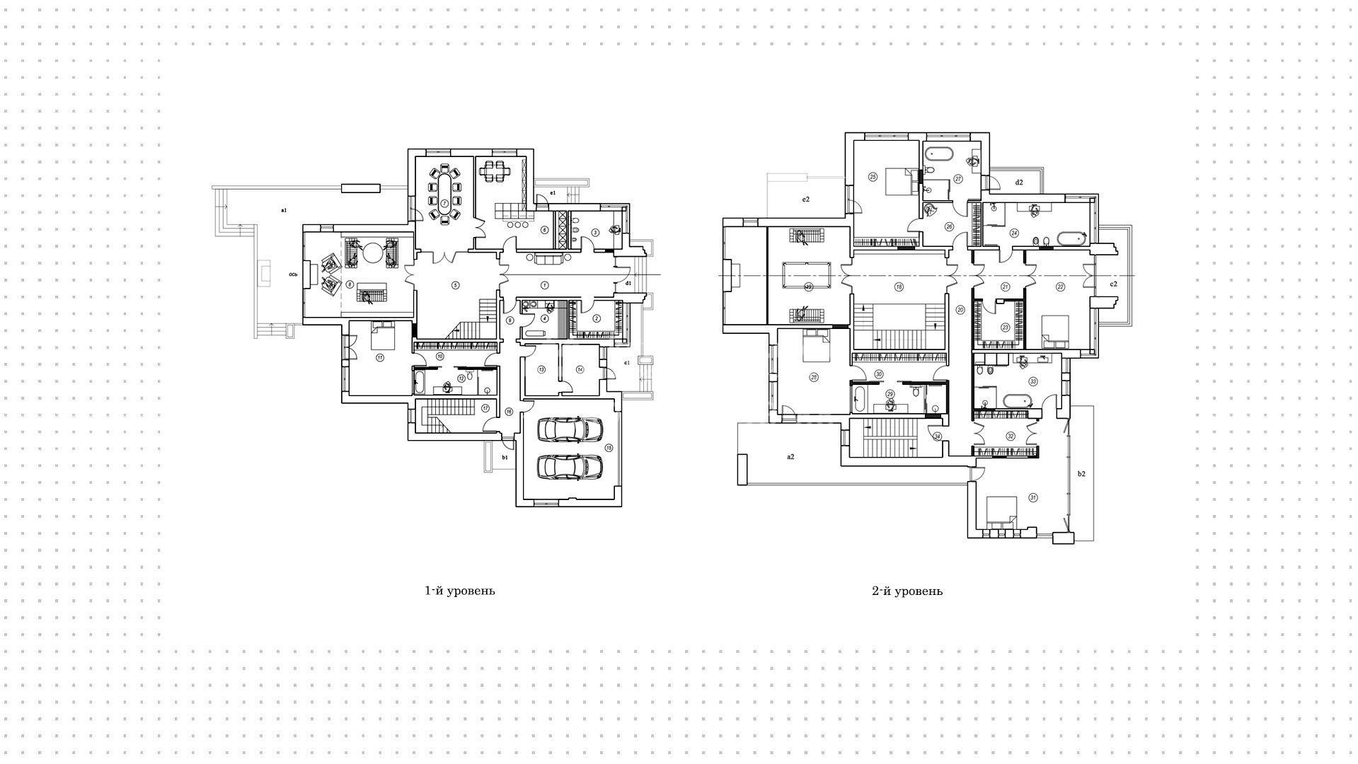 1-й уровень: гардеробная, санузел, серверная, котельная, гараж на 2 машины, гостевой санузел, гостевая спальня, лестничный холл, салон, столовая с выходом на террасу, кухня.