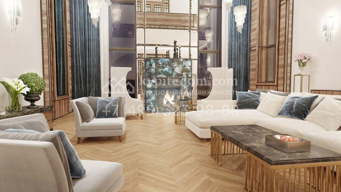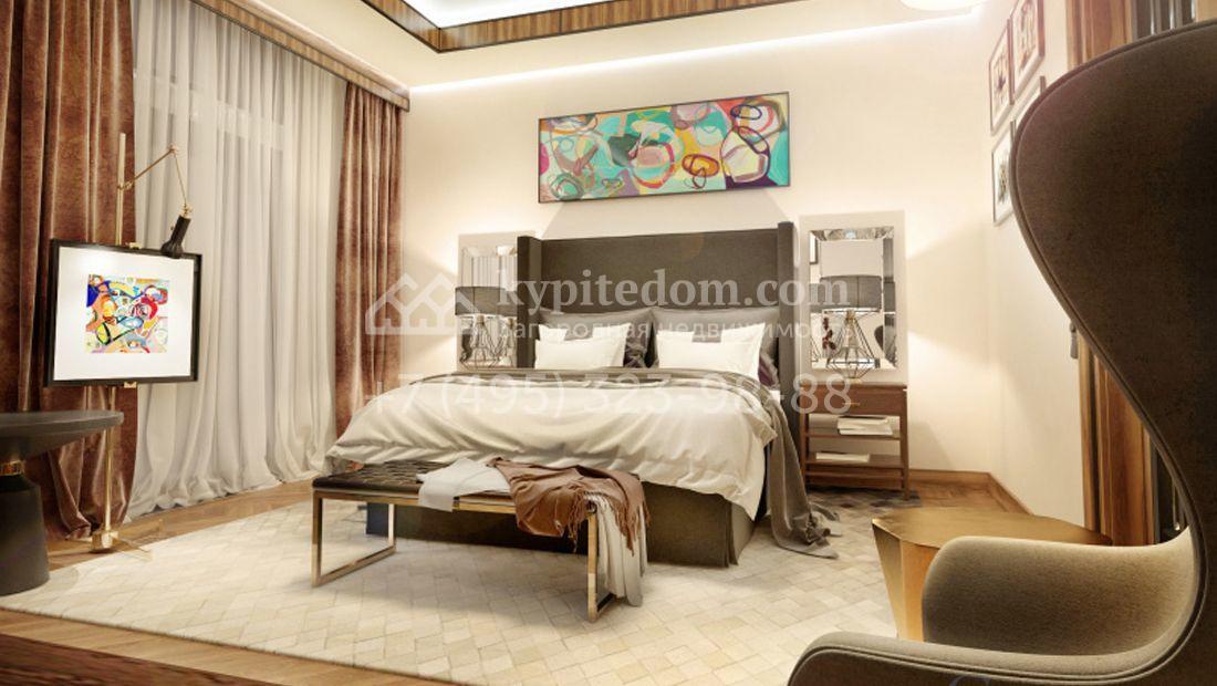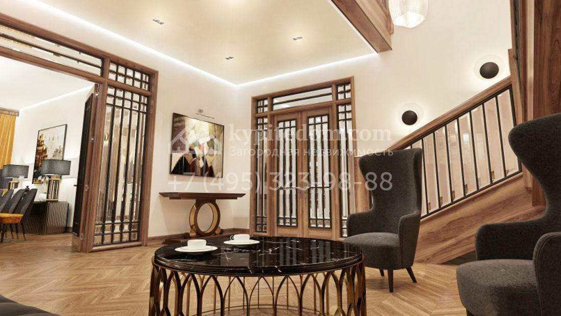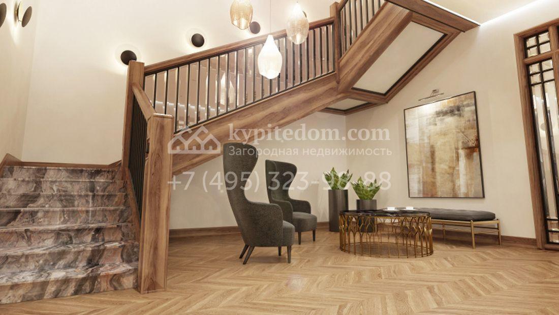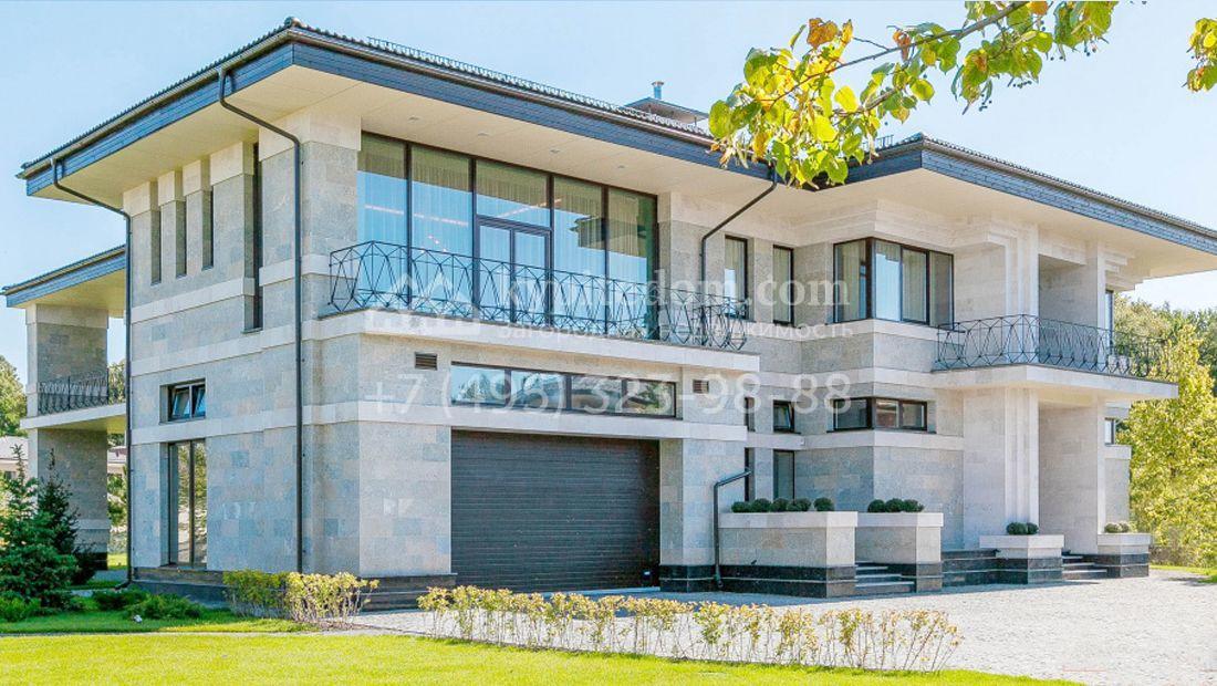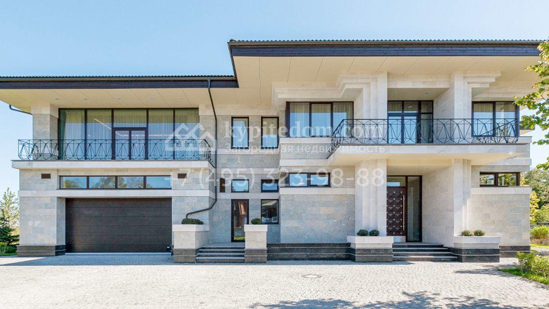 Двухэтажная резиденция в райтовском стиле продается с отделкой под ключ. Площадь дома — 990 м². В интерьере использован натуральный камень, ценные породы древесины. На полу массив дуба, мрамор. Фасад кухни выполнен из ореха, столешница и фартук из мрамора, встроена бытовая техника Kuppersbusch. Камин в гостиной выполнен из полудрагоценного камня Лабродарит. Дом стоит на открытом участке 50 соток.
