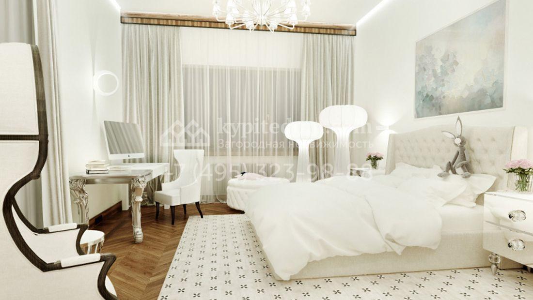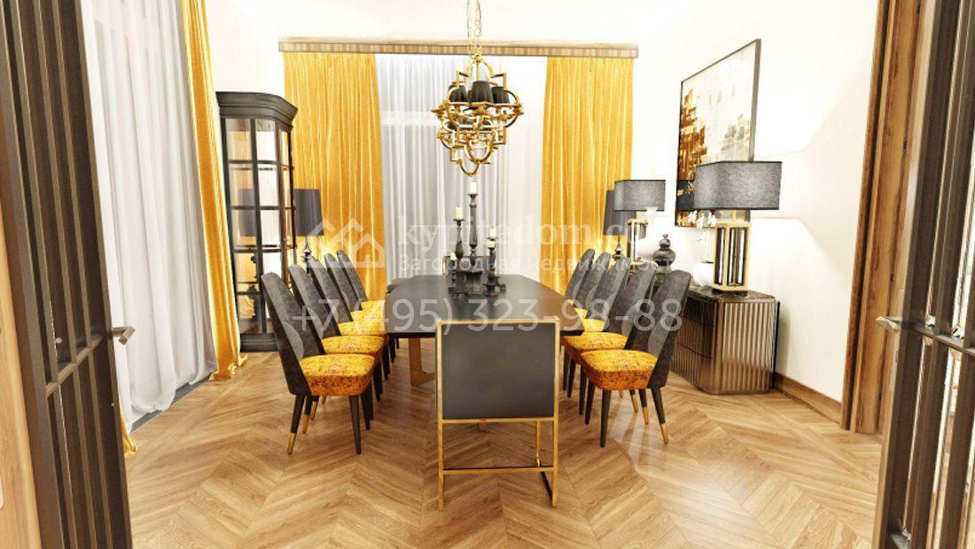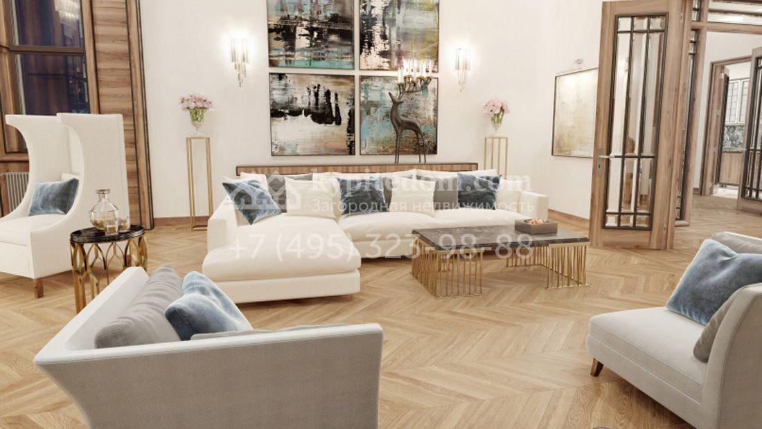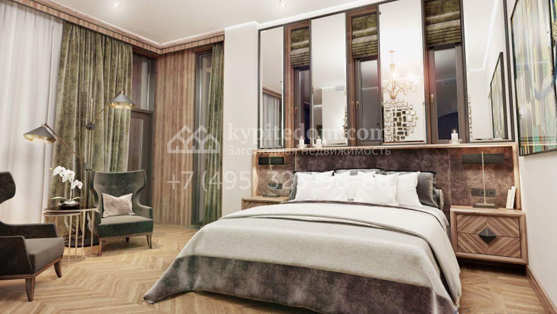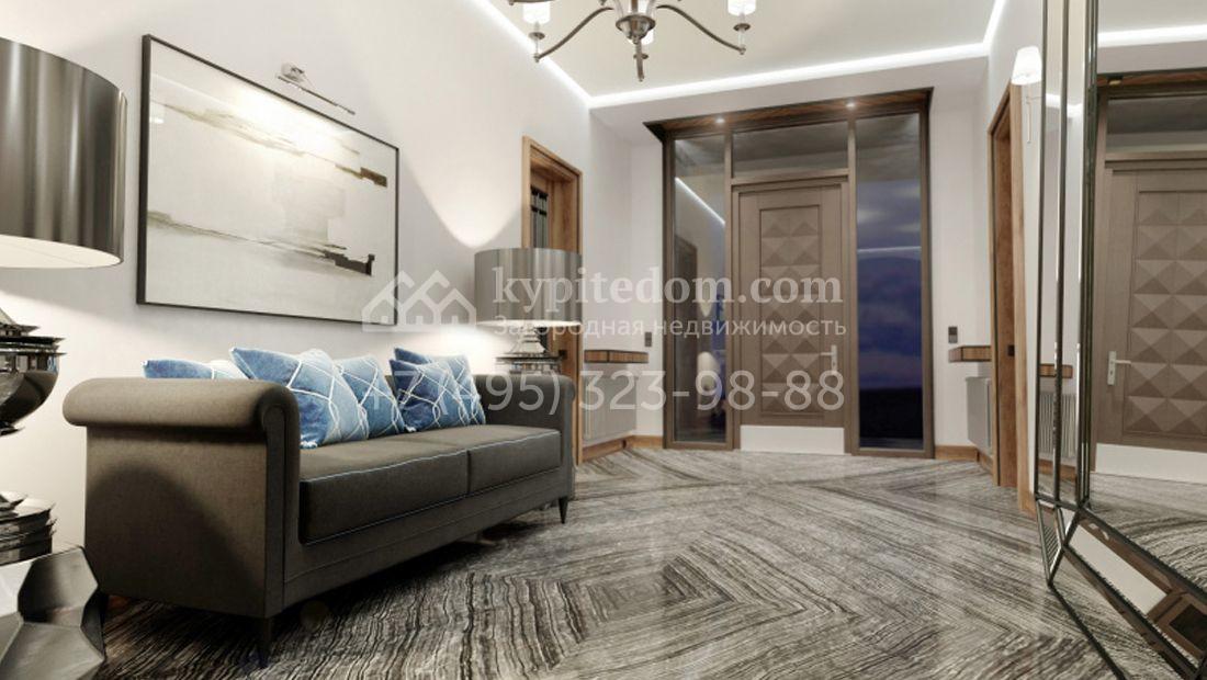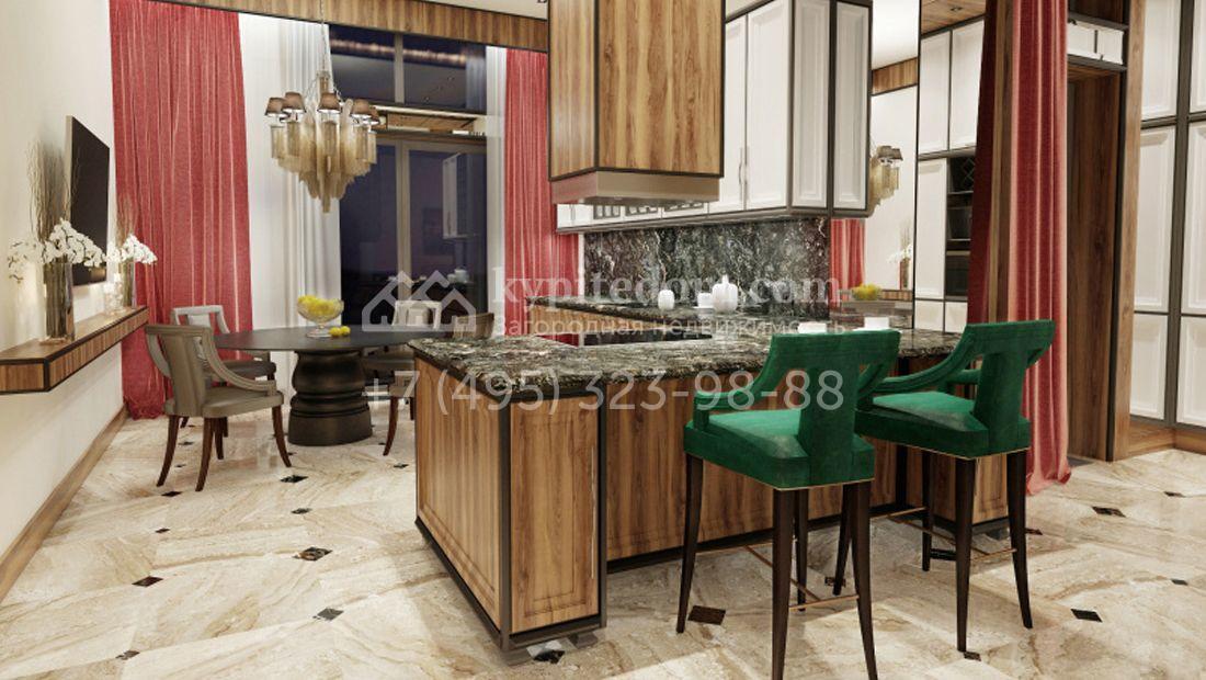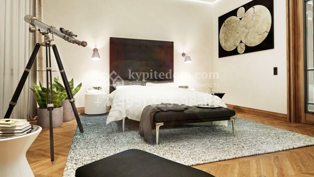 Двухэтажная резиденция в райтовском стиле продается с отделкой под ключ. Площадь дома — 990 м². В интерьере использован натуральный камень, ценные породы древесины. На полу массив дуба, мрамор. Фасад кухни выполнен из ореха, столешница и фартук из мрамора, встроена бытовая техника Kuppersbusch. Камин в гостиной выполнен из полудрагоценного камня Лабродарит. Дом стоит на открытом участке 50 соток.