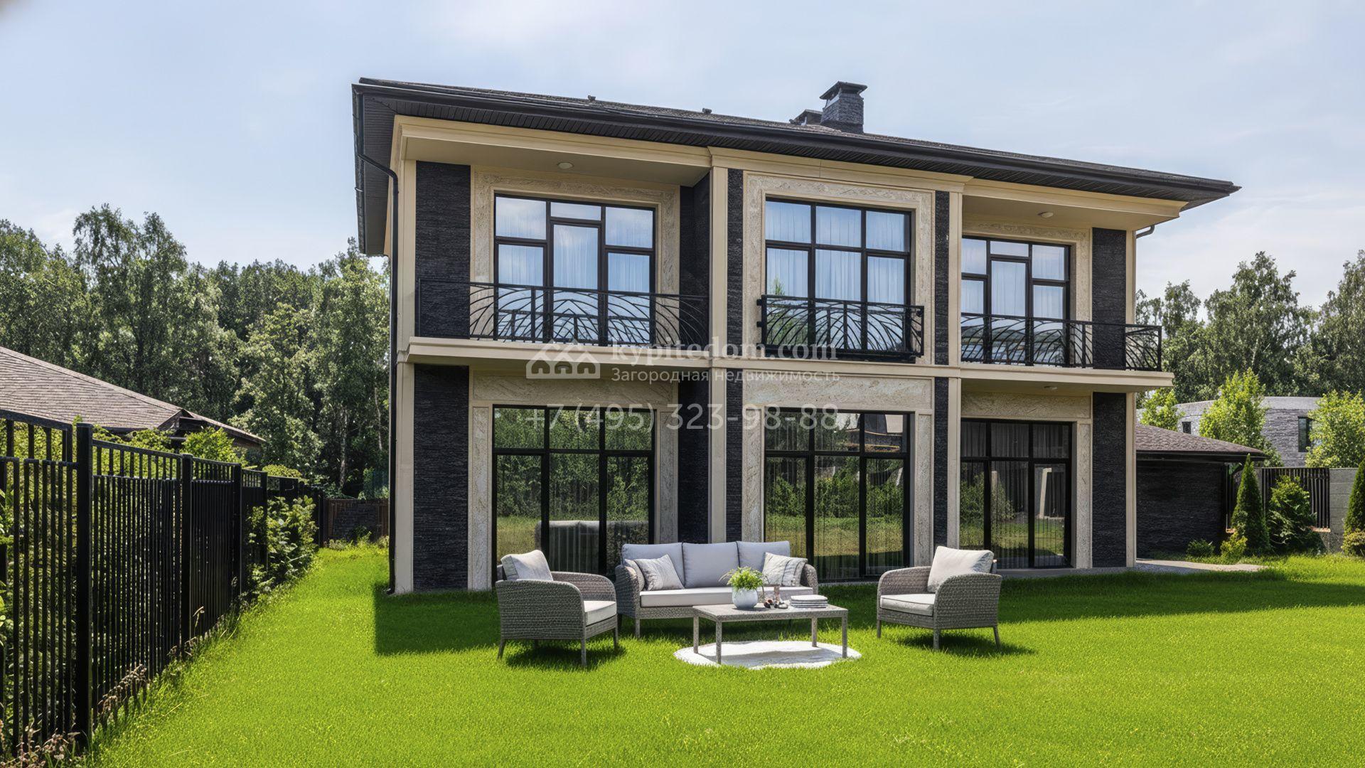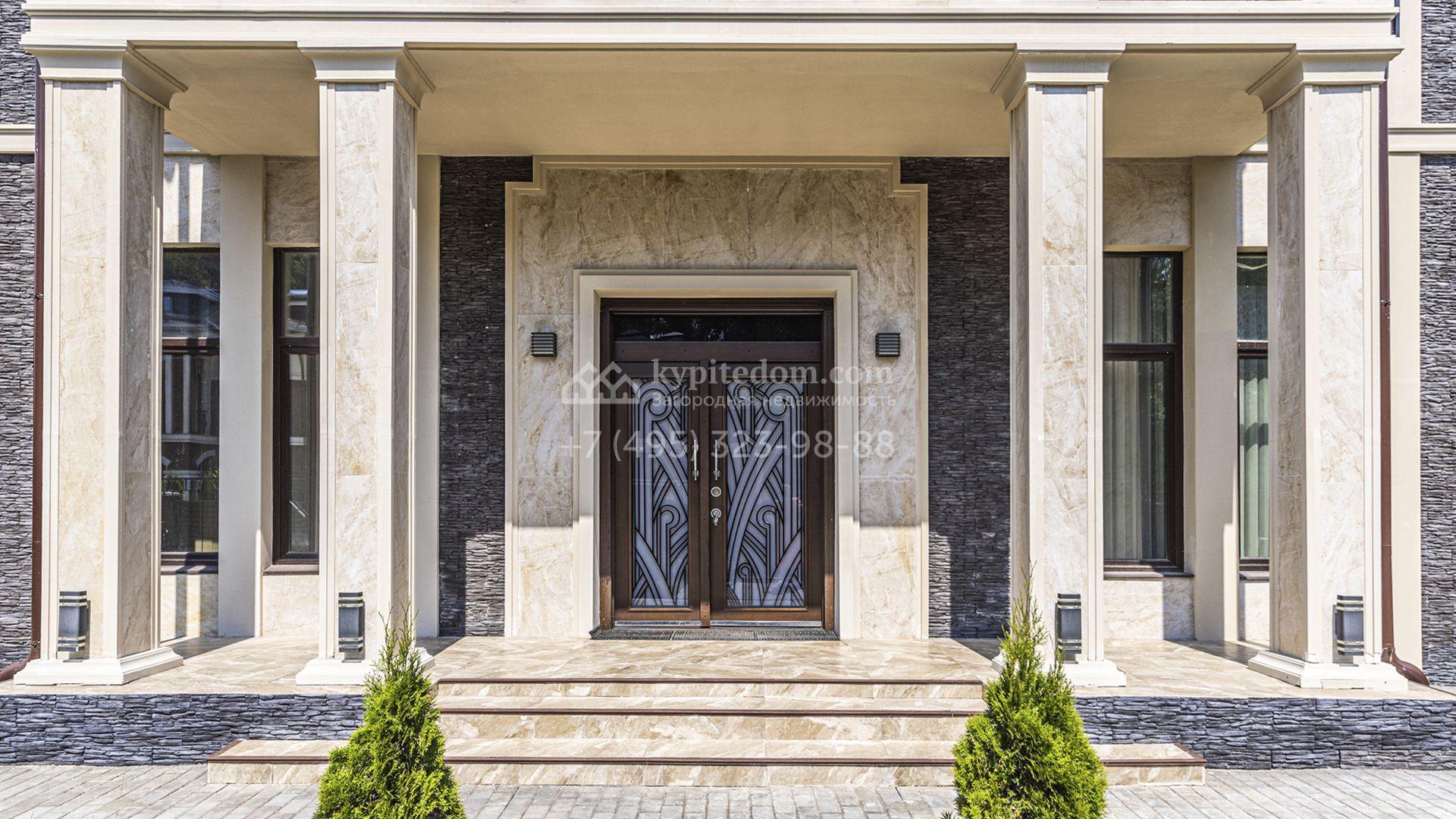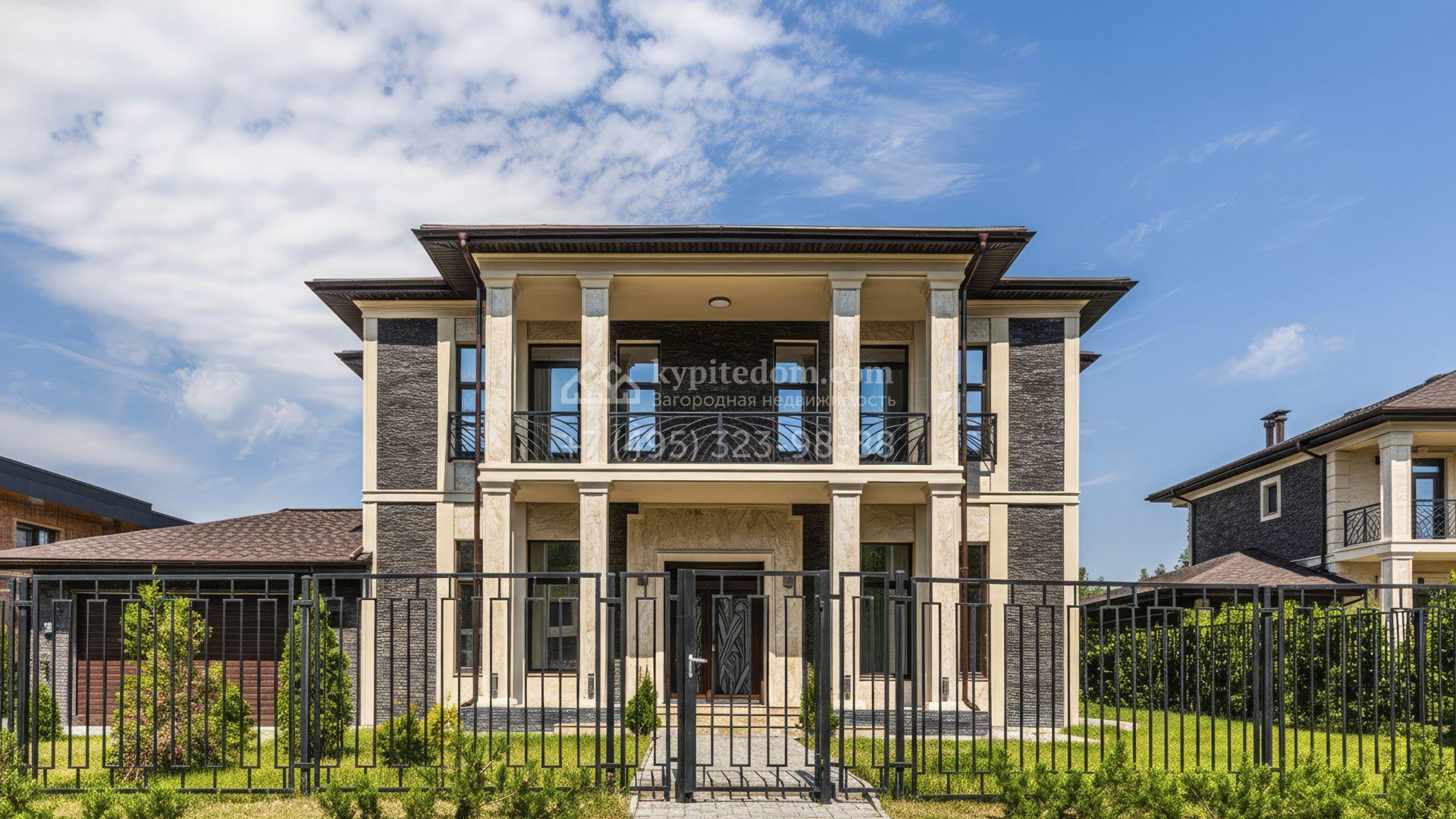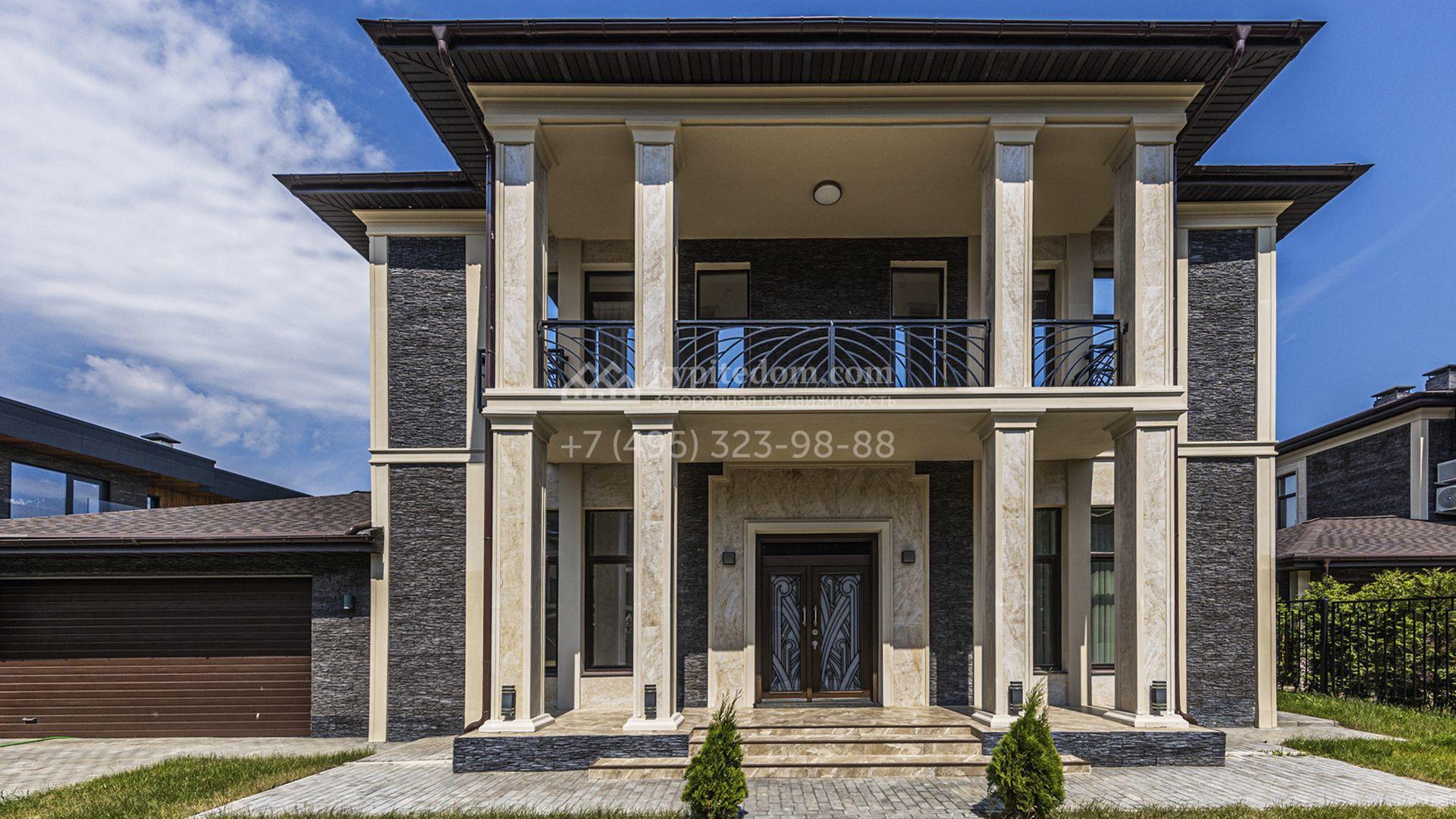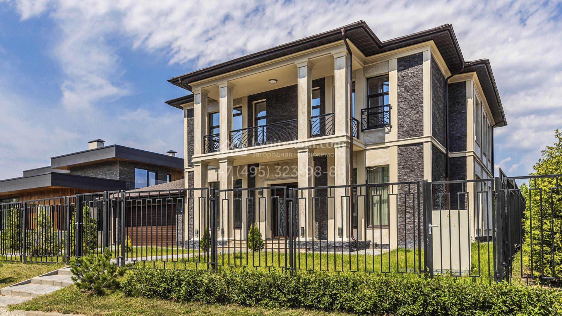 Загородный дом площадью 400 м² расположен на полевом участке 14 соток. Фасад в стиле современной классики облицован серой клинкерной плиткой со вставками под бежевый камень, декорирован колоннами, коваными элементами и подсветкой. Интерьер оформлен в светлых кремовых оттенках с добавлением коричневых акцентов. В резиденции спланировали 3 спальни, уютную гостиную с камином, кабинет, кухню, столовую и террасу. Предусмотрен гараж на 2 машины. На участке выполнен ландшафтный дизайн, вымощены дорожки, засеян газон и высажены туи.