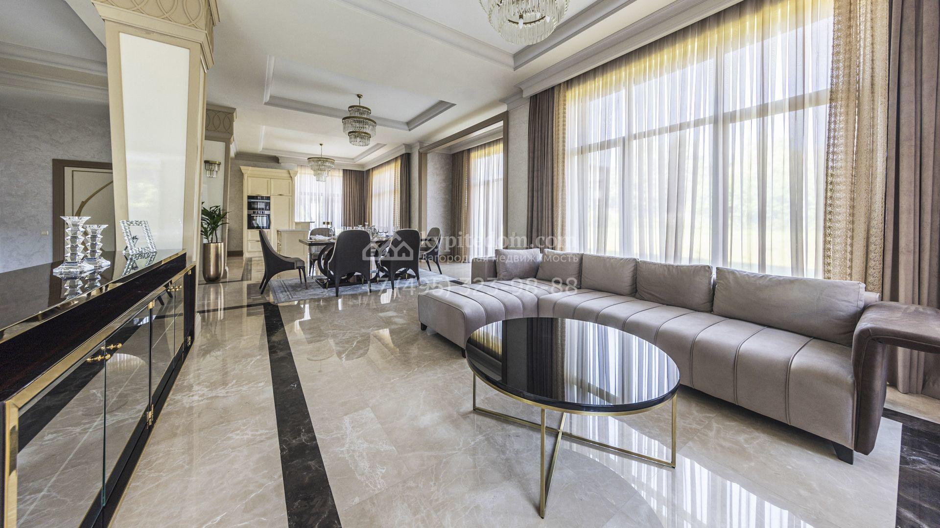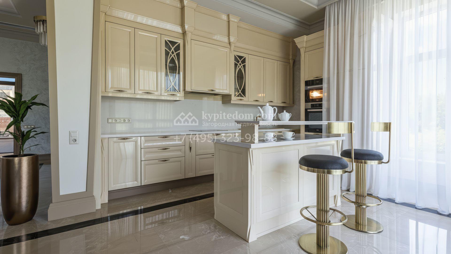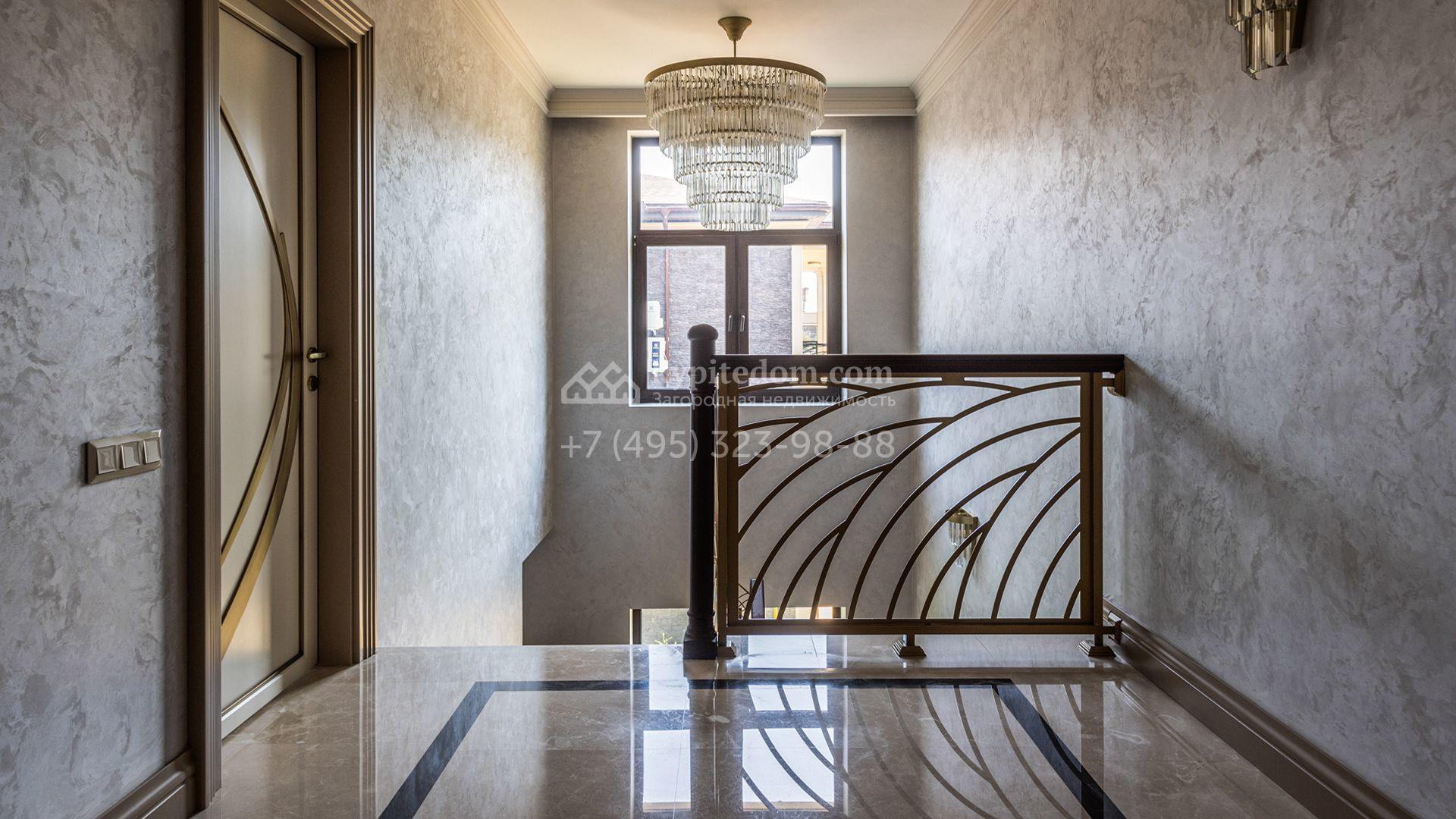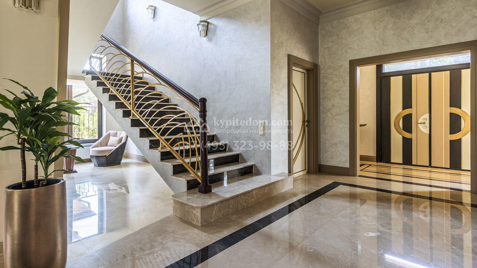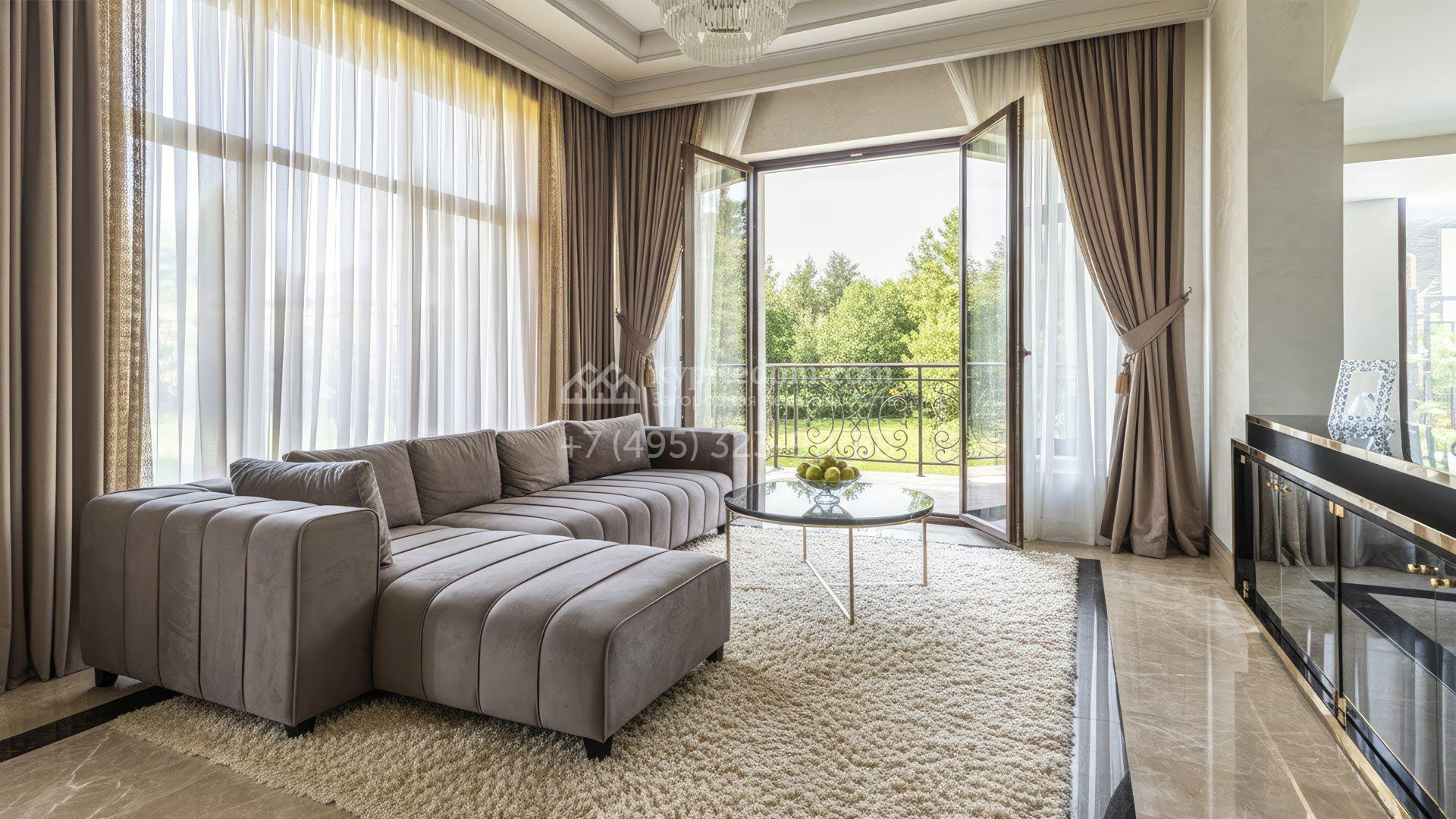Загородный дом площадью 400 м² расположен на полевом участке 14 соток. Фасад в стиле современной классики облицован серой клинкерной плиткой со вставками под бежевый камень, декорирован колоннами, коваными элементами и подсветкой. Интерьер оформлен в светлых кремовых оттенках с добавлением коричневых акцентов. В резиденции спланировали 3 спальни, уютную гостиную с камином, кабинет, кухню, столовую и террасу. Предусмотрен гараж на 2 машины. На участке выполнен ландшафтный дизайн, вымощены дорожки, засеян газон и высажены туи.