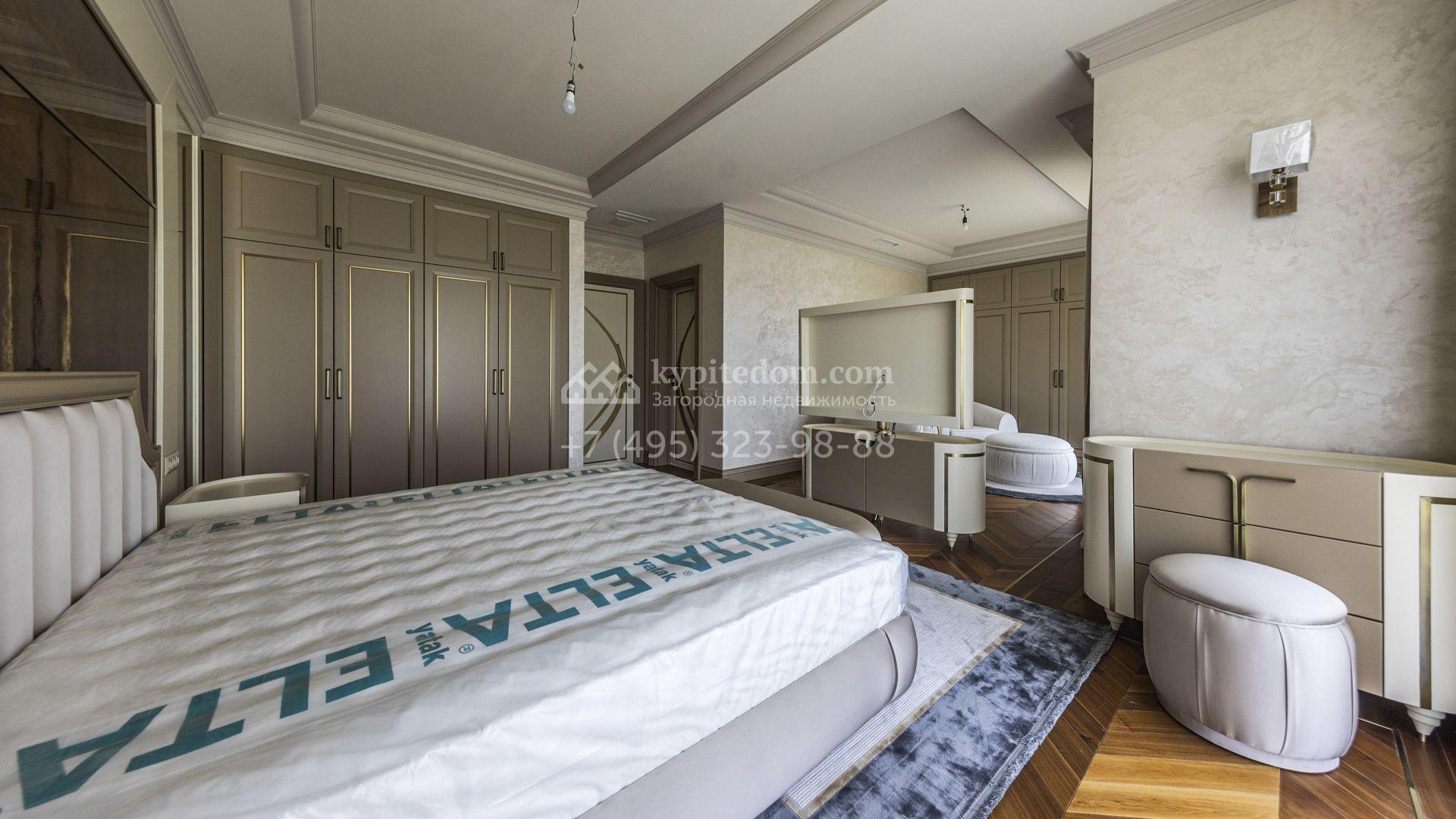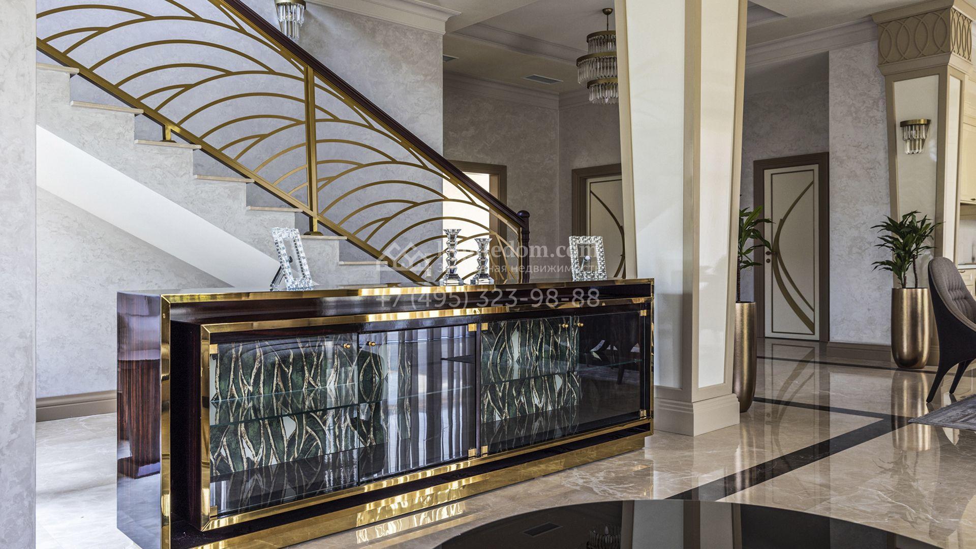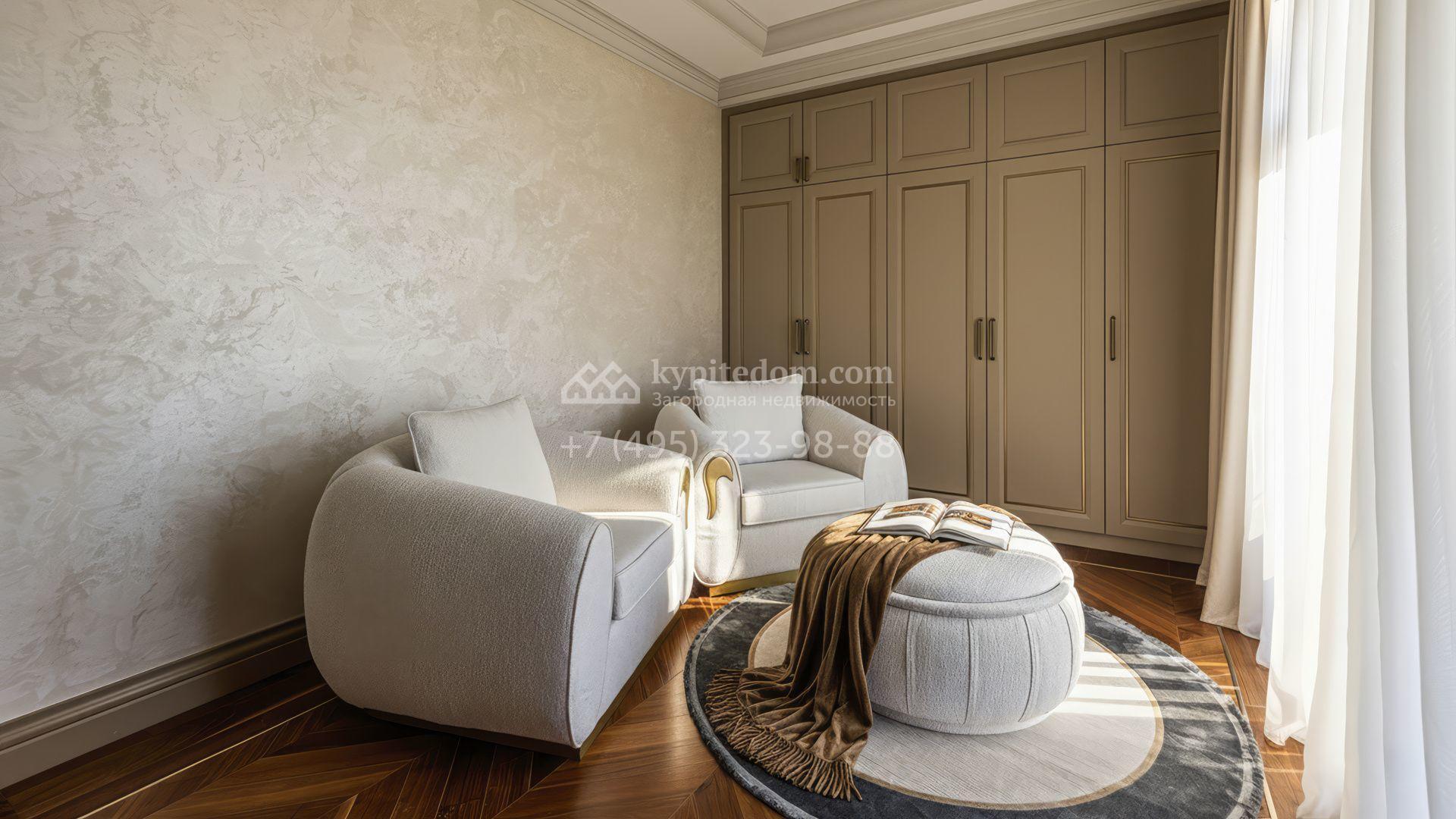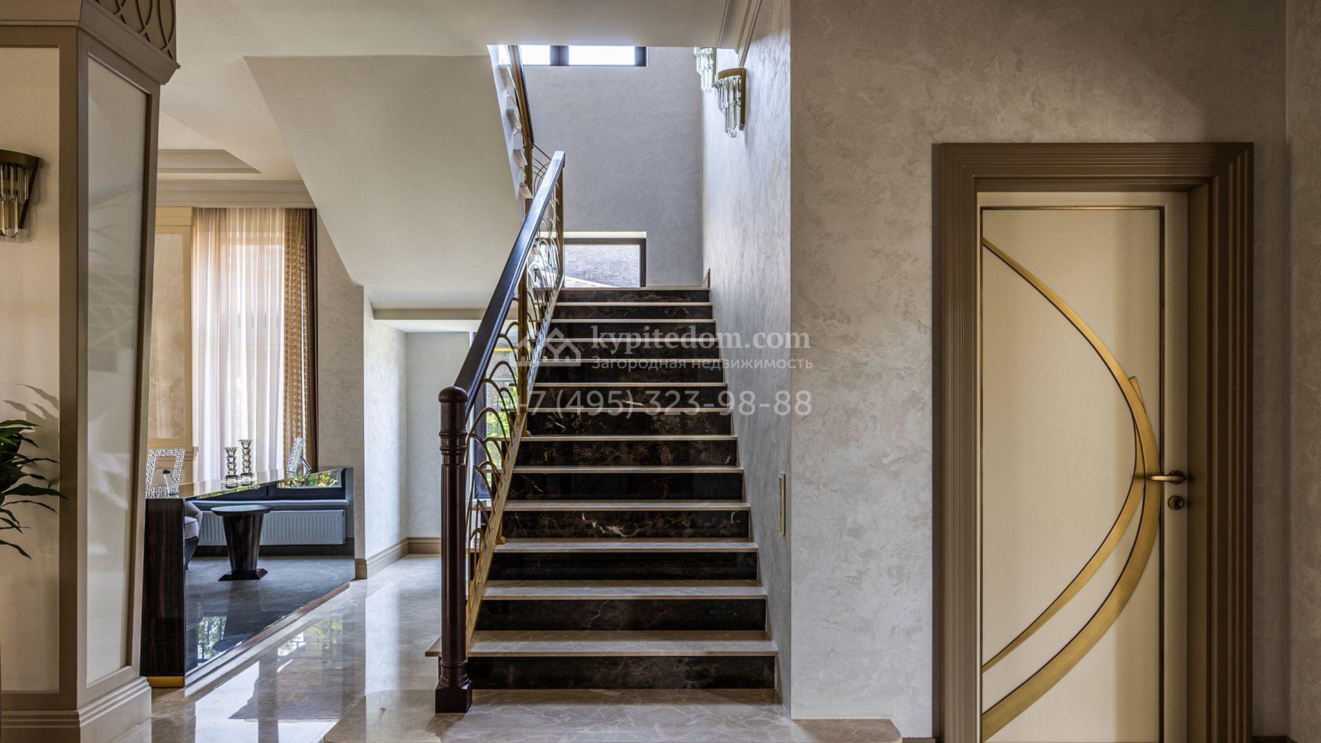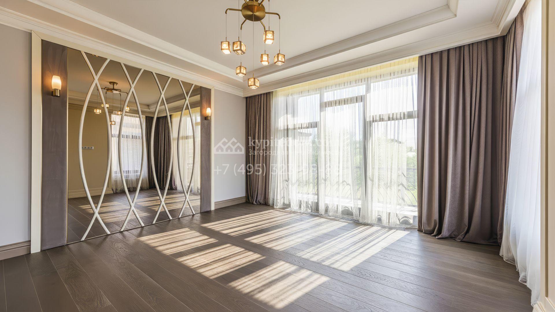Загородный дом площадью 400 м² расположен на полевом участке 14 соток. Фасад в стиле современной классики облицован серой клинкерной плиткой со вставками под бежевый камень, декорирован колоннами, коваными элементами и подсветкой. Интерьер оформлен в светлых кремовых оттенках с добавлением коричневых акцентов. В резиденции спланировали 3 спальни, уютную гостиную с камином, кабинет, кухню, столовую и террасу. Предусмотрен гараж на 2 машины. На участке выполнен ландшафтный дизайн, вымощены дорожки, засеян газон и высажены туи.