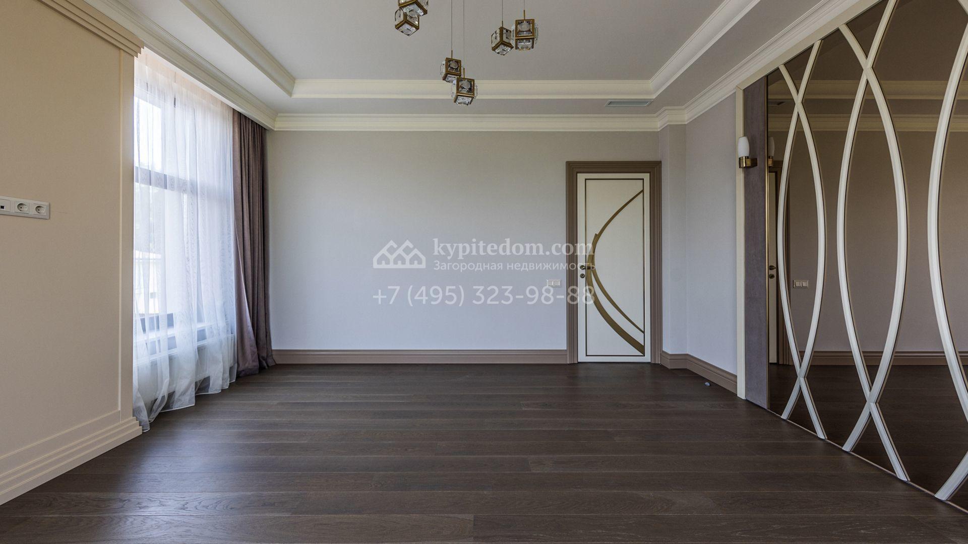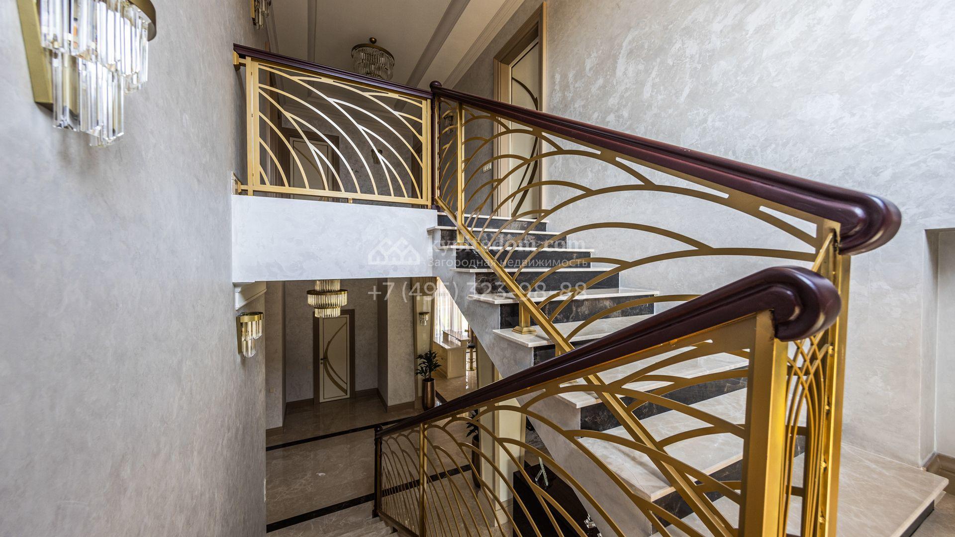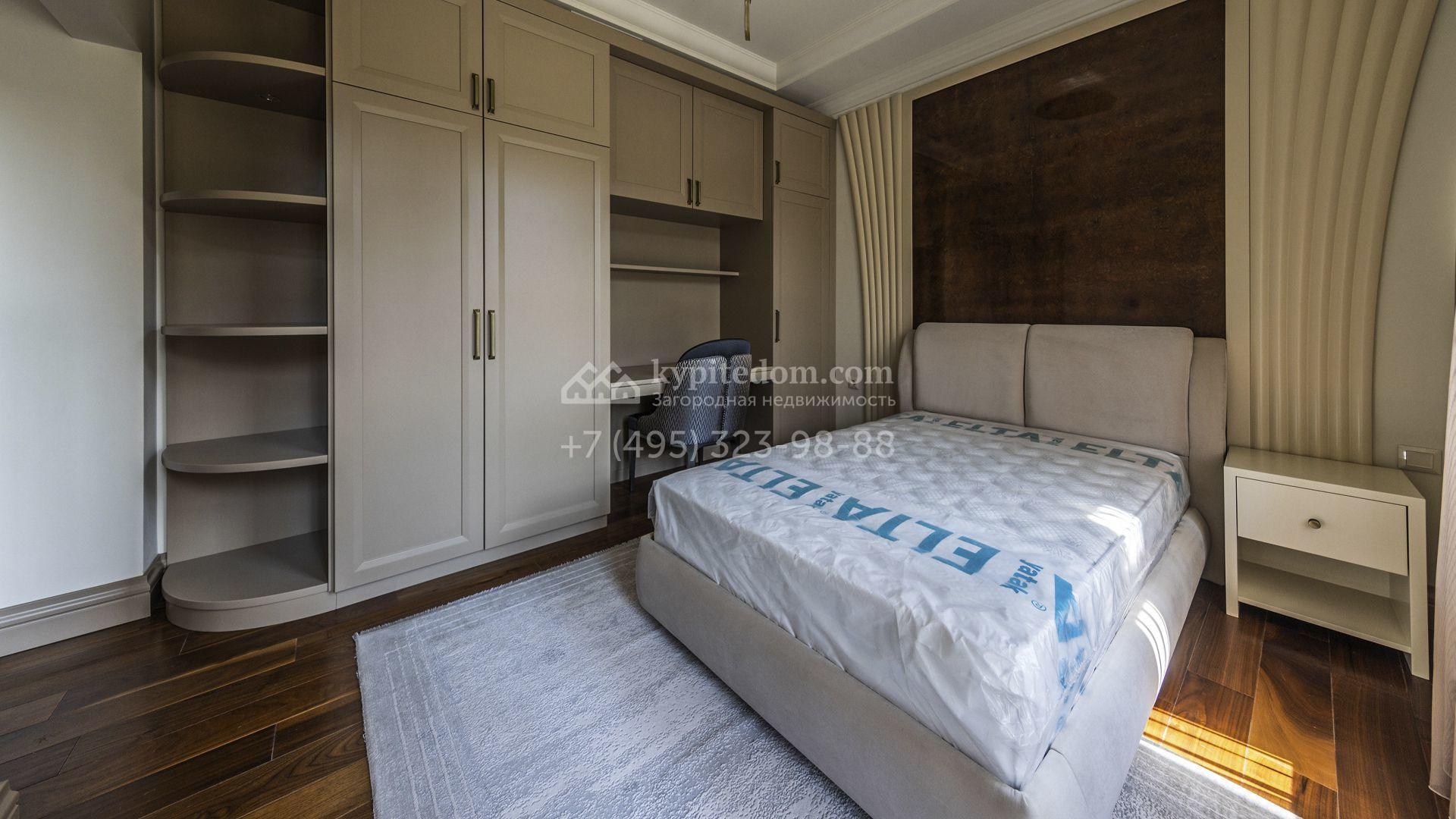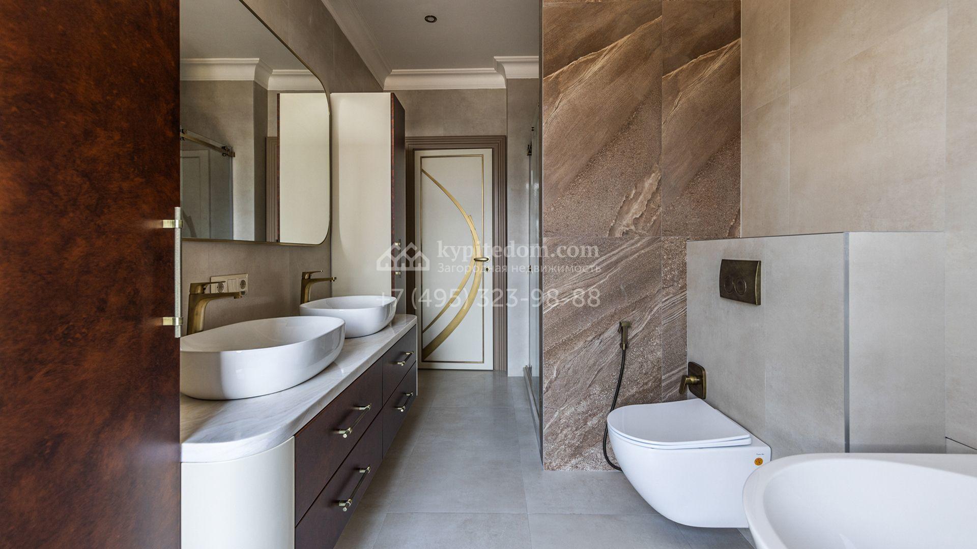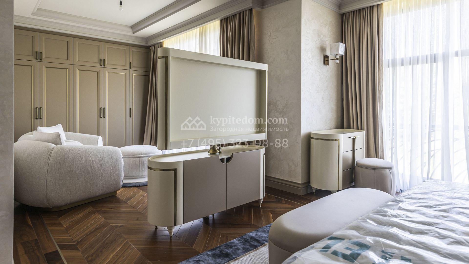 Загородный дом площадью 400 м² расположен на полевом участке 14 соток. Фасад в стиле современной классики облицован серой клинкерной плиткой со вставками под бежевый камень, декорирован колоннами, коваными элементами и подсветкой. Интерьер оформлен в светлых кремовых оттенках с добавлением коричневых акцентов. В резиденции спланировали 3 спальни, уютную гостиную с камином, кабинет, кухню, столовую и террасу. Предусмотрен гараж на 2 машины. На участке выполнен ландшафтный дизайн, вымощены дорожки, засеян газон и высажены туи.