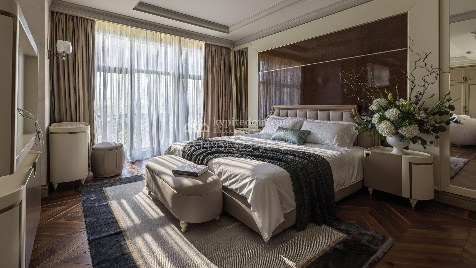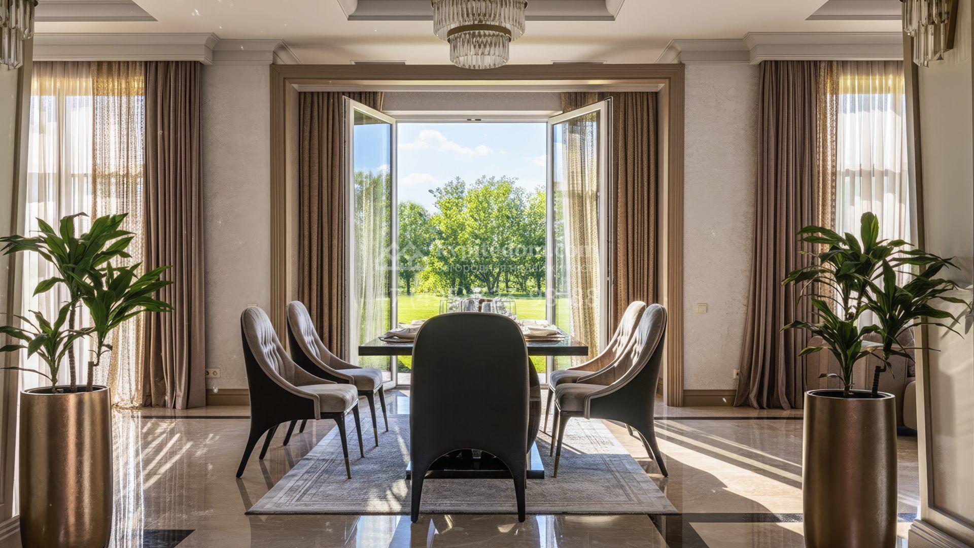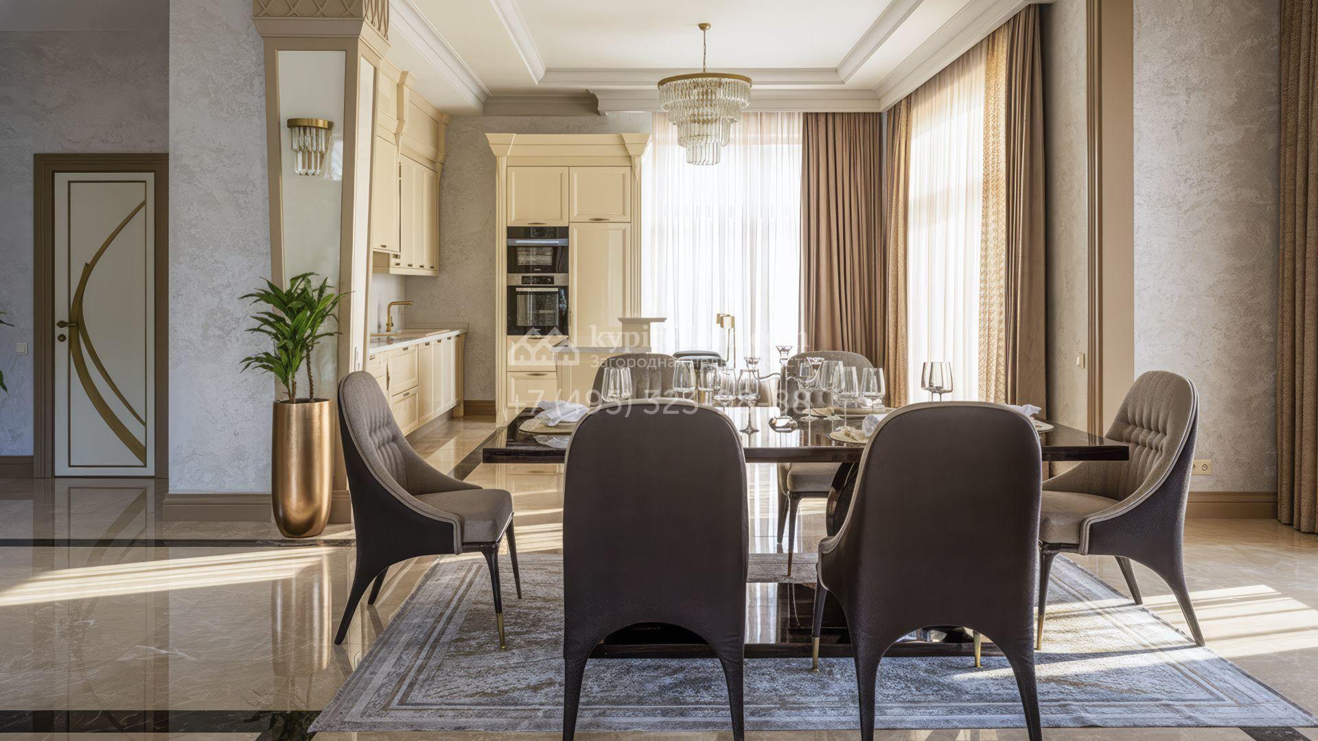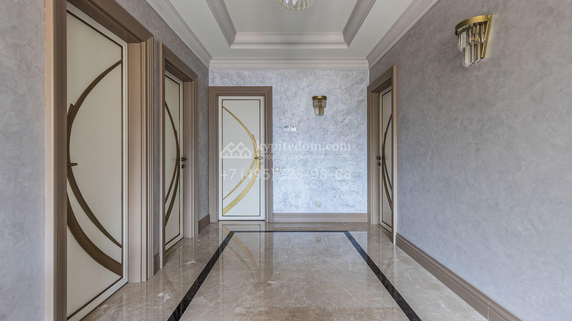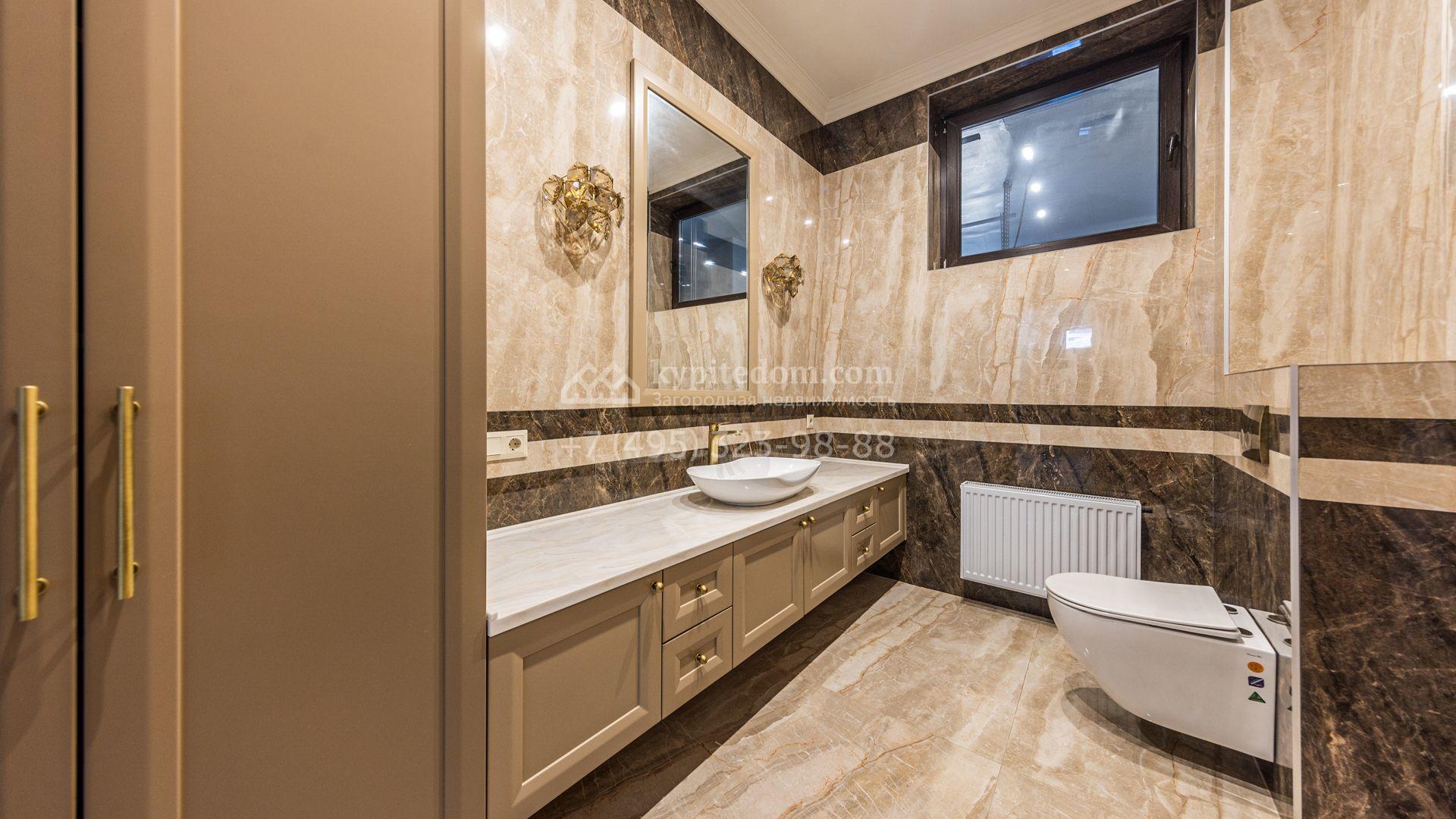Загородный дом площадью 400 м² расположен на полевом участке 14 соток. Фасад в стиле современной классики облицован серой клинкерной плиткой со вставками под бежевый камень, декорирован колоннами, коваными элементами и подсветкой. Интерьер оформлен в светлых кремовых оттенках с добавлением коричневых акцентов. В резиденции спланировали 3 спальни, уютную гостиную с камином, кабинет, кухню, столовую и террасу. Предусмотрен гараж на 2 машины. На участке выполнен ландшафтный дизайн, вымощены дорожки, засеян газон и высажены туи.