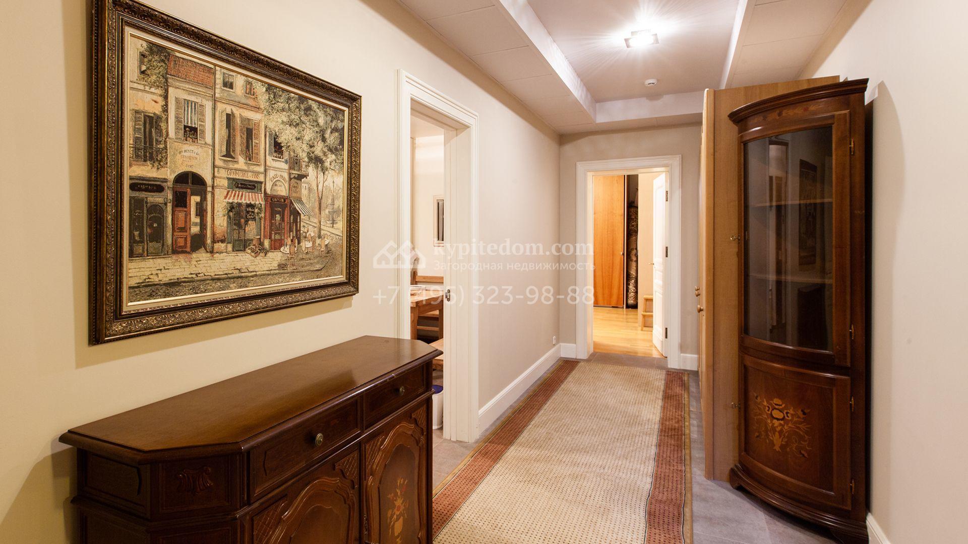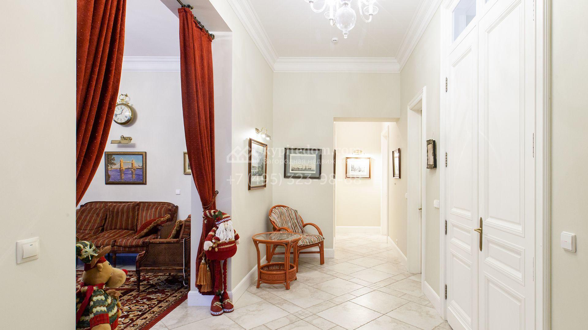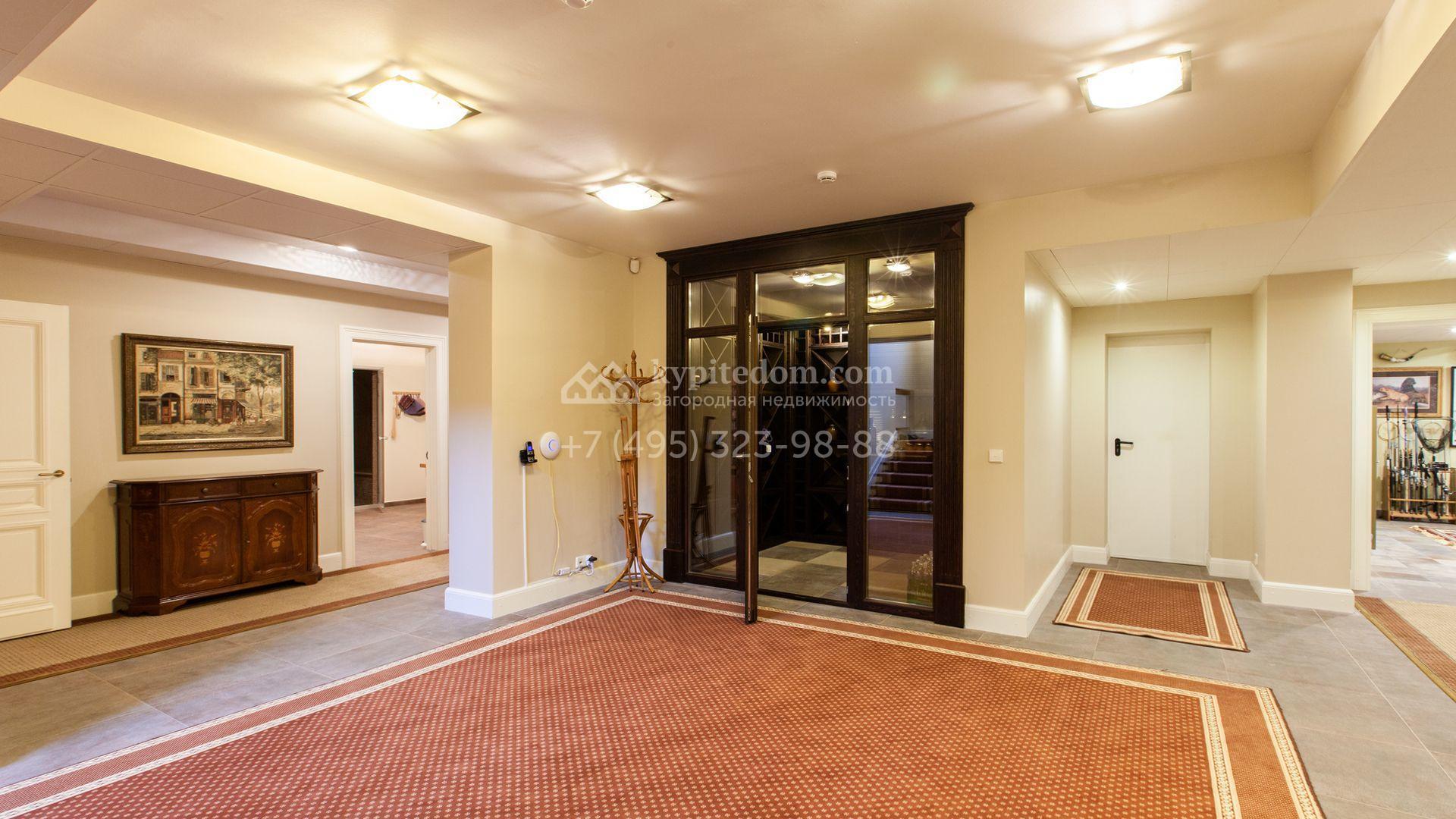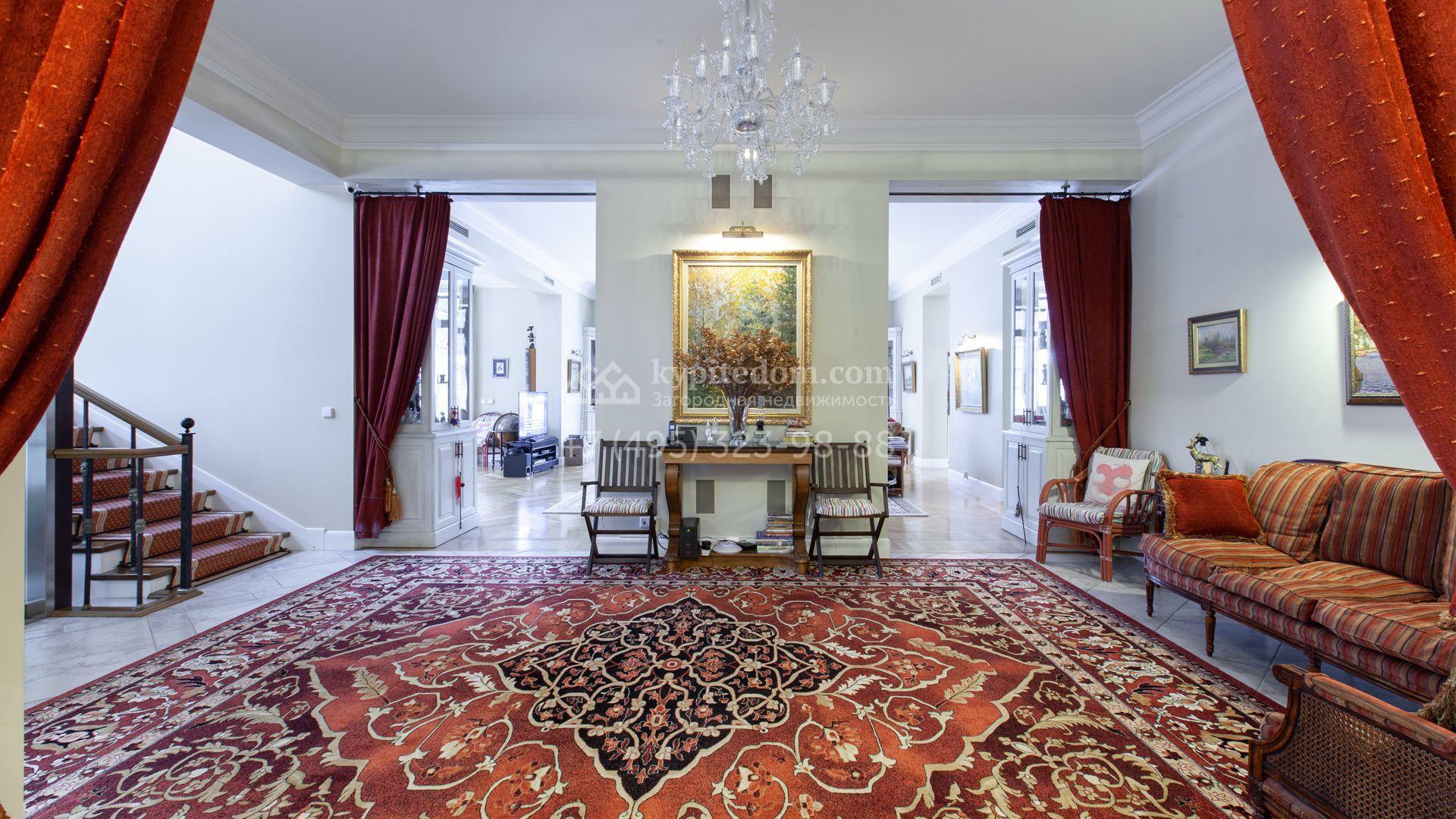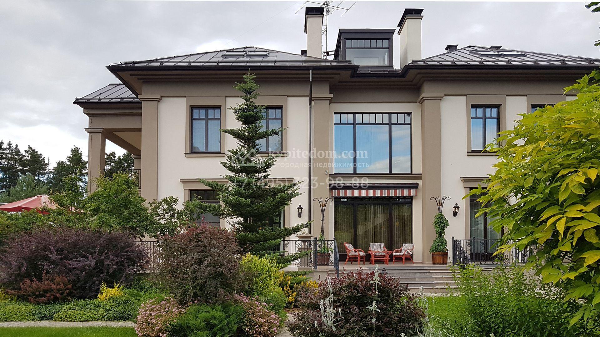 Загородный дом в неоклассическом стиле площадью 973 м² расположен на просторном участке с парковыми дорожками и гаражом. Фасад дома в приглушенных тонах отличается большими панорамными окнами и декоративными колоннами. Интерьер дома выполнен в стиле современной классики, все комнаты меблированы и наполнены техникой. На 4 уровнях спланировали 6 спален с гардеробными комнатами, финскую и турецкую бани, домашний кинотеатр, винный и продуктовый погреба, спортивный зал и оранжерею. В доме современная инженерная система, подключены функции «умный дом», лифт проходит через все этажи. На участке 25 соток выполнили ландшафтный дизайн — посадили ровный газон, декоративные кустарники и хвойные деревья, дорожки вымостили плиткой. Около главного дома разместили теплую беседку с каменной печью и встроенным мангалом, и дом для персонала 122 м² с гаражом для 2 машин.