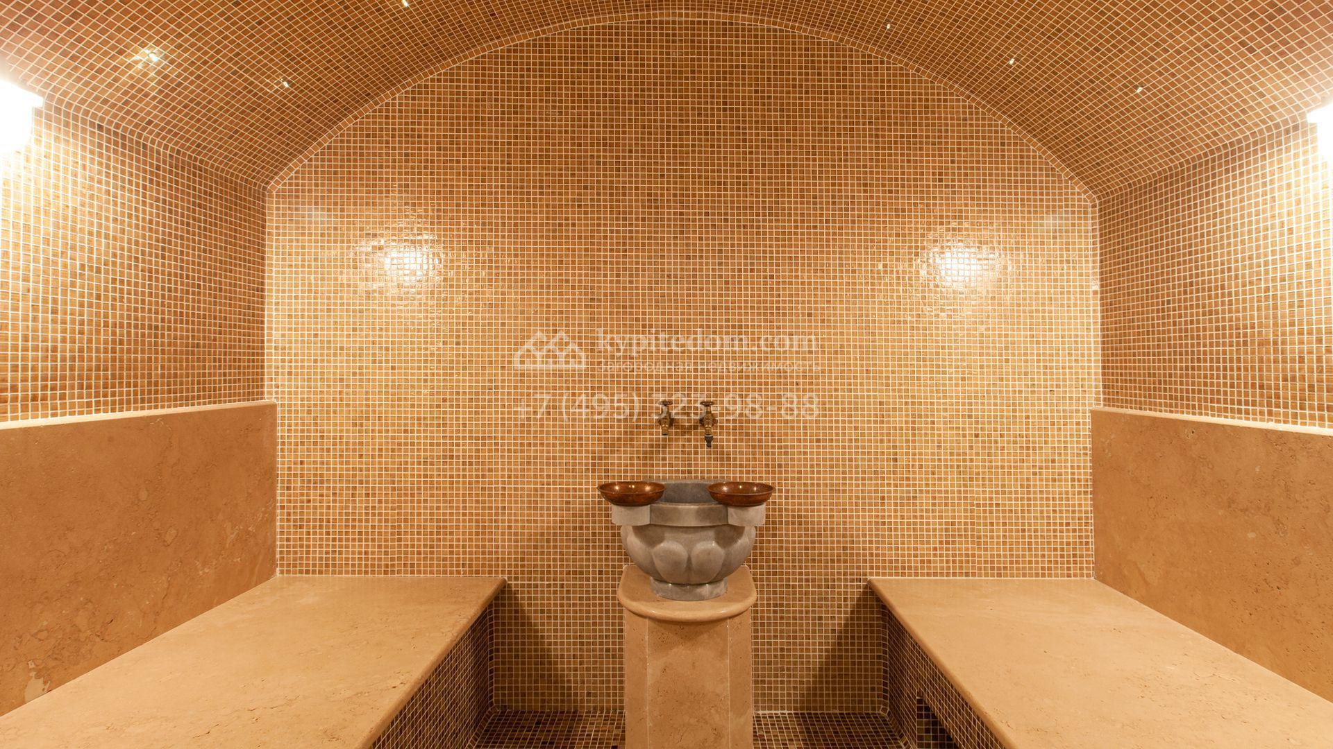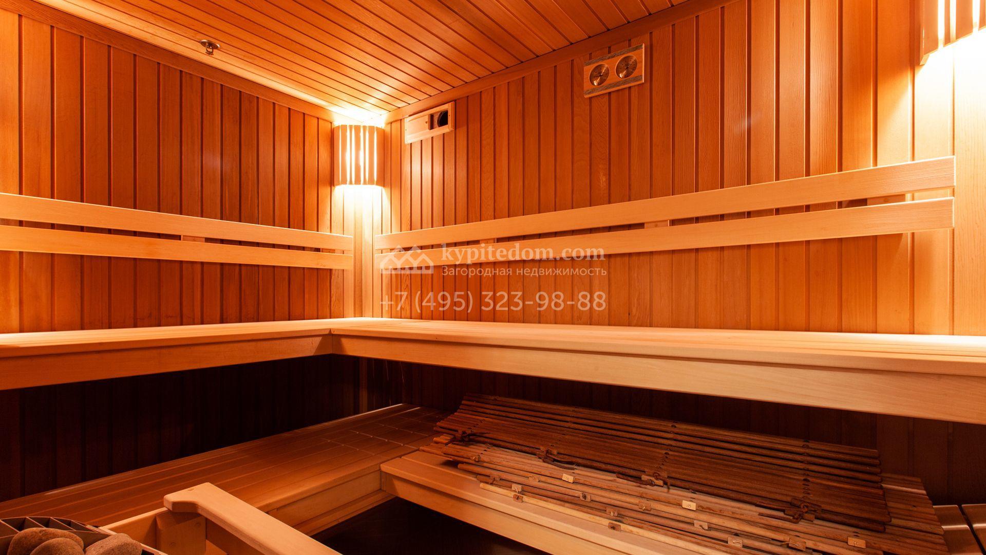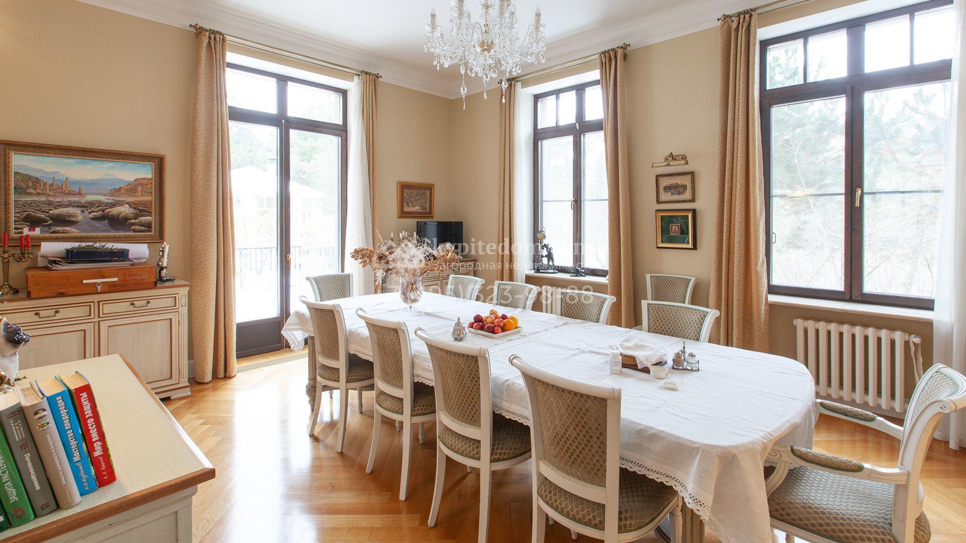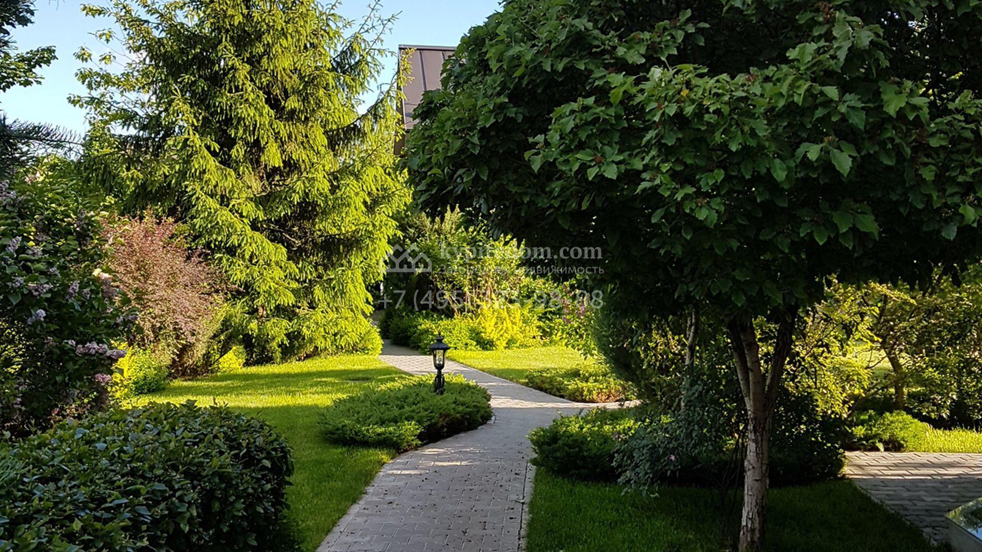 Загородный дом в неоклассическом стиле площадью 973 м² расположен на просторном участке с парковыми дорожками и гаражом. Фасад дома в приглушенных тонах отличается большими панорамными окнами и декоративными колоннами. Интерьер дома выполнен в стиле современной классики, все комнаты меблированы и наполнены техникой. На 4 уровнях спланировали 6 спален с гардеробными комнатами, финскую и турецкую бани, домашний кинотеатр, винный и продуктовый погреба, спортивный зал и оранжерею. В доме современная инженерная система, подключены функции «умный дом», лифт проходит через все этажи. На участке 25 соток выполнили ландшафтный дизайн — посадили ровный газон, декоративные кустарники и хвойные деревья, дорожки вымостили плиткой. Около главного дома разместили теплую беседку с каменной печью и встроенным мангалом, и дом для персонала 122 м² с гаражом для 2 машин.
