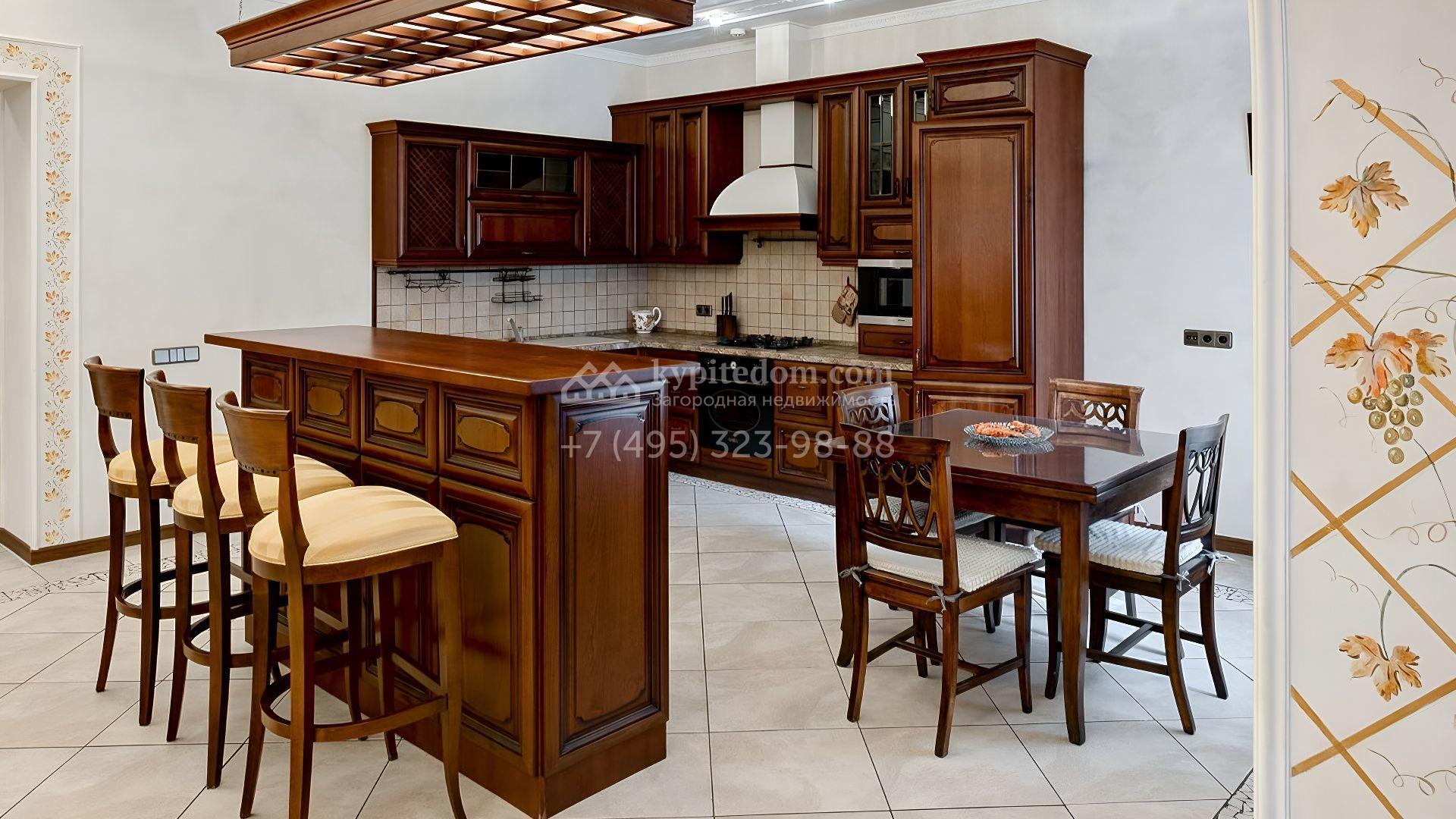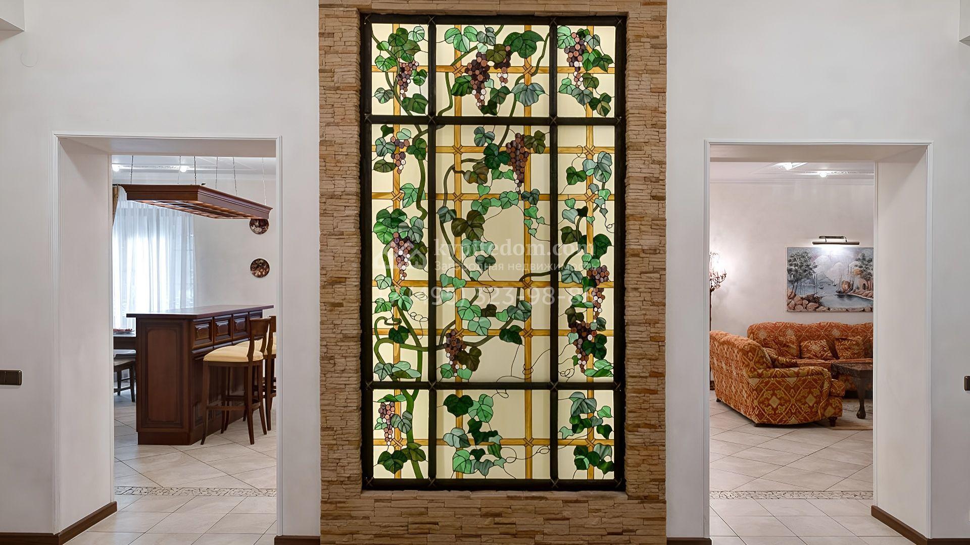 Интерьеры оформлены по авторскому дизайн-проекту в классической эстетике. Натуральные материалы, витражи, художественная роспись стен, резные карнизы, мозаичная плитка и тщательно подобранный декор создают атмосферу благородной утончённости. Гармонию поддерживают мебель, текстиль и светильники, формирующие уют и продуманное единство всех помещений.