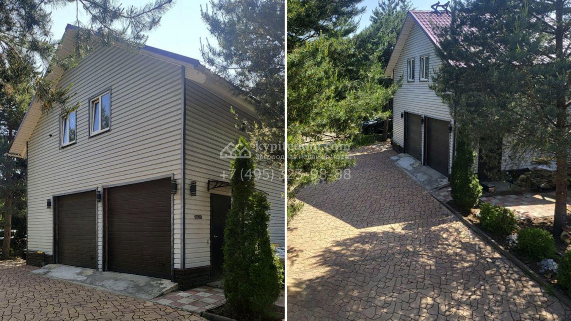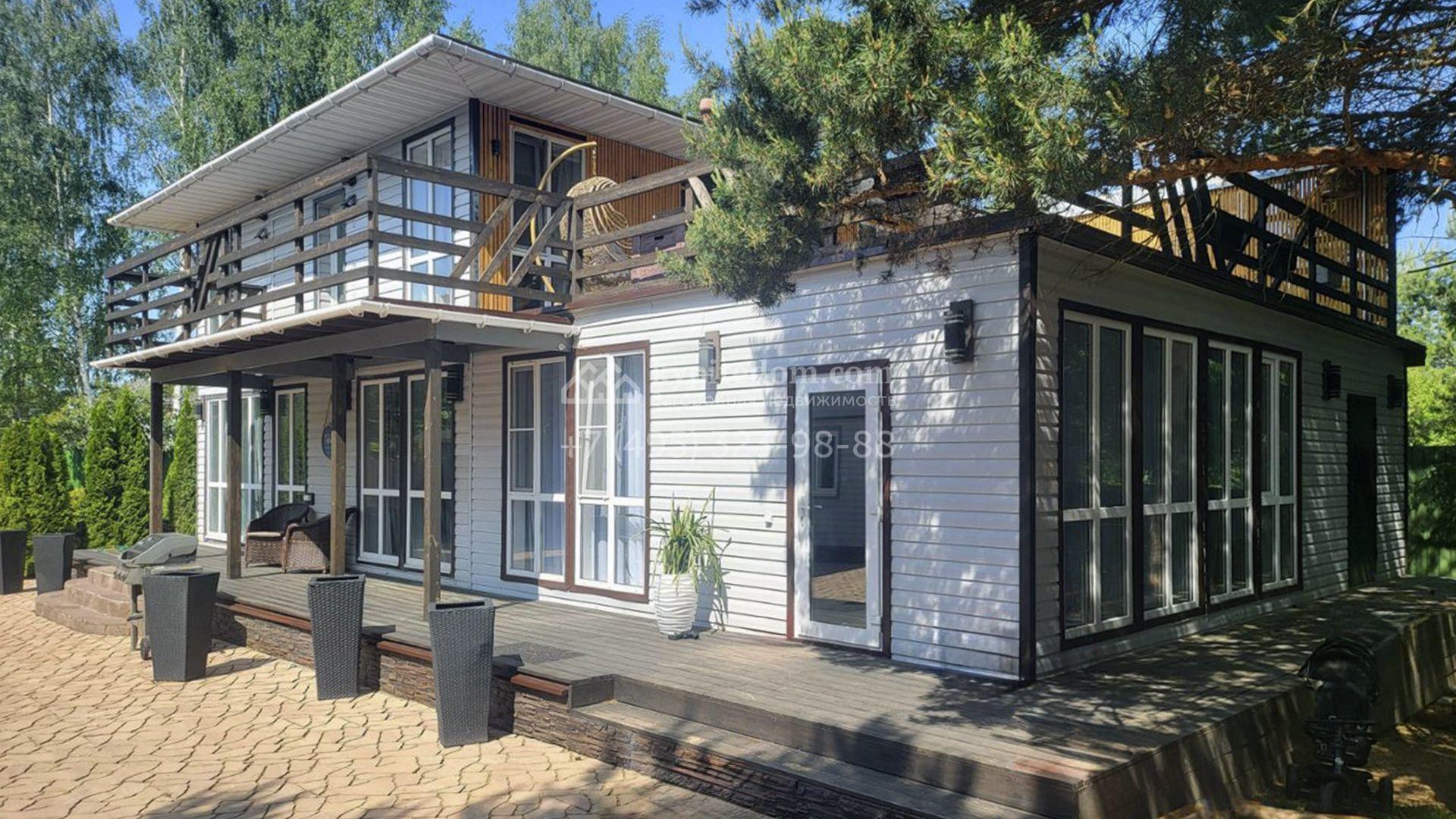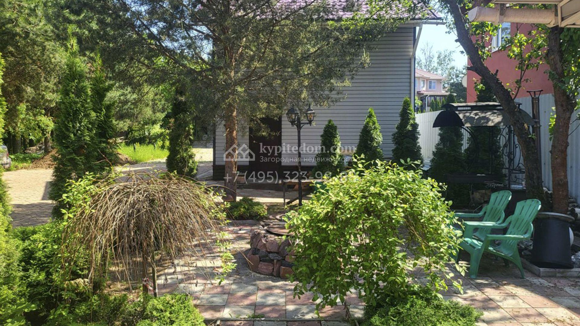 Планировка включает уютную гостиную с камином, объединенную с кухней и столовой, кабинет для работы и учебы, вместительную гардеробную и 2 спальни. На втором уровне разместили просторную веранду с дополнительной кухней. Кроме того, на участке возведены гостевой дом с баней и теплый двухместный гараж. Участок благоустроен — здесь засеян газон, растут взрослые деревья, высажены аккуратные туи и декоративные кустарники, вымощены дорожки и обустроена зона барбекю для теплых вечеров в кругу близких.