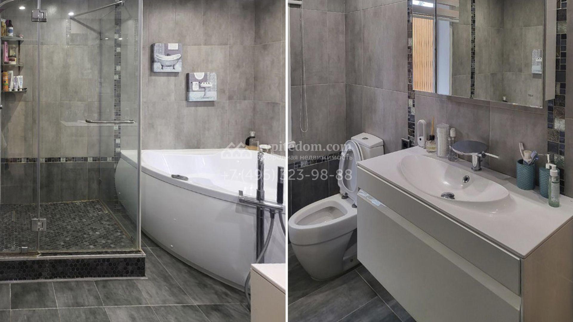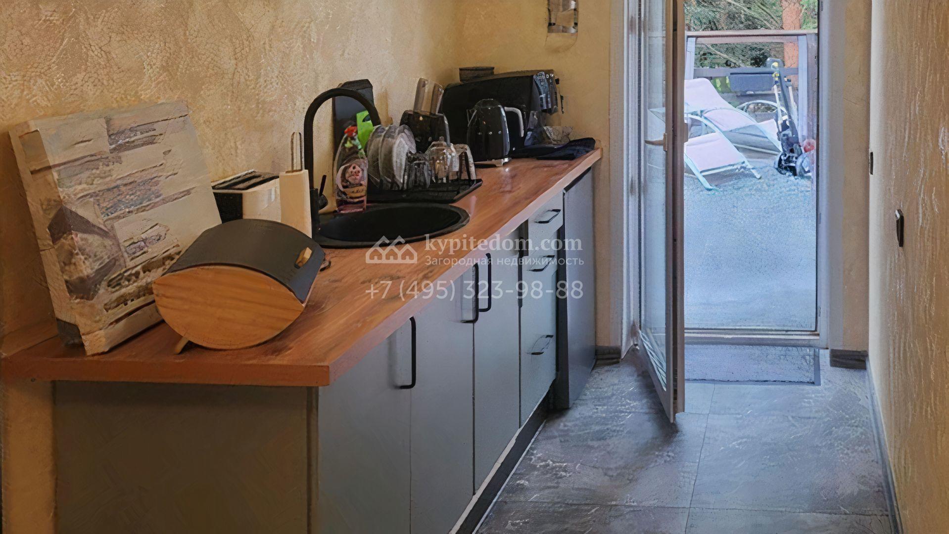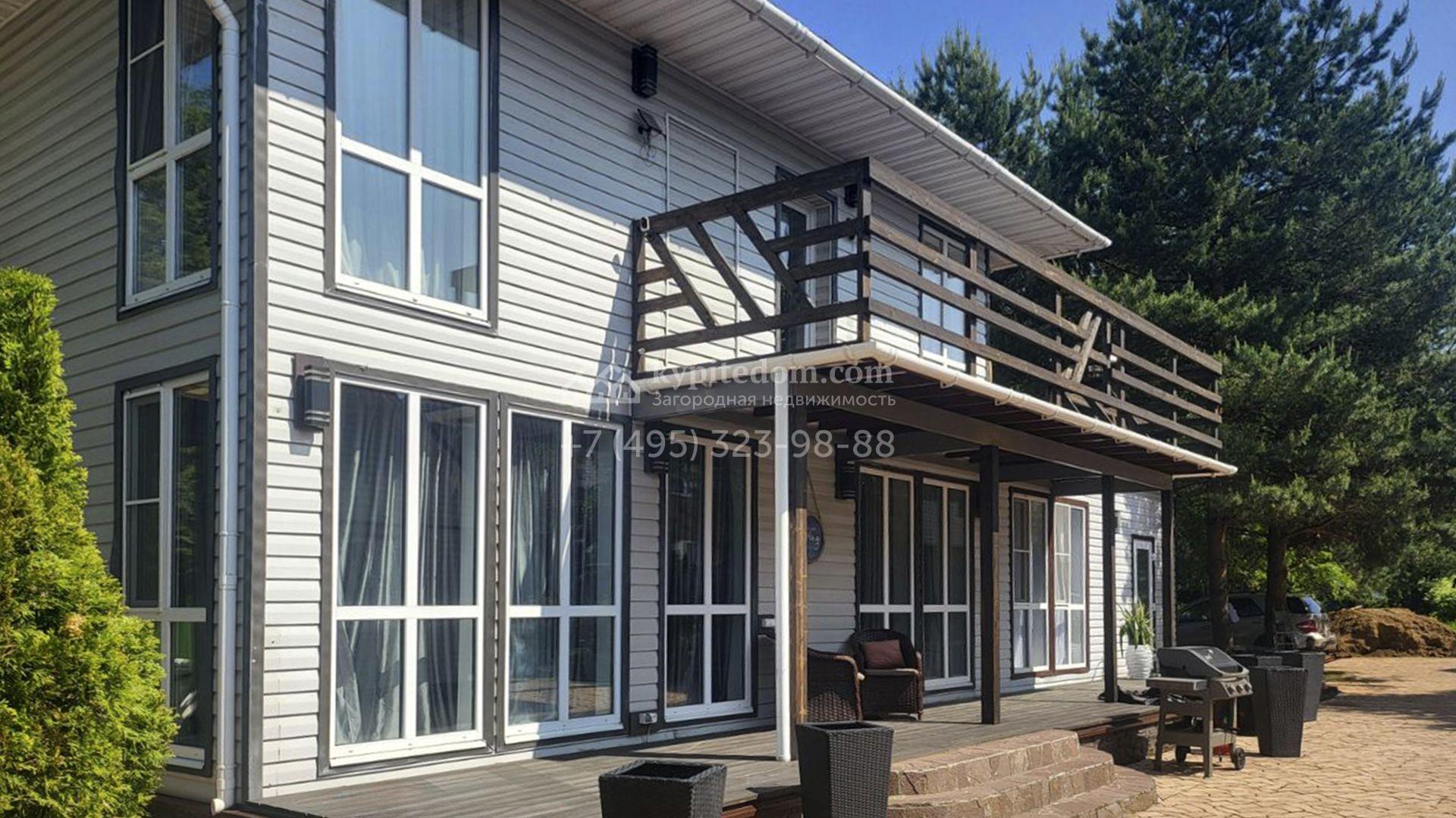 Планировка включает уютную гостиную с камином, объединенную с кухней и столовой, кабинет для работы и учебы, вместительную гардеробную и 2 спальни. На втором уровне разместили просторную веранду с дополнительной кухней. Кроме того, на участке возведены гостевой дом с баней и теплый двухместный гараж. Участок благоустроен — здесь засеян газон, растут взрослые деревья, высажены аккуратные туи и декоративные кустарники, вымощены дорожки и обустроена зона барбекю для теплых вечеров в кругу близких.